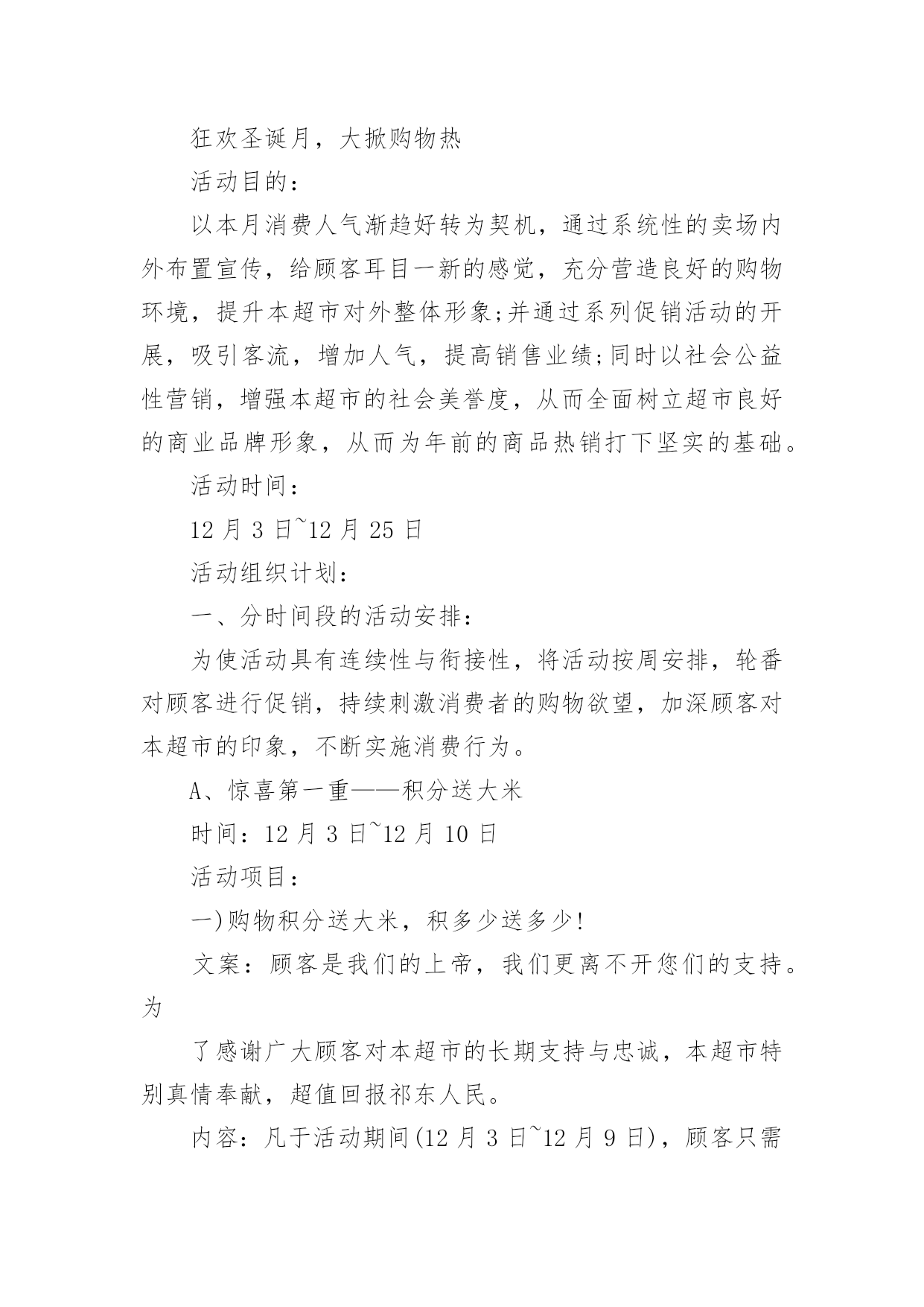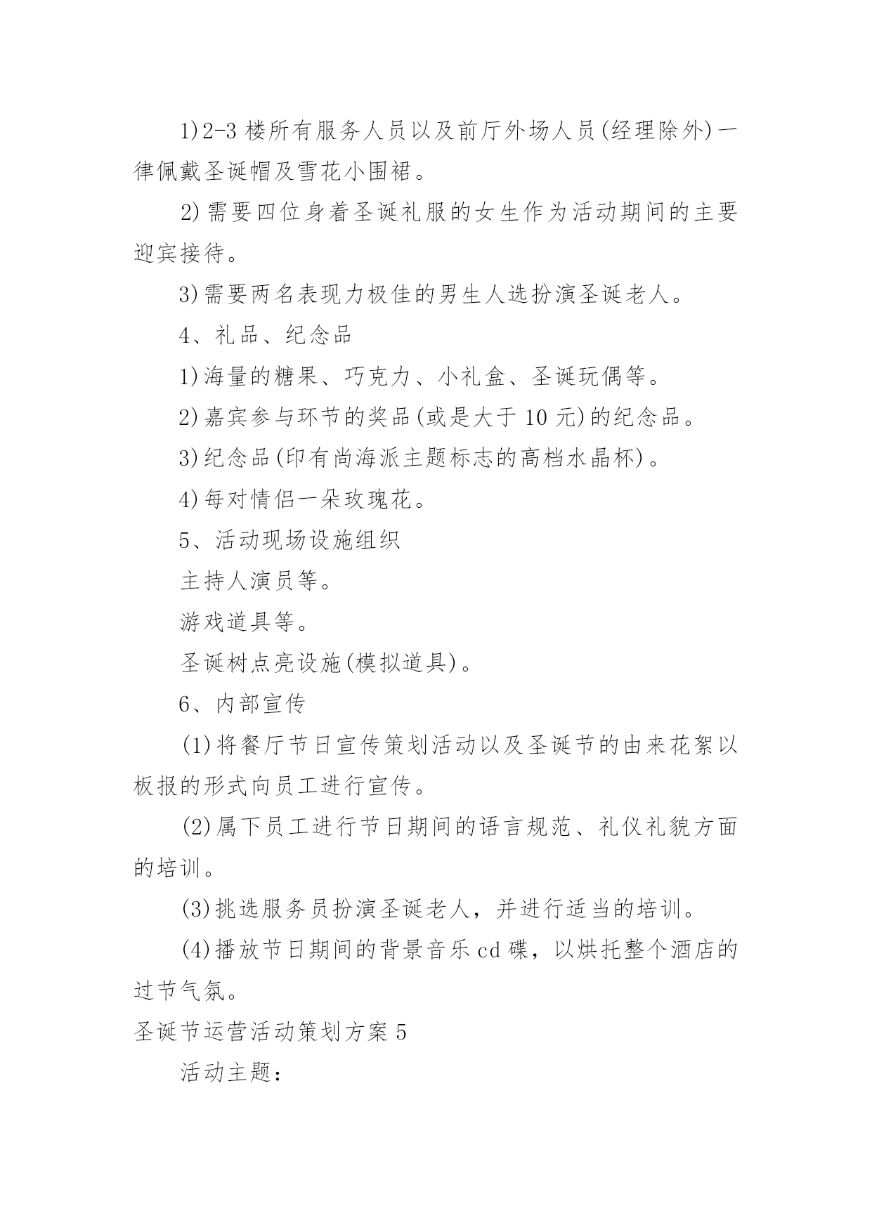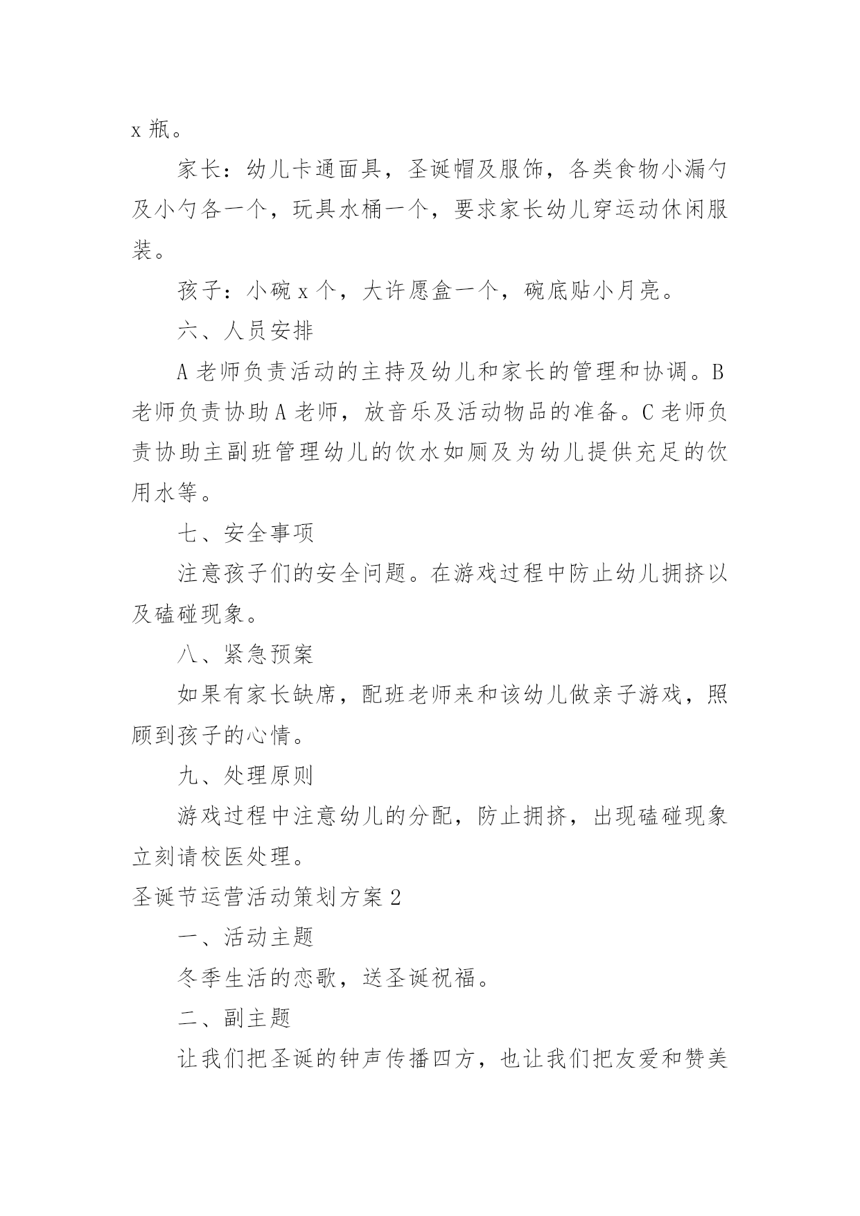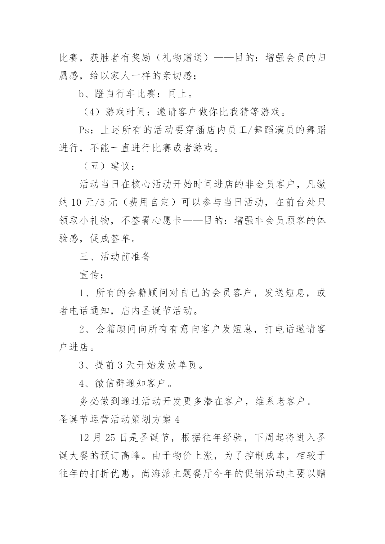 圣诞节运营活动策划方案圣诞节运营活动策划方案(8篇)为了确保事情或工作扎实开展,通常会被要求事先制定方案,方案是从目的、要求、方式、方法、进度等都部署具体、周密,并有很强可操作性的计划。制定方案需要注意哪些问题呢?下面是小编为大家收集的圣诞节运营活动策划方案,供大家参考借鉴,希望可以帮助到有需要的朋友。圣诞节运营活动策划方案1一、活动名称圣诞狂欢,共享快乐。二、活动时间20xx年x月x日至20xx年x月x日。三、活动目的通过活动让孩子们了解西方国家的风俗,知道圣诞节是西方的重要节日。通过活动体验圣诞节欢乐的气氛,并与同伴,老师,家长共同分享节日快乐。四、人员邀请本班所有幼儿家长,园内领导,圣诞老人。五、物品准备幼儿园:气球x个、大铃铛挂饰x个,大雪花片x片,邀请函x张,小礼物x个(小喇叭),宽胶带x卷,幻灯片圣诞节来历,麦克风,大蜡烛x支,红色小许愿袜x个,礼花x瓶。家长:幼儿卡通面具,圣诞帽及服饰,各类食物小漏勺及小勺各一个,玩具水桶一个,要求家长幼儿穿运动休闲服装。孩子:小碗x个,大许愿盒一个,碗底贴小月亮。六、人员安排A老师负责活动的主持及幼儿和家长的管理和协调。B老师负责协助A老师,放音乐及活动物品的准备。C老师负责协助主副班管理幼儿的饮水如厕及为幼儿提供充足的饮用水等。七、安全事项注意孩子们的安全问题。在游戏过程中防止幼儿拥挤以及磕碰现象。八、紧急预案如果有家长缺席,配班老师来和该幼儿做亲子游戏,照顾到孩子的心情。九、处理原则游戏过程中注意幼儿的分配,防止拥挤,出现磕碰现象立刻请校医处理。圣诞节运营活动策划方案2一、活动主题冬季生活的恋歌,送圣诞祝福。二、副主题让我们把圣诞的钟声传播四方,也让我们把友爱和赞美洒向人间。三、活动目的1、加强公司连锁店的销售力度、提高营业收入。2、强化企业知名度、提升连锁店品牌。3、庆祝圣诞节。四、活动意义圣诞节必不可少的节目,有家庭式的,朋友式的,情人式的各种各样party。一种友情,亲情,爱情聚会的好时光。戴着圣诞帽,唱着圣诞歌,说说大家的圣诞愿望。作为一个隆重的节日,少不了的是圣诞大餐,在中国就是以西餐为主了。在圣诞活动宣传期间,公司可宣传企业文化,提升各连锁店品牌,强化企业知名度。五、活动内容在各连锁店开展圣诞节活动,放置圣诞树,在显眼位置显示连锁店标志,装饰圣诞树,将礼品放在树上的每个位置。进店消费的`每位顾客都赠送圣诞帽,推出圣诞大餐及其优惠活动,各连锁店员工都着以圣诞装。圣诞节运营活动策划方案3一、场前景布置:(一)前台位置:迎面为大圣诞树,前台员工装扮为圣诞精灵(也可以只戴圣诞帽),营造圣诞节的氛围;(二)场景音乐渲染气氛;(三)圣诞老人:健身会所工作人员装扮成圣诞老人,向顾客发送小礼物。二、促销活动说明(一)威斯堡健身会所会所给你一个心愿顾客从圣诞节当日进入店内,由前台工作人员发送心愿卡,顾客填写圣诞心愿,将心愿卡挂至圣诞树上,在活动进入高潮时由圣诞老人在圣诞树上抽取心愿卡,帮顾客完成心愿。心愿卡的制作:在心愿卡上可以固定的心愿。(比如:送半年的健身卡,送课程等,也可以写上实质性的礼物,比如:iphon、ipad等)(二)凡在圣诞节当日进店的客户均可以领取圣诞小礼物一份(由前台小精灵送出)送出礼物需要客户签名(防止客户冒领,多领)与上述心愿卡同步进行。(三)圣诞节当日凡健身会所会员,可以携带一位朋友进店体验,由会员携带进店的客户,只可以领取小奖品,不能填写心愿卡。(四)活动高潮活动1、时间制定:结合客户进店的高峰期,将核心活动定在那个时间段,保证有足够多的客户可以参加进来;2、活动内容:(1)全店员工可以跳健身操/邀请舞蹈演员——炒热气氛。(2)由店长宣布圣诞节狂欢送礼开始。(3)活动设置:a、平板支撑——可以邀请会员混合员工进行平板支撑比赛,获胜者有奖励(礼物赠送)——目的:增强会员的归属感,给以家人一样的亲切感;b、蹬自行车比赛:同上。(4)游戏时间:邀请客户做你比我猜等游戏。Ps:上述所有的活动要穿插店内员工/舞蹈演员的舞蹈进行,不能一直进行比赛或者游戏。(五)建议:活动当日在核心活动开始时间进店的非会员客户,凡缴纳10元/5元(费用自定)可以参与当日活动,在前台处只领取小礼物,不签署心愿卡——目的:增强非会员顾客的体验感,促成签单。三、活动前准备宣传:1、所有的会籍顾问对自己的会员客户,发送短息,或者电话通知,店内圣诞节活动。2、会籍顾问向所有有意向客户发短息,打电话邀请客户进店。3、提前3天开始发放单页。4、微信群通知客户。务必做到通过活动开发更多潜在客户,维系老客户。圣诞节运营活动策划方案412月25日是圣诞节,根据往年经验,下周起将进入圣诞大餐的预订高峰。由于物价上涨,为了控制成本,相较于往年的打折优惠,尚海派主题餐厅今年的促销活动主要以赠送礼品、精彩