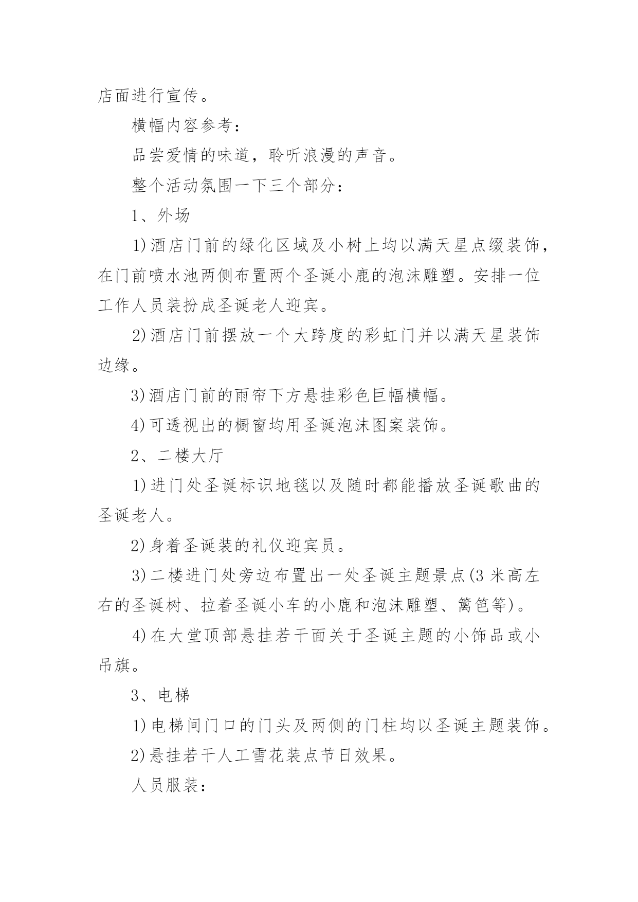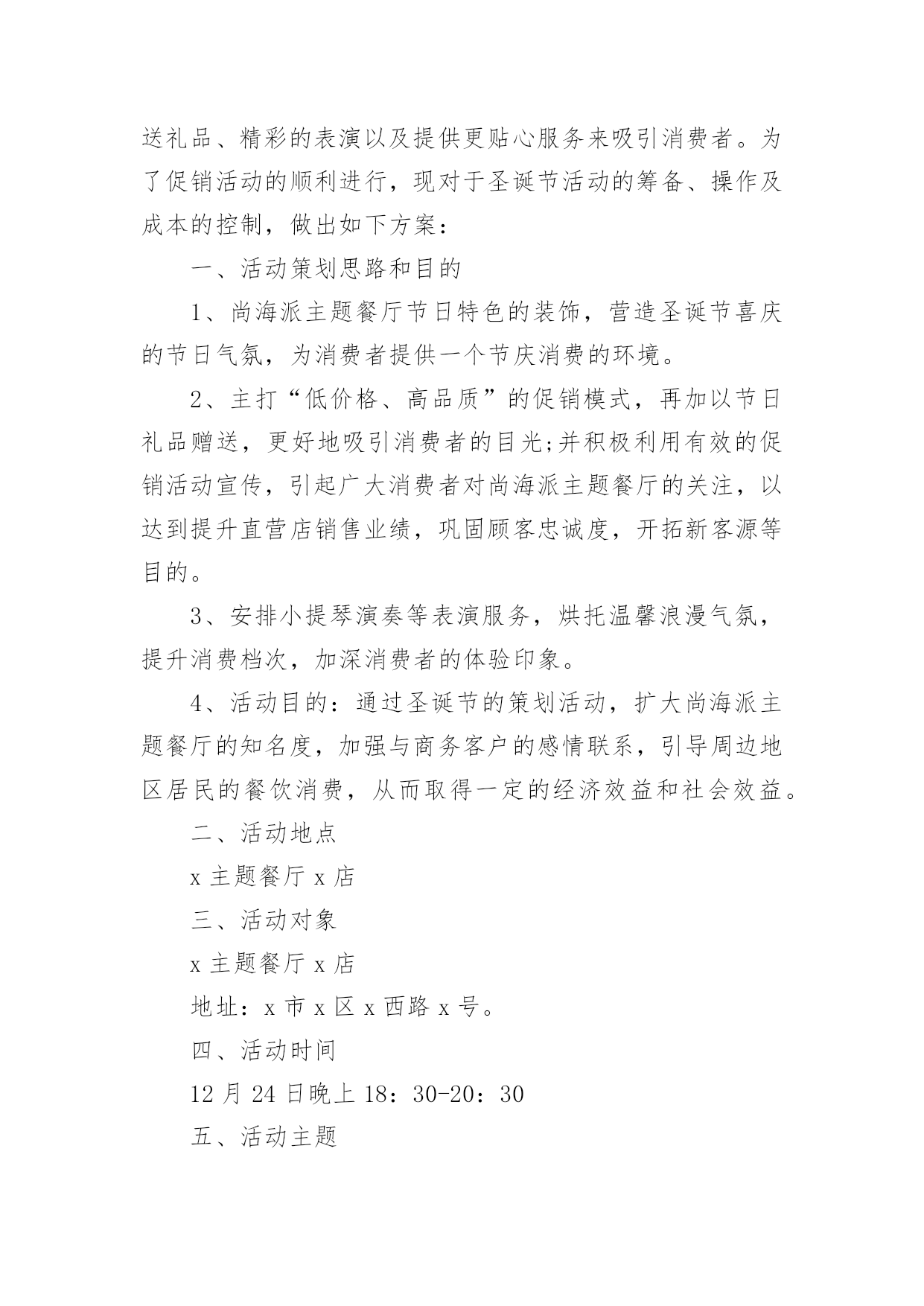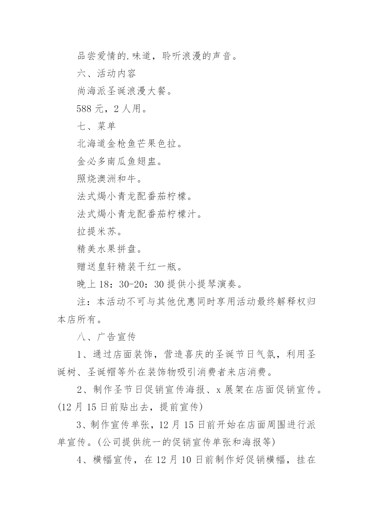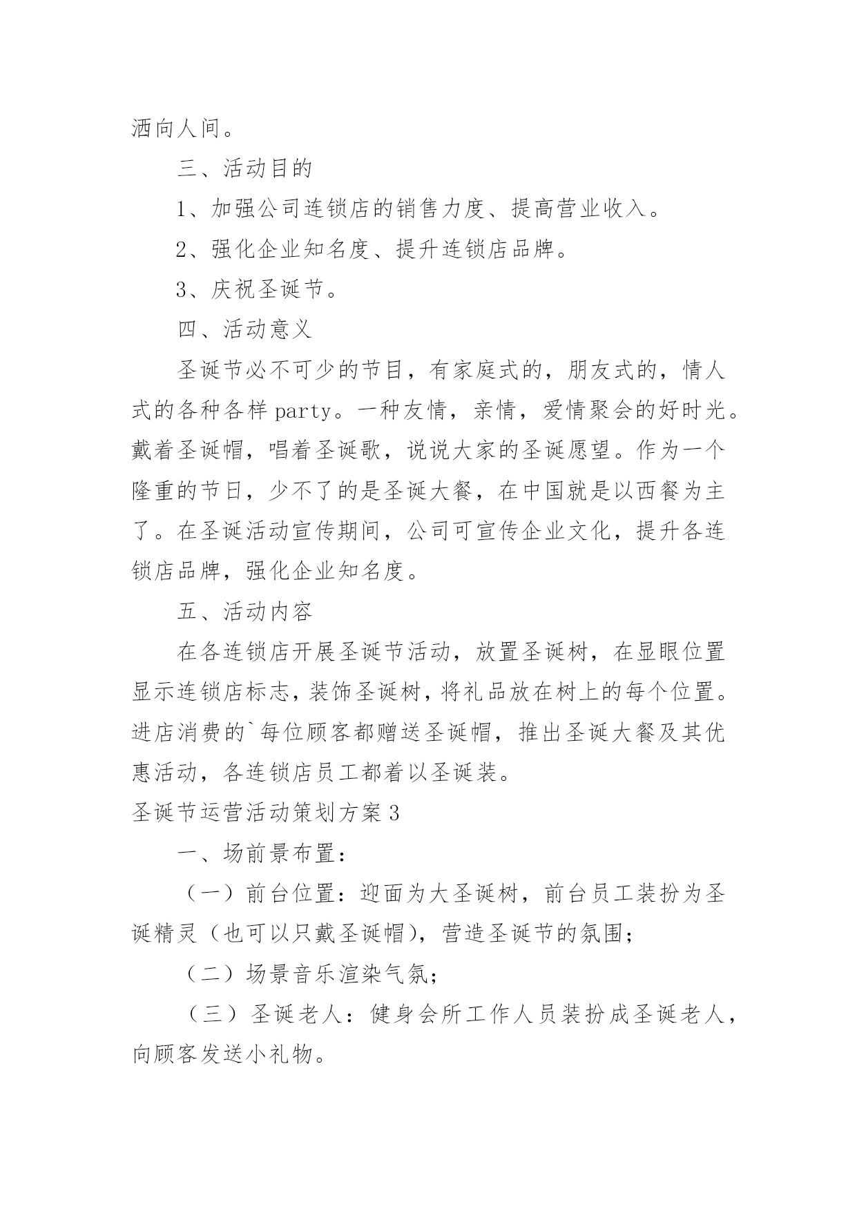 圣诞节运营活动策划方案圣诞节运营活动策划方案(8篇)为了确保事情或工作扎实开展,通常会被要求事先制定方案,方案是从目的、要求、方式、方法、进度等都部署具体、周密,并有很强可操作性的计划。制定方案需要注意哪些问题呢?下面是小编为大家收集的圣诞节运营活动策划方案,供大家参考借鉴,希望可以帮助到有需要的朋友。圣诞节运营活动策划方案1一、活动名称圣诞狂欢,共享快乐。二、活动时间20xx年x月x日至20xx年x月x日。三、活动目的通过活动让孩子们了解西方国家的风俗,知道圣诞节是西方的重要节日。通过活动体验圣诞节欢乐的气氛,并与同伴,老师,家长共同分享节日快乐。四、人员邀请本班所有幼儿家长,园内领导,圣诞老人。五、物品准备幼儿园:气球x个、大铃铛挂饰x个,大雪花片x片,邀请函x张,小礼物x个(小喇叭),宽胶带x卷,幻灯片圣诞节来历,麦克风,大蜡烛x支,红色小许愿袜x个,礼花x瓶。家长:幼儿卡通面具,圣诞帽及服饰,各类食物小漏勺及小勺各一个,玩具水桶一个,要求家长幼儿穿运动休闲服装。孩子:小碗x个,大许愿盒一个,碗底贴小月亮。六、人员安排A老师负责活动的主持及幼儿和家长的管理和协调。B老师负责协助A老师,放音乐及活动物品的准备。C老师负责协助主副班管理幼儿的饮水如厕及为幼儿提供充足的饮用水等。七、安全事项注意孩子们的安全问题。在游戏过程中防止幼儿拥挤以及磕碰现象。八、紧急预案如果有家长缺席,配班老师来和该幼儿做亲子游戏,照顾到孩子的心情。九、处理原则游戏过程中注意幼儿的分配,防止拥挤,出现磕碰现象立刻请校医处理。圣诞节运营活动策划方案2一、活动主题冬季生活的恋歌,送圣诞祝福。二、副主题让我们把圣诞的钟声传播四方,也让我们把友爱和赞美洒向人间。三、活动目的1、加强公司连锁店的销售力度、提高营业收入。2、强化企业知名度、提升连锁店品牌。3、庆祝圣诞节。四、活动意义圣诞节必不可少的节目,有家庭式的,朋友式的,情人式的各种各样party。一种友情,亲情,爱情聚会的好时光。戴着圣诞帽,唱着圣诞歌,说说大家的圣诞愿望。作为一个隆重的节日,少不了的是圣诞大餐,在中国就是以西餐为主了。在圣诞活动宣传期间,公司可宣传企业文化,提升各连锁店品牌,强化企业知名度。五、活动内容在各连锁店开展圣诞节活动,放置圣诞树,在显眼位置显示连锁店标志,装饰圣诞树,将礼品放在树上的每个位置。进店消费的`每位顾客都赠送圣诞帽,推出圣诞大餐及其优惠活动,各连锁店员工都着以圣诞装。圣诞节运营活动策划方案3一、场前景布置:(一)前台位置:迎面为大圣诞树,前台员工装扮为圣诞精灵(也可以只戴圣诞帽),营造圣诞节的氛围;(二)场景音乐渲染气氛;(三)圣诞老人:健身会所工作人员装扮成圣诞老人,向顾客发送小礼物。二、促销活动说明(一)威斯堡健身会所会所给你一个心愿顾客从圣诞节当日进入店内,由前台工作人员发送心愿卡,顾客填写圣诞心愿,将心愿卡挂至圣诞树上,在活动进入高潮时由圣诞老人在圣诞树上抽取心愿卡,帮顾客完成心愿。心愿卡的制作:在心愿卡上可以固定的心愿。(比如:送半年的健身卡,送课程等,也可以写上实质性的礼物,比如:iphon、ipad等)(二)凡在圣诞节当日进店的客户均可以领取圣诞小礼物一份(由前台小精灵送出)送出礼物需要客户签名(防止客户冒领,多领)与上述心愿卡同步进行。(三)圣诞节当日凡健身会所会员,可以携带一位朋友进店体验,由会员携带进店的客户,只可以领取小奖品,不能填写心愿卡。(四)活动高潮活动1、时间制定:结合客户进店的高峰期,将核心活动定在那个时间段,保证有足够多的客户可以参加进来;2、活动内容:(1)全店员工可以跳健身操/邀请舞蹈演员——炒热气氛。(2)由店长宣布圣诞节狂欢送礼开始。(3)活动设置:a、平板支撑——可以邀请会员混合员工进行平板支撑比赛,获胜者有奖励(礼物赠送)——目的:增强会员的归属感,给以家人一样的亲切感;b、蹬自行车比赛:同上。(4)游戏时间:邀请客户做你比我猜等游戏。Ps:上述所有的活动要穿插店内员工/舞蹈演员的舞蹈进行,不能一直进行比赛或者游戏。(五)建议:活动当日在核心活动开始时间进店的非会员客户,凡缴纳10元/5元(费用自定)可以参与当日活动,在前台处只领取小礼物,不签署心愿卡——目的:增强非会员顾客的体验感,促成签单。三、活动前准备宣传:1、所有的会籍顾问对自己的会员客户,发送短息,或者电话通知,店内圣诞节活动。2、会籍顾问向所有有意向客户发短息,打电话邀请客户进店。3、提前3天开始发放单页。4、微信群通知客户。务必做到通过活动开发更多潜在客户,维系老客户。圣诞节运营活动策划方案412月25日是圣诞节,根据往年经验,下周起将进入圣诞大餐的预订高峰。由于物价上涨,为了控制成本,相较于往年的打折优惠,尚海派主题餐厅今年的促销活动主要以赠送礼品、精彩