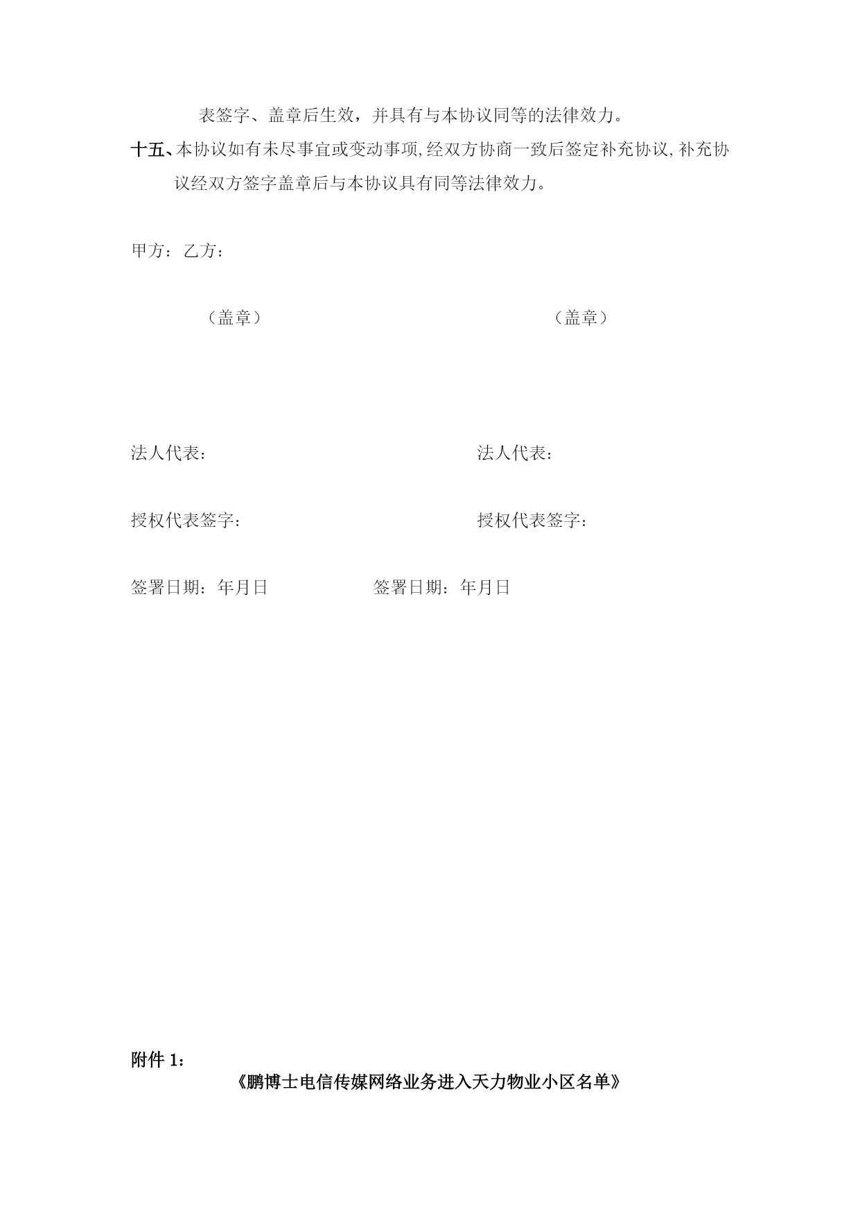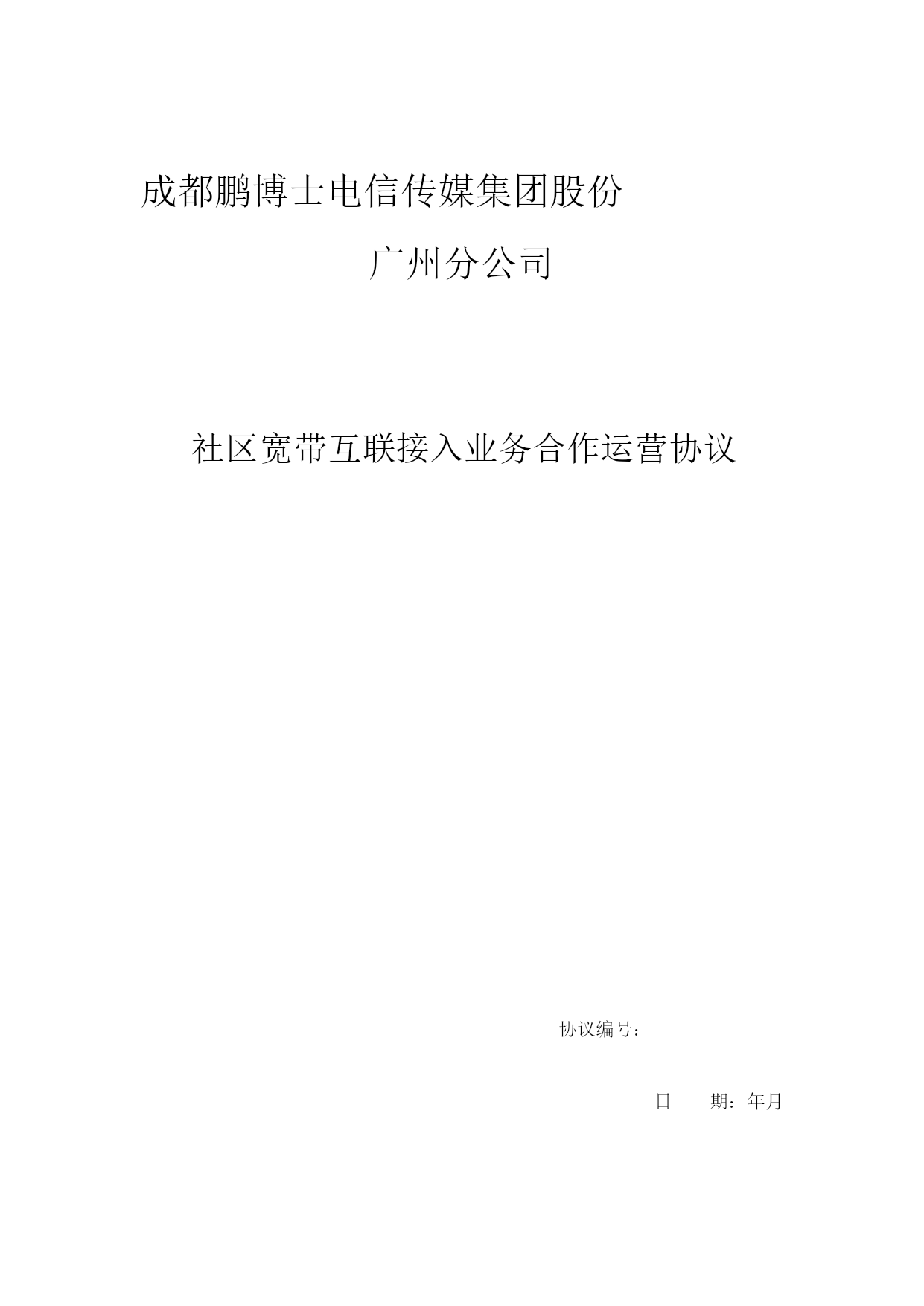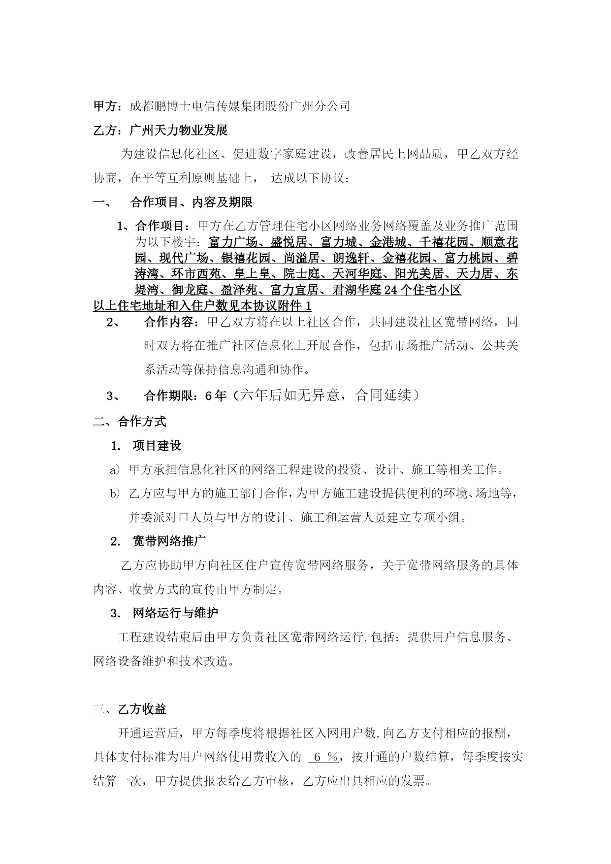 社区宽带互联接入业务合作运营协议优质资料(可以直接使用,可编辑优质资料,欢迎下载)成都鹏博士电信传媒集团股份广州分公司社区宽带互联接入业务合作运营协议协议编号:日期:年月甲方:成都鹏博士电信传媒集团股份广州分公司乙方:广州天力物业发展为建设信息化社区、促进数字家庭建设,改善居民上网品质,甲乙双方经协商,在平等互利原则基础上,达成以下协议:合作项目、内容及期限1、合作项目:甲方在乙方管理住宅小区网络业务网络覆盖及业务推广范围为以下楼宇:富力广场、盛悦居、富力城、金港城、千禧花园、顺意花园、现代广场、银禧花园、尚溢居、朗逸轩、金禧花园、富力桃园、碧涛湾、环市西苑、皇上皇、院士庭、天河华庭、阳光美居、天力居、东堤湾、御龙庭、盈泽苑、富力宜居、君湖华庭24个住宅小区以上住宅地址和入住户数见本协议附件1合作内容:甲乙双方将在以上社区合作,共同建设社区宽带网络,同时双方将在推广社区信息化上开展合作,包括市场推广活动、公共关系活动等保持信息沟通和协作。合作期限:6年(六年后如无异意,合同延续)二、合作方式项目建设甲方承担信息化社区的网络工程建设的投资、设计、施工等相关工作。乙方应与甲方的施工部门合作,为甲方施工建设提供便利的环境、场地等,并委派对口人员与甲方的设计、施工和运营人员建立专项小组。宽带网络推广乙方应协助甲方向社区住户宣传宽带网络服务,关于宽带网络服务的具体内容、收费方式的宣传由甲方制定。网络运行与维护工程建设结束后由甲方负责社区宽带网络运行,包括:提供用户信息服务、网络设备维护和技术改造。三、乙方收益开通运营后,甲方每季度将根据社区入网用户数,向乙方支付相应的报酬,具体支付标准为用户网络使用费收入的6%,按开通的户数结算,每季度按实结算一次,甲方提供报表给乙方审核,乙方应出具相应的发票。四、基础设施乙方无偿提供社区信息中心机房,机房面积为平方米,机房位置为号楼无偿提供分机房_______个。乙方无偿提供网络设备所需的楼层设备空间及其他部位的安装空间以及楼层设备所需的电源接。3、乙方每个小区提供不小3处的电源接口给甲方,由甲方接电并安装电表,乙方可按商业用电向甲方收费,每二个月收费一次,如甲方不按时交费,乙方可暂停供电。五、甲方权利义务甲方在本社区内负责并投资建设光纤接入线路、网络设备等。甲方承诺对建设完成的网络系统负责维护,对用户提供技术支持与服务。甲方负责社区宽带网络的运营、运维工作,包括(但不限于)对宽带网络的宣传、对用户的签约收费以及社区内宽带网络的日常维护工作向乙方提供社区布线及网络系统的相关标准,并充分征求乙方的意见。甲方承诺:在社区宽带网络建成并验收合格后1个半月内开通社区网络服务。六、乙方权利义务乙方应为甲方的网络施工和运营维护提供必要的技术资料和工作条件,包括(但不限于):社区总平面图、大楼平面图、及其施工所必需的建筑图纸等(并尽力向甲方提供数据文件),在网络开通运营后,甲方具有保留的权利,以便于宽带网络运营与维修。乙方向社区住户推广介绍甲方提供的宽带网络服务。乙方应为甲方负责运营的宽带网络线路、设备提供安全稳定的社区运行环境,同时为甲方运维人员提供必要的工作条件。七、产权归属网络工程内的设备、线路根据双方投资划分各自所有权,彼此不得侵犯对方财产。甲方拥有对社区内信息网络的使用、经营权。八、违约责任合同期内甲乙双方中任何一方不得单方面变更或取消本协议,否则将构成违约,违约方须赔偿对方因此而造成的一切经济损失。九、免责条款协议双方中的一方因不可抗力因素而无法履行本协议时,本协议的有效期将自动延长。延长的期限将根据发生不可抗力事件的一方的有关书面证明进行确认、补充,并将作为本协议的附件而具有与本协议同等的法律效力。不可抗力因素是指水灾、台风、地震、火灾等自然灾害、战争、国家法律和政策的变更或其他不能预见并且对其发生和后果不能防止和避免的情况以及双方均认可的其他属于不可抗力的因素。因不可抗力导致甲乙双方或一方不能履行或不能完全履行本协议各项有关义务时,甲乙双方互相不承担违约责任。遇有不可抗力的一方或双方应于不可抗力发生后10日内将情况以书面形式告知对方,并提供有关机关的证明。在不可抗力影响消除后的合理时间内,一方或双方应当继续履行合同。十、协议变更与解除甲乙双方中任何一方欲变更、解除协议,必须采取书面形式;任何一方解除协议需提前三个月以书面形式向对方提出。由于终止协议带来的任何纠纷由双方协商解决。本协议的任何条款在任何时候变成不合法、无效或不可强制执行而不根本上影响本协议的效力时,本协议的其他条款应不受影响。十一、保密条款甲乙双方应对本协议条款保密,不得向第三方泄露。乙方提供给