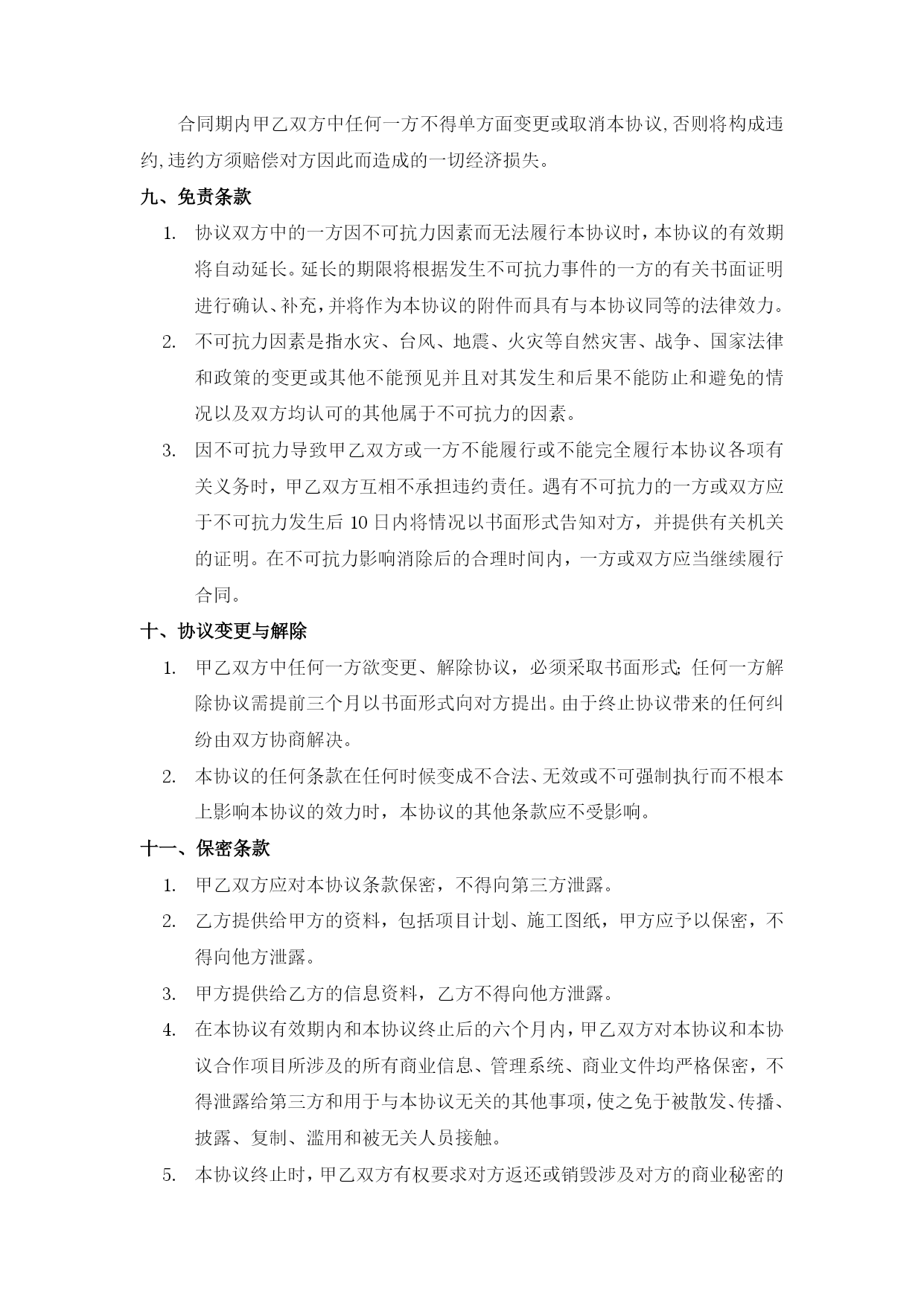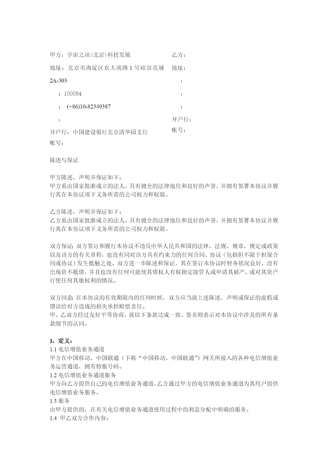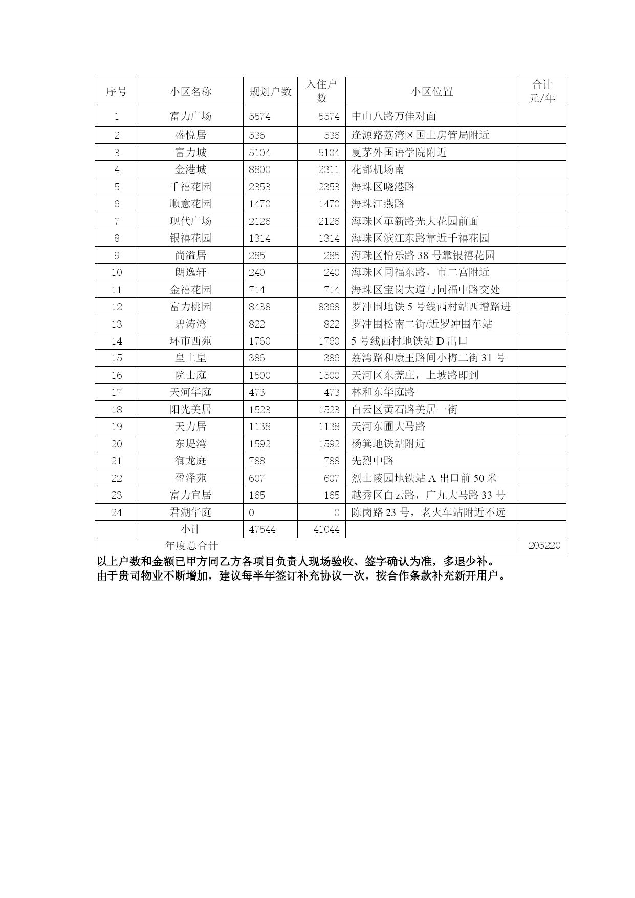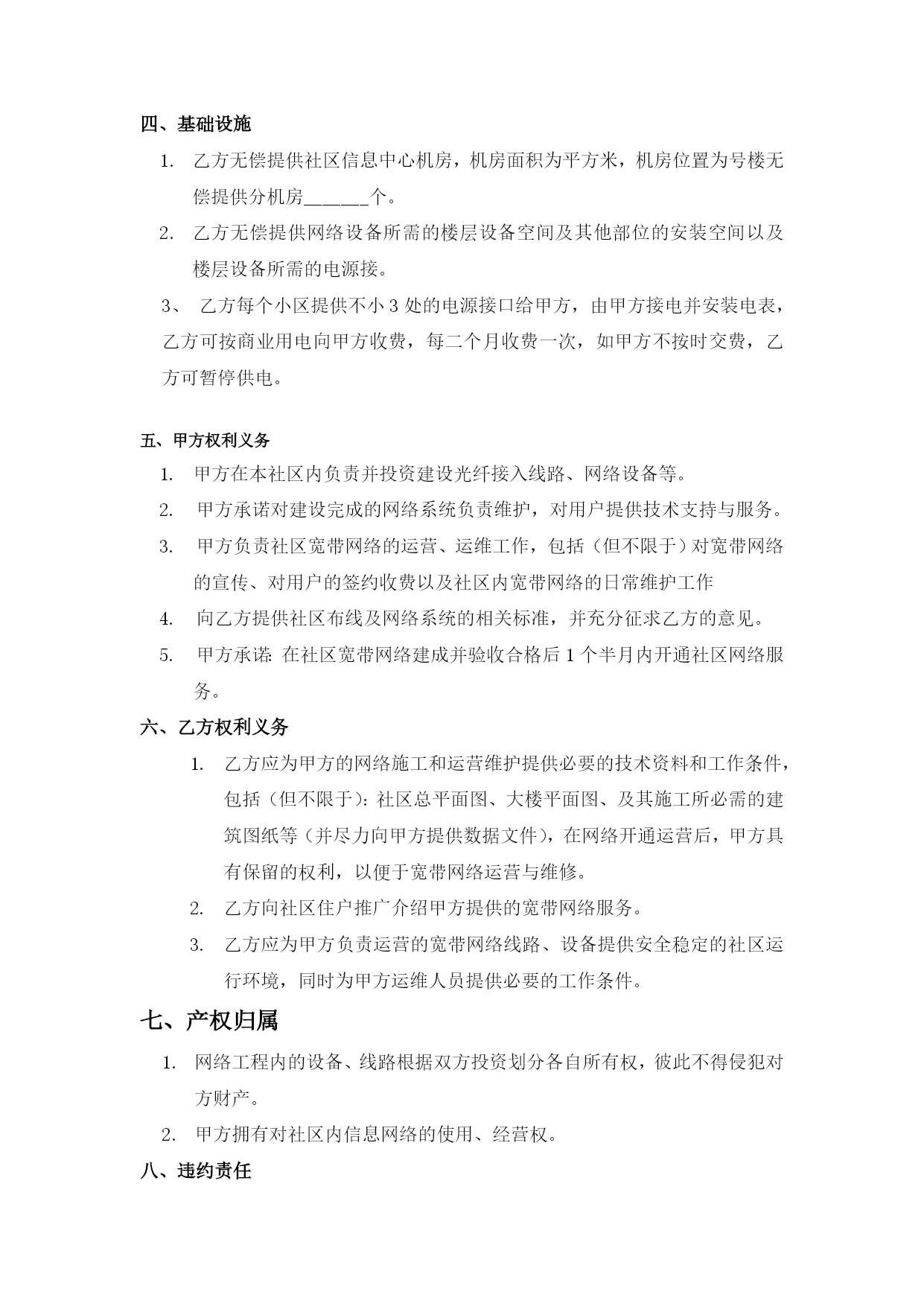 社区宽带互联接入业务合作运营协议优质资料(可以直接使用,可编辑优质资料,欢迎下载)成都鹏博士电信传媒集团股份广州分公司社区宽带互联接入业务合作运营协议协议编号:日期:年月甲方:成都鹏博士电信传媒集团股份广州分公司乙方:广州天力物业发展为建设信息化社区、促进数字家庭建设,改善居民上网品质,甲乙双方经协商,在平等互利原则基础上,达成以下协议:合作项目、内容及期限1、合作项目:甲方在乙方管理住宅小区网络业务网络覆盖及业务推广范围为以下楼宇:富力广场、盛悦居、富力城、金港城、千禧花园、顺意花园、现代广场、银禧花园、尚溢居、朗逸轩、金禧花园、富力桃园、碧涛湾、环市西苑、皇上皇、院士庭、天河华庭、阳光美居、天力居、东堤湾、御龙庭、盈泽苑、富力宜居、君湖华庭24个住宅小区以上住宅地址和入住户数见本协议附件1合作内容:甲乙双方将在以上社区合作,共同建设社区宽带网络,同时双方将在推广社区信息化上开展合作,包括市场推广活动、公共关系活动等保持信息沟通和协作。合作期限:6年(六年后如无异意,合同延续)二、合作方式项目建设甲方承担信息化社区的网络工程建设的投资、设计、施工等相关工作。乙方应与甲方的施工部门合作,为甲方施工建设提供便利的环境、场地等,并委派对口人员与甲方的设计、施工和运营人员建立专项小组。宽带网络推广乙方应协助甲方向社区住户宣传宽带网络服务,关于宽带网络服务的具体内容、收费方式的宣传由甲方制定。网络运行与维护工程建设结束后由甲方负责社区宽带网络运行,包括:提供用户信息服务、网络设备维护和技术改造。三、乙方收益开通运营后,甲方每季度将根据社区入网用户数,向乙方支付相应的报酬,具体支付标准为用户网络使用费收入的6%,按开通的户数结算,每季度按实结算一次,甲方提供报表给乙方审核,乙方应出具相应的发票。四、基础设施乙方无偿提供社区信息中心机房,机房面积为平方米,机房位置为号楼无偿提供分机房_______个。乙方无偿提供网络设备所需的楼层设备空间及其他部位的安装空间以及楼层设备所需的电源接。3、乙方每个小区提供不小3处的电源接口给甲方,由甲方接电并安装电表,乙方可按商业用电向甲方收费,每二个月收费一次,如甲方不按时交费,乙方可暂停供电。五、甲方权利义务甲方在本社区内负责并投资建设光纤接入线路、网络设备等。甲方承诺对建设完成的网络系统负责维护,对用户提供技术支持与服务。甲方负责社区宽带网络的运营、运维工作,包括(但不限于)对宽带网络的宣传、对用户的签约收费以及社区内宽带网络的日常维护工作向乙方提供社区布线及网络系统的相关标准,并充分征求乙方的意见。甲方承诺:在社区宽带网络建成并验收合格后1个半月内开通社区网络服务。六、乙方权利义务乙方应为甲方的网络施工和运营维护提供必要的技术资料和工作条件,包括(但不限于):社区总平面图、大楼平面图、及其施工所必需的建筑图纸等(并尽力向甲方提供数据文件),在网络开通运营后,甲方具有保留的权利,以便于宽带网络运营与维修。乙方向社区住户推广介绍甲方提供的宽带网络服务。乙方应为甲方负责运营的宽带网络线路、设备提供安全稳定的社区运行环境,同时为甲方运维人员提供必要的工作条件。七、产权归属网络工程内的设备、线路根据双方投资划分各自所有权,彼此不得侵犯对方财产。甲方拥有对社区内信息网络的使用、经营权。八、违约责任合同期内甲乙双方中任何一方不得单方面变更或取消本协议,否则将构成违约,违约方须赔偿对方因此而造成的一切经济损失。九、免责条款协议双方中的一方因不可抗力因素而无法履行本协议时,本协议的有效期将自动延长。延长的期限将根据发生不可抗力事件的一方的有关书面证明进行确认、补充,并将作为本协议的附件而具有与本协议同等的法律效力。不可抗力因素是指水灾、台风、地震、火灾等自然灾害、战争、国家法律和政策的变更或其他不能预见并且对其发生和后果不能防止和避免的情况以及双方均认可的其他属于不可抗力的因素。因不可抗力导致甲乙双方或一方不能履行或不能完全履行本协议各项有关义务时,甲乙双方互相不承担违约责任。遇有不可抗力的一方或双方应于不可抗力发生后10日内将情况以书面形式告知对方,并提供有关机关的证明。在不可抗力影响消除后的合理时间内,一方或双方应当继续履行合同。十、协议变更与解除甲乙双方中任何一方欲变更、解除协议,必须采取书面形式;任何一方解除协议需提前三个月以书面形式向对方提出。由于终止协议带来的任何纠纷由双方协商解决。本协议的任何条款在任何时候变成不合法、无效或不可强制执行而不根本上影响本协议的效力时,本协议的其他条款应不受影响。十一、保密条款甲乙双方应对本协议条款保密,不得向第三方泄露。乙方提供给