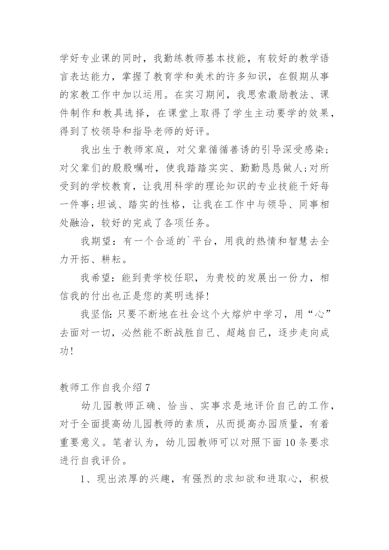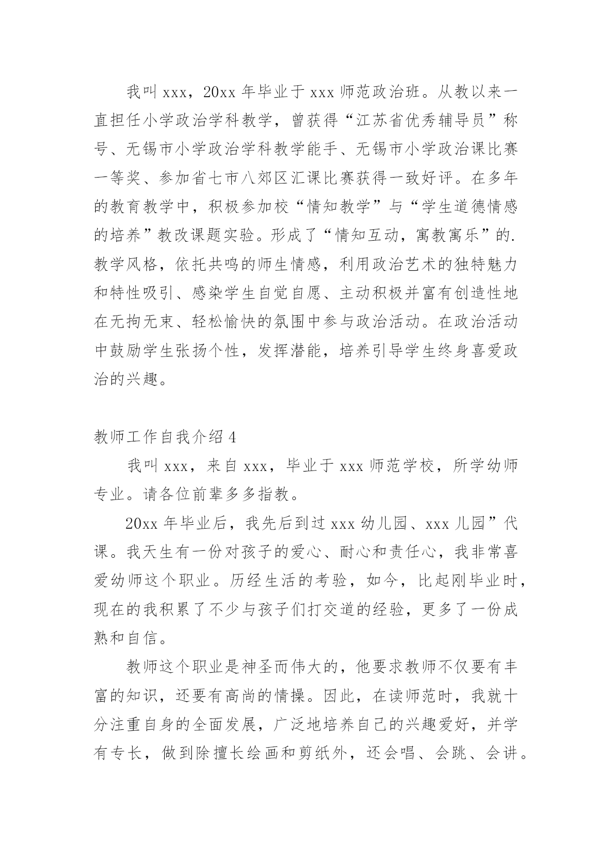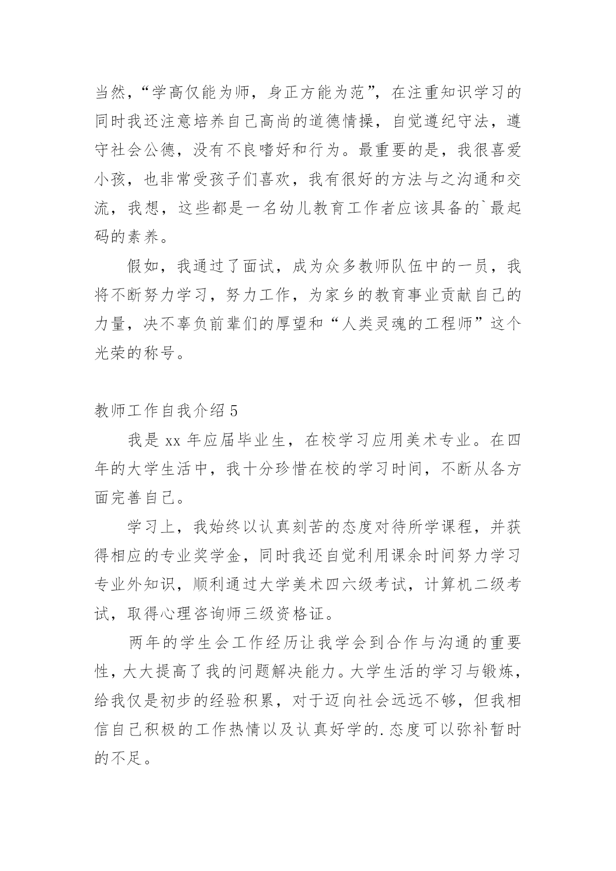 教师工作自我介绍当来到一个新环境时,我们就有可能用到自我介绍,通过自我介绍可以得到他人的欣赏。那么我们该怎么去写自我介绍呢?以下是小编收集整理的教师工作自我介绍,仅供参考,大家一起来看看吧。教师工作自我介绍1尊敬的各位评委老师:我是第十一组15号选手,本科就读于历史技术专业。从小,我就立志成为一名优秀的人民教师,可以帮助孩子们答疑解惑,扫除求学道路上的障碍。我严格要求自己,提升自己各方面的素质,以期待着将来可以走上这三尺讲台,完成自己的理想,帮助更多孩子实现他们的理想。下面我将从三个方面阐述我此次参加历史类教师资格考试面试所具备的优势:一、我大学所学的本科专业是历史技术,通过对历史类基础知识和实验技能的系统学习,为我将来就学生学习历史方面所遇到的问题进行答疑解惑提供了理论基础。二、大学期间,我积极参与社会教学实践,阳光支教,教师职业技能培训等活动为我提供了丰富的实践经验,使我有机会将理论和实践结合,可以从容的对课堂上发生的'任何问题随机应变。三、通过对教育学、教育历史、教师职业道德等内容的系统学习,我对教师又有了更深层次的认识,并有幸通过今年的教师资格证笔试。如果我今天可以通过此次面试,那么我将以实际行动将人师表敬业奉献的精神践行贯彻到底。即使我没有通过,我也会严格要求自己,使自己离教师的标准近一点,更近一点。教师工作自我介绍2我是xx职校的xxx。有过几次实习经验,在实习中我本着一颗童心、爱心、信心,始终如一地对待每一个家长和孩子,受到一致好评。我的性格开朗、热情大方。之前有过教学经验,但是也有好多不足的地方,希望到您园能学到更多、更好的的教学经验,可以更好的完善自己。在教幼儿知识时我看到幼儿露出那天真的笑脸和提出幼稚的`问题时,我都会很有耐心的回答。因为我喜欢幼儿,所以我有足够的耐心。幼儿的好奇心,让我变成了百科全书。幼儿的许多为什么,让我心中充满了追去求案的欲望。因为我喜欢幼儿的欢声笑语,所以我选择了这门职业。我知道学前教育这条道不好走,我想既然我喜欢了,选择了,就要坚持、努力的做到最好。如果园长肯给我一次机会,我会更加努力,不负所望,把我的潜能发挥出来。在此谢谢各位园长。教师工作自我介绍3各位尊敬的考官:大家好!我叫xxx,20xx年毕业于xxx师范政治班。从教以来一直担任小学政治学科教学,曾获得“江苏省优秀辅导员”称号、无锡市小学政治学科教学能手、无锡市小学政治课比赛一等奖、参加省七市八郊区汇课比赛获得一致好评。在多年的教育教学中,积极参加校“情知教学”与“学生道德情感的培养”教改课题实验。形成了“情知互动,寓教寓乐”的.教学风格,依托共鸣的师生情感,利用政治艺术的独特魅力和特性吸引、感染学生自觉自愿、主动积极并富有创造性地在无拘无束、轻松愉快的氛围中参与政治活动。在政治活动中鼓励学生张扬个性,发挥潜能,培养引导学生终身喜爱政治的兴趣。教师工作自我介绍4我叫xxx,来自xxx,毕业于xxx师范学校,所学幼师专业。请各位前辈多多指教。20xx年毕业后,我先后到过xxx幼儿园、xxx儿园”代课。我天生有一份对孩子的爱心、耐心和责任心,我非常喜爱幼师这个职业。历经生活的考验,如今,比起刚毕业时,现在的我积累了不少与孩子们打交道的经验,更多了一份成熟和自信。教师这个职业是神圣而伟大的,他要求教师不仅要有丰富的知识,还要有高尚的情操。因此,在读师范时,我就十分注重自身的全面发展,广泛地培养自己的兴趣爱好,并学有专长,做到除擅长绘画和剪纸外,还会唱、会跳、会讲。当然,“学高仅能为师,身正方能为范”,在注重知识学习的同时我还注意培养自己高尚的道德情操,自觉遵纪守法,遵守社会公德,没有不良嗜好和行为。最重要的是,我很喜爱小孩,也非常受孩子们喜欢,我有很好的方法与之沟通和交流,我想,这些都是一名幼儿教育工作者应该具备的`最起码的素养。假如,我通过了面试,成为众多教师队伍中的一员,我将不断努力学习,努力工作,为家乡的教育事业贡献自己的力量,决不辜负前辈们的厚望和“人类灵魂的工程师”这个光荣的称号。教师工作自我介绍5我是xx年应届毕业生,在校学习应用美术专业。在四年的大学生活中,我十分珍惜在校的学习时间,不断从各方面完善自己。学习上,我始终以认真刻苦的态度对待所学课程,并获得相应的专业奖学金,同时我还自觉利用课余时间努力学习专业外知识,顺利通过大学美术四六级考试,计算机二级考试,取得心理咨询师三级资格证。两年的学生会工作经历让我学会到合作与沟通的重要性,大大提高了我的问题解决能力。大学生活的学习与锻炼,给我仅是初步的经验积累,对于迈向社会远远不够,但我相信自己积极的工作热情以及认真好学的.态度可以弥补暂时的不足。同时,作为一名师范专业的学生,为了以后能成为一名合格出色的教师,我努力学习教育学、教育美术等相关教育课程,为以后从事教育工作