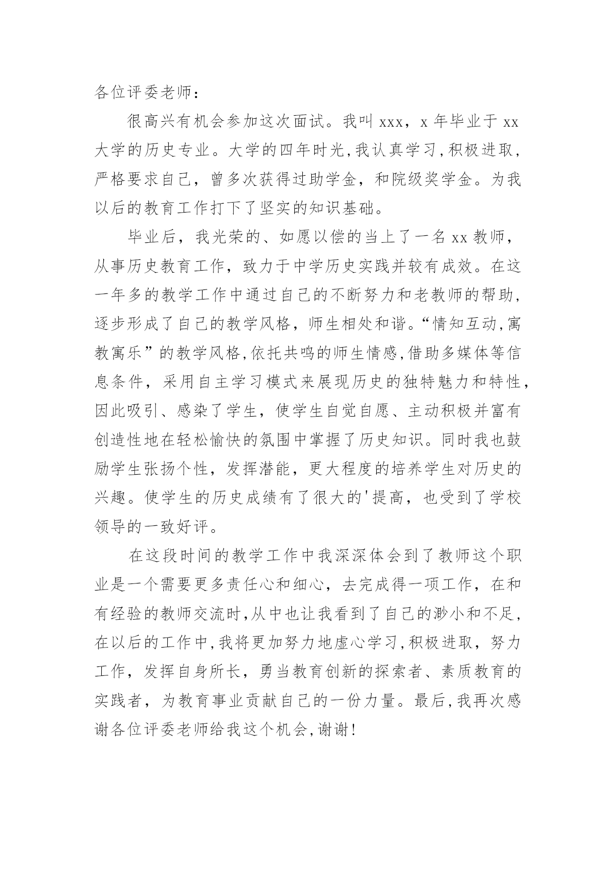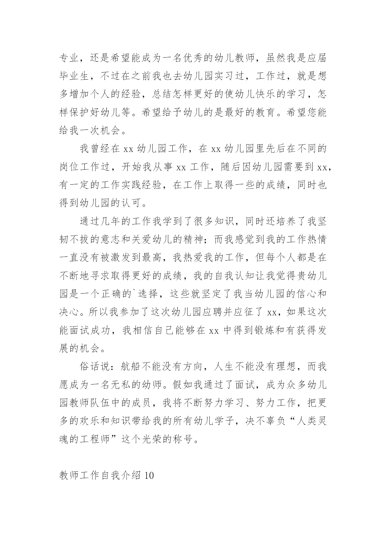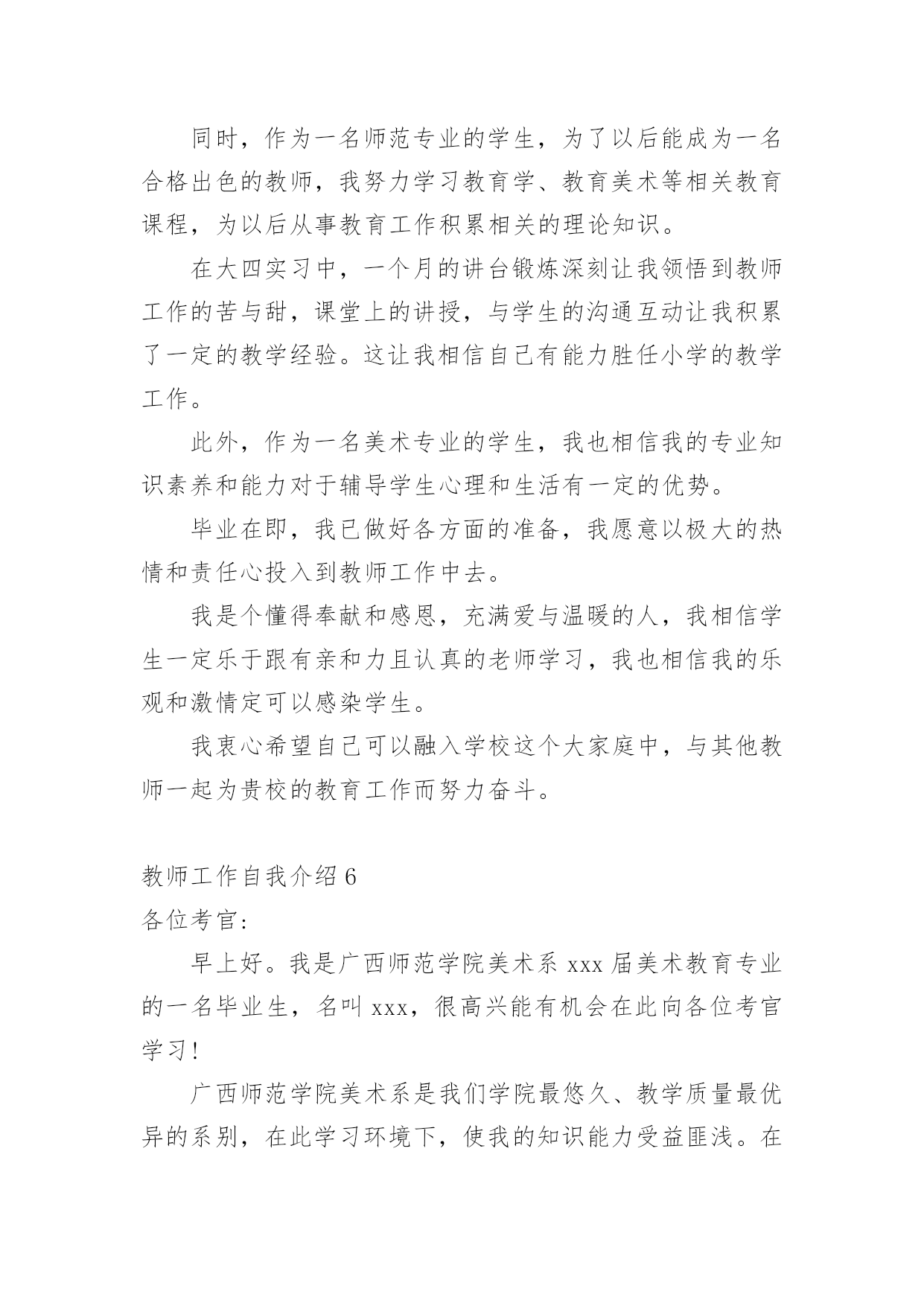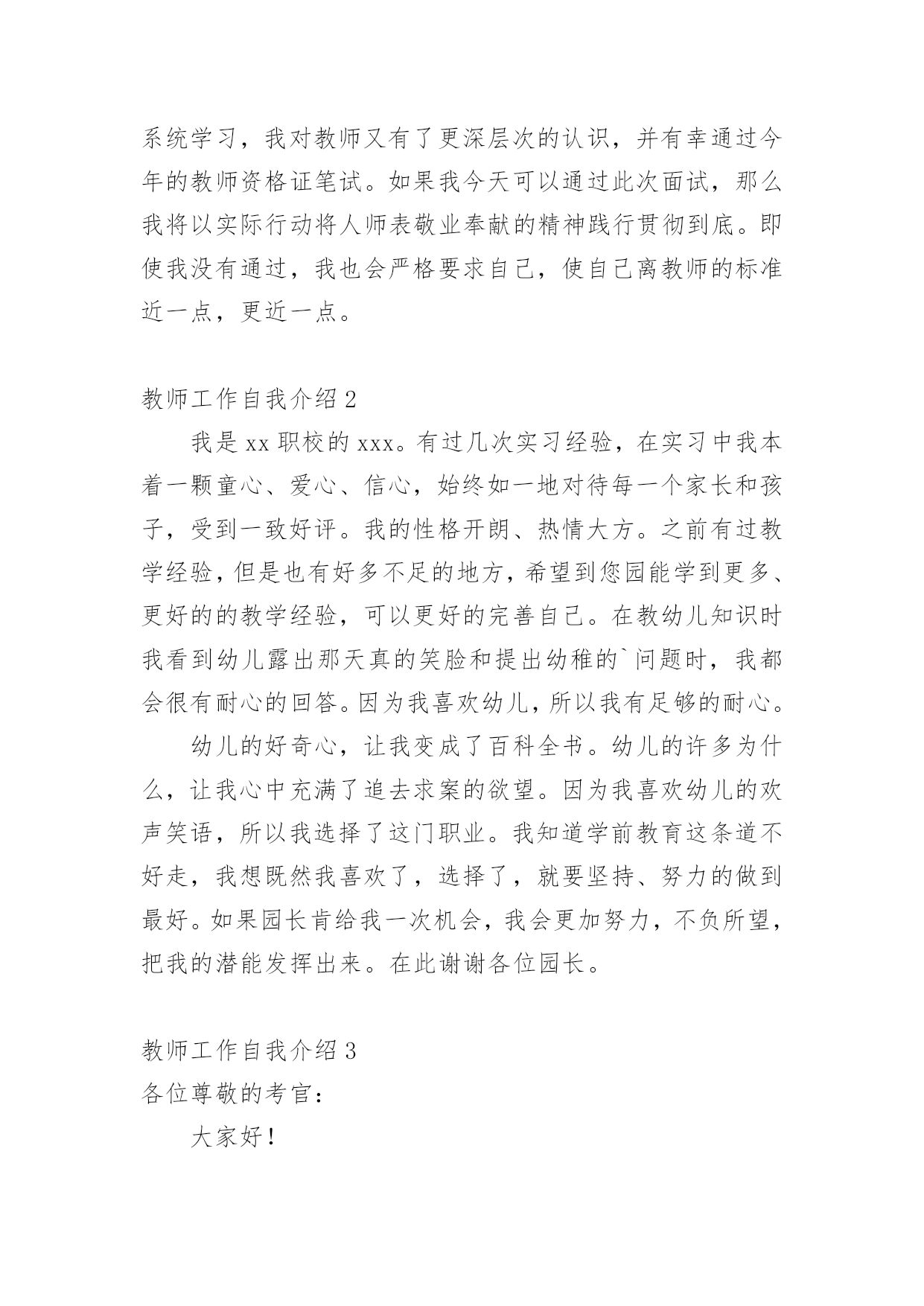 教师工作自我介绍当来到一个新环境时,我们就有可能用到自我介绍,通过自我介绍可以得到他人的欣赏。那么我们该怎么去写自我介绍呢?以下是小编收集整理的教师工作自我介绍,仅供参考,大家一起来看看吧。教师工作自我介绍1尊敬的各位评委老师:我是第十一组15号选手,本科就读于历史技术专业。从小,我就立志成为一名优秀的人民教师,可以帮助孩子们答疑解惑,扫除求学道路上的障碍。我严格要求自己,提升自己各方面的素质,以期待着将来可以走上这三尺讲台,完成自己的理想,帮助更多孩子实现他们的理想。下面我将从三个方面阐述我此次参加历史类教师资格考试面试所具备的优势:一、我大学所学的本科专业是历史技术,通过对历史类基础知识和实验技能的系统学习,为我将来就学生学习历史方面所遇到的问题进行答疑解惑提供了理论基础。二、大学期间,我积极参与社会教学实践,阳光支教,教师职业技能培训等活动为我提供了丰富的实践经验,使我有机会将理论和实践结合,可以从容的对课堂上发生的'任何问题随机应变。三、通过对教育学、教育历史、教师职业道德等内容的系统学习,我对教师又有了更深层次的认识,并有幸通过今年的教师资格证笔试。如果我今天可以通过此次面试,那么我将以实际行动将人师表敬业奉献的精神践行贯彻到底。即使我没有通过,我也会严格要求自己,使自己离教师的标准近一点,更近一点。教师工作自我介绍2我是xx职校的xxx。有过几次实习经验,在实习中我本着一颗童心、爱心、信心,始终如一地对待每一个家长和孩子,受到一致好评。我的性格开朗、热情大方。之前有过教学经验,但是也有好多不足的地方,希望到您园能学到更多、更好的的教学经验,可以更好的完善自己。在教幼儿知识时我看到幼儿露出那天真的笑脸和提出幼稚的`问题时,我都会很有耐心的回答。因为我喜欢幼儿,所以我有足够的耐心。幼儿的好奇心,让我变成了百科全书。幼儿的许多为什么,让我心中充满了追去求案的欲望。因为我喜欢幼儿的欢声笑语,所以我选择了这门职业。我知道学前教育这条道不好走,我想既然我喜欢了,选择了,就要坚持、努力的做到最好。如果园长肯给我一次机会,我会更加努力,不负所望,把我的潜能发挥出来。在此谢谢各位园长。教师工作自我介绍3各位尊敬的考官:大家好!我叫xxx,20xx年毕业于xxx师范政治班。从教以来一直担任小学政治学科教学,曾获得“江苏省优秀辅导员”称号、无锡市小学政治学科教学能手、无锡市小学政治课比赛一等奖、参加省七市八郊区汇课比赛获得一致好评。在多年的教育教学中,积极参加校“情知教学”与“学生道德情感的培养”教改课题实验。形成了“情知互动,寓教寓乐”的.教学风格,依托共鸣的师生情感,利用政治艺术的独特魅力和特性吸引、感染学生自觉自愿、主动积极并富有创造性地在无拘无束、轻松愉快的氛围中参与政治活动。在政治活动中鼓励学生张扬个性,发挥潜能,培养引导学生终身喜爱政治的兴趣。教师工作自我介绍4我叫xxx,来自xxx,毕业于xxx师范学校,所学幼师专业。请各位前辈多多指教。20xx年毕业后,我先后到过xxx幼儿园、xxx儿园”代课。我天生有一份对孩子的爱心、耐心和责任心,我非常喜爱幼师这个职业。历经生活的考验,如今,比起刚毕业时,现在的我积累了不少与孩子们打交道的经验,更多了一份成熟和自信。教师这个职业是神圣而伟大的,他要求教师不仅要有丰富的知识,还要有高尚的情操。因此,在读师范时,我就十分注重自身的全面发展,广泛地培养自己的兴趣爱好,并学有专长,做到除擅长绘画和剪纸外,还会唱、会跳、会讲。当然,“学高仅能为师,身正方能为范”,在注重知识学习的同时我还注意培养自己高尚的道德情操,自觉遵纪守法,遵守社会公德,没有不良嗜好和行为。最重要的是,我很喜爱小孩,也非常受孩子们喜欢,我有很好的方法与之沟通和交流,我想,这些都是一名幼儿教育工作者应该具备的`最起码的素养。假如,我通过了面试,成为众多教师队伍中的一员,我将不断努力学习,努力工作,为家乡的教育事业贡献自己的力量,决不辜负前辈们的厚望和“人类灵魂的工程师”这个光荣的称号。教师工作自我介绍5我是xx年应届毕业生,在校学习应用美术专业。在四年的大学生活中,我十分珍惜在校的学习时间,不断从各方面完善自己。学习上,我始终以认真刻苦的态度对待所学课程,并获得相应的专业奖学金,同时我还自觉利用课余时间努力学习专业外知识,顺利通过大学美术四六级考试,计算机二级考试,取得心理咨询师三级资格证。两年的学生会工作经历让我学会到合作与沟通的重要性,大大提高了我的问题解决能力。大学生活的学习与锻炼,给我仅是初步的经验积累,对于迈向社会远远不够,但我相信自己积极的工作热情以及认真好学的.态度可以弥补暂时的不足。同时,作为一名师范专业的学生,为了以后能成为一名合格出色的教师,我努力学习教育学、教育美术等相关教育课程,为以后从事教育工作