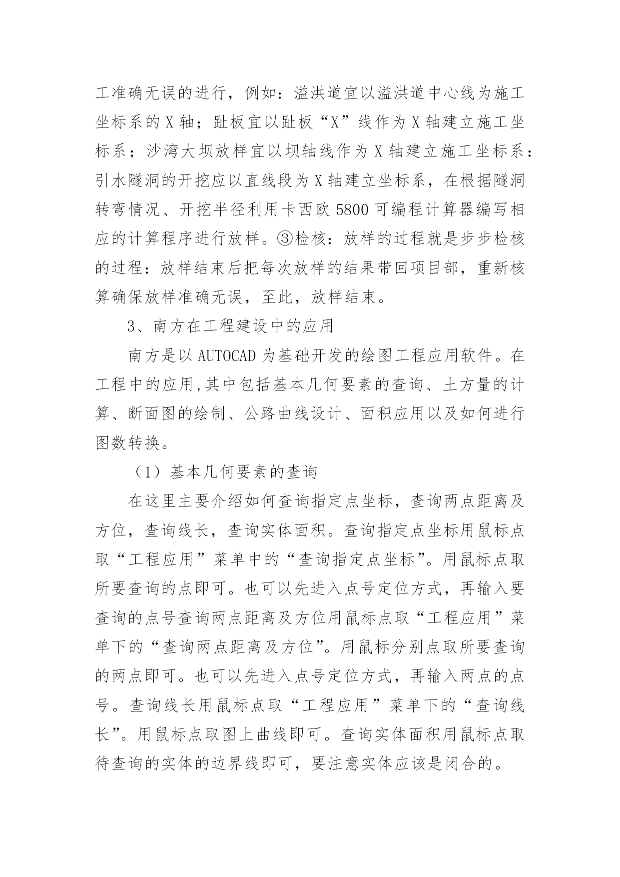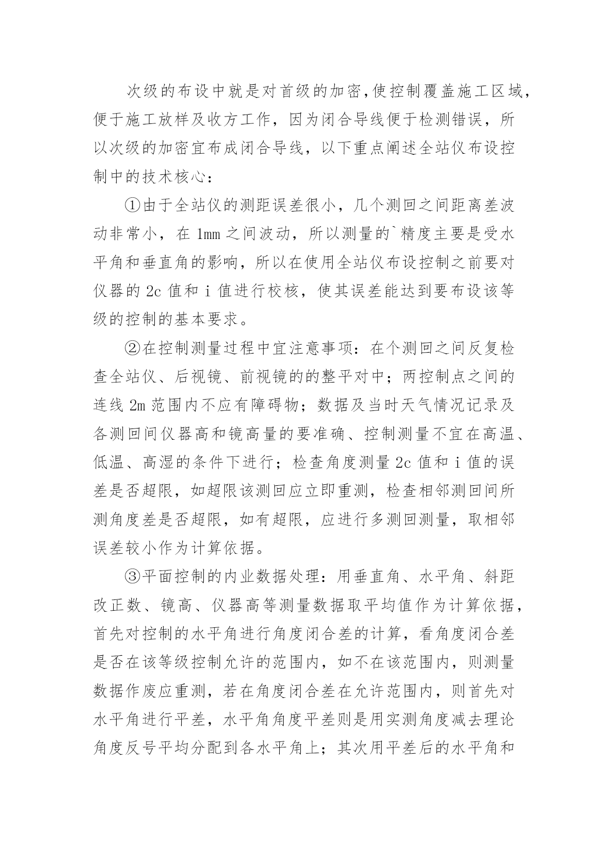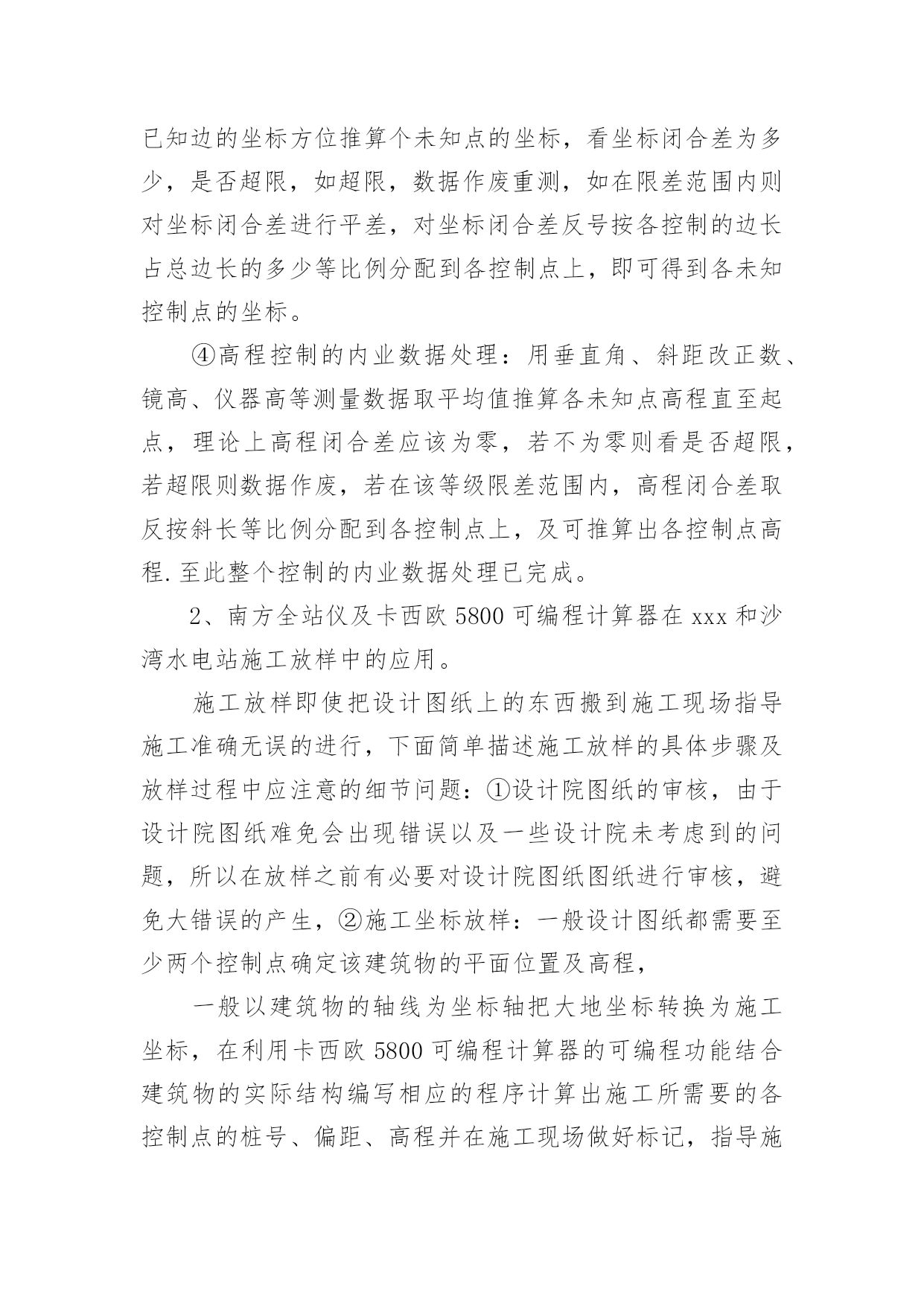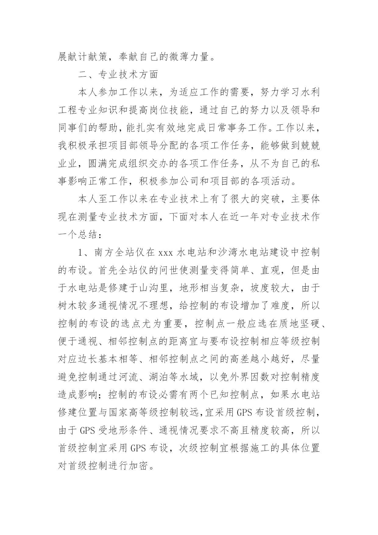 水利水电工程专业技术个人工作总结水利水电工程专业技术个人工作总结总结是对取得的成绩、存在的问题及得到的经验和教训等方面情况进行评价与描述的一种书面材料,它可以提升我们发现问题的能力,让我们一起认真地写一份总结吧。你想知道总结怎么写吗?下面是小编精心整理的水利水电工程专业技术个人工作总结,仅供参考,希望能够帮助到大家。水利水电工程专业技术个人工作总结1本人于XX年7月1日毕业于中国矿业大学测绘工程专业,XX年7月15日进入葛洲坝集团基础工程有限公司,分配至葛洲坝集团基础工程有限公司水布垭抗滑桩、阻滑键施工项目部任测量员,XX年10月10日被公司调至葛洲坝基础公司xxx水电站施工项目部任测量员,负责xxx水电站和沙湾水电站的测量工作,下面就我这一年来的工作做一次全面总结:一、政治思想方面在思想政治上,坚决拥护中国共产党的领导,积极参加各项政治活动,以实际行动向党组织靠拢,工作上以事业为重,不计个人得失,始终把水利事业和广大人民群众的利益放在首位,努力实践全心全意为人民服务的根本宗旨。在工作中吃苦耐劳,积极主动,作风踏实,勤于思考,讲求效率,始终保持极强的敬业精神和奉献精神,积极为水利事业的发展献计献策,奉献自己的微薄力量。二、专业技术方面本人参加工作以来,为适应工作的需要,努力学习水利工程专业知识和提高岗位技能,通过自己的努力以及领导和同事们的帮助,能扎实有效地完成日常事务工作。工作以来,我积极承担项目部领导分配的各项工作任务,能够做到兢兢业业,圆满完成组织交办的各项工作任务,从不为自己的私事影响正常工作,积极参加公司和项目部的各项活动。本人至工作以来在专业技术上有了很大的突破,主要体现在测量专业技术方面,下面对本人在近一年对专业技术作一个总结:1、南方全站仪在xxx水电站和沙湾水电站建设中控制的布设。首先全站仪的问世使测量变得简单、直观,但是由于水电站是修建于山沟里,地形相当复杂,坡度较大,由于树木较多通视情况不理想,给控制的布设增加了难度,所以控制的布设的选点尤为重要,控制点一般应选在质地坚硬、便于通视、相邻控制点的距离宜与要布设控制相应等级控制对应边长基本相等、相邻控制点之间的高差越小越好,尽量避免控制通过河流、湖泊等水域,以免外界因数对控制精度造成影响;控制的布设必需有两个已知控制点,如果水电站修建位置与国家高等级控制较远,宜采用GPS布设首级控制,由于GPS受地形条件、通视情况要求不高且精度较高,所以首级控制宜采用GPS布设,次级控制宜根据施工的具体位置对首级控制进行加密。次级的布设中就是对首级的加密,使控制覆盖施工区域,便于施工放样及收方工作,因为闭合导线便于检测错误,所以次级的加密宜布成闭合导线,以下重点阐述全站仪布设控制中的技术核心:①由于全站仪的测距误差很小,几个测回之间距离差波动非常小,在1mm之间波动,所以测量的`精度主要是受水平角和垂直角的影响,所以在使用全站仪布设控制之前要对仪器的2c值和i值进行校核,使其误差能达到要布设该等级的控制的基本要求。②在控制测量过程中宜注意事项:在个测回之间反复检查全站仪、后视镜、前视镜的的整平对中;两控制点之间的连线2m范围内不应有障碍物;数据及当时天气情况记录及各测回间仪器高和镜高量的要准确、控制测量不宜在高温、低温、高湿的条件下进行;检查角度测量2c值和i值的误差是否超限,如超限该测回应立即重测,检查相邻测回间所测角度差是否超限,如有超限,应进行多测回测量,取相邻误差较小作为计算依据。③平面控制的内业数据处理:用垂直角、水平角、斜距改正数、镜高、仪器高等测量数据取平均值作为计算依据,首先对控制的水平角进行角度闭合差的计算,看角度闭合差是否在该等级控制允许的范围内,如不在该范围内,则测量数据作废应重测,若在角度闭合差在允许范围内,则首先对水平角进行平差,水平角角度平差则是用实测角度减去理论角度反号平均分配到各水平角上;其次用平差后的水平角和已知边的坐标方位推算个未知点的坐标,看坐标闭合差为多少,是否超限,如超限,数据作废重测,如在限差范围内则对坐标闭合差进行平差,对坐标闭合差反号按各控制的边长占总边长的多少等比例分配到各控制点上,即可得到各未知控制点的坐标。④高程控制的内业数据处理:用垂直角、斜距改正数、镜高、仪器高等测量数据取平均值推算各未知点高程直至起点,理论上高程闭合差应该为零,若不为零则看是否超限,若超限则数据作废,若在该等级限差范围内,高程闭合差取反按斜长等比例分配到各控制点上,及可推算出各控制点高程.至此整个控制的内业数据处理已完成。2、南方全站仪及卡西欧5800可编程计算器在xxx和沙湾水电站施工放样中的应用。施工放样即使把设计图纸上的东西搬到施工现场指导施工准确无误的进行,下面简单描述施工放样的具体步骤及放样过程中应注意的细节问题:①设计院图纸的审核,
