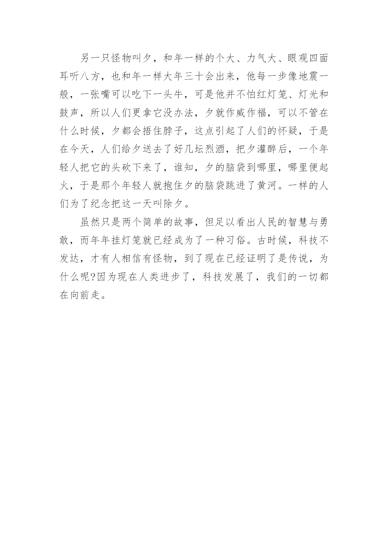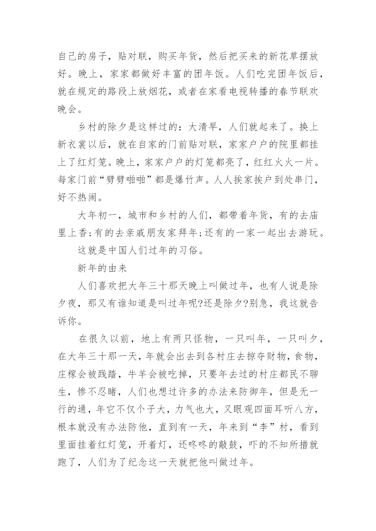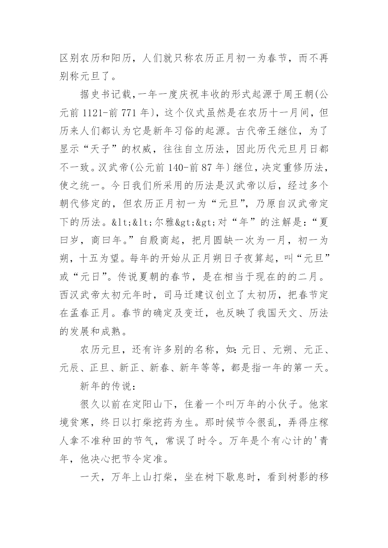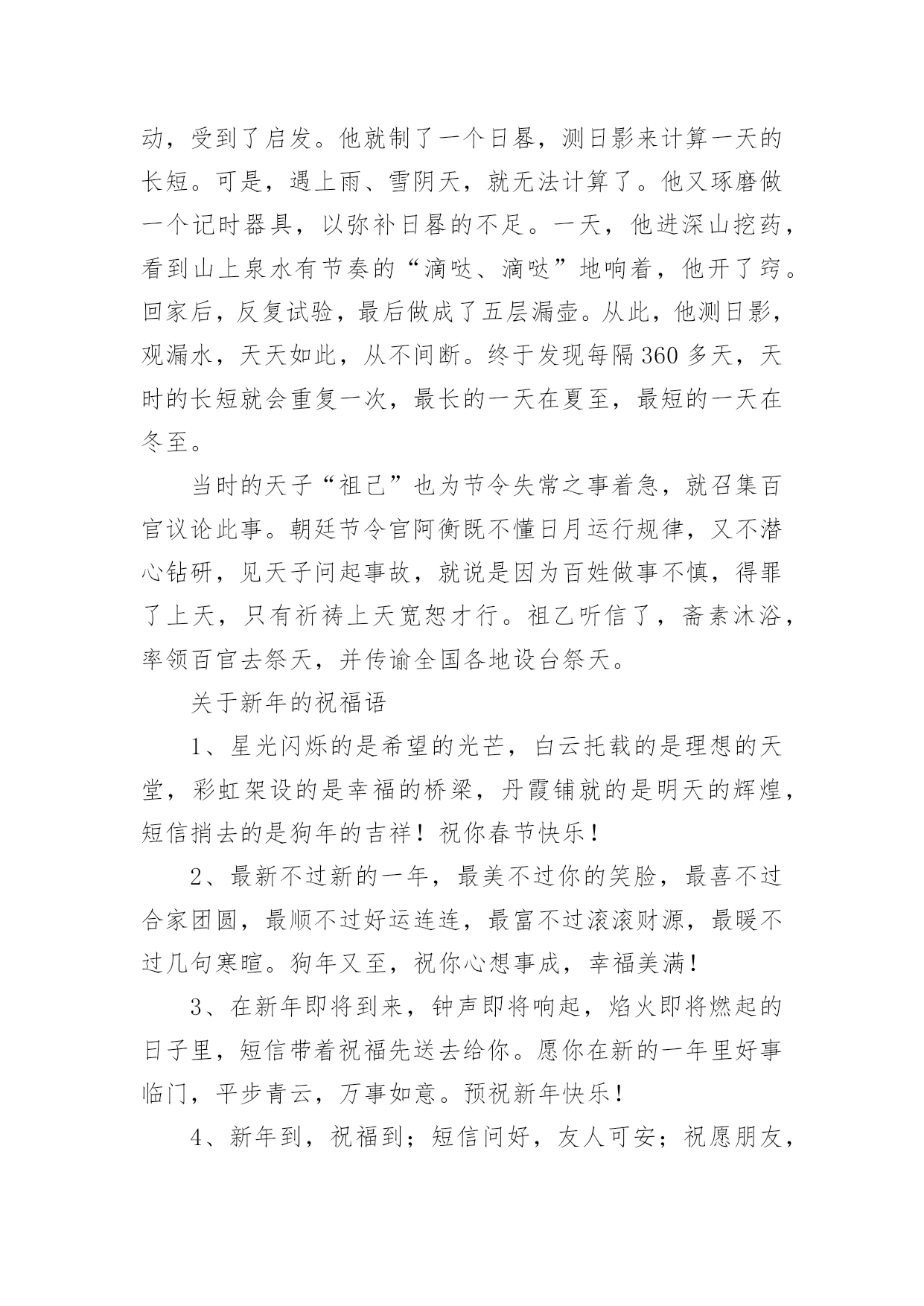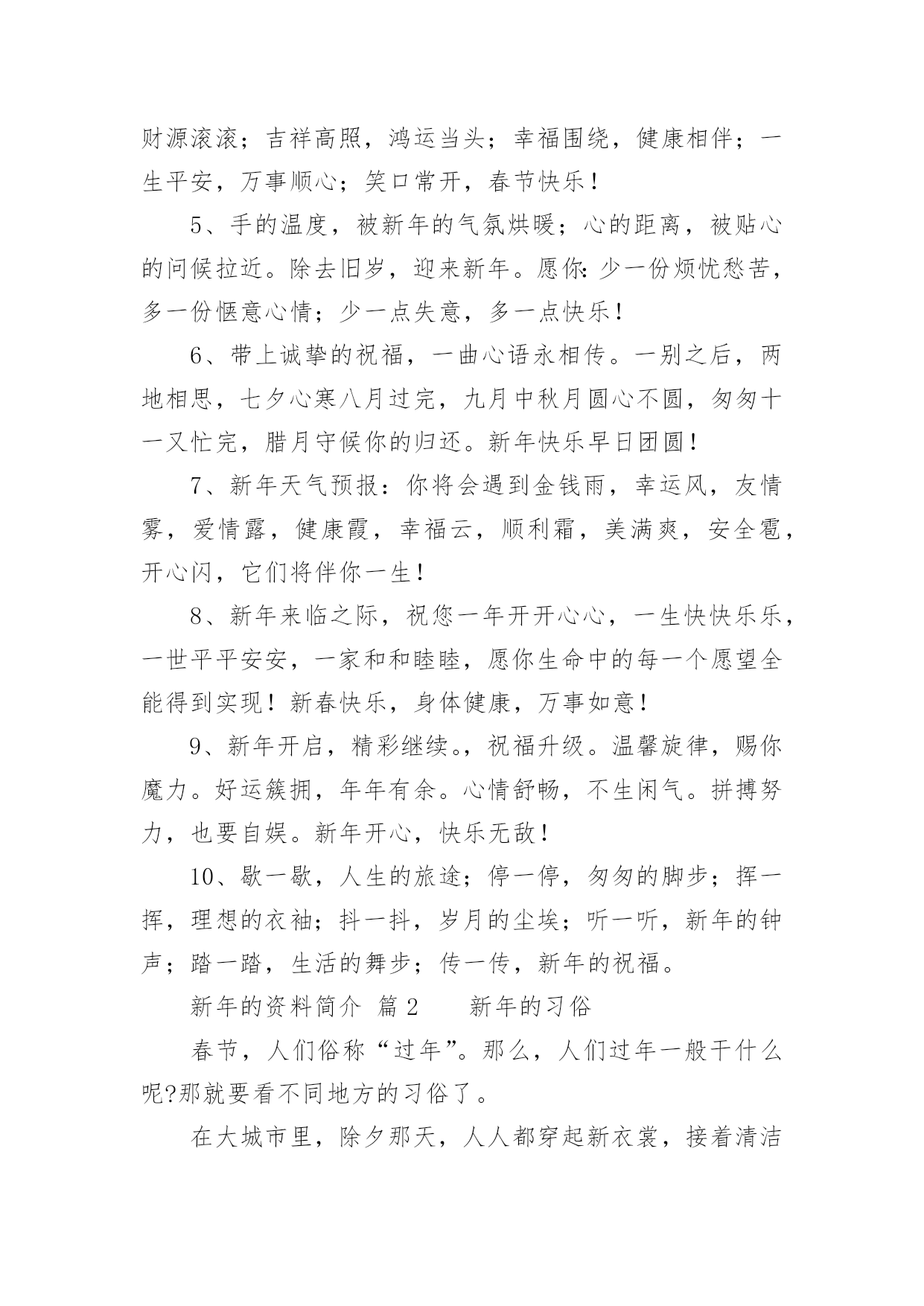 新年的资料简介关于新年的资料简介新年,即一年的第一天,为世界多数国家通行的节日。世界各国,特别是古代,新年都有不同的日期,现代世界多数国家定为公元制纪年的1月1日。现代中国将“元旦”称为公历新年,将“春节”称为农历新年。当日,人们会以各种不同的方式庆祝新年的到来。以下是小编为大家分享的关于新年的资料简介,欢迎借鉴!新年的资料简介篇1新年的来历古代把一年的第一天叫做元旦,又称元辰,元日、元朔等。元者始也,旦者晨也,宋人吴自牧所著《梦粱录》说“正月朔日,谓之元旦,俗呼为新年。一岁节序,此为之首。”秦始皇统一中国后,以孟冬之月为正月。“正”,本来当念成正大光明的“正”,为什么现在人们习惯地将“正”念作“征”呢?这便是从秦始皇称帝时开始的。因为秦始皇姓嬴名政,“政”和“正”两音相同,为了避讳,就下令全国将正月的“正”读作“征”。从此人们不再叫“正月”,而念成“征月”。以后念熟了,一直沿传后世。到汉武帝时,司马迁以夏历为基础编写《太阳历》,固定以孟春之月即一年第一个月为正月。自汉朝到清未,一直采用夏朝的历法。所以,人们至今还把阴历称作夏历,也称它为农历或旧历。1911年,辛亥革命推翻了清王朝的统治,废除夏历,中国开始采用公历,每年以公历1月1日为新年元旦,这样,为了区别农历和阳历,人们就只称农历正月初一为春节,而不再别称元旦了。据史书记载,一年一度庆祝丰收的形式起源于周王朝(公元前1121-前771年〕,这个仪式虽然是在农历十一月间,但历来人们都认为它是新年习俗的起源。古代帝王继位,为了显示“天子”的权威,往往自立历法,因此历代元旦月日都不一致。汉武帝(公元前140-前87年〕继位,决定重修历法,使之统一。今日我们所采用的历法是汉武帝以后,经过多个朝代修定的,但农历正月初一为“元旦”,乃原自汉武帝定下的历法。<<尔雅>>对“年”的注解是:“夏曰岁,商曰年。”自殷商起,把月圆缺一次为一月,初一为朔,十五为望。每年的开始从正月朔日子夜算起,叫“元旦”或“元日”。传说夏朝的春节,是在相当于现在的的二月。西汉武帝太初元年时,司马迁建议创立了太初历,把春节定在孟春正月。春节的确定及变迁,也反映了我国天文、历法的发展和成熟。农历元旦,还有许多别的名称,如:元日、元朔、元正、元辰、正旦、新正、新春、新年等等,都是指一年的第一天。新年的传说:很久以前在定阳山下,住着一个叫万年的小伙子。他家境贫寒,终日以打柴挖药为生。那时候节令很乱,弄得庄稼人拿不准种田的节气,常误了时令。万年是个有心计的'青年,他决心把节令定准。一天,万年上山打柴,坐在树下歇息时,看到树影的移动,受到了启发。他就制了一个日晷,测日影来计算一天的长短。可是,遇上雨、雪阴天,就无法计算了。他又琢磨做一个记时器具,以弥补日晷的不足。一天,他进深山挖药,看到山上泉水有节奏的“滴哒、滴哒”地响着,他开了窍。回家后,反复试验,最后做成了五层漏壶。从此,他测日影,观漏水,天天如此,从不间断。终于发现每隔360多天,天时的长短就会重复一次,最长的一天在夏至,最短的一天在冬至。当时的天子“祖己”也为节令失常之事着急,就召集百官议论此事。朝廷节令官阿衡既不懂日月运行规律,又不潜心钻研,见天子问起事故,就说是因为百姓做事不慎,得罪了上天,只有祈祷上天宽恕才行。祖乙听信了,斋素沐浴,率领百官去祭天,并传谕全国各地设台祭天。关于新年的祝福语1、星光闪烁的是希望的光芒,白云托载的是理想的天堂,彩虹架设的是幸福的桥梁,丹霞铺就的是明天的辉煌,短信捎去的是狗年的吉祥!祝你春节快乐!2、最新不过新的一年,最美不过你的笑脸,最喜不过合家团圆,最顺不过好运连连,最富不过滚滚财源,最暖不过几句寒暄。狗年又至,祝你心想事成,幸福美满!3、在新年即将到来,钟声即将响起,焰火即将燃起的日子里,短信带着祝福先送去给你。愿你在新的一年里好事临门,平步青云,万事如意。预祝新年快乐!4、新年到,祝福到;短信问好,友人可安;祝愿朋友,财源滚滚;吉祥高照,鸿运当头;幸福围绕,健康相伴;一生平安,万事顺心;笑口常开,春节快乐!5、手的温度,被新年的气氛烘暖;心的距离,被贴心的问候拉近。除去旧岁,迎来新年。愿你:少一份烦忧愁苦,多一份惬意心情;少一点失意,多一点快乐!6、带上诚挚的祝福,一曲心语永相传。一别之后,两地相思,七夕心寒八月过完,九月中秋月圆心不圆,匆匆十一又忙完,腊月守候你的归还。新年快乐早日团圆!7、新年天气预报:你将会遇到金钱雨,幸运风,友情雾,爱情露,健康霞,幸福云,顺利霜,美满爽,安全雹,开心闪,它们将伴你一生!8、新年来临之际,祝您一年开开心心,一生快快乐乐,一世平平安安,一家和和睦睦,愿你生命中的每一个愿望全能得到实现!新春快乐,身体健康,万事如意!9、新年开启,精彩继续。,祝福升级。温馨旋律,