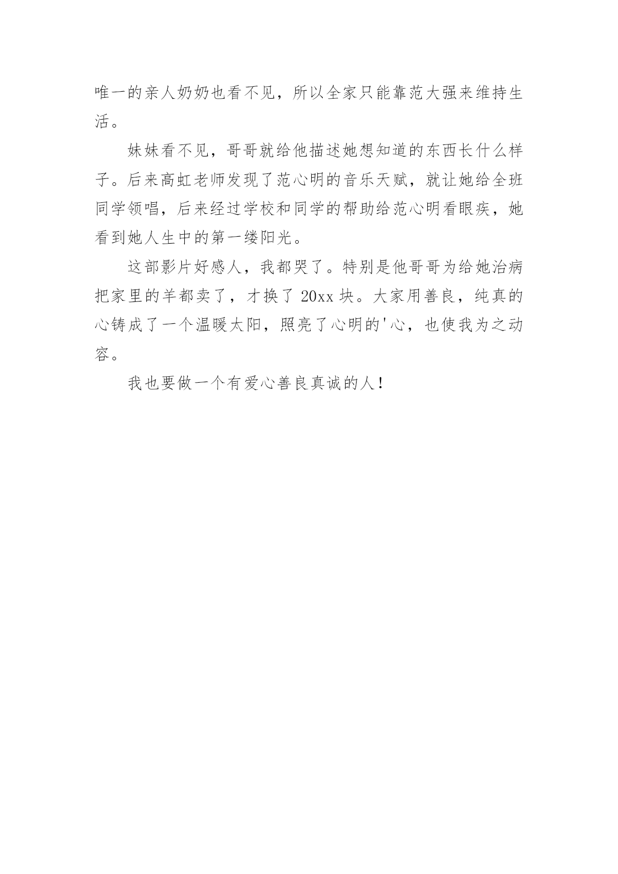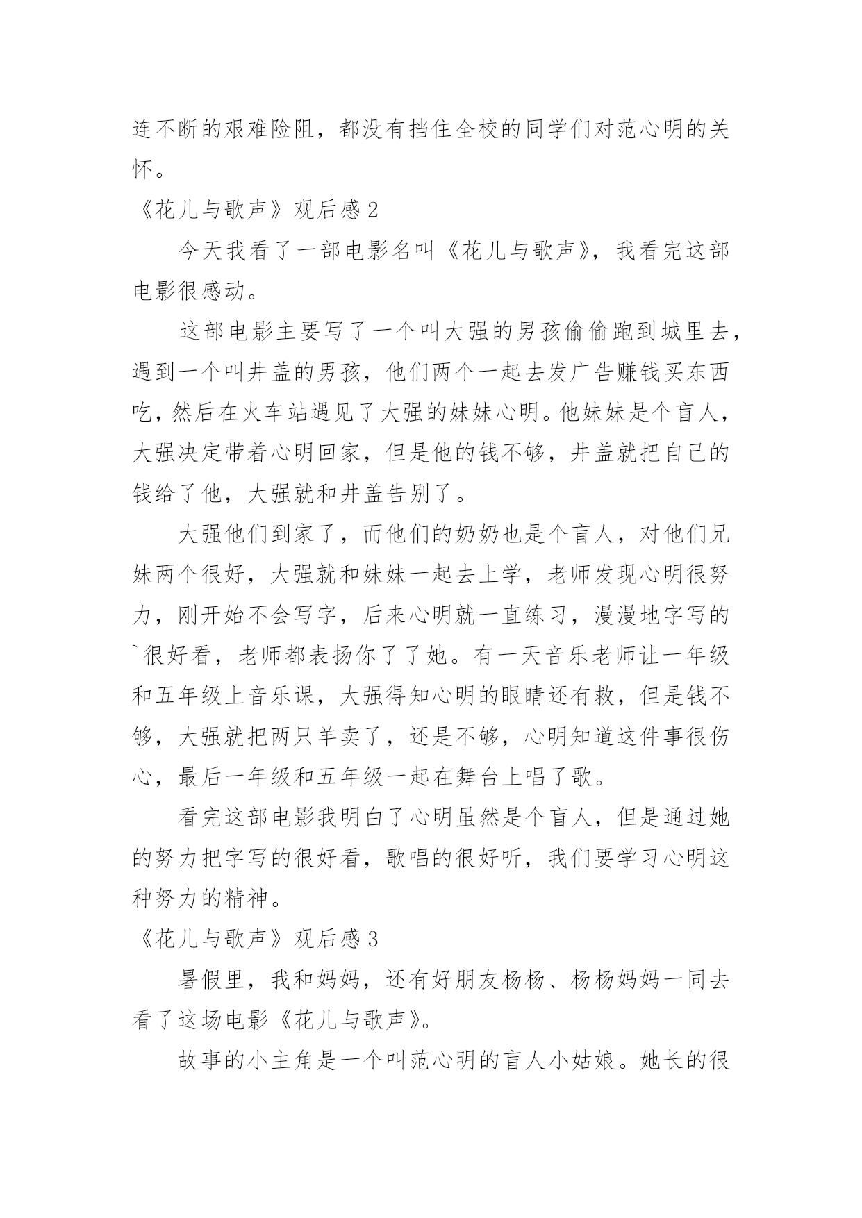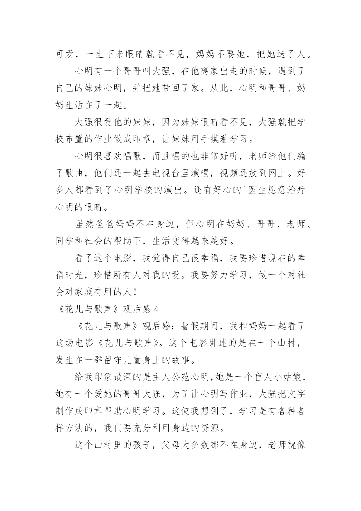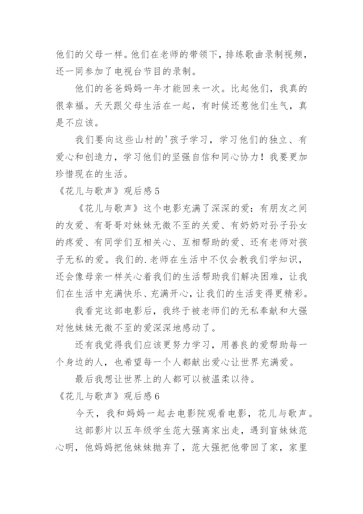 《花儿与歌声》观后感《花儿与歌声》观后感当观看作品时,我们会沉浸在情节之中,相信你会有不少感想吧,这时候,最关键的观后感怎么能落下!那么我们如何去写观后感呢?下面是小编收集整理的《花儿与歌声》观后感,欢迎大家分享。《花儿与歌声》观后感1前几天去看了一次《花儿与歌声》。这部电影讲了一个乡村孩子凑钱从城里坐车到家乡,后而帮助失去视觉的妹妹读书,凑钱治疗的故事。电影中的男孩叫范大强,出自贫困家庭。很多人的父母外出打工,只能找老师排队给日思夜想的父母打电话。有一次特殊情况,打电话排到大强的时候,老师的手机不见了,结果每天都被何用功等等同学欺负,妹妹范心明也不例外。其实只怪他们性子急,因为他们都很思念自己的`亲人,想和他们聊天说话,更希望他们能早日回来。在离开亲友的时候,谁不会这样盼望呢?后来“手机丢失案”过了之后,全校团结一心,为范心明捐款。最后老师们通过网络,向全国各地的人民求助,最后攒够了钱。最后也说明了网络的发达和方便。这部电影很感人,我都看哭了。其中的一次又一次,接连不断的艰难险阻,都没有挡住全校的同学们对范心明的关怀。《花儿与歌声》观后感2今天我看了一部电影名叫《花儿与歌声》,我看完这部电影很感动。这部电影主要写了一个叫大强的男孩偷偷跑到城里去,遇到一个叫井盖的男孩,他们两个一起去发广告赚钱买东西吃,然后在火车站遇见了大强的妹妹心明。他妹妹是个盲人,大强决定带着心明回家,但是他的钱不够,井盖就把自己的钱给了他,大强就和井盖告别了。大强他们到家了,而他们的奶奶也是个盲人,对他们兄妹两个很好,大强就和妹妹一起去上学,老师发现心明很努力,刚开始不会写字,后来心明就一直练习,漫漫地字写的`很好看,老师都表扬你了了她。有一天音乐老师让一年级和五年级上音乐课,大强得知心明的眼睛还有救,但是钱不够,大强就把两只羊卖了,还是不够,心明知道这件事很伤心,最后一年级和五年级一起在舞台上唱了歌。看完这部电影我明白了心明虽然是个盲人,但是通过她的努力把字写的很好看,歌唱的很好听,我们要学习心明这种努力的精神。《花儿与歌声》观后感3暑假里,我和妈妈,还有好朋友杨杨、杨杨妈妈一同去看了这场电影《花儿与歌声》。故事的小主角是一个叫范心明的盲人小姑娘。她长的很可爱,一生下来眼睛就看不见,妈妈不要她,把她送了人。心明有一个哥哥叫大强,在他离家出走的时候,遇到了自己的妹妹心明,并把她带回了家。从此,心明和哥哥、奶奶生活在了一起。大强很爱他的妹妹,因为妹妹眼睛看不见,大强就把学校布置的作业做成印章,让妹妹用手摸着学习。心明很喜欢唱歌,而且唱的也非常好听,老师给他们编了歌曲,他们还一起去电视台里演唱,视频还放到网上。好多人都看到了心明学校的演出。还有好心的'医生愿意治疗心明的眼睛。虽然爸爸妈妈不在身边,但心明在奶奶、哥哥、老师、同学和社会的帮助下,生活变得越来越好。看了这个电影,我觉得自己很幸福,我要珍惜现在的幸福时光,珍惜所有人对我的爱。我要努力学习,做一个对社会对家庭有用的人!《花儿与歌声》观后感4《花儿与歌声》观后感:暑假期间,我和妈妈一起看了这场电影《花儿与歌声》。这个电影讲述的是在一个山村,发生在一群留守儿童身上的故事。给我印象最深的是主人公范心明,她是一个盲人小姑娘,她有一个爱她的哥哥大强,为了让心明写作业,大强把文字制作成印章帮助心明学习。这使我想到了,学习是有各种各样方法的,我们要充分利用身边的资源。这个山村里的孩子,父母大多数都不在身边,老师就像他们的父母一样。他们在老师的带领下,排练歌曲录制视频,还一同参加了电视台节目的录制。他们的爸爸妈妈一年才能回来一次。比起他们,我真的很幸福。天天跟父母生活在一起,有时候还惹他们生气,真是不应该。我们要向这些山村的'孩子学习,学习他们的独立、有爱心和创造力,学习他们的坚强自信和同心协力!我要更加珍惜现在的生活。《花儿与歌声》观后感5《花儿与歌声》这个电影充满了深深的爱:有朋友之间的友爱、有哥哥对妹妹无微不至的关爱、有奶奶对孙子孙女的疼爱、有同学们互相关心、互相帮助的爱、还有老师对孩子无私的爱。我们的.老师在生活中不仅会教我们学知识,还会像母亲一样关心着我们的生活帮助我们解决困难,让我们在生活中充满快乐、充满开心,让我们的生活变得更精彩。我看完这部电影后,我终于被老师们的无私奉献和大强对他妹妹无微不至的爱深深地感动了。还有我觉得我们应该更努力学习,用善良的爱帮助每一个身边的人,也希望每一个人都献出爱心让世界充满爱。最后我想让世界上的人都可以被温柔以待。《花儿与歌声》观后感6今天,我和妈妈一起去电影院观看电影,花儿与歌声。这部影片以五年级学生范大强离家出走,遇到盲妹妹范心明,他妈妈把他妹妹抛弃了,范大强把他带回了家,家里唯一的亲人奶奶也看不见,所以全家只能靠范大强来维持生活。妹妹看不见,哥哥就给他描述她想知