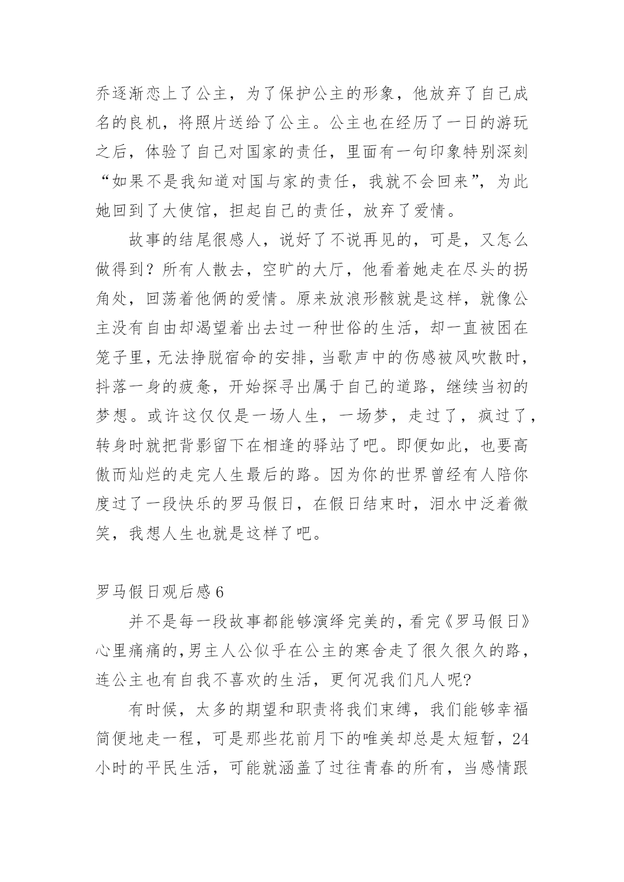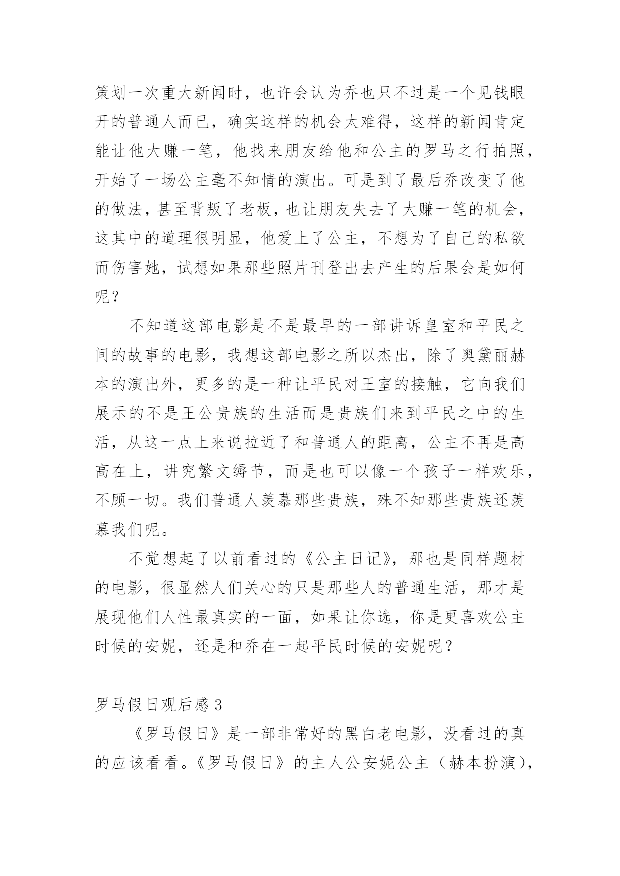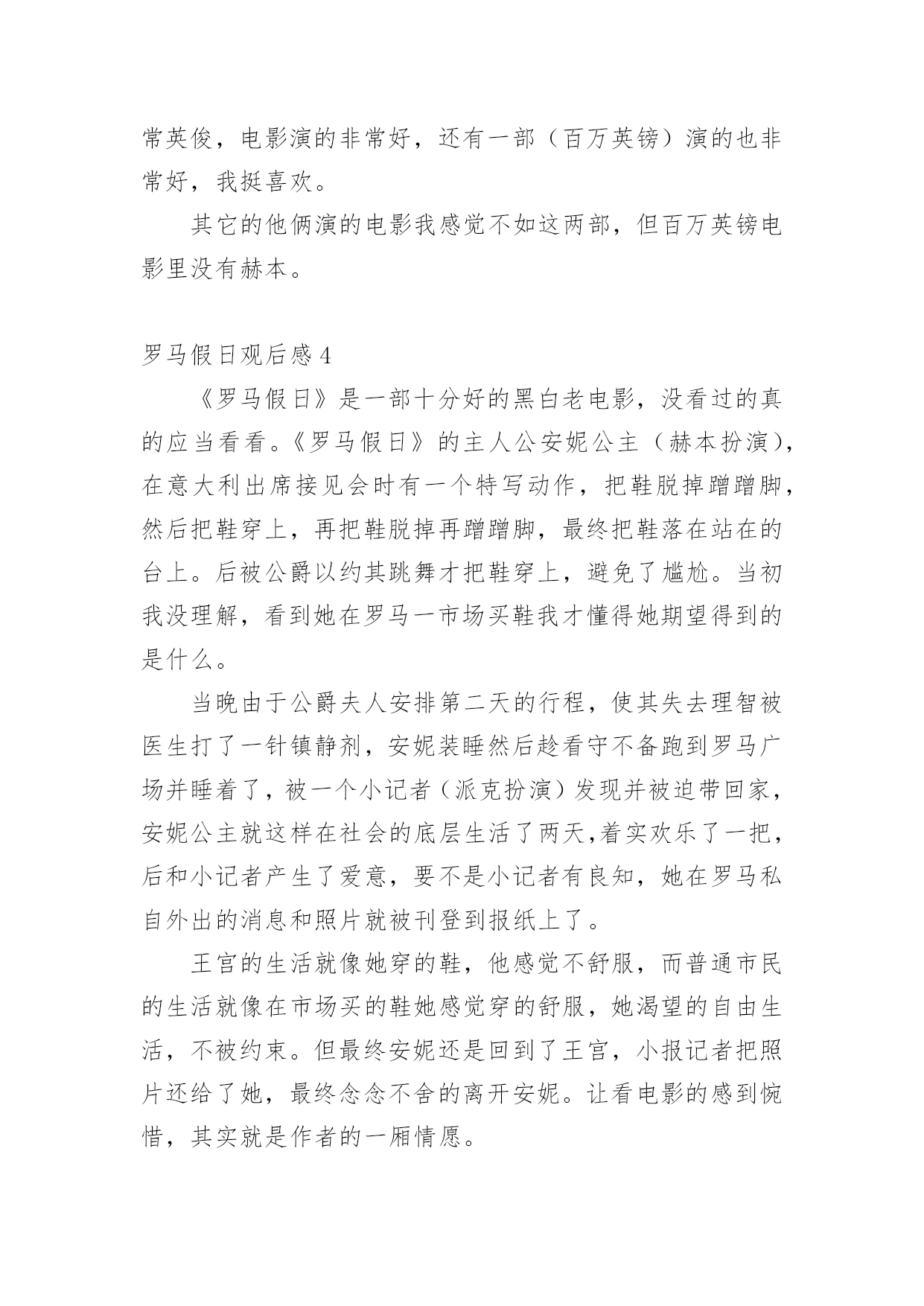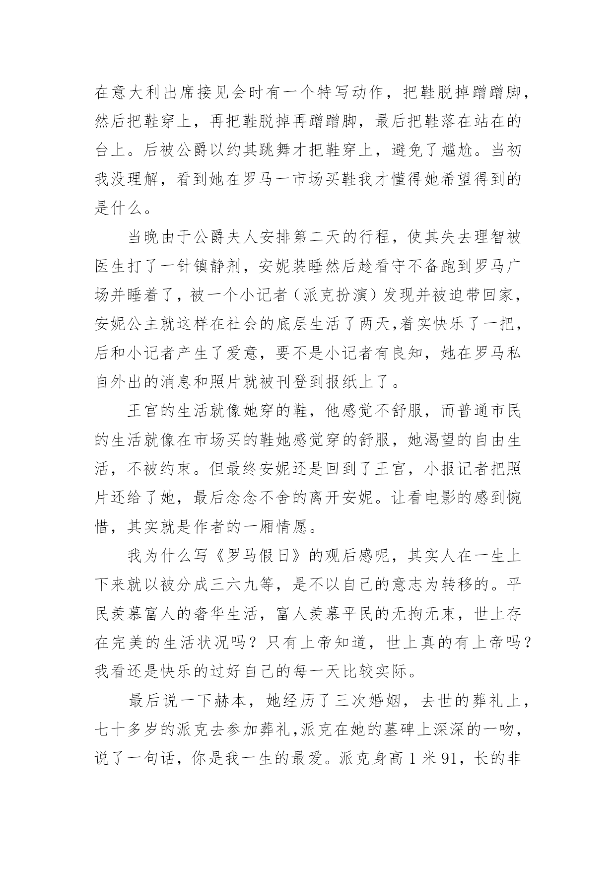 罗马假日观后感当品味完一部影视作品后,一定有很多值得分享的心得吧,记录下来很重要哦,一起来写一篇观后感吧。可能你现在毫无头绪吧,下面是小编收集整理的罗马假日观后感,希望对大家有所帮助。罗马假日观后感120xx年6月5日我参加了每日新报与左岸影城联合举办的经典观影活动。很久就已经听说这部经典的影片了,因为听说是黑白片,所以也没有太大的兴趣去看,但当我在影院看完时,我发现经典就是经典,两位著名演员奥黛丽·赫本和格里高利·派克的表演彻底征服了我。先不说两位偶像级的容貌,单单就两位出色的表演就足以征服很多人。在那个年代就可以拍出那么精彩的影片,我由衷的佩服。先说说整部影片的感觉吧,从开始不久,影片就给了我们一些笑点,像公主接见众人时,不小心鞋子掉了,脚的动作很惹人发笑,还有后来她溜出住处,一个人躺在街上睡觉时,男主角与她交流时,她的那种高贵语气令不知道她底细的人看来也很不自然,但还是很有意思的。还有她的那种单纯无邪的样子,都给人深刻的印象,相比那些市侩的人,她简直很完美了。在后部分,公主还有男主角、理发师等一起大闹水上舞会现场,同便衣扭打的镜头都堪称经典,等等。除了这些有些搞笑的地方之外呢,影片传达的爱的含义也令人印象深刻。当孤独的公主来到民间,除了第一个遇见并帮助她的男主角,她只能自己到街上游荡,而有私心的男主角决定假装一次偶遇,接着才发生了众多有意思的事情,经过很多事情后,彼此产生了好感,并依依不舍的分开了。发现爱上公主的男主角乔·布拉德雷最后认为不要公布那些偷拍的照片,并说服了他的朋友,在最后一次的记者见面会上送给了公主,他们交接照片时的会心一笑多么的传神。但是那种感觉也只能埋藏在心底。这样一段短暂的感情只能结束了!罗马假日观后感2花了一个小时用快进的方式把这部电影迅速浏览了一遍,我想大意我肯定是知道了,除了细节。在高中的时候徐老师曾经放过这部电影,可惜只看了个开头,当初看的时候并没有什么感觉,也许是因为年纪还小的缘故。公主落入凡尘,遇到了美国新报的记者乔,这个记者带着公主度过了美妙的一天,让公主充分感受到了普通人的生活,这与她皇宫里单调枯燥的生活相比简直太令人向往了。最后也许是因为公主认为自己责任重大,而且身份注定也需要她回去,她只好选择返回,结束了这段即浪漫又刺激的罗马假日生活。当一开始看到乔知道公主身份后决定利用这次偶遇来策划一次重大新闻时,也许会认为乔也只不过是一个见钱眼开的普通人而已,确实这样的机会太难得,这样的新闻肯定能让他大赚一笔,他找来朋友给他和公主的罗马之行拍照,开始了一场公主毫不知情的演出。可是到了最后乔改变了他的做法,甚至背叛了老板,也让朋友失去了大赚一笔的机会,这其中的道理很明显,他爱上了公主,不想为了自己的私欲而伤害她,试想如果那些照片刊登出去产生的后果会是如何呢?不知道这部电影是不是最早的一部讲诉皇室和平民之间的故事的电影,我想这部电影之所以杰出,除了奥黛丽赫本的演出外,更多的是一种让平民对王室的接触,它向我们展示的不是王公贵族的生活而是贵族们来到平民之中的生活,从这一点上来说拉近了和普通人的距离,公主不再是高高在上,讲究繁文缛节,而是也可以像一个孩子一样欢乐,不顾一切。我们普通人羡慕那些贵族,殊不知那些贵族还羡慕我们呢。不觉想起了以前看过的《公主日记》,那也是同样题材的电影,很显然人们关心的只是那些人的普通生活,那才是展现他们人性最真实的一面,如果让你选,你是更喜欢公主时候的安妮,还是和乔在一起平民时候的安妮呢?罗马假日观后感3《罗马假日》是一部非常好的黑白老电影,没看过的真的应该看看。《罗马假日》的主人公安妮公主(赫本扮演),在意大利出席接见会时有一个特写动作,把鞋脱掉蹭蹭脚,然后把鞋穿上,再把鞋脱掉再蹭蹭脚,最后把鞋落在站在的台上。后被公爵以约其跳舞才把鞋穿上,避免了尴尬。当初我没理解,看到她在罗马一市场买鞋我才懂得她希望得到的是什么。当晚由于公爵夫人安排第二天的行程,使其失去理智被医生打了一针镇静剂,安妮装睡然后趁看守不备跑到罗马广场并睡着了,被一个小记者(派克扮演)发现并被迫带回家,安妮公主就这样在社会的底层生活了两天,着实快乐了一把,后和小记者产生了爱意,要不是小记者有良知,她在罗马私自外出的消息和照片就被刊登到报纸上了。王宫的生活就像她穿的鞋,他感觉不舒服,而普通市民的生活就像在市场买的鞋她感觉穿的舒服,她渴望的自由生活,不被约束。但最终安妮还是回到了王宫,小报记者把照片还给了她,最后念念不舍的离开安妮。让看电影的感到惋惜,其实就是作者的一厢情愿。我为什么写《罗马假日》的观后感呢,其实人在一生上下来就以被分成三六九等,是不以自己的意志为转移的。平民羡慕富人的奢华生活,富人羡慕平民的无拘无束,世上存在完美的生活状况吗?只有上帝知道,世上真的有上帝吗?我看还是快乐的过好自己的每一天比较实