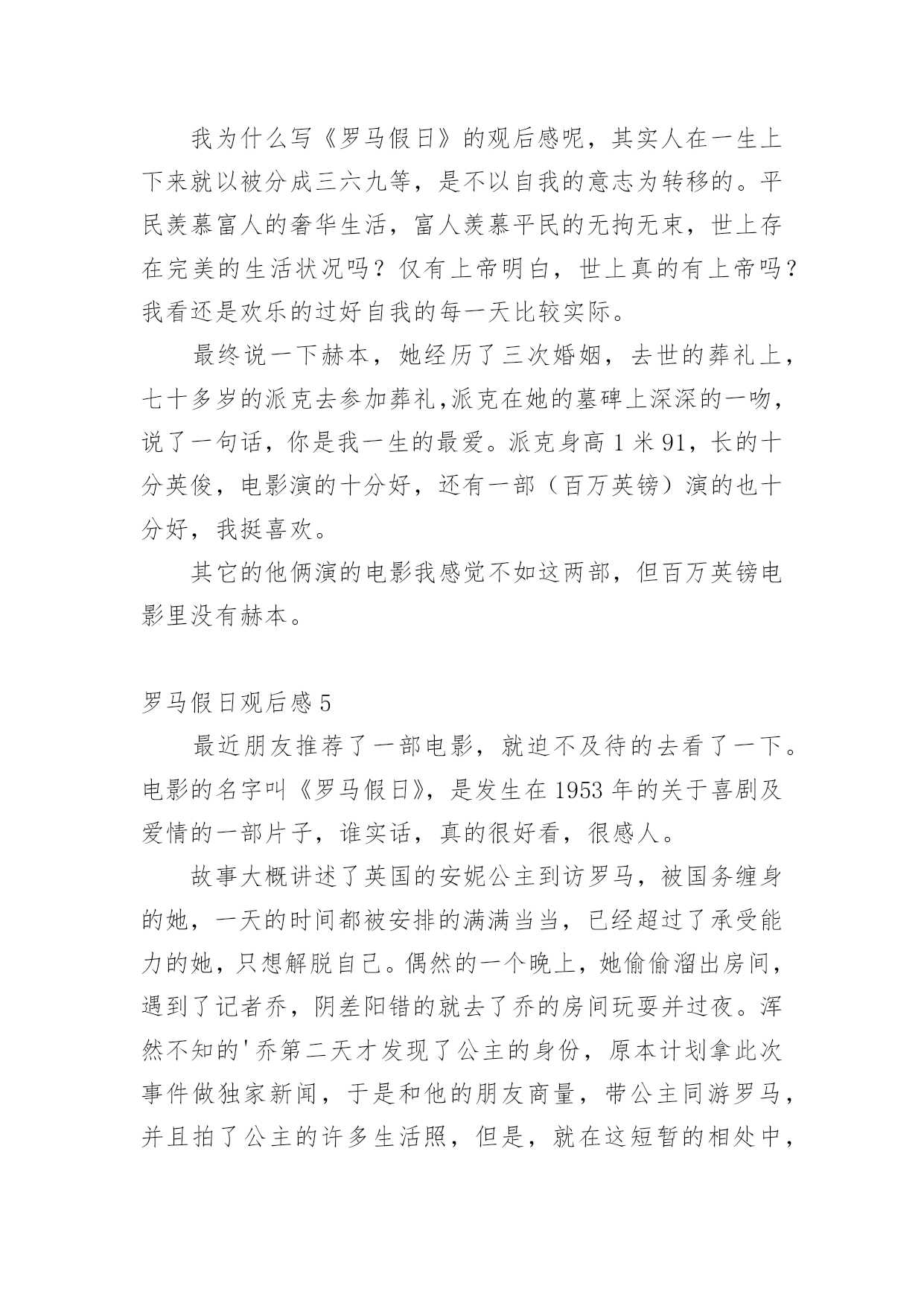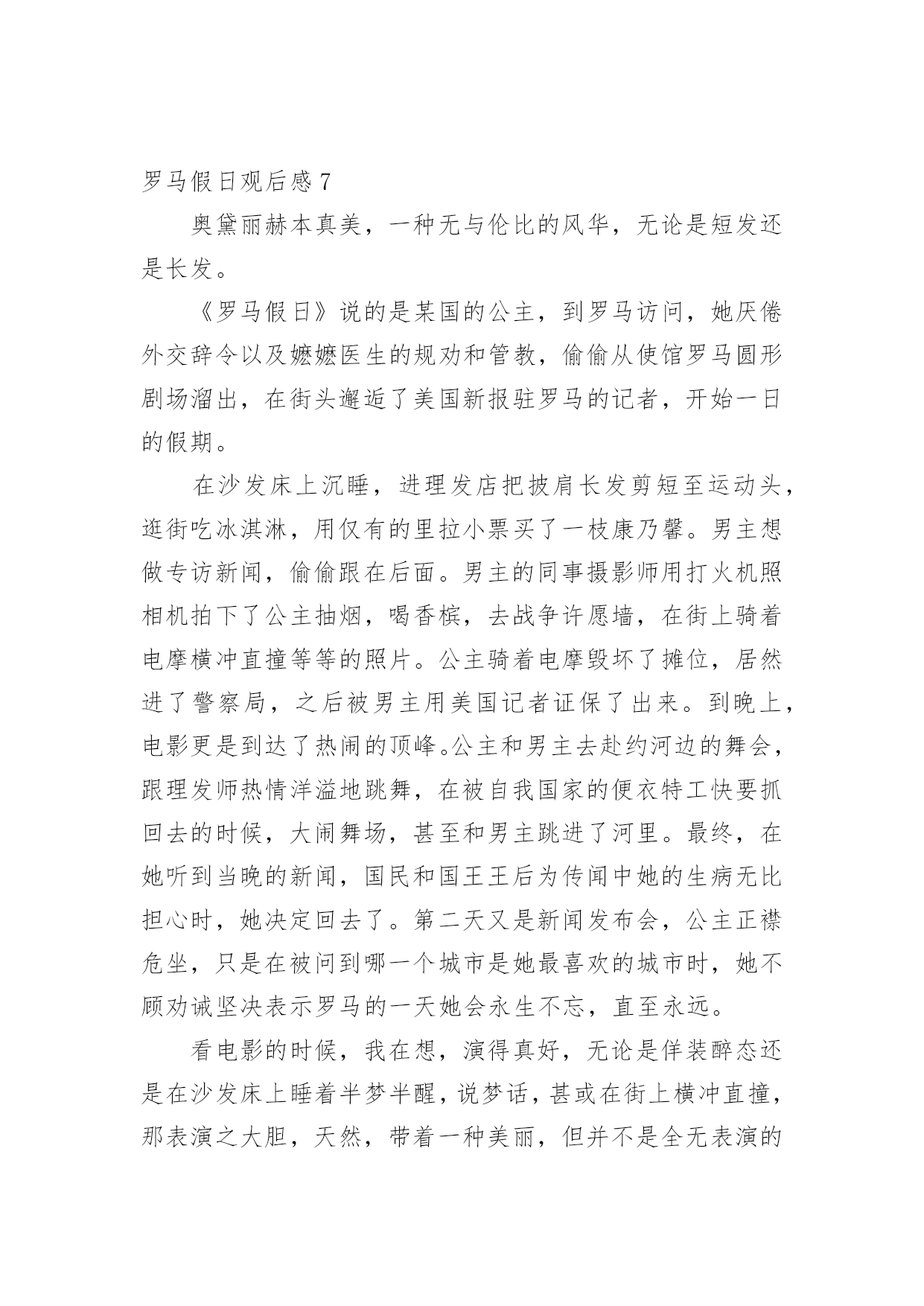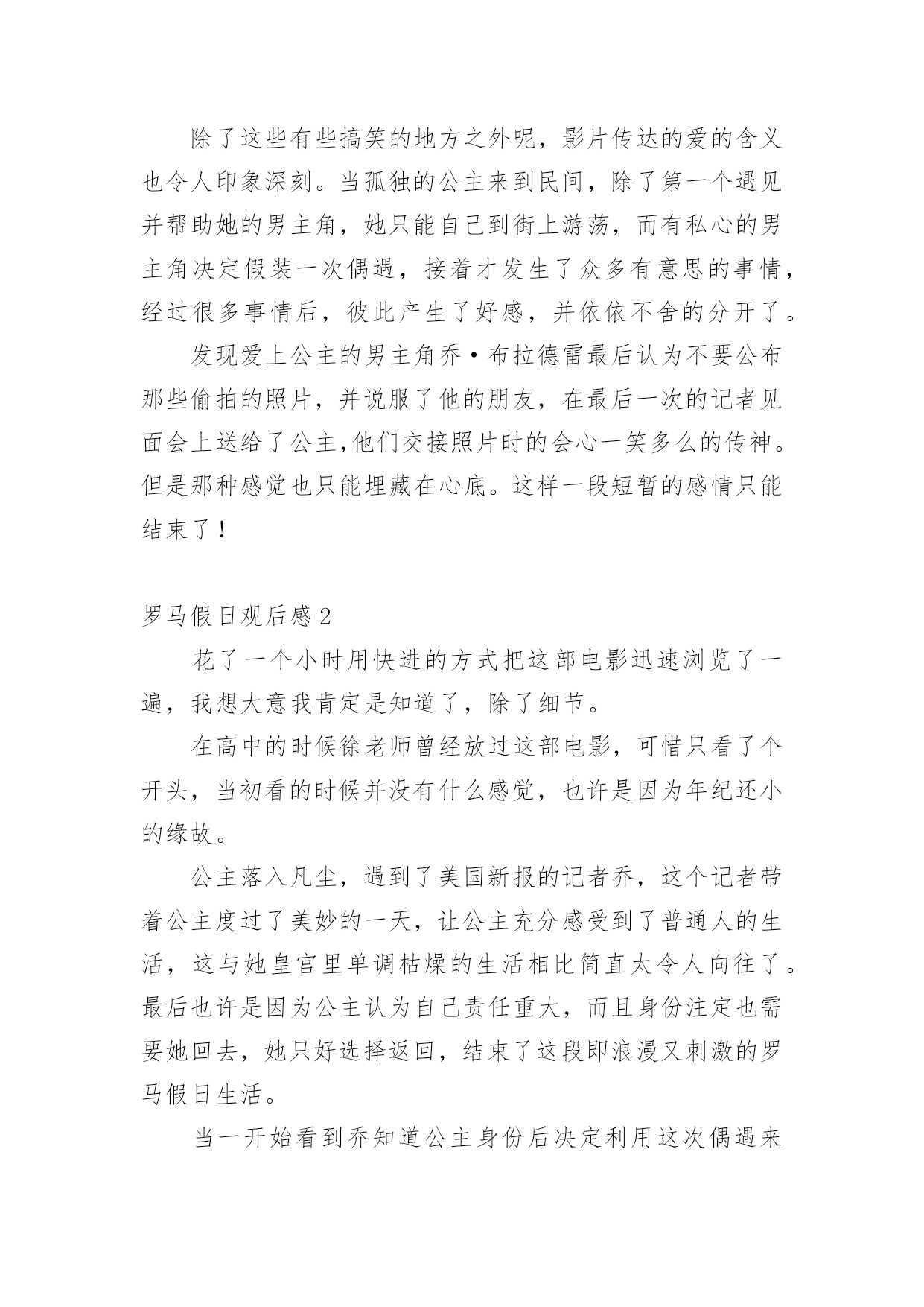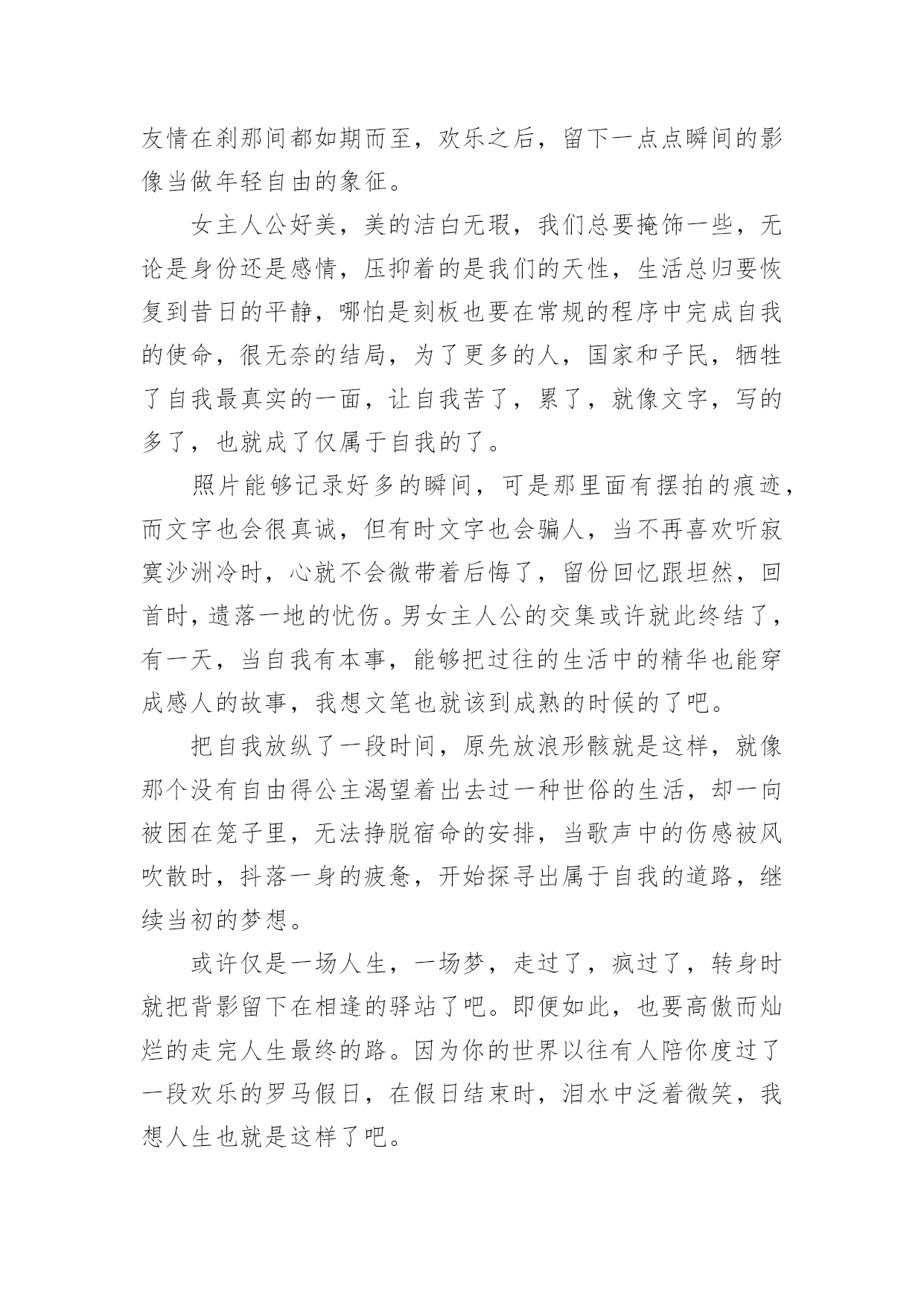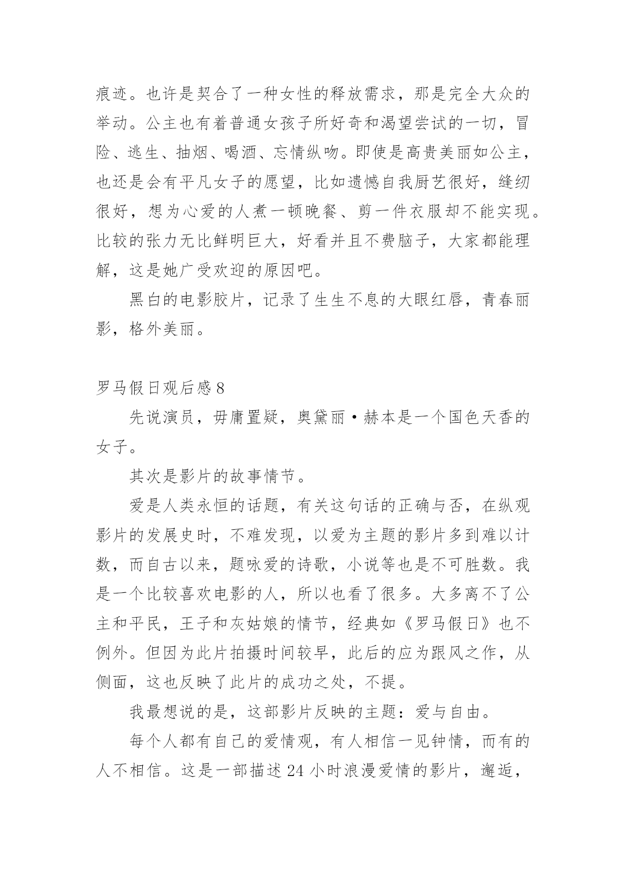 罗马假日观后感当品味完一部影视作品后,一定有很多值得分享的心得吧,记录下来很重要哦,一起来写一篇观后感吧。可能你现在毫无头绪吧,下面是小编收集整理的罗马假日观后感,希望对大家有所帮助。罗马假日观后感120xx年6月5日我参加了每日新报与左岸影城联合举办的经典观影活动。很久就已经听说这部经典的影片了,因为听说是黑白片,所以也没有太大的兴趣去看,但当我在影院看完时,我发现经典就是经典,两位著名演员奥黛丽·赫本和格里高利·派克的表演彻底征服了我。先不说两位偶像级的容貌,单单就两位出色的表演就足以征服很多人。在那个年代就可以拍出那么精彩的影片,我由衷的佩服。先说说整部影片的感觉吧,从开始不久,影片就给了我们一些笑点,像公主接见众人时,不小心鞋子掉了,脚的动作很惹人发笑,还有后来她溜出住处,一个人躺在街上睡觉时,男主角与她交流时,她的那种高贵语气令不知道她底细的人看来也很不自然,但还是很有意思的。还有她的那种单纯无邪的样子,都给人深刻的印象,相比那些市侩的人,她简直很完美了。在后部分,公主还有男主角、理发师等一起大闹水上舞会现场,同便衣扭打的镜头都堪称经典,等等。除了这些有些搞笑的地方之外呢,影片传达的爱的含义也令人印象深刻。当孤独的公主来到民间,除了第一个遇见并帮助她的男主角,她只能自己到街上游荡,而有私心的男主角决定假装一次偶遇,接着才发生了众多有意思的事情,经过很多事情后,彼此产生了好感,并依依不舍的分开了。发现爱上公主的男主角乔·布拉德雷最后认为不要公布那些偷拍的照片,并说服了他的朋友,在最后一次的记者见面会上送给了公主,他们交接照片时的会心一笑多么的传神。但是那种感觉也只能埋藏在心底。这样一段短暂的感情只能结束了!罗马假日观后感2花了一个小时用快进的方式把这部电影迅速浏览了一遍,我想大意我肯定是知道了,除了细节。在高中的时候徐老师曾经放过这部电影,可惜只看了个开头,当初看的时候并没有什么感觉,也许是因为年纪还小的缘故。公主落入凡尘,遇到了美国新报的记者乔,这个记者带着公主度过了美妙的一天,让公主充分感受到了普通人的生活,这与她皇宫里单调枯燥的生活相比简直太令人向往了。最后也许是因为公主认为自己责任重大,而且身份注定也需要她回去,她只好选择返回,结束了这段即浪漫又刺激的罗马假日生活。当一开始看到乔知道公主身份后决定利用这次偶遇来策划一次重大新闻时,也许会认为乔也只不过是一个见钱眼开的普通人而已,确实这样的机会太难得,这样的新闻肯定能让他大赚一笔,他找来朋友给他和公主的罗马之行拍照,开始了一场公主毫不知情的演出。可是到了最后乔改变了他的做法,甚至背叛了老板,也让朋友失去了大赚一笔的机会,这其中的道理很明显,他爱上了公主,不想为了自己的私欲而伤害她,试想如果那些照片刊登出去产生的后果会是如何呢?不知道这部电影是不是最早的一部讲诉皇室和平民之间的故事的电影,我想这部电影之所以杰出,除了奥黛丽赫本的演出外,更多的是一种让平民对王室的接触,它向我们展示的不是王公贵族的生活而是贵族们来到平民之中的生活,从这一点上来说拉近了和普通人的距离,公主不再是高高在上,讲究繁文缛节,而是也可以像一个孩子一样欢乐,不顾一切。我们普通人羡慕那些贵族,殊不知那些贵族还羡慕我们呢。不觉想起了以前看过的《公主日记》,那也是同样题材的电影,很显然人们关心的只是那些人的普通生活,那才是展现他们人性最真实的一面,如果让你选,你是更喜欢公主时候的安妮,还是和乔在一起平民时候的安妮呢?罗马假日观后感3《罗马假日》是一部非常好的黑白老电影,没看过的真的应该看看。《罗马假日》的主人公安妮公主(赫本扮演),在意大利出席接见会时有一个特写动作,把鞋脱掉蹭蹭脚,然后把鞋穿上,再把鞋脱掉再蹭蹭脚,最后把鞋落在站在的台上。后被公爵以约其跳舞才把鞋穿上,避免了尴尬。当初我没理解,看到她在罗马一市场买鞋我才懂得她希望得到的是什么。当晚由于公爵夫人安排第二天的行程,使其失去理智被医生打了一针镇静剂,安妮装睡然后趁看守不备跑到罗马广场并睡着了,被一个小记者(派克扮演)发现并被迫带回家,安妮公主就这样在社会的底层生活了两天,着实快乐了一把,后和小记者产生了爱意,要不是小记者有良知,她在罗马私自外出的消息和照片就被刊登到报纸上了。王宫的生活就像她穿的鞋,他感觉不舒服,而普通市民的生活就像在市场买的鞋她感觉穿的舒服,她渴望的自由生活,不被约束。但最终安妮还是回到了王宫,小报记者把照片还给了她,最后念念不舍的离开安妮。让看电影的感到惋惜,其实就是作者的一厢情愿。我为什么写《罗马假日》的观后感呢,其实人在一生上下来就以被分成三六九等,是不以自己的意志为转移的。平民羡慕富人的奢华生活,富人羡慕平民的无拘无束,世上存在完美的生活状况吗?只有上帝知道,世上真的有上帝吗?我看还是快乐的过好自己的每一天比较实