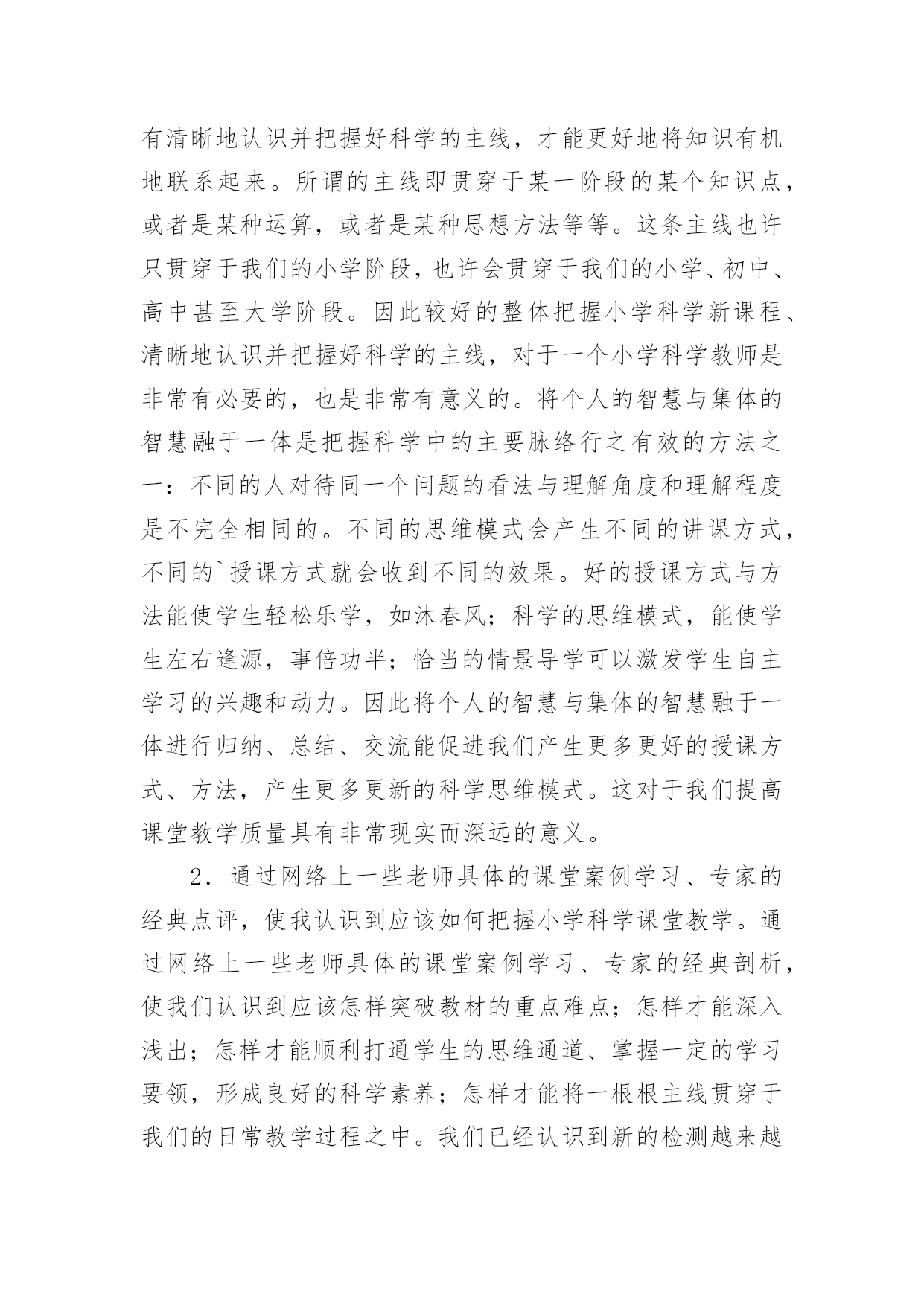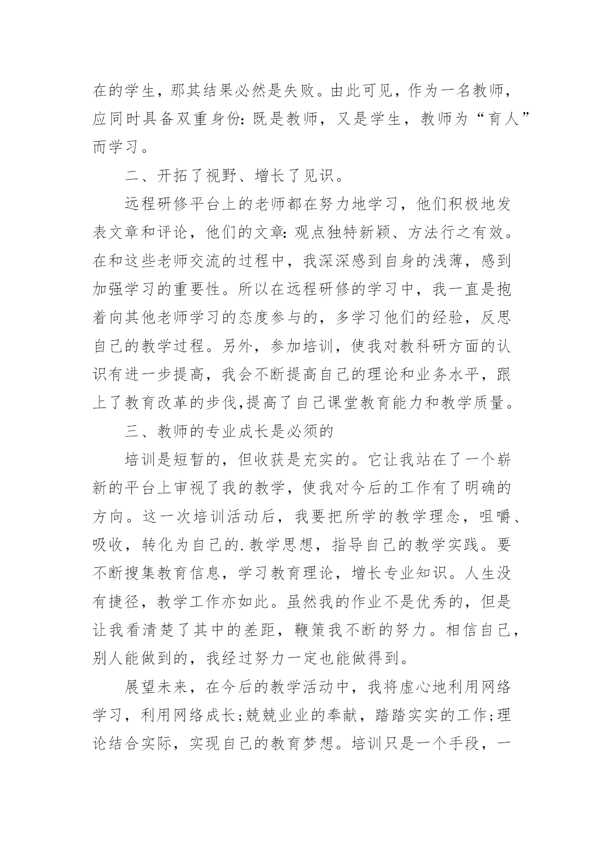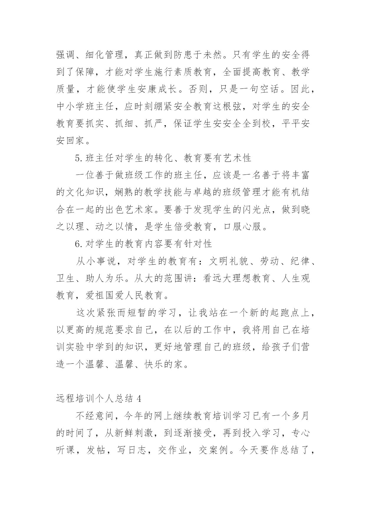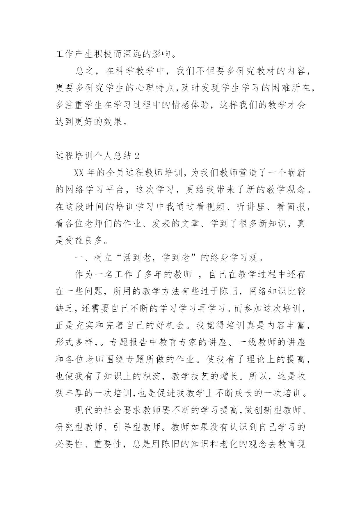 远程培训个人总结总结是指社会团体、企业单位和个人在自身的某一时期、某一项目或某些工作告一段落或者全部完成后进行回顾检查、分析评价,从而肯定成绩,得到经验,找出差距,得出教训和一些规律性认识的一种书面材料,它能够给人努力工作的动力,让我们来为自己写一份总结吧。总结一般是怎么写的呢?以下是小编为大家收集的远程培训个人总结,仅供参考,希望能够帮助到大家。远程培训个人总结1带着一些随意,一点茫然,一些疑虑参加这次培训——到底学些什么......”然而现在的今天,通过紧张有序的学习,交流、研讨、评论等对这次课程培训有了全新的认识,对之前的一些疑惑和迷茫有了深刻的答案。总的说来通过紧张而又认真的学习所获得的感想与心得体会可概括为以下几点:1.通过培训学习,使我清楚地认识到整体把握小学科学新课程的重要性及其常用方法。整体把握小学科学新课程不仅可以使我们清楚地认识到小学科学的主要脉络,而且可以使我们站在更高层次上以一览众山小的姿态来面对小学科学新课程。整体把握小学科学新课程不仅可以提高教师自身的素质,也有助于培养学生的科学素养。只有让学生具备良好的科学素养才能使他们更好地适应社会的发展与进步。只有清晰地认识并把握好科学的主线,才能更好地将知识有机地联系起来。所谓的主线即贯穿于某一阶段的某个知识点,或者是某种运算,或者是某种思想方法等等。这条主线也许只贯穿于我们的小学阶段,也许会贯穿于我们的小学、初中、高中甚至大学阶段。因此较好的整体把握小学科学新课程、清晰地认识并把握好科学的主线,对于一个小学科学教师是非常有必要的,也是非常有意义的。将个人的智慧与集体的智慧融于一体是把握科学中的主要脉络行之有效的方法之一:不同的人对待同一个问题的看法与理解角度和理解程度是不完全相同的。不同的思维模式会产生不同的讲课方式,不同的`授课方式就会收到不同的效果。好的授课方式与方法能使学生轻松乐学,如沐春风;科学的思维模式,能使学生左右逢源,事倍功半;恰当的情景导学可以激发学生自主学习的兴趣和动力。因此将个人的智慧与集体的智慧融于一体进行归纳、总结、交流能促进我们产生更多更好的授课方式、方法,产生更多更新的科学思维模式。这对于我们提高课堂教学质量具有非常现实而深远的意义。2.通过网络上一些老师具体的课堂案例学习、专家的经典点评,使我认识到应该如何把握小学科学课堂教学。通过网络上一些老师具体的课堂案例学习、专家的经典剖析,使我们认识到应该怎样突破教材的重点难点;怎样才能深入浅出;怎样才能顺利打通学生的思维通道、掌握一定的学习要领,形成良好的科学素养;怎样才能将一根根主线贯穿于我们的日常教学过程之中。我们已经认识到新的检测越来越倾向于“重视基础,能力立意”。“重视基础”,意思就是从最基本的知识出发。从近几年的中考试题中不难发现,几乎所有的试题,追根求源,都能在课本中找到它的“根”;所谓“能力立意”,意思是说试题不是基础知识的简单堆砌,而是精心巧妙的组装,通过这种组装,题目就给人一种新颖、陌生感。“重视基础,能力立意”是莘莘学子将来从事各种工作,研究和解决生活、社会问题的需要。因此,一个优秀的教师应该通过把握课堂教学来达到以下两个目标:一方面,通过我们的日常教学,能有效地帮助学生提高学习成绩,以便升入理想的中学继续深造;另一方面,从根本上提高学生的综合素质,为将来的持续发展奠定基础。作为教师,应该通过自己与集体的创造,更好地为我们的学生和社会服务。培训让我明白了教师需要具备的基本素质:善于积累、善于观察和学习;善于调整教学方式和内容;善于控制自身的情绪;善于有效地利用教学资源,同时我还懂得了科学的兴趣性、启发性等教学原则的重要性。……我的路还有很长要走,可能会很艰辛,但我会迎风而上!这次培训让我难忘,不仅使我更系统的把握小学科学,让我仿佛身临其境,专题学习,互相评论,互相讨论,集众师之见,使我的眼界得以开阔,并且对于专业知识和技能的获得有重大的突破和认识,当然对我思想上的冲击更是不可估量。我再一次感受到了“行胜于言”的作风,体会到老师一丝不苟、认真负责的工作态度和团队合作的力量,更让我受到震撼的是一种严谨的作风。这无疑将对我们今后的教学工作产生积极而深远的影响。总之,在科学教学中,我们不但要多研究教材的内容,更要多研究学生的心理特点,及时发现学生学习的困难所在,多注重学生在学习过程中的情感体验,这样我们的教学才会达到更好的效果。远程培训个人总结2XX年的全员远程教师培训,为我们教师营造了一个崭新的网络学习平台,这次学习,更给我带来了新的教学观念。在这段时间的培训学习中我通过看视频、听讲座、看简报,看各位老师们的作业、发表的文章、学到了很多新知识,真是受益良多。一、树立“活到老,学到老”的终身学习观。作为一名工作了多年的教师,自己在教学过程中还存在一些问题,所用的教学方