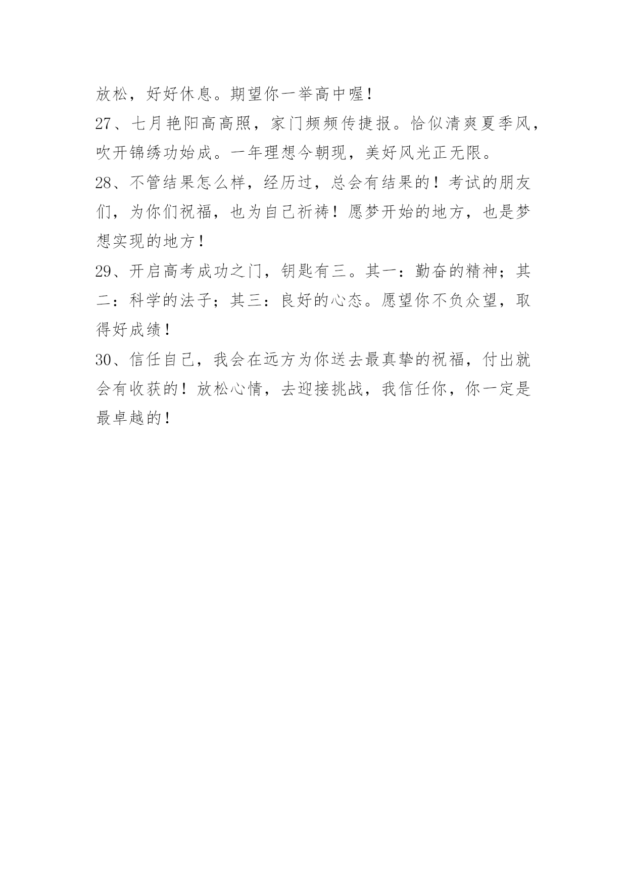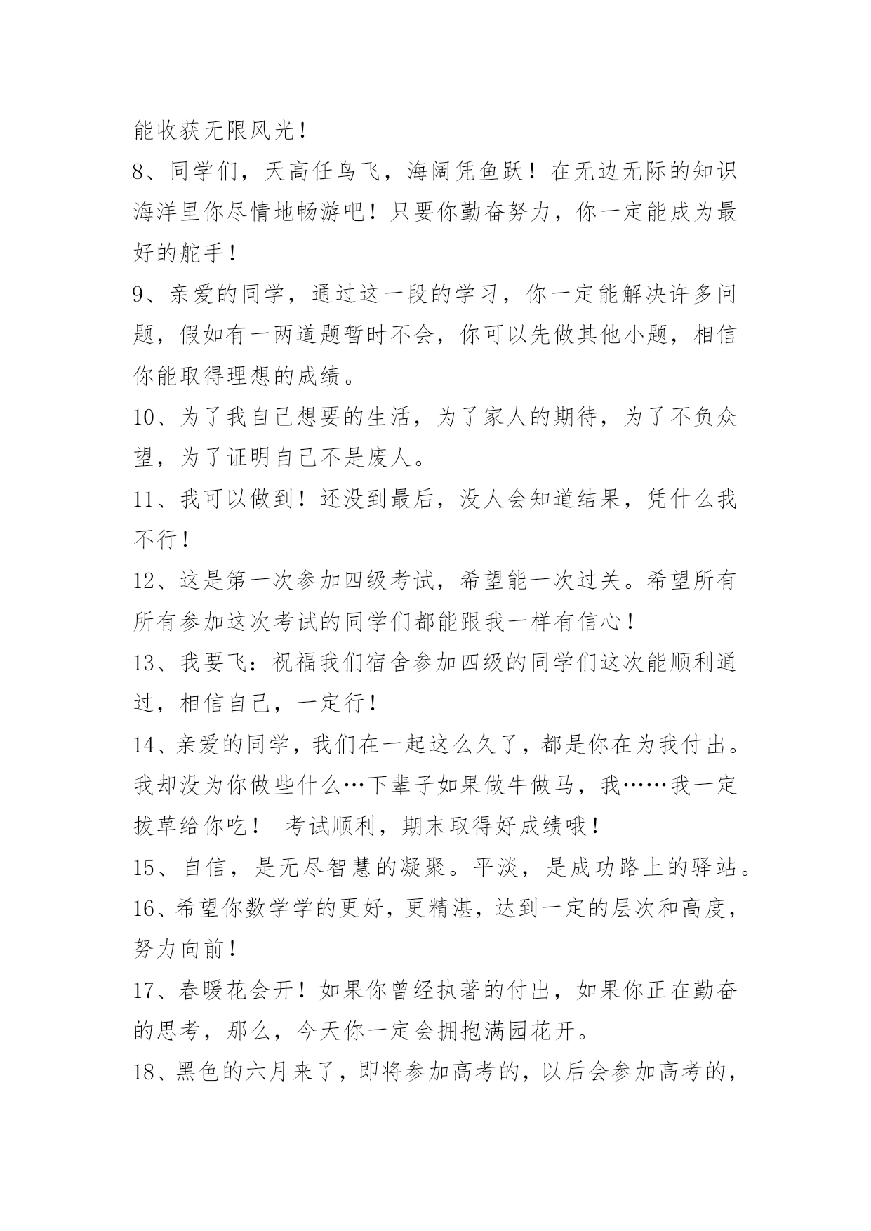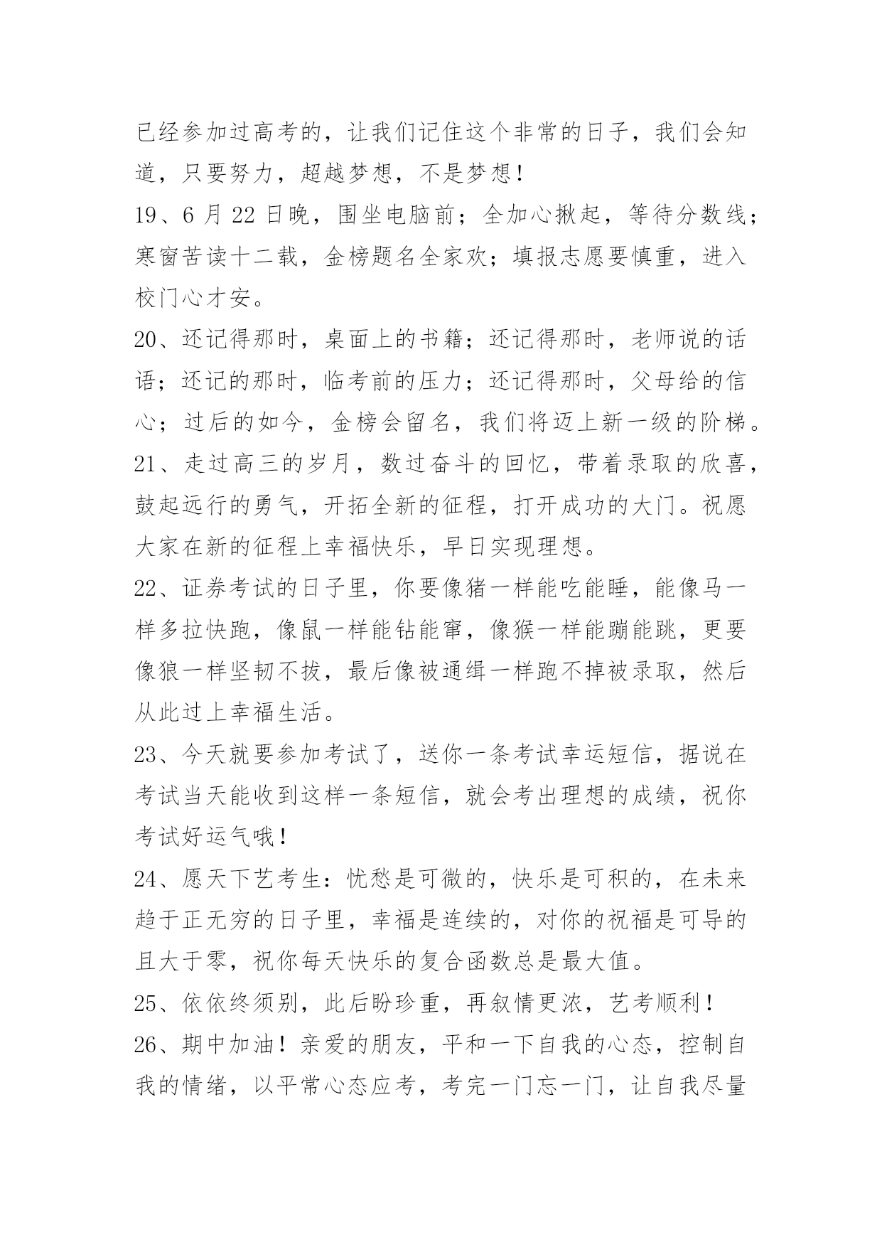 考试祝福语考试祝福语30句精选祝君笑傲考场,威名远扬,夺得理想名次,前程一片辉煌。加油噢。下面是关于考试祝福语的句子,希望能够帮助到你。1、开启高考成功之门,钥匙有三。其一:勤奋的精神;其二:科学的方法;其三:良好的心态。希望你不负众望,取得好成绩!2、你今天就要参加考试了,送你一小礼物,据说在考试当天能收到这样一小礼物,就会考出自己满意的成绩,祝你考试好运气啊!3、十年寒窗苦读日,只盼金榜题名时,祝你考试拿高分,鲤鱼跳龙门!加油!4、愿天下所有考生开心度过期末考试。祝福你们旗开得胜,取得美好佳绩。平心对待期末考试,你们是最棒的!仁慈的上帝会祝福你们的,相信自己,一定能行!5、放开往日的学习中的紧张,用一颗平常心去轻松面对,相信期中大考你会考出自己理想的成绩。6、就要考试啦,以后不用6点起床啦,以后可以天天网游啦,轻松生活的开始,一定不能愁眉苦脸,今晚做个好梦!7、亲爱的同学,如果把这份试卷比作一份湛蓝的.海,那么,我们现在启航,展开你自信和智慧的双翼,乘风踏浪,你定能收获无限风光!8、同学们,天高任鸟飞,海阔凭鱼跃!在无边无际的知识海洋里你尽情地畅游吧!只要你勤奋努力,你一定能成为最好的舵手!9、亲爱的同学,通过这一段的学习,你一定能解决许多问题,假如有一两道题暂时不会,你可以先做其他小题,相信你能取得理想的成绩。10、为了我自己想要的生活,为了家人的期待,为了不负众望,为了证明自己不是废人。11、我可以做到!还没到最后,没人会知道结果,凭什么我不行!12、这是第一次参加四级考试,希望能一次过关。希望所有所有参加这次考试的同学们都能跟我一样有信心!13、我要飞:祝福我们宿舍参加四级的同学们这次能顺利通过,相信自己,一定行!14、亲爱的同学,我们在一起这么久了,都是你在为我付出。我却没为你做些什么…下辈子如果做牛做马,我……我一定拔草给你吃!考试顺利,期末取得好成绩哦!15、自信,是无尽智慧的凝聚。平淡,是成功路上的驿站。16、希望你数学学的更好,更精湛,达到一定的层次和高度,努力向前!17、春暖花会开!如果你曾经执著的付出,如果你正在勤奋的思考,那么,今天你一定会拥抱满园花开。18、黑色的六月来了,即将参加高考的,以后会参加高考的,已经参加过高考的,让我们记住这个非常的日子,我们会知道,只要努力,超越梦想,不是梦想!19、6月22日晚,围坐电脑前;全加心揪起,等待分数线;寒窗苦读十二载,金榜题名全家欢;填报志愿要慎重,进入校门心才安。20、还记得那时,桌面上的书籍;还记得那时,老师说的话语;还记的那时,临考前的压力;还记得那时,父母给的信心;过后的如今,金榜会留名,我们将迈上新一级的阶梯。21、走过高三的岁月,数过奋斗的回忆,带着录取的欣喜,鼓起远行的勇气,开拓全新的征程,打开成功的大门。祝愿大家在新的征程上幸福快乐,早日实现理想。22、证券考试的日子里,你要像猪一样能吃能睡,能像马一样多拉快跑,像鼠一样能钻能窜,像猴一样能蹦能跳,更要像狼一样坚韧不拔,最后像被通缉一样跑不掉被录取,然后从此过上幸福生活。23、今天就要参加考试了,送你一条考试幸运短信,据说在考试当天能收到这样一条短信,就会考出理想的成绩,祝你考试好运气哦!24、愿天下艺考生:忧愁是可微的,快乐是可积的,在未来趋于正无穷的日子里,幸福是连续的,对你的祝福是可导的且大于零,祝你每天快乐的复合函数总是最大值。25、依依终须别,此后盼珍重,再叙情更浓,艺考顺利!26、期中加油!亲爱的朋友,平和一下自我的心态,控制自我的情绪,以平常心态应考,考完一门忘一门,让自我尽量放松,好好休息。期望你一举高中喔!27、七月艳阳高高照,家门频频传捷报。恰似清爽夏季风,吹开锦绣功始成。一年理想今朝现,美好风光正无限。28、不管结果怎么样,经历过,总会有结果的!考试的朋友们,为你们祝福,也为自己祈祷!愿梦开始的地方,也是梦想实现的地方!29、开启高考成功之门,钥匙有三。其一:勤奋的精神;其二:科学的法子;其三:良好的心态。愿望你不负众望,取得好成绩!30、信任自己,我会在远方为你送去最真挚的祝福,付出就会有收获的!放松心情,去迎接挑战,我信任你,你一定是最卓越的!