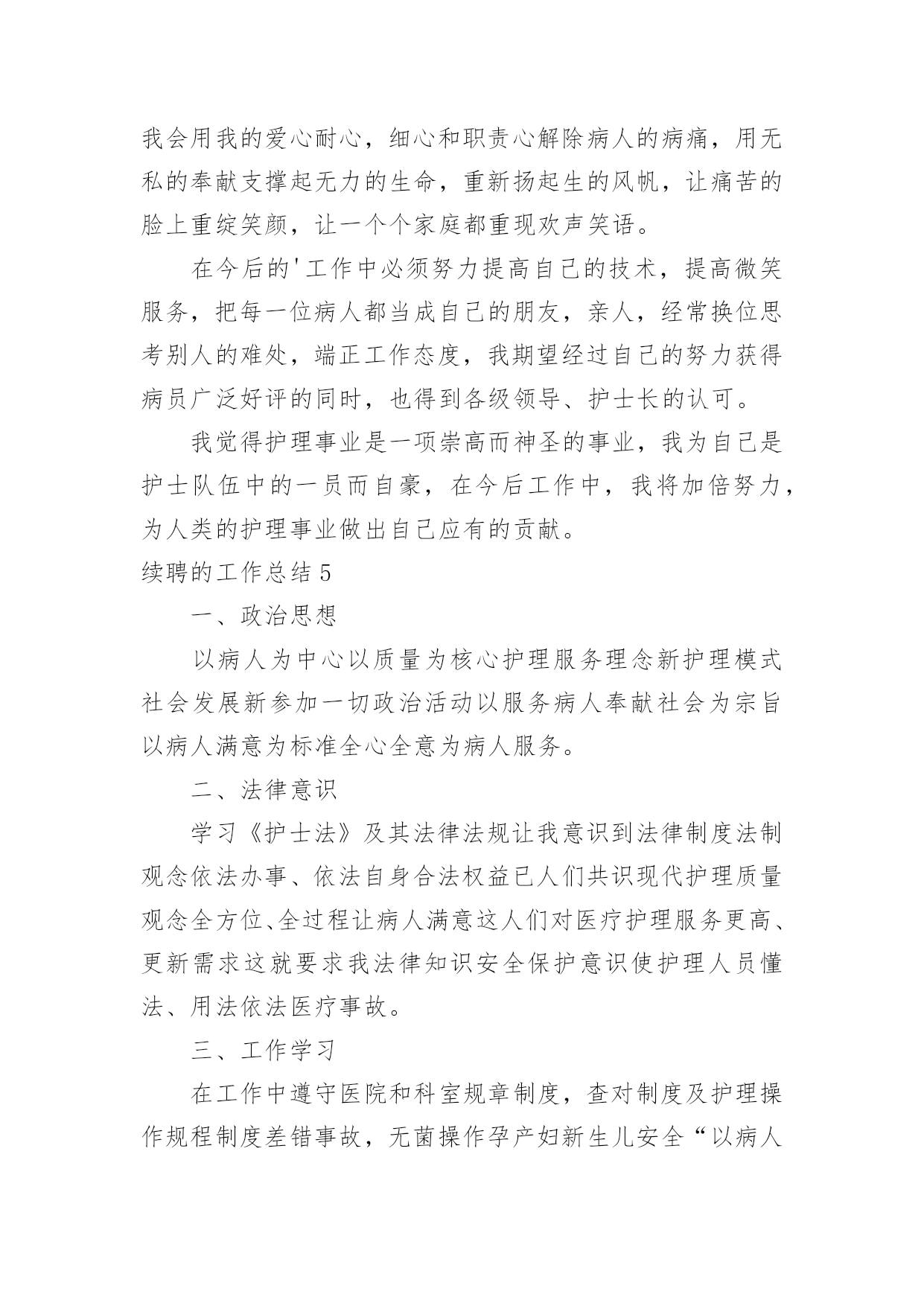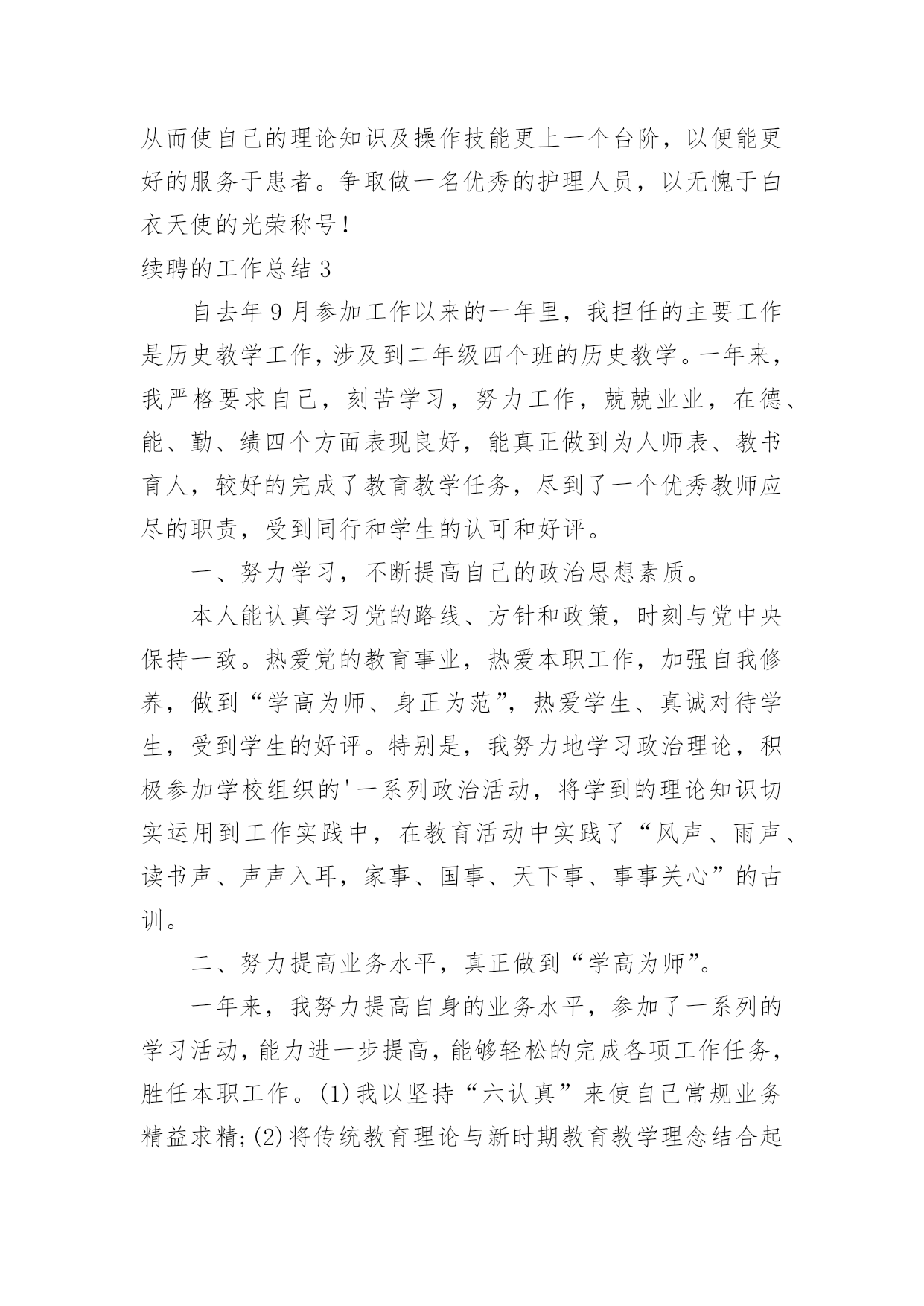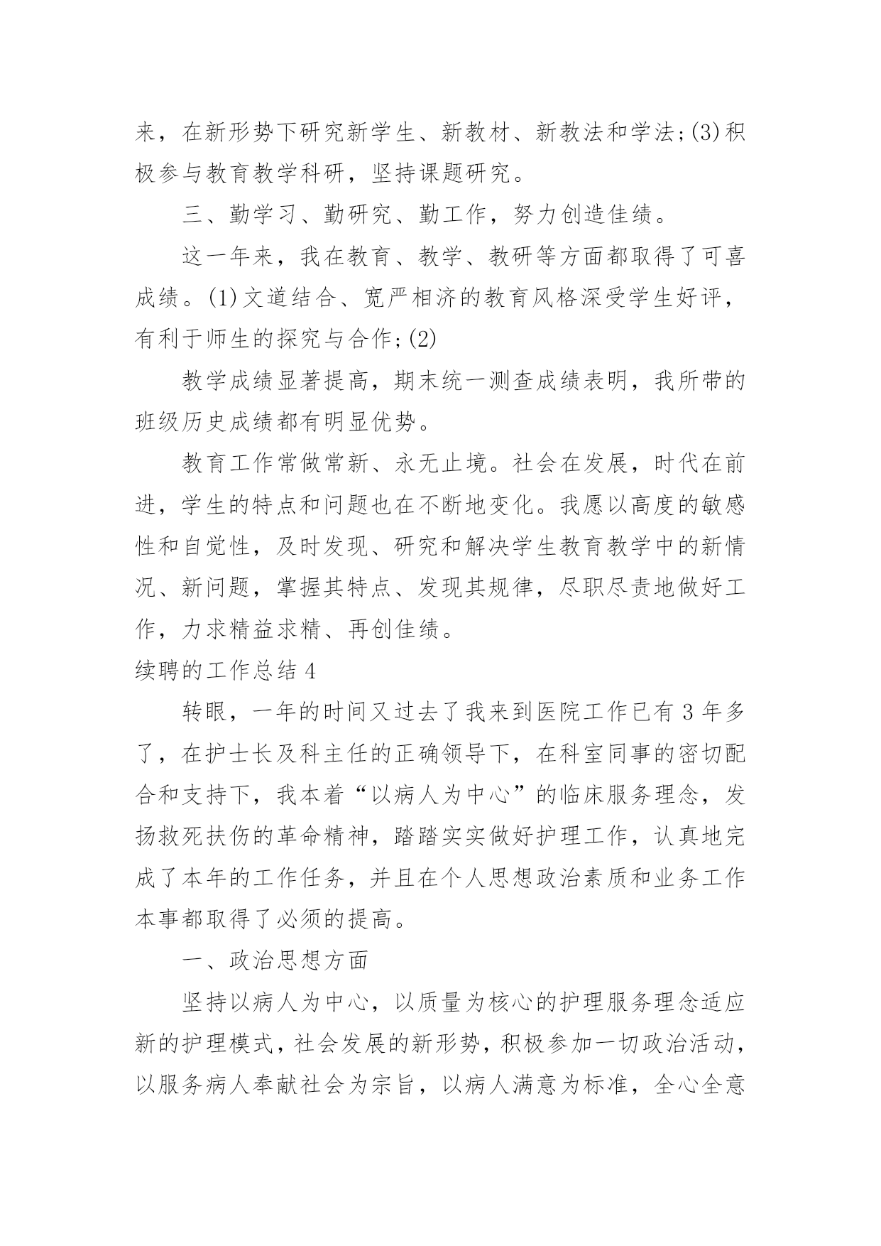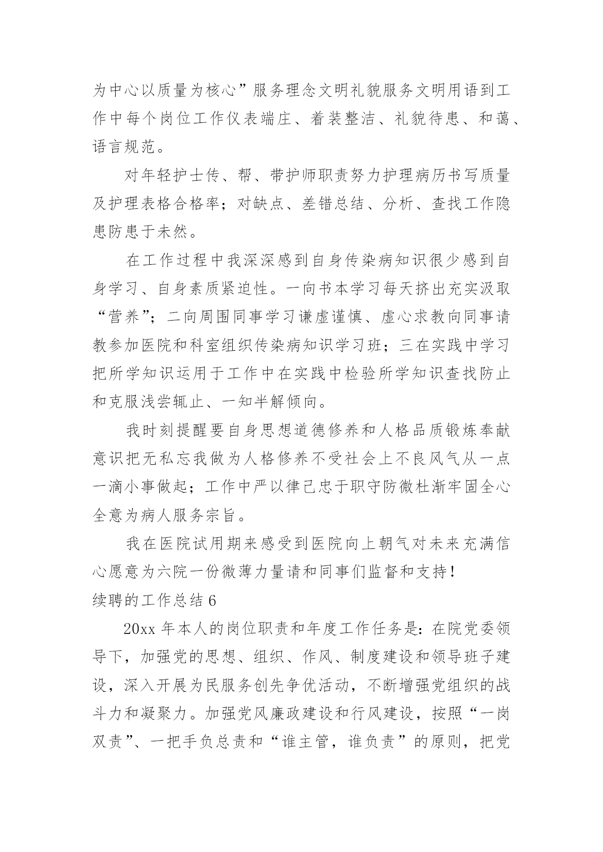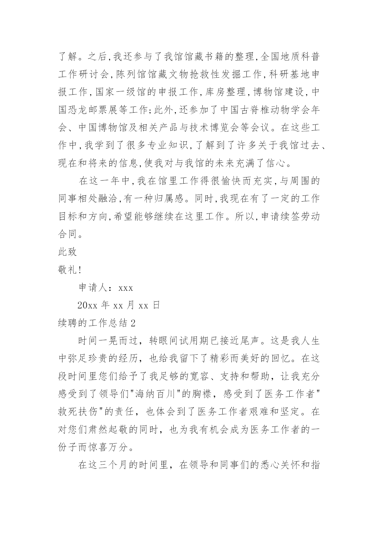 续聘的工作总结续聘的工作总结总结是在某一特定时间段对学习和工作生活或其完成情况,包括取得的成绩、存在的问题及得到的经验和教训加以回顾和分析的书面材料,它是增长才干的一种好办法,是时候写一份总结了。总结怎么写才能发挥它的作用呢?下面是小编帮大家整理的续聘的工作总结,供大家参考借鉴,希望可以帮助到有需要的朋友。续聘的工作总结1尊敬的领导:我从20xx年7月14日到我馆参加工作以来,至今已近一年。在馆内领导与同事的关怀与帮助下,通过自己的努力,认真学习、扎实工作,较好的完成了自己的本职工作,在岗位上努力发挥了应有的作用。现将本人在这一年中的工作情况总结如下,并申请续签合同。在这一年的工作中,我一直积极的工作,努力做好每一项任务。在七月中旬,刚进单位时就参与了《历史地图集?第二卷》之自然环境图及对应历史专题地图的编制工作;在其中学到了许多有关自然环境和历史的知识;在此期间,我还参与了可移动文物普查工作,对我馆的'馆藏品情况有了一定的了解。之后,我还参与了我馆馆藏书籍的整理,全国地质科普工作研讨会,陈列馆馆藏文物抢救性发掘工作,科研基地申报工作,国家一级馆的申报工作,库房整理,博物馆建设,中国恐龙邮票展等工作;此外,还参加了中国古脊椎动物学会年会、中国博物馆及相关产品与技术博览会等会议。在这些工作中,我学到了很多专业知识,了解到了许多关于我馆过去、现在和将来的信息,使我对与我馆的未来充满了信心。在这一年中,我在馆里工作得很愉快而充实,与周围的同事相处融洽,有一种归属感。同时,我现在有了一定的工作目标和方向,希望能够继续在这里工作。所以,申请续签劳动合同。此致敬礼!申请人:xxx20xx年xx月xx日续聘的工作总结2时间一晃而过,转眼间试用期已接近尾声。这是我人生中弥足珍贵的经历,也给我留下了精彩而美好的回忆。在这段时间里您们给予了我足够的宽容、支持和帮助,让我充分感受到了领导们"海纳百川"的胸襟,感受到了医务工作者"救死扶伤"的责任,也体会到了医务工作者艰难和坚定。在对您们肃然起敬的同时,也为我有机会成为医务工作者的一份子而惊喜万分。在这三个月的时间里,在领导和同事们的悉心关怀和指导下,通过自身的不懈努力,各方面均取得了一定的进步,现将工作汇报如下。1、在学习上,严格要求自己,凭着对成为一名优秀白衣天使的.目标和知识的强烈追求,刻苦钻研,勤奋好学,态度端正,目标明确,基本上牢固的掌握了一些专业知识和技能,作到了理论联系实际;除了专业知识的学习外,还注意各方面知识的扩展,广泛的涉猎其他学科的知识,从而提高了自身的思想文化素质。2、在工作上,在科主任及护士长的领导下,我能做到上班不迟到、不早退。正确执行医嘱及各项护理技术操作规程,做好基础护理。严格执行无菌操作和三查七对制度。发现问题,及时解决。在工作中能理论联系实际,遇到不懂的问题能及时向护士长及资深的老师请教,努力提高自身的业务水平。对待患者能文明礼貌的服务,做到态度和蔼,急病人所急,想病人所想。除了完成常规的基础护理外,还熟练的掌握了专科知识和各项护理操作,经常下病房与患者沟通,及时了解他们的动态心理,并做好健康宣教。3、在生活上,养成了良好的生活习惯,生活充实而有条理,有严谨的生活态度和良好的生活态度和生活作风,为人热情大方,诚实守信,乐于助人,拥有自己的良好出事原则,能与同事们和睦相处;积极参加各项课外活动,从而不断的丰富自己的阅历。用有限的生命投入到无限的护理工作中。我会在今后的工作中更加不断努力地学习,以不断提高自身的业务能力。从而使自己的理论知识及操作技能更上一个台阶,以便能更好的服务于患者。争取做一名优秀的护理人员,以无愧于白衣天使的光荣称号!续聘的工作总结3自去年9月参加工作以来的一年里,我担任的主要工作是历史教学工作,涉及到二年级四个班的历史教学。一年来,我严格要求自己,刻苦学习,努力工作,兢兢业业,在德、能、勤、绩四个方面表现良好,能真正做到为人师表、教书育人,较好的完成了教育教学任务,尽到了一个优秀教师应尽的职责,受到同行和学生的认可和好评。一、努力学习,不断提高自己的政治思想素质。本人能认真学习党的路线、方针和政策,时刻与党中央保持一致。热爱党的教育事业,热爱本职工作,加强自我修养,做到“学高为师、身正为范”,热爱学生、真诚对待学生,受到学生的好评。特别是,我努力地学习政治理论,积极参加学校组织的'一系列政治活动,将学到的理论知识切实运用到工作实践中,在教育活动中实践了“风声、雨声、读书声、声声入耳,家事、国事、天下事、事事关心”的古训。二、努力提高业务水平,真正做到“学高为师”。一年来,我努力提高自身的业务水平,参加了一系列的学习活动,能力进一步提高,能够轻松的完成各项工作任务,胜任本职工作。(1)我以坚持“六认真”来使自己常规业务精益求精;(2)将传统教育