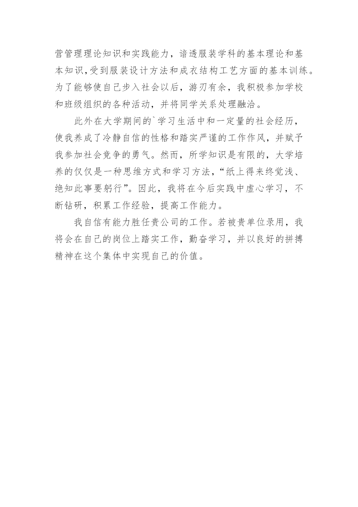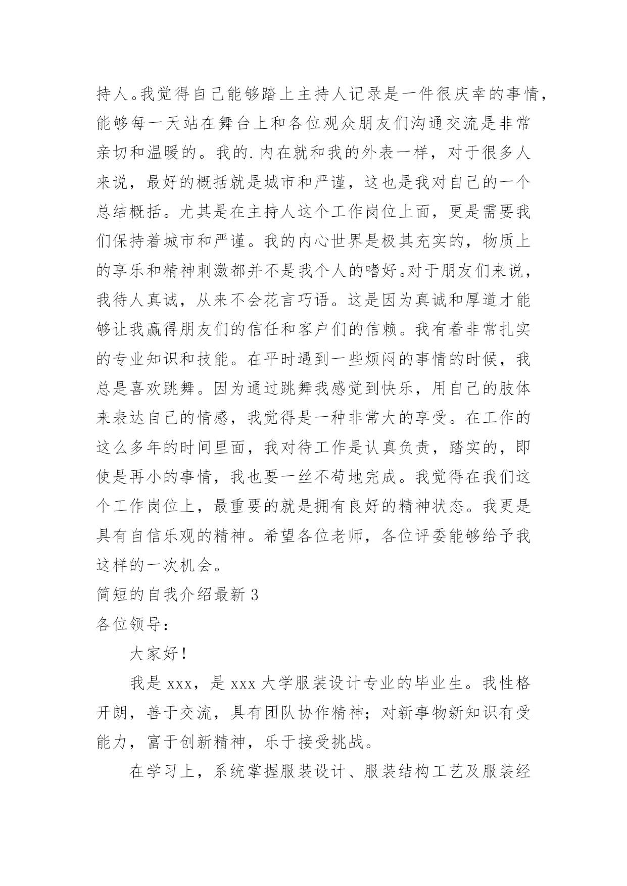 简短的自我介绍最新简短的自我介绍最新当来到一个新环境时,通常需要我们进行自我介绍,通过自我介绍可以得到他人的认可。到底应如何写自我介绍呢?下面是小编整理的简短的自我介绍最新,欢迎大家分享。简短的自我介绍最新1尊敬的领导:我是湖南城市学院金融学专业20xx届本科毕业生,非常荣欣能参与贵公司的现场面试。首先我做个一分钟简短自我介绍:本人性格开朗、吃苦耐劳、为人诚恳、乐观向上、善于交际、敢于面对挑战、做事认真负责、拥有较强的学习能力;拥有较强的.组织能力和适应能力、拥有团队精神、并具有较强的管理策划与组织管理协调能力;善于分析思考,具有高效执行力,我希望可以踏实的干好每一件事。本人主修金融学,语言表达、写作和组织协调能力比较突出,希望不局限与财务工作,寻找更适合自己的管理行政类岗位。简短的自我介绍最新2各位评委,各位老师:大家好,我担任主持人已经有四年的时间了,在这四年的主持生涯之中锻炼了我很多。这四年的主持人生活和工作也教会了我许多,在这里,我非常荣幸自己能够成为一名主持人。我觉得自己能够踏上主持人记录是一件很庆幸的事情,能够每一天站在舞台上和各位观众朋友们沟通交流是非常亲切和温暖的。我的.内在就和我的外表一样,对于很多人来说,最好的概括就是城市和严谨,这也是我对自己的一个总结概括。尤其是在主持人这个工作岗位上面,更是需要我们保持着城市和严谨。我的内心世界是极其充实的,物质上的享乐和精神刺激都并不是我个人的嗜好。对于朋友们来说,我待人真诚,从来不会花言巧语。这是因为真诚和厚道才能够让我赢得朋友们的信任和客户们的信赖。我有着非常扎实的专业知识和技能。在平时遇到一些烦闷的事情的时候,我总是喜欢跳舞。因为通过跳舞我感觉到快乐,用自己的肢体来表达自己的情感,我觉得是一种非常大的享受。在工作的这么多年的时间里面,我对待工作是认真负责,踏实的,即使是再小的事情,我也要一丝不苟地完成。我觉得在我们这个工作岗位上,最重要的就是拥有良好的精神状态。我更是具有自信乐观的精神。希望各位老师,各位评委能够给予我这样的一次机会。简短的自我介绍最新3各位领导:大家好!我是xxx,是xxx大学服装设计专业的毕业生。我性格开朗,善于交流,具有团队协作精神;对新事物新知识有受能力,富于创新精神,乐于接受挑战。在学习上,系统掌握服装设计、服装结构工艺及服装经营管理理论知识和实践能力,谙透服装学科的基本理论和基本知识,受到服装设计方法和成衣结构工艺方面的基本训练。为了能够使自己步入社会以后,游刃有余,我积极参加学校和班级组织的各种活动,并将同学关系处理融洽。此外在大学期间的`学习生活中和一定量的社会经历,使我养成了冷静自信的性格和踏实严谨的工作作风,并赋予我参加社会竞争的勇气。然而,所学知识是有限的,大学培养的仅仅是一种思维方式和学习方法,“纸上得来终觉浅、绝知此事要躬行”。因此,我将在今后实践中虚心学习,不断钻研,积累工作经验,提高工作能力。我自信有能力胜任贵公司的工作。若被贵单位录用,我将会在自己的岗位上踏实工作,勤奋学习,并以良好的拼搏精神在这个集体中实现自己的价值。