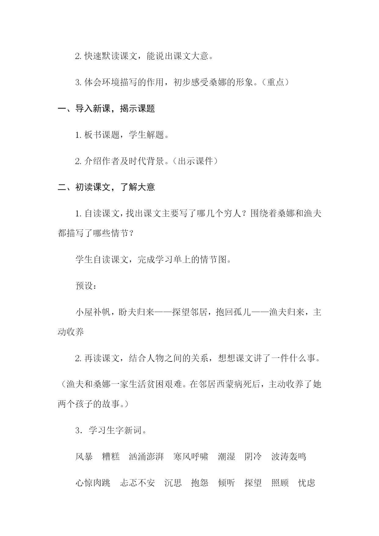 14《穷人》导学案课题穷人课型新授课教学目标1.会写“汹、涌”等16个字,会写“渔夫、汹涌澎湃”等17个词语。 2.正确、流利、有感情地朗读课文,了解文章的主要内容,学习作者通过环境描写、心理描写等描写方法,来刻画人物形象的方法,并明确女主人公桑娜的人物形象。 3.通过了解文章内容,感受俄国穷苦人民富有同情心、爱心的品质。教学重难点梳理本文的主要内容,明确女主人公桑娜的形象。课前准备1.制作多媒体课件。(教师) 2.查找本课的相关资料,了解作者的生平与时代背景。(师生) 3.自学生字词;搜集作者资料;熟读