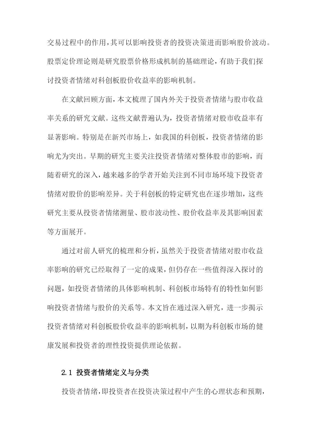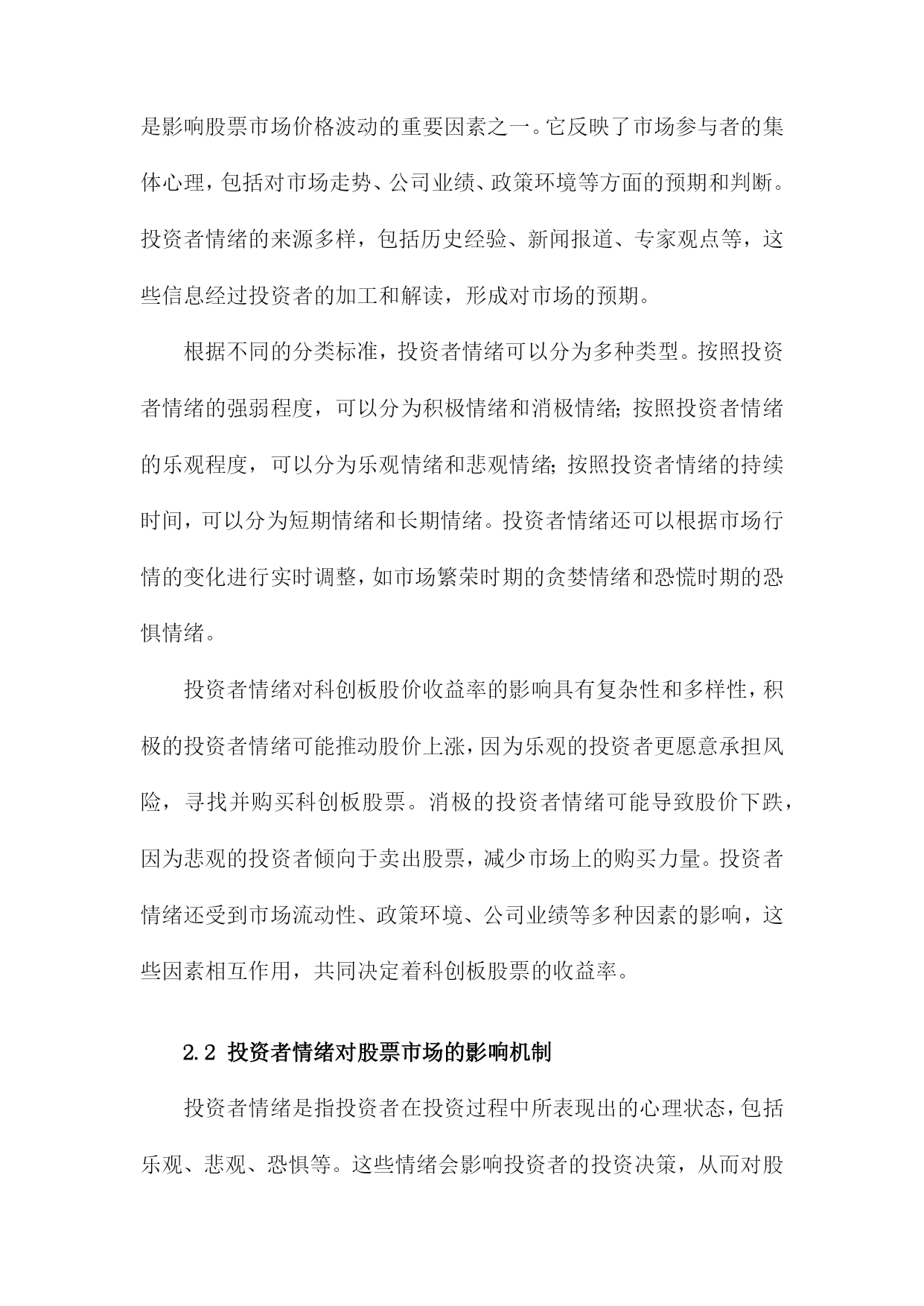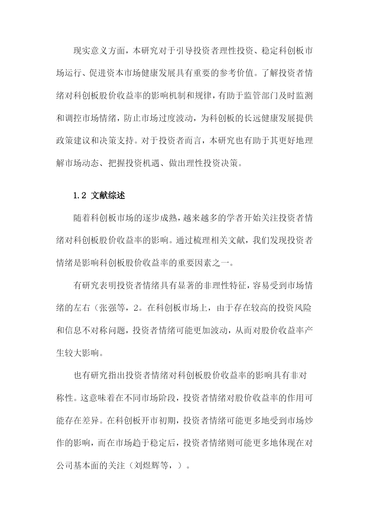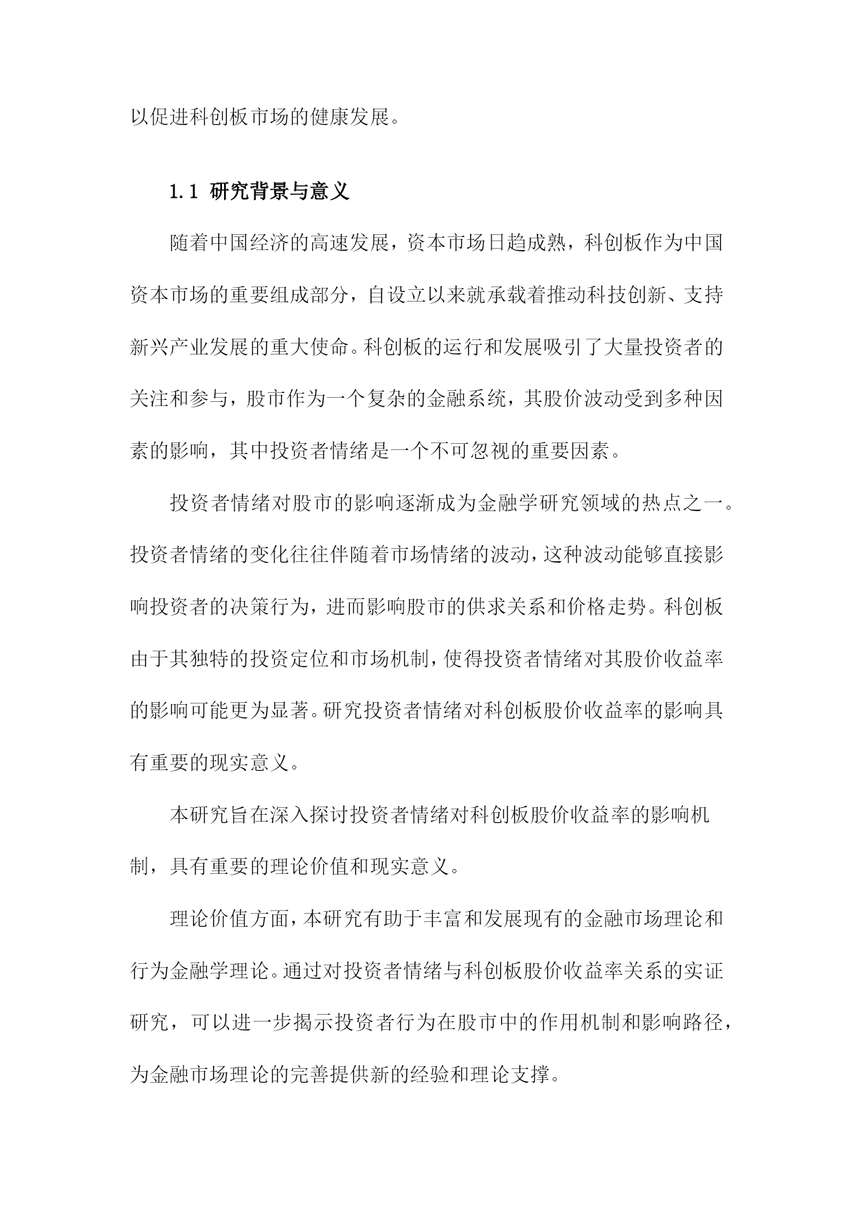 投资者情绪对科创板股价收益率影响研究目录一、内容概述................................................21.1研究背景与意义.......................................21.2文献综述.............................................41.3研究方法与数据来源...................................5二、理论基础与文献回顾......................................62.1投资者情绪定义与分类.................................82.2投资者情绪对股票市场的影响机制.......................92.3科创板及其投资者特点分析............................11三、投资者情绪对科创板股价收益率影响的实证研究.............123.1研究假设与模型构建..................................133.2数据处理与描述性统计分析............................153.3实证结果与分析......................................163.3.1投资者情绪与股价收益率相关性分析................173.3.2投资者情绪对股价收益率的影响程度分析............183.3.3不同投资者类型的影响差异分析....................20四、政策建议与未来展望.....................................214.1提升投资者教育水平..................................224.2完善信息披露制度....................................234.3强化市场监管力度....................................244.4推动投资者结构优化..................................25五、结论...................................................265.1主要研究结论........................................275.2研究不足与改进方向..................................28一、内容概述投资者情绪的概念和内涵:首先,我们将对投资者情绪进行定义和界定,明确其在股票市场中的重要作用。我们还将分析投资者情绪的构成要素,包括乐观、悲观、恐惧等情绪类型。投资者情绪与科创板股价收益率的关系:在此基础上,我们将通过收集和整理科创板市场的相关数据,运用统计学和计量经济学方法,实证分析投资者情绪与科创板股价收益率之间的相关性。我们将关注投资者情绪波动对科创板股价收益率的影响程度、影响方向以及影响机制等方面。投资者情绪管理策略:鉴于投资者情绪对科创板股价收益率的重要影响,我们将在研究的基础上提出相应的投资者情绪管理策略。这些策略将有助于投资者在面对市场波动时,更好地控制自身情绪,降低投资风险,提高投资收益。政策建议:我们将结合研究结果,为政府部门和监管机构提出关于优化科创板市场环境、引导投资者合理管理情绪等方面的政策建议,以促进科创板市场的健康发展。1.1研究背景与意义随着中国经济的高速发展,资本市场日趋成熟,科创板作为中国资本市场的重要组成部分,自设立以来就承载着推动科技创新、支持新兴产业发展的重大使命。科创板的运行和发展吸引了大量投资者的关注和参与,股市作为一个复杂的金融系统,其股价波动受到多种因素的影响,其中投资者情绪是一个不可忽视的重要因素。投资者情绪对股市的影响逐渐成为金融学研究领域的热点之一。投资者情绪的变化往往伴随着市场情绪的波动,这种波动能够直接影响投资者的决策行为,进而影响股市的供求关系和价格走势。科创板由于其独特的投资定位和市场机制,使得投资者情绪对其股价收益率的影响可能更为显著。研究投资者情绪对科创板股价收益率的影响具有重要的现实意义。本研究旨在深入探讨投资者情绪对科创板股价收益率的影响机制,具有重要的理论价值和现实意义。理论价值方面,本研究有助于丰富和发展现有的金融市场理论和行为金融学理论。通过对投资者情绪与科创板股价收益率关系的实证研究,可以进一步揭示投资者行为在股市中的作用机制和影响路径,为金融市场理论的完善提供新的经验和理论支撑。现实意义方面,本