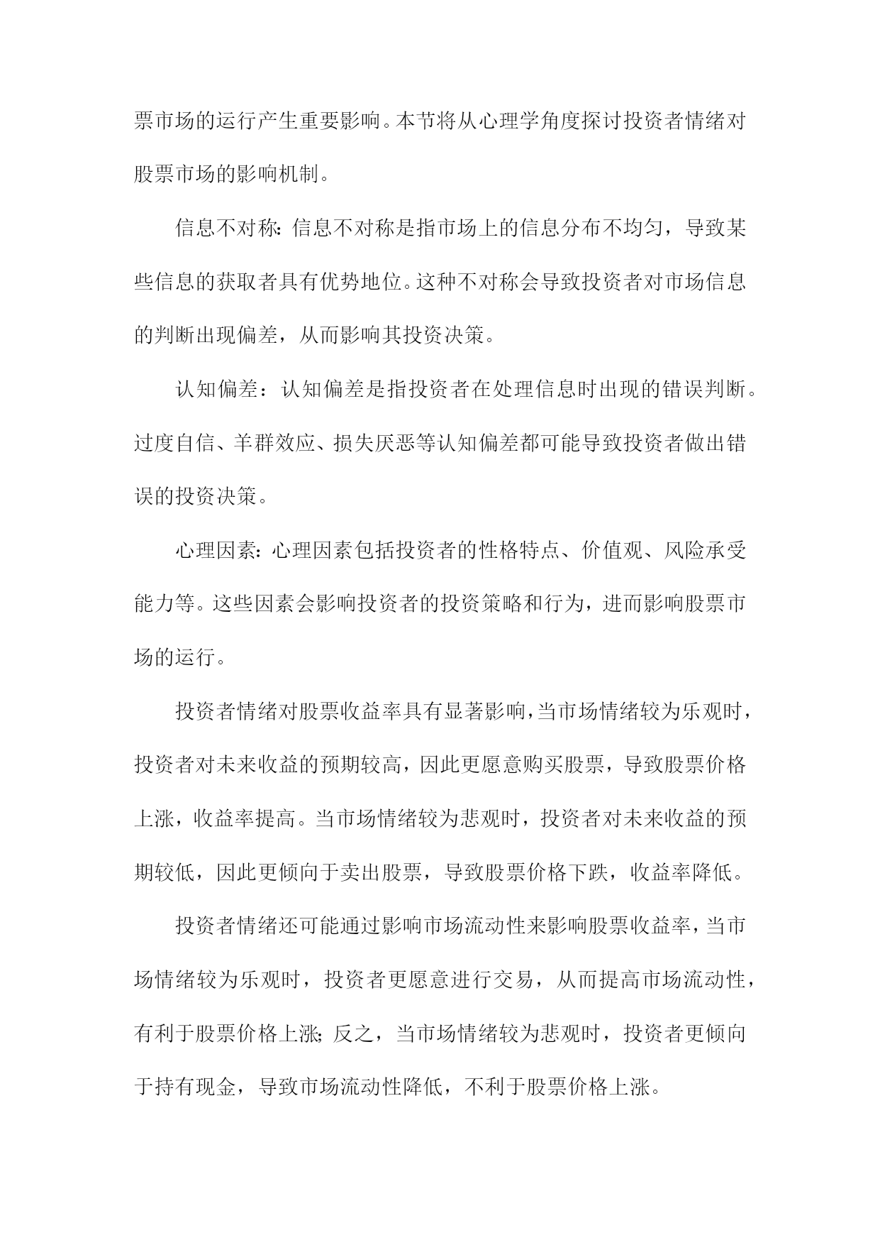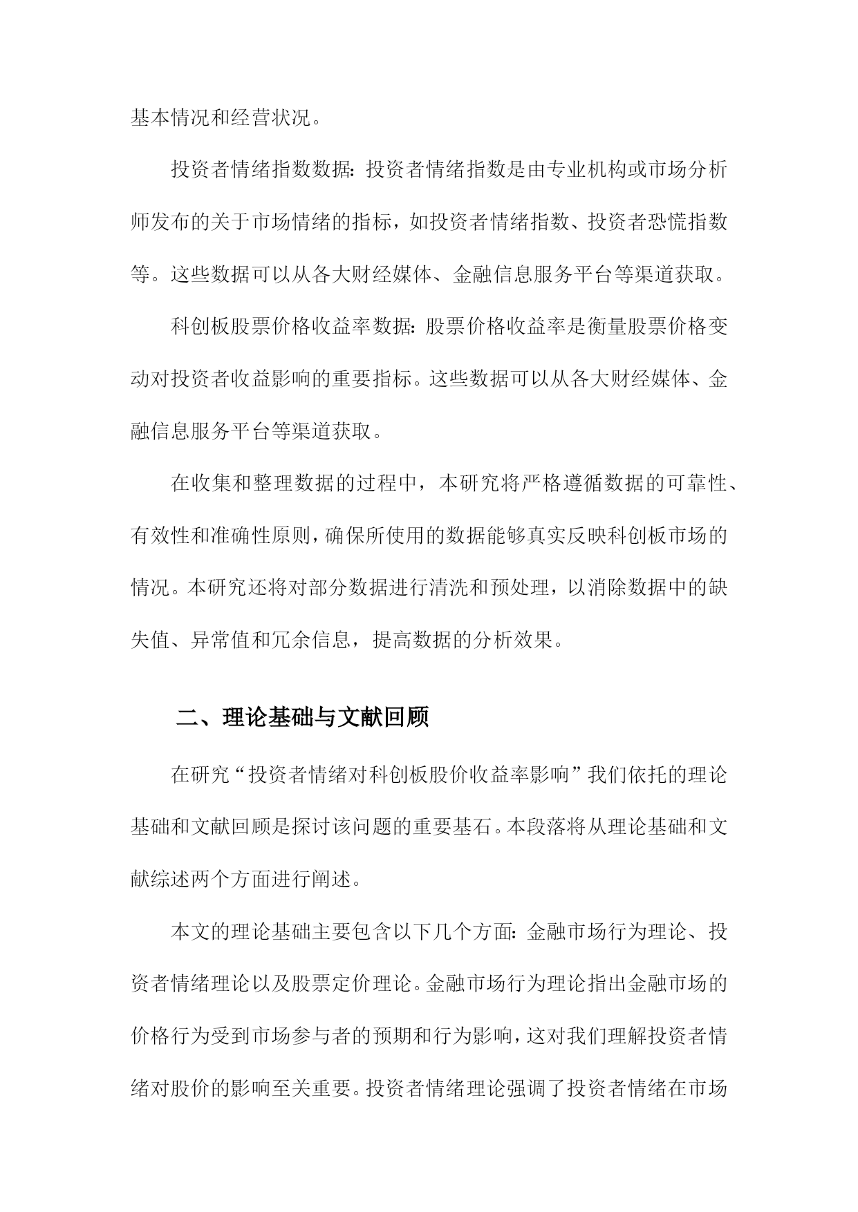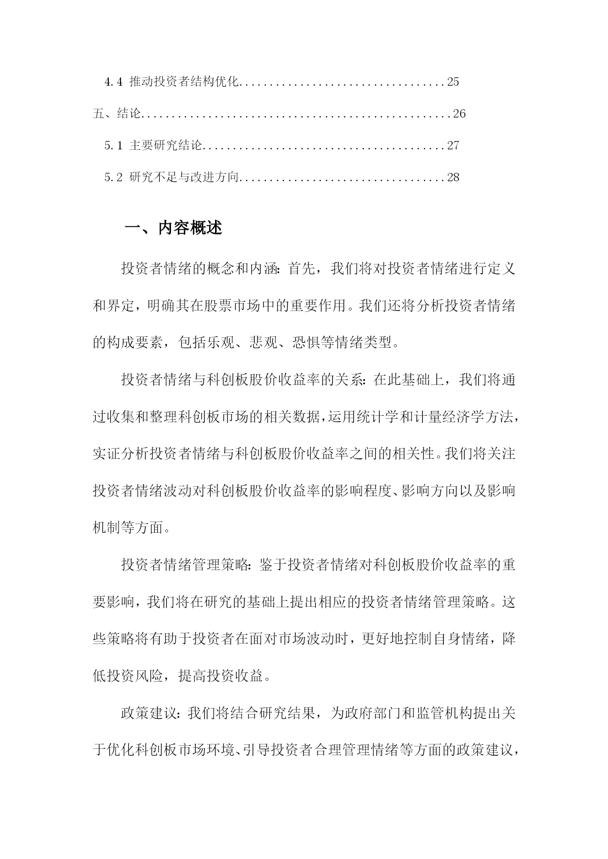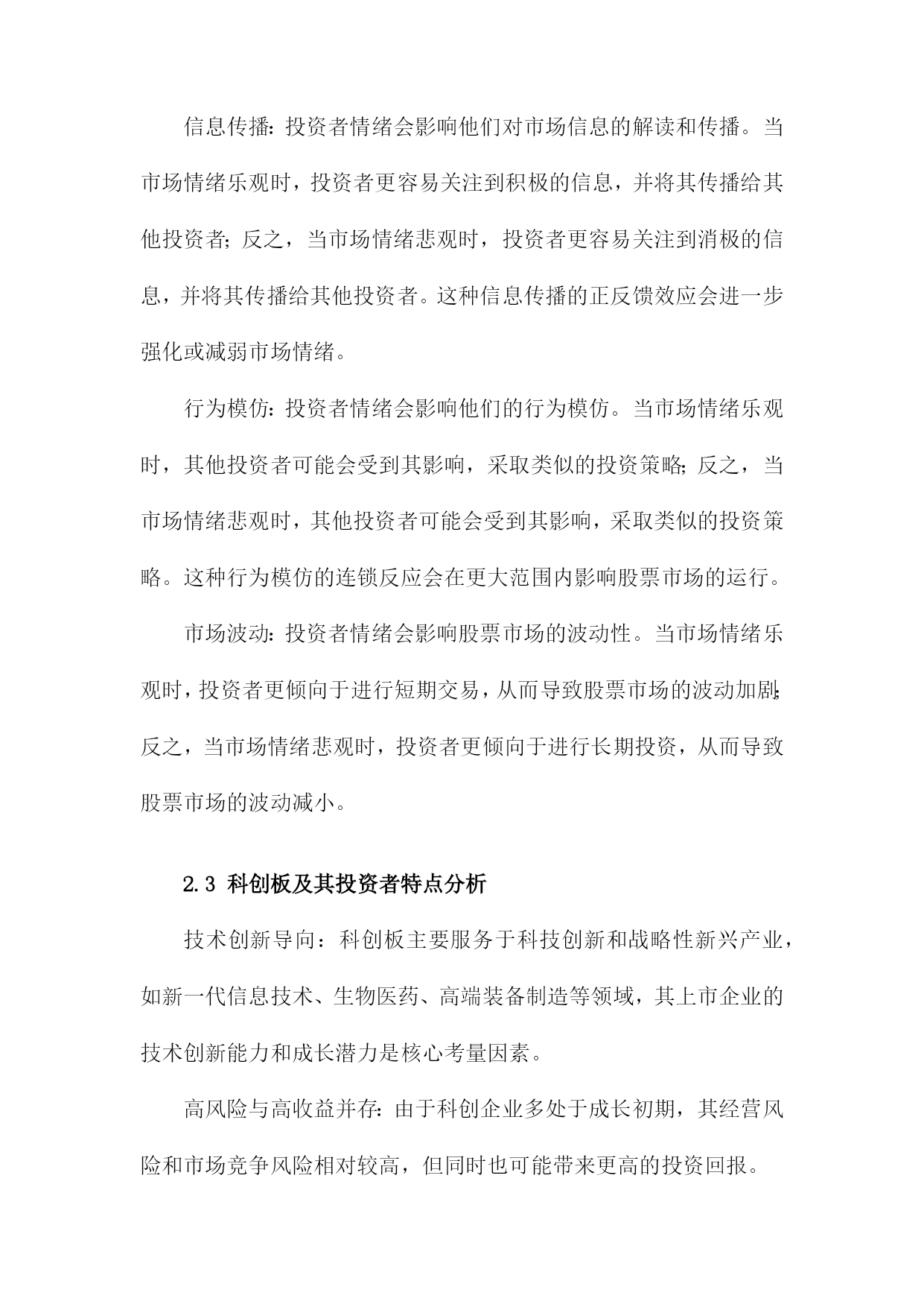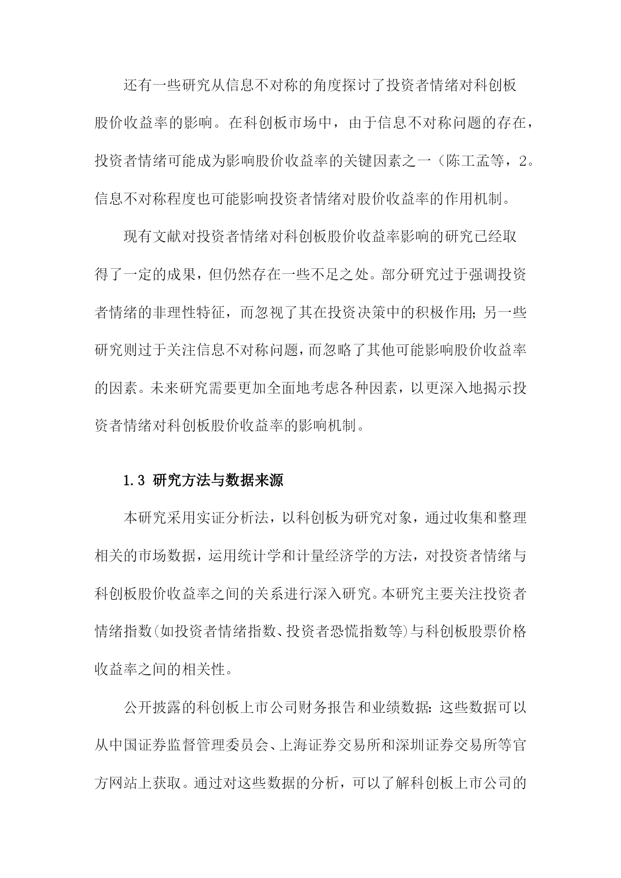 投资者情绪对科创板股价收益率影响研究目录一、内容概述................................................21.1研究背景与意义.......................................21.2文献综述.............................................41.3研究方法与数据来源...................................5二、理论基础与文献回顾......................................62.1投资者情绪定义与分类.................................82.2投资者情绪对股票市场的影响机制.......................92.3科创板及其投资者特点分析............................11三、投资者情绪对科创板股价收益率影响的实证研究.............123.1研究假设与模型构建..................................133.2数据处理与描述性统计分析............................153.3实证结果与分析......................................163.3.1投资者情绪与股价收益率相关性分析................173.3.2投资者情绪对股价收益率的影响程度分析............183.3.3不同投资者类型的影响差异分析....................20四、政策建议与未来展望.....................................214.1提升投资者教育水平..................................224.2完善信息披露制度....................................234.3强化市场监管力度....................................244.4推动投资者结构优化..................................25五、结论...................................................265.1主要研究结论........................................275.2研究不足与改进方向..................................28一、内容概述投资者情绪的概念和内涵:首先,我们将对投资者情绪进行定义和界定,明确其在股票市场中的重要作用。我们还将分析投资者情绪的构成要素,包括乐观、悲观、恐惧等情绪类型。投资者情绪与科创板股价收益率的关系:在此基础上,我们将通过收集和整理科创板市场的相关数据,运用统计学和计量经济学方法,实证分析投资者情绪与科创板股价收益率之间的相关性。我们将关注投资者情绪波动对科创板股价收益率的影响程度、影响方向以及影响机制等方面。投资者情绪管理策略:鉴于投资者情绪对科创板股价收益率的重要影响,我们将在研究的基础上提出相应的投资者情绪管理策略。这些策略将有助于投资者在面对市场波动时,更好地控制自身情绪,降低投资风险,提高投资收益。政策建议:我们将结合研究结果,为政府部门和监管机构提出关于优化科创板市场环境、引导投资者合理管理情绪等方面的政策建议,以促进科创板市场的健康发展。1.1研究背景与意义随着中国经济的高速发展,资本市场日趋成熟,科创板作为中国资本市场的重要组成部分,自设立以来就承载着推动科技创新、支持新兴产业发展的重大使命。科创板的运行和发展吸引了大量投资者的关注和参与,股市作为一个复杂的金融系统,其股价波动受到多种因素的影响,其中投资者情绪是一个不可忽视的重要因素。投资者情绪对股市的影响逐渐成为金融学研究领域的热点之一。投资者情绪的变化往往伴随着市场情绪的波动,这种波动能够直接影响投资者的决策行为,进而影响股市的供求关系和价格走势。科创板由于其独特的投资定位和市场机制,使得投资者情绪对其股价收益率的影响可能更为显著。研究投资者情绪对科创板股价收益率的影响具有重要的现实意义。本研究旨在深入探讨投资者情绪对科创板股价收益率的影响机制,具有重要的理论价值和现实意义。理论价值方面,本研究有助于丰富和发展现有的金融市场理论和行为金融学理论。通过对投资者情绪与科创板股价收益率关系的实证研究,可以进一步揭示投资者行为在股市中的作用机制和影响路径,为金融市场理论的完善提供新的经验和理论支撑。现实意义方面,本