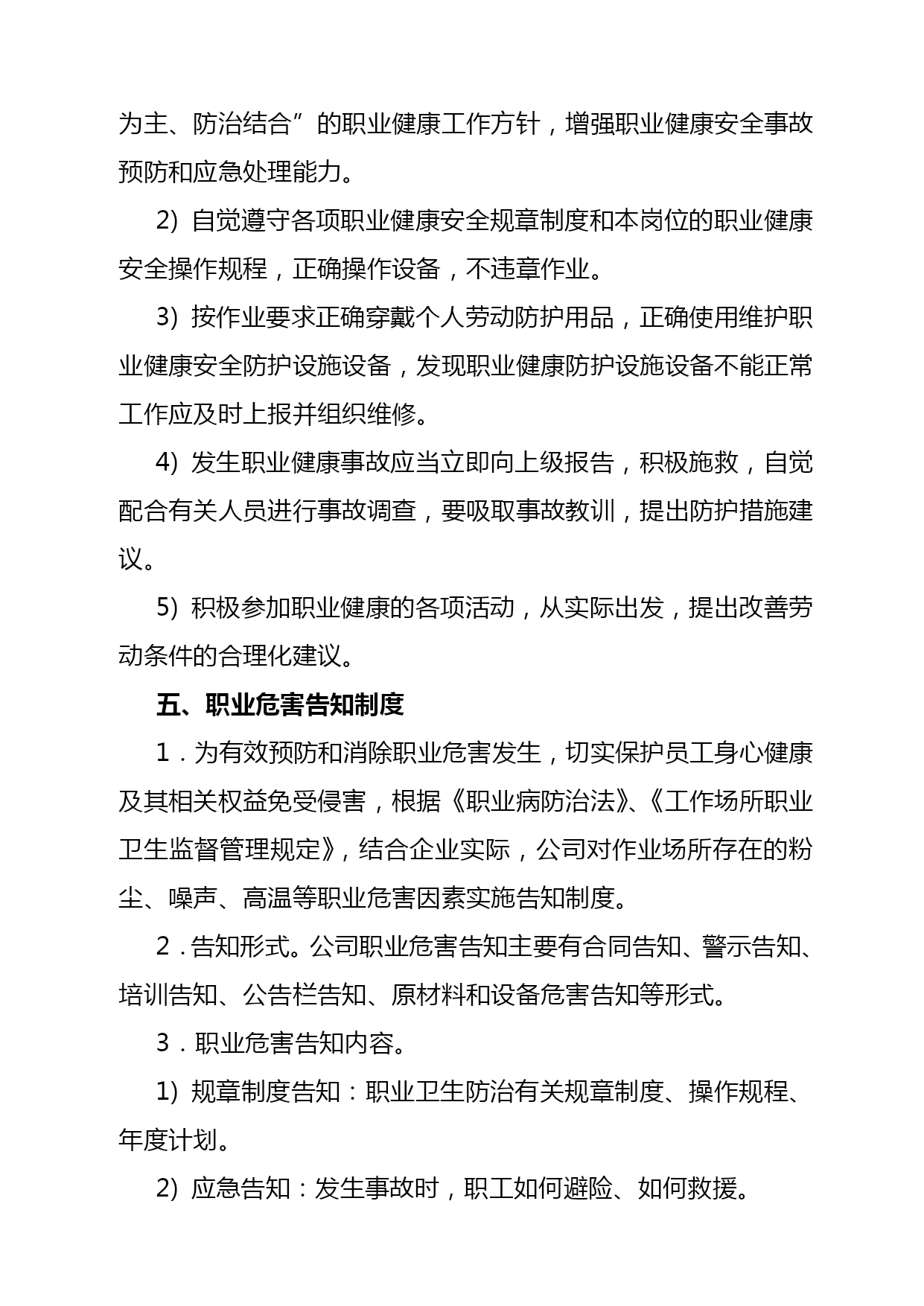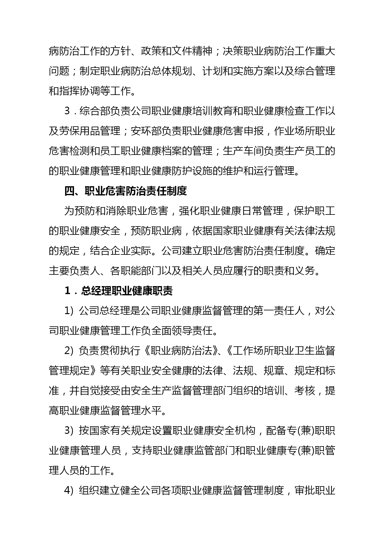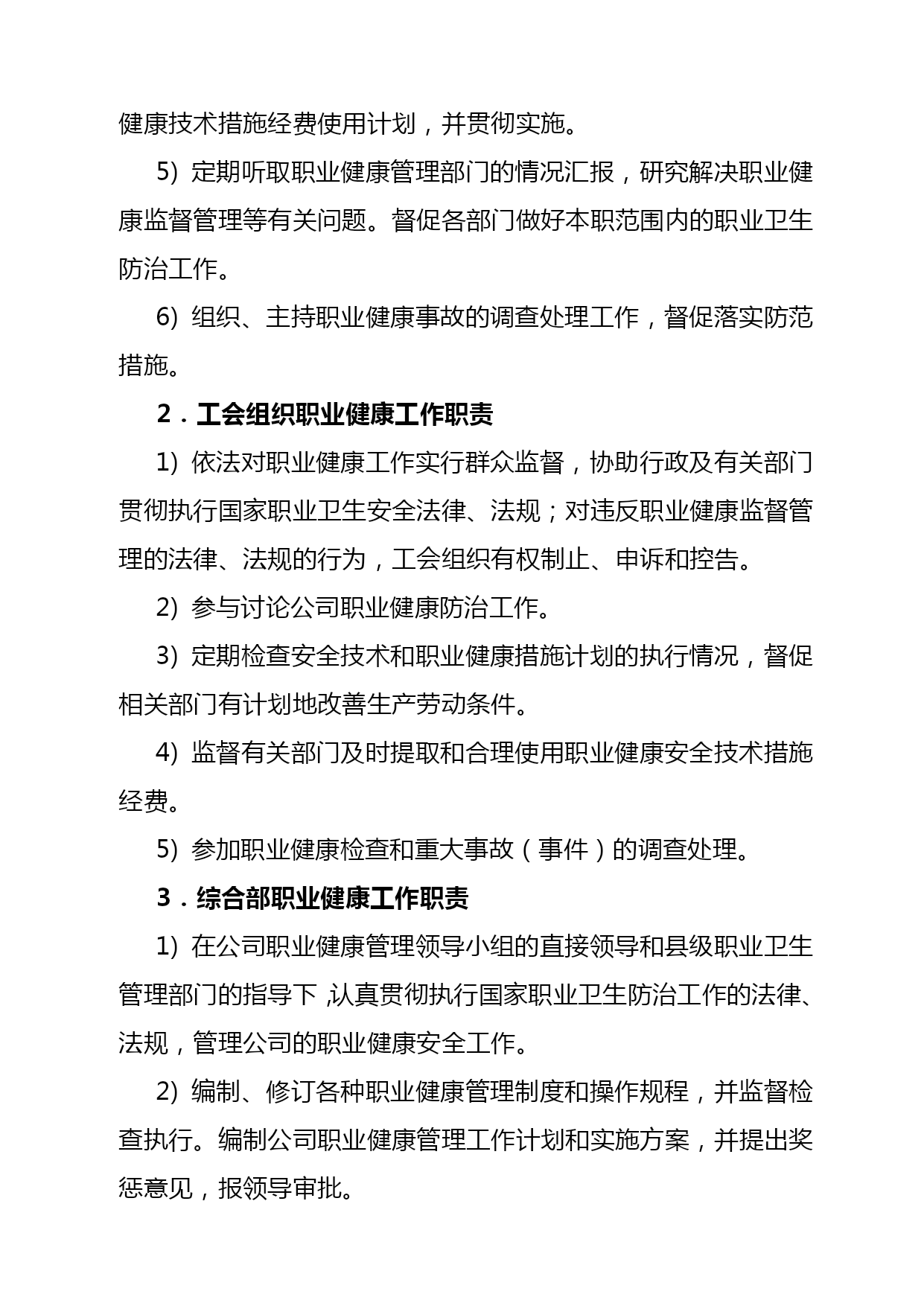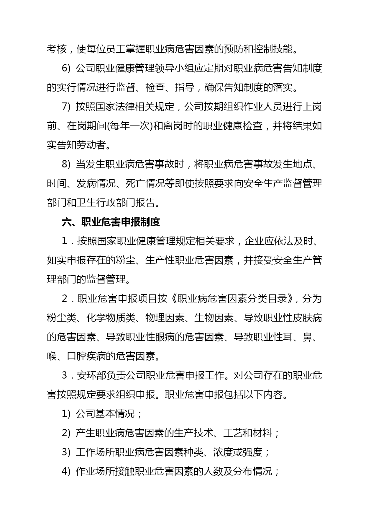 职业健康安全制度精选(完整版)资料(可以直接使用,可编辑优秀版资料,欢迎下载)职业健康安全管理制度一、目的范围为控制和消除职业危害,预防职业病,保障职工在生产过程中的职业健康安全,提高经济效益,依据国家有关职业健康安全管理的法律法规及规定,结合公司的实际情况,特制订本制度。本制度适用于公司职业健康安全管理。二、管理内容1.职业危害指对从事职业活动的劳动者可能导致职业病的各种危害。职业危害因素包括:职业活动中存在的各种有害的化学、物理、生物因素以及在作业过程中产生的其他有害因素。2.职业病指用人单位的劳动者在职业活动中,因接触粉尘、放射性物质和其他有毒有害物质等因素而引起的,并列入国家公布的职业病名单的疾病。3.公司职业健康安全管理坚持“预防为主、防治结合”的方针,实行分类管理、综合治理的基本管理原则。三、工作职责1.公司安委会成立职业健康管理领导小组,做为公司职业健康管理领导机构,总经理任组长,各部门及生产车间的负责人为组员;领导小组办公室设在综合部,负责职业健康安全管理工作日常开展。2.职业健康管理领导小组负责贯彻执行国家和上级有关职业病防治工作的方针、政策和文件精神;决策职业病防治工作重大问题;制定职业病防治总体规划、计划和实施方案以及综合管理和指挥协调等工作。3.综合部负责公司职业健康培训教育和职业健康检查工作以及劳保用品管理;安环部负责职业健康危害申报,作业场所职业危害检测和员工职业健康档案的管理;生产车间负责生产员工的的职业健康管理和职业健康防护设施的维护和运行管理。四、职业危害防治责任制度为预防和消除职业危害,强化职业健康日常管理,保护职工的职业健康安全,预防职业病,依据国家职业健康有关法律法规的规定,结合企业实际。公司建立职业危害防治责任制度。确定主要负责人、各职能部门以及相关人员应履行的职责和义务。1.总经理职业健康职责1)公司总经理是公司职业健康监督管理的第一责任人,对公司职业健康管理工作负全面领导责任。2)负责贯彻执行《职业病防治法》、《工作场所职业卫生监督管理规定》等有关职业安全健康的法律、法规、规章、规定和标准,并自觉接受由安全生产监督管理部门组织的培训、考核,提高职业健康监督管理水平。3)按国家有关规定设置职业健康安全机构,配备专(兼)职职业健康管理人员,支持职业健康监管部门和职业健康专(兼)职管理人员的工作。4)组织建立健全公司各项职业健康监督管理制度,审批职业健康技术措施经费使用计划,并贯彻实施。5)定期听取职业健康管理部门的情况汇报,研究解决职业健康监督管理等有关问题。督促各部门做好本职范围内的职业卫生防治工作。6)组织、主持职业健康事故的调查处理工作,督促落实防范措施。2.工会组织职业健康工作职责1)依法对职业健康工作实行群众监督,协助行政及有关部门贯彻执行国家职业卫生安全法律、法规;对违反职业健康监督管理的法律、法规的行为,工会组织有权制止、申诉和控告。2)参与讨论公司职业健康防治工作。3)定期检查安全技术和职业健康措施计划的执行情况,督促相关部门有计划地改善生产劳动条件。4)监督有关部门及时提取和合理使用职业健康安全技术措施经费。5)参加职业健康检查和重大事故(事件)的调查处理。3.综合部职业健康工作职责1)在公司职业健康管理领导小组的直接领导和县级职业卫生管理部门的指导下,认真贯彻执行国家职业卫生防治工作的法律、法规,管理公司的职业健康安全工作。2)编制、修订各种职业健康管理制度和操作规程,并监督检查执行。编制公司职业健康管理工作计划和实施方案,并提出奖惩意见,报领导审批。3)负责劳保用品的管理,督促检查有关部门做好劳动防护用品定期发放等工作。4)负责组织开展公司职业健康安全培训教育活动,做好外培人员的协调安排;完成新进人员的职业健康安全教育。5)协助有关部门做好防火、防爆、防尘、防毒、职业病防治工作和特种设备的安全防护装置的检查工作。6)在人力资源配置时对患有某工种禁忌症的人员,不得安排从事该工种操作。7)按照国家有关要求,及时完成职工年度例行职业健康体检工作。做好新入厂员工上岗前的健康查体和员工离岗前的职业健康查体工作。4.安环部职业健康工作职责1)宣传、贯彻国家职业健康的有关法律、法规,并监督实施。2)确定公司的职业危害因素监测点,协助监测部门对职业危害因素监测点进行监测,并对监测结果进行公示;对超标场所,分析原因,提出整改方案,监督整改。3)负责职业病危害项目申报工作,负责企业劳动卫生档案的建立工作;负责在职员工职业健康档案的归档管理工作。4)负责组织进行建设项目的职业病危害预评价和职业病危害控制效果评价。5)协助综合部积极开展职业健康教育工作,普及和提高全体员工的职业健康知识,