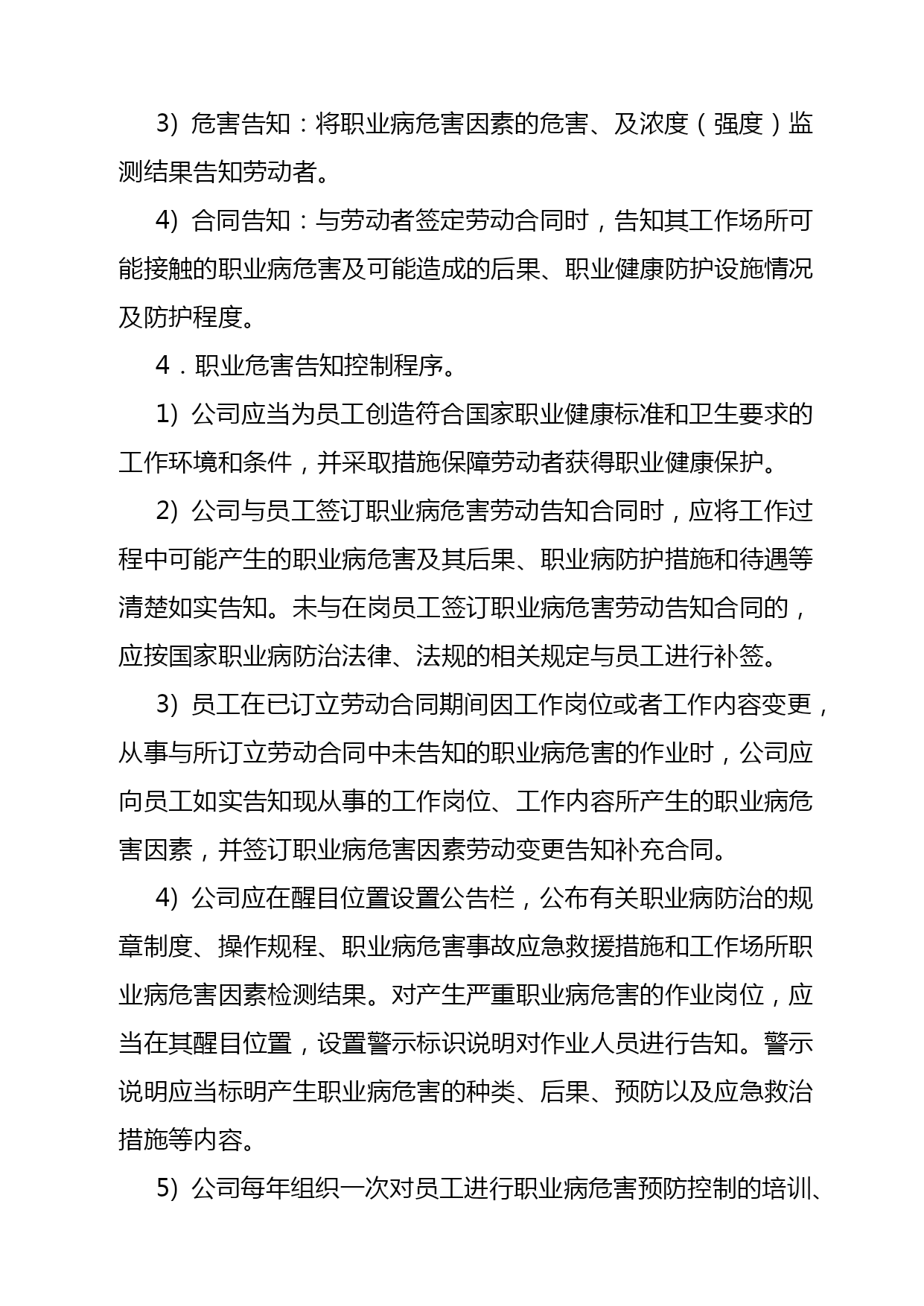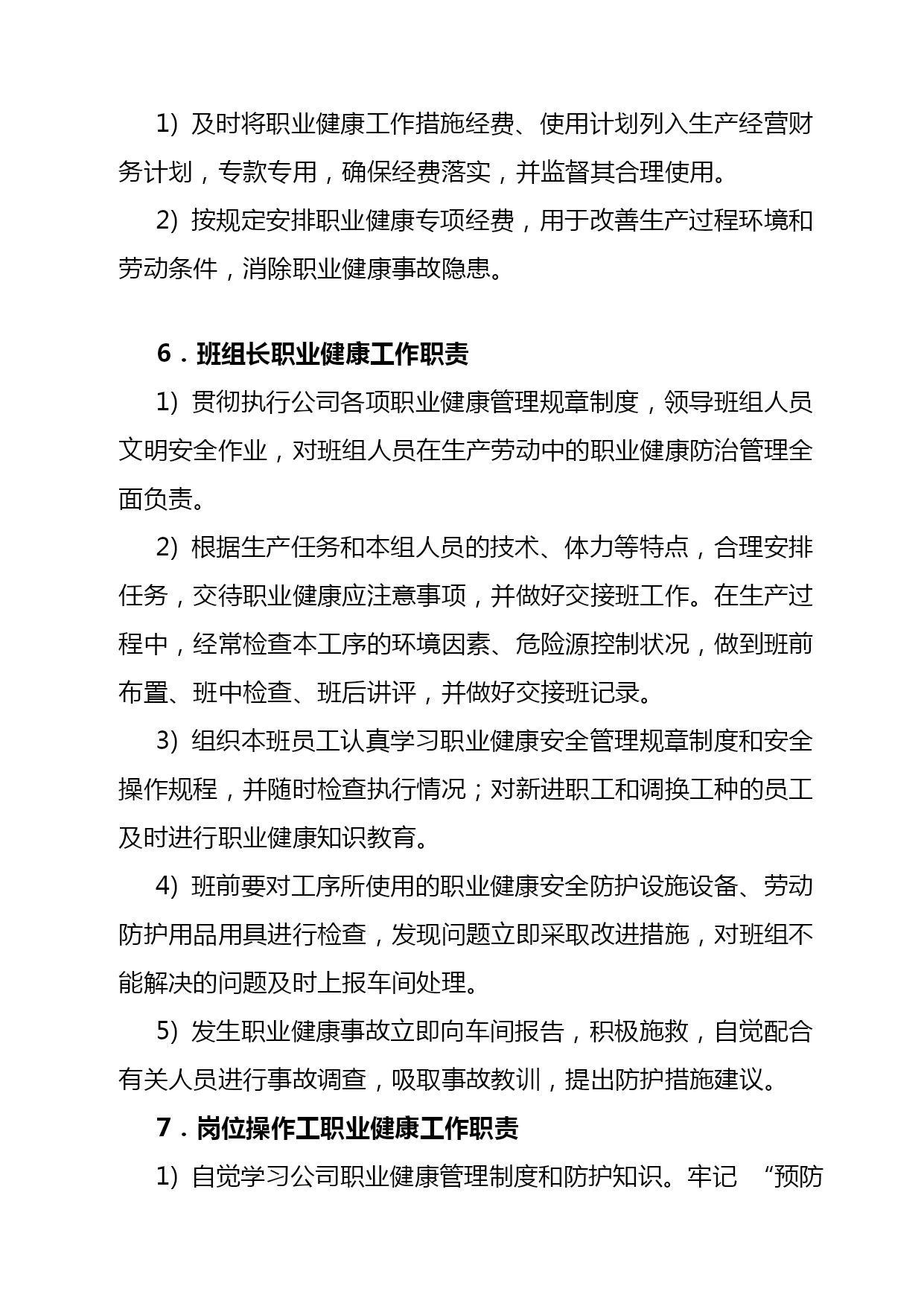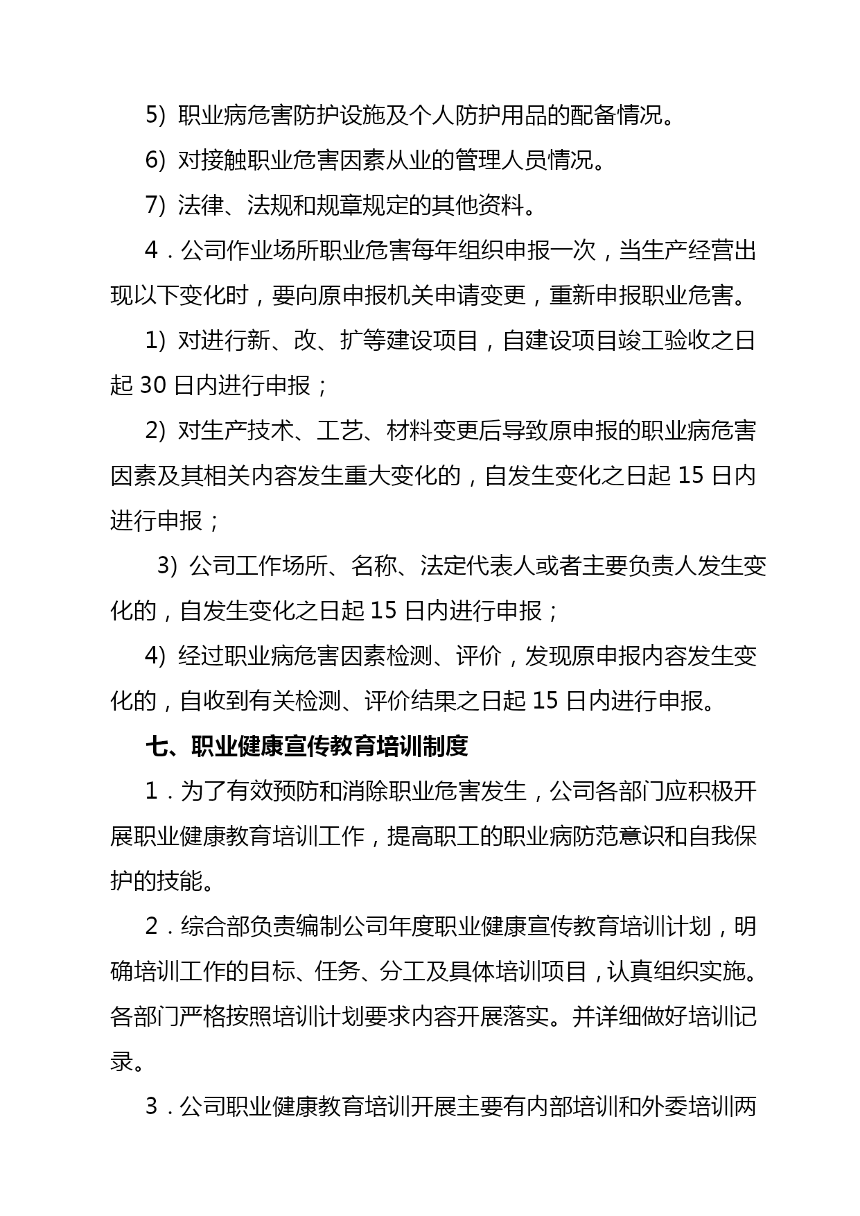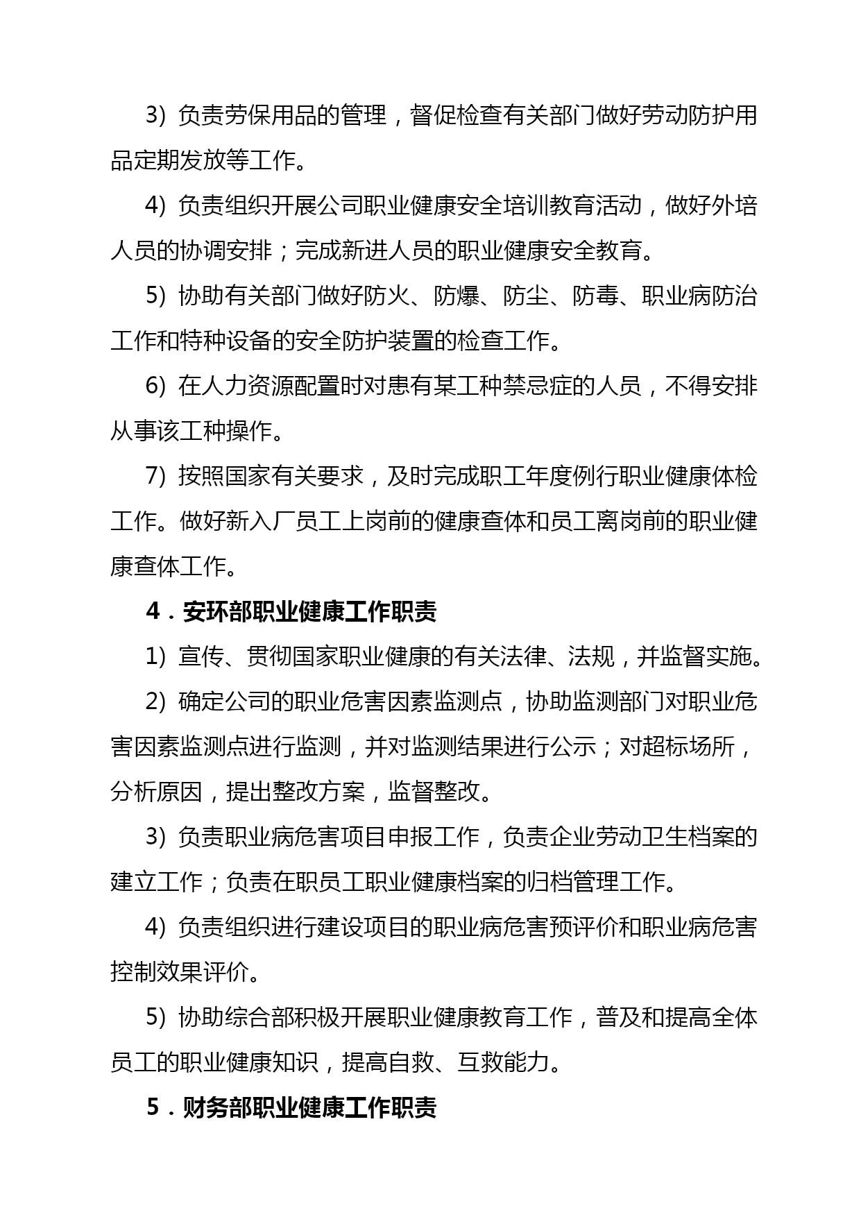 职业健康安全制度精选(完整版)资料(可以直接使用,可编辑优秀版资料,欢迎下载)职业健康安全管理制度一、目的范围为控制和消除职业危害,预防职业病,保障职工在生产过程中的职业健康安全,提高经济效益,依据国家有关职业健康安全管理的法律法规及规定,结合公司的实际情况,特制订本制度。本制度适用于公司职业健康安全管理。二、管理内容1.职业危害指对从事职业活动的劳动者可能导致职业病的各种危害。职业危害因素包括:职业活动中存在的各种有害的化学、物理、生物因素以及在作业过程中产生的其他有害因素。2.职业病指用人单位的劳动者在职业活动中,因接触粉尘、放射性物质和其他有毒有害物质等因素而引起的,并列入国家公布的职业病名单的疾病。3.公司职业健康安全管理坚持“预防为主、防治结合”的方针,实行分类管理、综合治理的基本管理原则。三、工作职责1.公司安委会成立职业健康管理领导小组,做为公司职业健康管理领导机构,总经理任组长,各部门及生产车间的负责人为组员;领导小组办公室设在综合部,负责职业健康安全管理工作日常开展。2.职业健康管理领导小组负责贯彻执行国家和上级有关职业病防治工作的方针、政策和文件精神;决策职业病防治工作重大问题;制定职业病防治总体规划、计划和实施方案以及综合管理和指挥协调等工作。3.综合部负责公司职业健康培训教育和职业健康检查工作以及劳保用品管理;安环部负责职业健康危害申报,作业场所职业危害检测和员工职业健康档案的管理;生产车间负责生产员工的的职业健康管理和职业健康防护设施的维护和运行管理。四、职业危害防治责任制度为预防和消除职业危害,强化职业健康日常管理,保护职工的职业健康安全,预防职业病,依据国家职业健康有关法律法规的规定,结合企业实际。公司建立职业危害防治责任制度。确定主要负责人、各职能部门以及相关人员应履行的职责和义务。1.总经理职业健康职责1)公司总经理是公司职业健康监督管理的第一责任人,对公司职业健康管理工作负全面领导责任。2)负责贯彻执行《职业病防治法》、《工作场所职业卫生监督管理规定》等有关职业安全健康的法律、法规、规章、规定和标准,并自觉接受由安全生产监督管理部门组织的培训、考核,提高职业健康监督管理水平。3)按国家有关规定设置职业健康安全机构,配备专(兼)职职业健康管理人员,支持职业健康监管部门和职业健康专(兼)职管理人员的工作。4)组织建立健全公司各项职业健康监督管理制度,审批职业健康技术措施经费使用计划,并贯彻实施。5)定期听取职业健康管理部门的情况汇报,研究解决职业健康监督管理等有关问题。督促各部门做好本职范围内的职业卫生防治工作。6)组织、主持职业健康事故的调查处理工作,督促落实防范措施。2.工会组织职业健康工作职责1)依法对职业健康工作实行群众监督,协助行政及有关部门贯彻执行国家职业卫生安全法律、法规;对违反职业健康监督管理的法律、法规的行为,工会组织有权制止、申诉和控告。2)参与讨论公司职业健康防治工作。3)定期检查安全技术和职业健康措施计划的执行情况,督促相关部门有计划地改善生产劳动条件。4)监督有关部门及时提取和合理使用职业健康安全技术措施经费。5)参加职业健康检查和重大事故(事件)的调查处理。3.综合部职业健康工作职责1)在公司职业健康管理领导小组的直接领导和县级职业卫生管理部门的指导下,认真贯彻执行国家职业卫生防治工作的法律、法规,管理公司的职业健康安全工作。2)编制、修订各种职业健康管理制度和操作规程,并监督检查执行。编制公司职业健康管理工作计划和实施方案,并提出奖惩意见,报领导审批。3)负责劳保用品的管理,督促检查有关部门做好劳动防护用品定期发放等工作。4)负责组织开展公司职业健康安全培训教育活动,做好外培人员的协调安排;完成新进人员的职业健康安全教育。5)协助有关部门做好防火、防爆、防尘、防毒、职业病防治工作和特种设备的安全防护装置的检查工作。6)在人力资源配置时对患有某工种禁忌症的人员,不得安排从事该工种操作。7)按照国家有关要求,及时完成职工年度例行职业健康体检工作。做好新入厂员工上岗前的健康查体和员工离岗前的职业健康查体工作。4.安环部职业健康工作职责1)宣传、贯彻国家职业健康的有关法律、法规,并监督实施。2)确定公司的职业危害因素监测点,协助监测部门对职业危害因素监测点进行监测,并对监测结果进行公示;对超标场所,分析原因,提出整改方案,监督整改。3)负责职业病危害项目申报工作,负责企业劳动卫生档案的建立工作;负责在职员工职业健康档案的归档管理工作。4)负责组织进行建设项目的职业病危害预评价和职业病危害控制效果评价。5)协助综合部积极开展职业健康教育工作,普及和提高全体员工的职业健康知识,