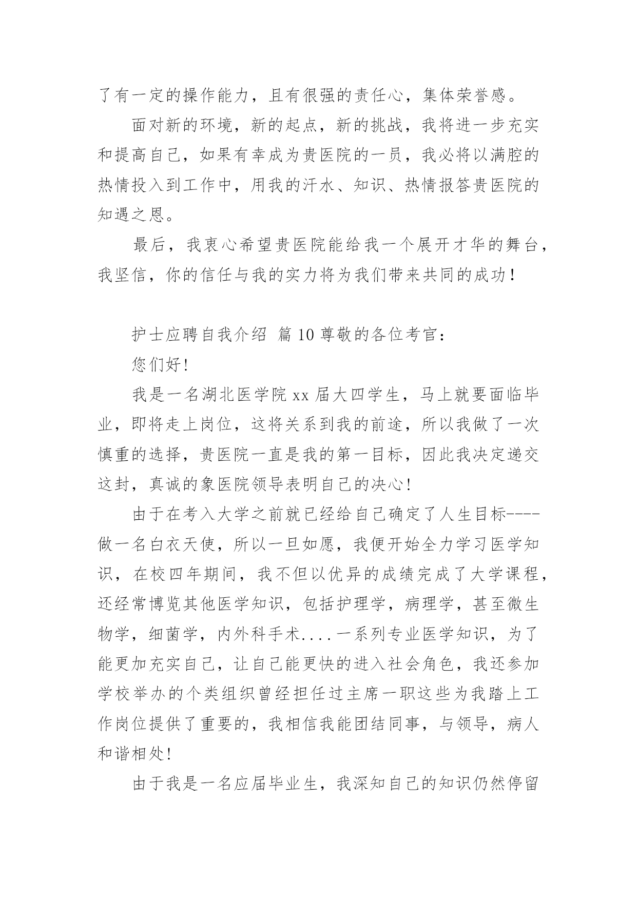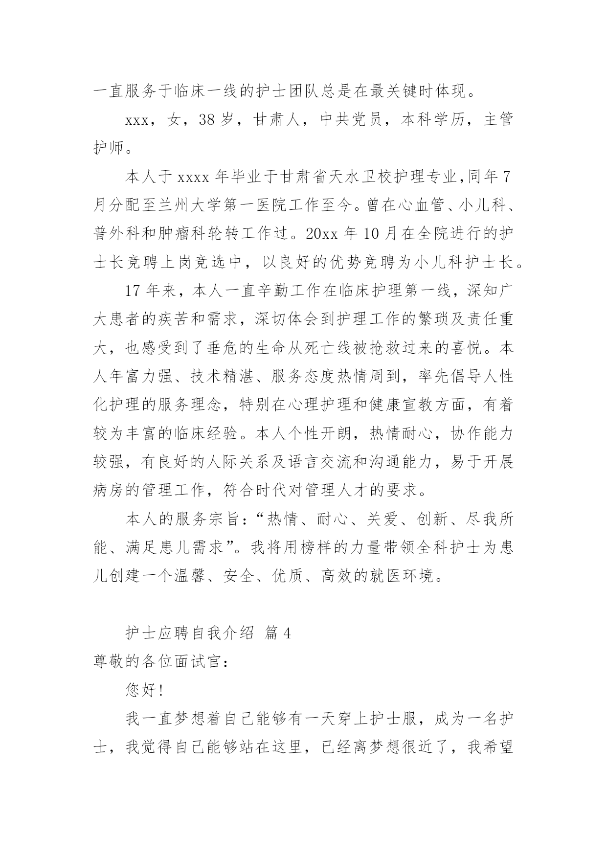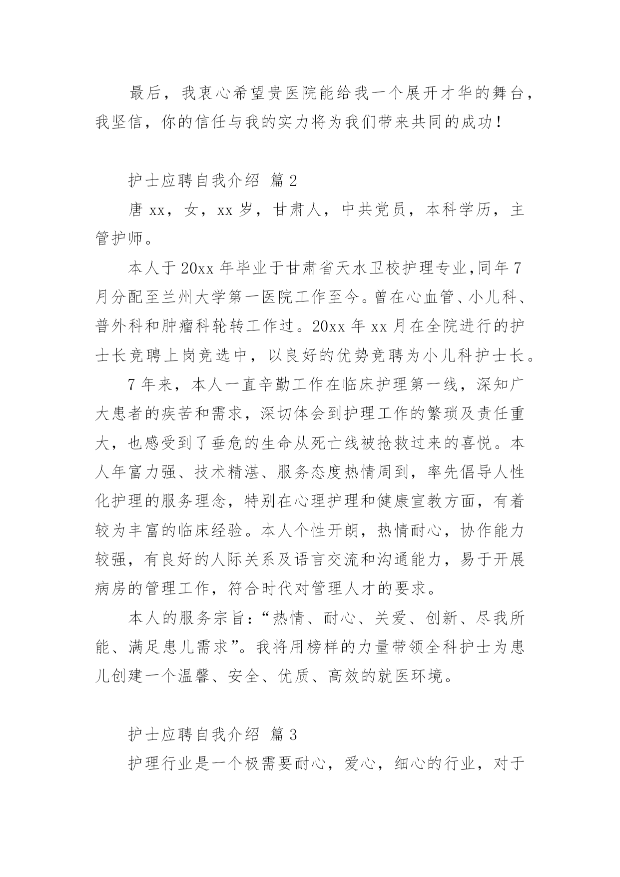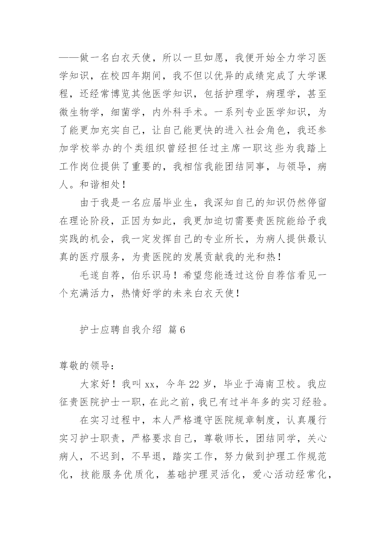 护士应聘自我介绍当进入一个陌生环境,时常需要用到自我介绍,自我介绍是结识新朋友的重要手段。相信许多人会觉得自我介绍很难写吧,以下是小编为大家整理的护士应聘自我介绍,欢迎大家分享。护士应聘自我介绍篇1您好!非常荣幸能有机会参加贵医院的招聘面试。感谢贵医院领导给我这个机会。我叫***,是**卫校护理专业的毕业生。为了心中的理想,探索生活的真谛,凭者对知识的渴望,人生的追求,我孜孜不倦,不骄不馁,终于迎来了新的起点。光阴似箭,在3年的院校生活中,我对护理事业怀有很高的热情,坚持以学为主,取得良好的成绩,且在其他各方面表现良好,被评为“优秀团员”、获的区级三好学生的荣誉,有计算机一级证书等。通过在校的理论学习和实践学习,我掌握了有一定的操作能力,且有很强的责任心,集体荣誉感。面对新的环境,新的起点,新的挑战,我将进一步充实和提高自己,如果有幸成为贵医院的一员,我必将以满腔的热情投入到工作中,用我的汗水、知识、热情报答贵医院的知遇之恩。最后,我衷心希望贵医院能给我一个展开才华的舞台,我坚信,你的信任与我的实力将为我们带来共同的成功!护士应聘自我介绍篇2唐xx,女,xx岁,甘肃人,中共党员,本科学历,主管护师。本人于20xx年毕业于甘肃省天水卫校护理专业,同年7月分配至兰州大学第一医院工作至今。曾在心血管、小儿科、普外科和肿瘤科轮转工作过。20xx年xx月在全院进行的护士长竞聘上岗竞选中,以良好的优势竞聘为小儿科护士长。7年来,本人一直辛勤工作在临床护理第一线,深知广大患者的疾苦和需求,深切体会到护理工作的繁琐及责任重大,也感受到了垂危的生命从死亡线被抢救过来的喜悦。本人年富力强、技术精湛、服务态度热情周到,率先倡导人性化护理的服务理念,特别在心理护理和健康宣教方面,有着较为丰富的临床经验。本人个性开朗,热情耐心,协作能力较强,有良好的人际关系及语言交流和沟通能力,易于开展病房的管理工作,符合时代对管理人才的要求。本人的服务宗旨:“热情、耐心、关爱、创新、尽我所能、满足患儿需求”。我将用榜样的力量带领全科护士为患儿创建一个温馨、安全、优质、高效的就医环境。护士应聘自我介绍篇3护理行业是一个极需要耐心,爱心,细心的行业,对于一直服务于临床一线的护士团队总是在最关键时体现。xxx,女,38岁,甘肃人,中共党员,本科学历,主管护师。本人于xxxx年毕业于甘肃省天水卫校护理专业,同年7月分配至兰州大学第一医院工作至今。曾在心血管、小儿科、普外科和肿瘤科轮转工作过。20xx年10月在全院进行的护士长竞聘上岗竞选中,以良好的优势竞聘为小儿科护士长。17年来,本人一直辛勤工作在临床护理第一线,深知广大患者的疾苦和需求,深切体会到护理工作的繁琐及责任重大,也感受到了垂危的生命从死亡线被抢救过来的喜悦。本人年富力强、技术精湛、服务态度热情周到,率先倡导人性化护理的服务理念,特别在心理护理和健康宣教方面,有着较为丰富的临床经验。本人个性开朗,热情耐心,协作能力较强,有良好的人际关系及语言交流和沟通能力,易于开展病房的管理工作,符合时代对管理人才的要求。本人的服务宗旨:“热情、耐心、关爱、创新、尽我所能、满足患儿需求”。我将用榜样的力量带领全科护士为患儿创建一个温馨、安全、优质、高效的就医环境。护士应聘自我介绍篇4尊敬的各位面试官:您好!我一直梦想着自己能够有一天穿上护士服,成为一名护士,我觉得自己能够站在这里,已经离梦想很近了,我希望自己能有这个机会成为你贵医院的医院,我一定努力工作的。我叫xx,是通辽职业学院高护专业的毕业生。为了心中的理想,探索生活的真谛,凭者对知识的渴望,人生的追求,我孜孜不倦,不骄不馁,终于迎来了新的起点。光阴似箭,在3年的院校生活中,我对护理事业怀有很高的热情,坚持以学为主,取得良好的成绩,且在其他各方面表现良好,被评为“优秀团员”、获的区级三好学生的荣誉,有计算机二级证.通过在校的理论学习和实践学习,我掌握了有一定的`操作能力,且有很强的责任心,集体荣誉感。面对新的环境,新的起点,新的挑战,我将进一步充实和提高自己,如果有幸成为贵医院的一员,我必将以满腔的热情投入到工作中,用我的汗水、知识、热情报答贵医院的知遇之恩。最后,我衷心希望贵医院能给我一个展开才华的舞台,我坚信,你的信任与我的实力将为我们带来共同的成功!护士应聘自我介绍篇5尊敬的各位考官:您好!我是一名湖北医学院XX届大四学生,马上就要面临毕业,即将走上岗位,这将关系到我的前途,所以我做了一次慎重的选择,贵医院一直是我的第一目标,因此我决定递交这封,真诚的象医院领导表明自己的决心!由于在考入大学之前就已经给自己确定了人生目标——做一名白衣天使,所以一旦如愿,我便开始全力学习医学知识,在校四年期间,我不但以优异的成绩完成了大学课程,还经常博览其他医学知识,包括护理学,病