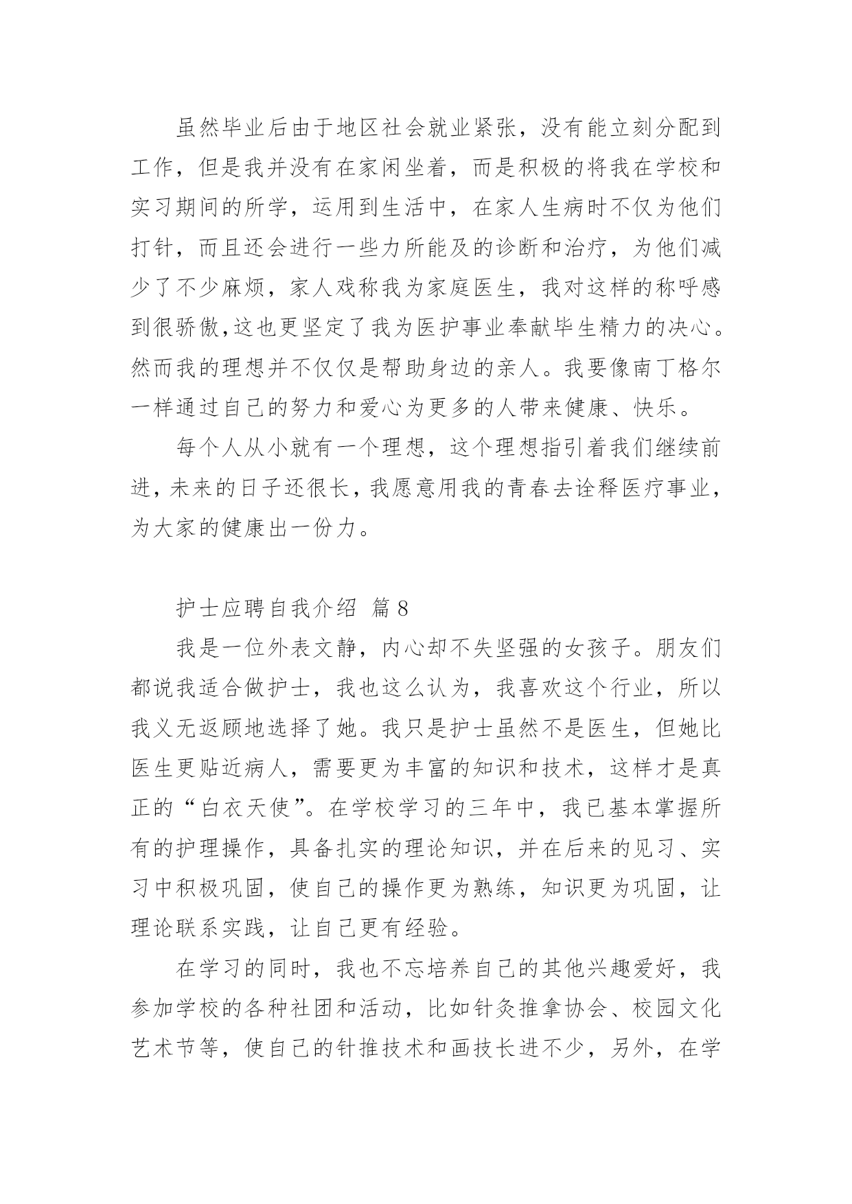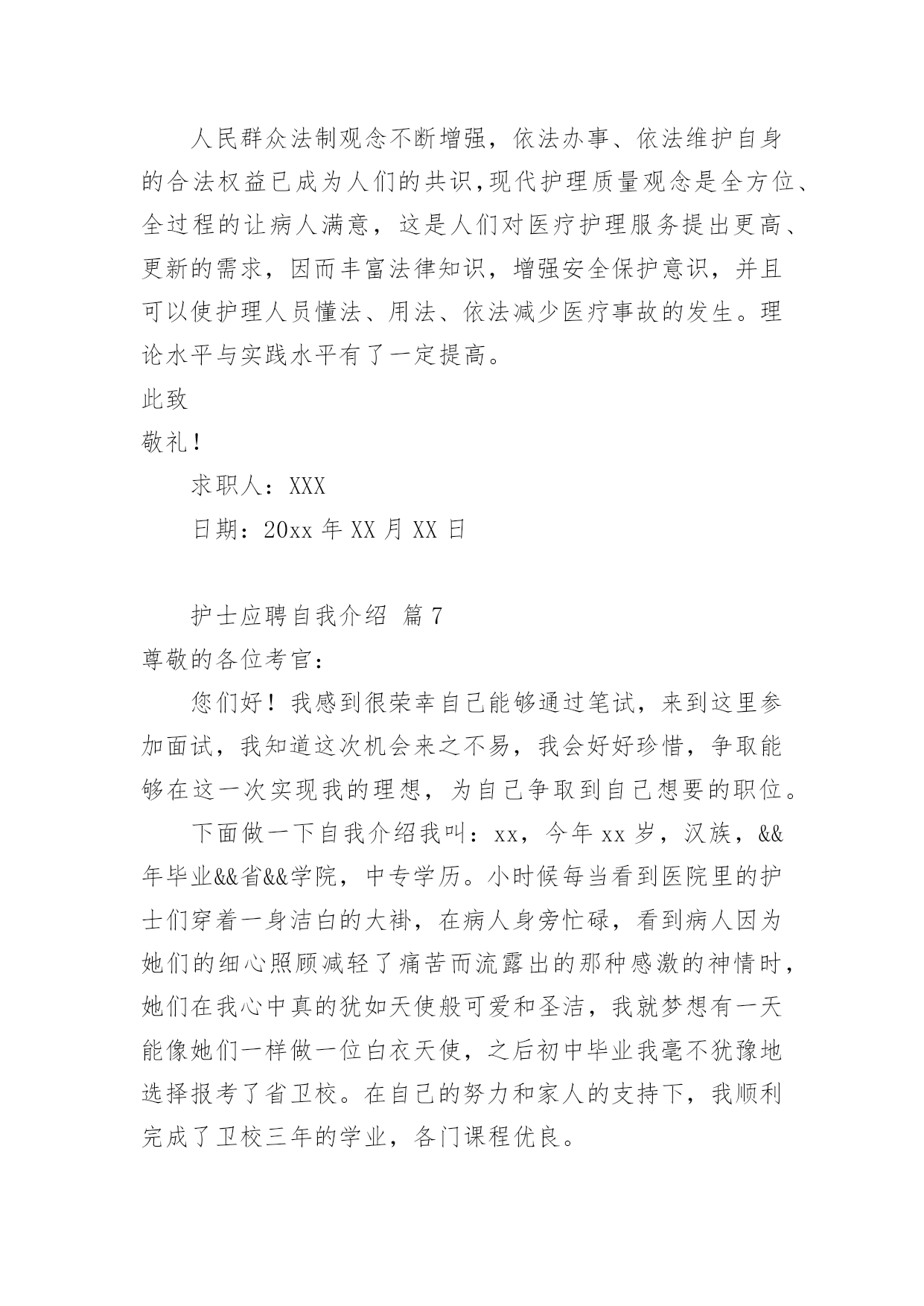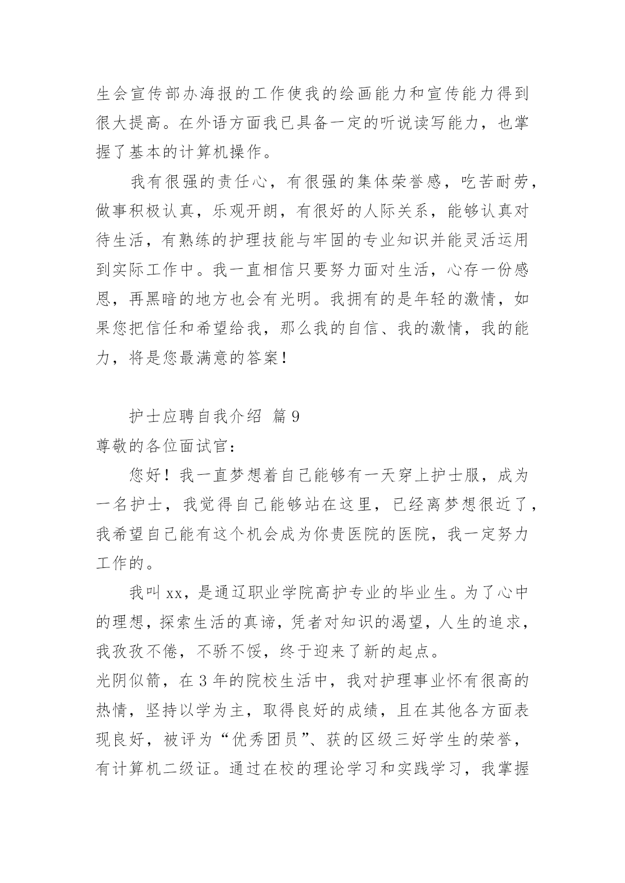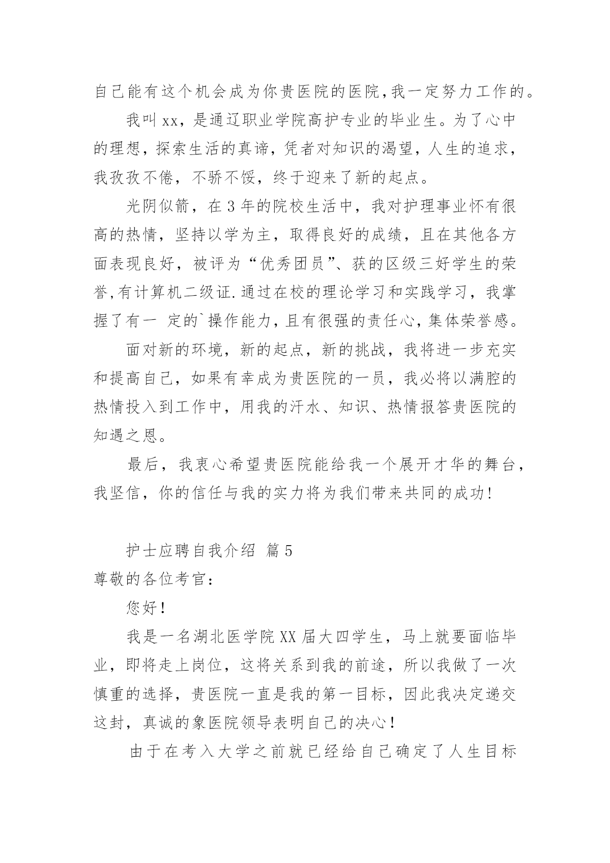 护士应聘自我介绍当进入一个陌生环境,时常需要用到自我介绍,自我介绍是结识新朋友的重要手段。相信许多人会觉得自我介绍很难写吧,以下是小编为大家整理的护士应聘自我介绍,欢迎大家分享。护士应聘自我介绍篇1您好!非常荣幸能有机会参加贵医院的招聘面试。感谢贵医院领导给我这个机会。我叫***,是**卫校护理专业的毕业生。为了心中的理想,探索生活的真谛,凭者对知识的渴望,人生的追求,我孜孜不倦,不骄不馁,终于迎来了新的起点。光阴似箭,在3年的院校生活中,我对护理事业怀有很高的热情,坚持以学为主,取得良好的成绩,且在其他各方面表现良好,被评为“优秀团员”、获的区级三好学生的荣誉,有计算机一级证书等。通过在校的理论学习和实践学习,我掌握了有一定的操作能力,且有很强的责任心,集体荣誉感。面对新的环境,新的起点,新的挑战,我将进一步充实和提高自己,如果有幸成为贵医院的一员,我必将以满腔的热情投入到工作中,用我的汗水、知识、热情报答贵医院的知遇之恩。最后,我衷心希望贵医院能给我一个展开才华的舞台,我坚信,你的信任与我的实力将为我们带来共同的成功!护士应聘自我介绍篇2唐xx,女,xx岁,甘肃人,中共党员,本科学历,主管护师。本人于20xx年毕业于甘肃省天水卫校护理专业,同年7月分配至兰州大学第一医院工作至今。曾在心血管、小儿科、普外科和肿瘤科轮转工作过。20xx年xx月在全院进行的护士长竞聘上岗竞选中,以良好的优势竞聘为小儿科护士长。7年来,本人一直辛勤工作在临床护理第一线,深知广大患者的疾苦和需求,深切体会到护理工作的繁琐及责任重大,也感受到了垂危的生命从死亡线被抢救过来的喜悦。本人年富力强、技术精湛、服务态度热情周到,率先倡导人性化护理的服务理念,特别在心理护理和健康宣教方面,有着较为丰富的临床经验。本人个性开朗,热情耐心,协作能力较强,有良好的人际关系及语言交流和沟通能力,易于开展病房的管理工作,符合时代对管理人才的要求。本人的服务宗旨:“热情、耐心、关爱、创新、尽我所能、满足患儿需求”。我将用榜样的力量带领全科护士为患儿创建一个温馨、安全、优质、高效的就医环境。护士应聘自我介绍篇3护理行业是一个极需要耐心,爱心,细心的行业,对于一直服务于临床一线的护士团队总是在最关键时体现。xxx,女,38岁,甘肃人,中共党员,本科学历,主管护师。本人于xxxx年毕业于甘肃省天水卫校护理专业,同年7月分配至兰州大学第一医院工作至今。曾在心血管、小儿科、普外科和肿瘤科轮转工作过。20xx年10月在全院进行的护士长竞聘上岗竞选中,以良好的优势竞聘为小儿科护士长。17年来,本人一直辛勤工作在临床护理第一线,深知广大患者的疾苦和需求,深切体会到护理工作的繁琐及责任重大,也感受到了垂危的生命从死亡线被抢救过来的喜悦。本人年富力强、技术精湛、服务态度热情周到,率先倡导人性化护理的服务理念,特别在心理护理和健康宣教方面,有着较为丰富的临床经验。本人个性开朗,热情耐心,协作能力较强,有良好的人际关系及语言交流和沟通能力,易于开展病房的管理工作,符合时代对管理人才的要求。本人的服务宗旨:“热情、耐心、关爱、创新、尽我所能、满足患儿需求”。我将用榜样的力量带领全科护士为患儿创建一个温馨、安全、优质、高效的就医环境。护士应聘自我介绍篇4尊敬的各位面试官:您好!我一直梦想着自己能够有一天穿上护士服,成为一名护士,我觉得自己能够站在这里,已经离梦想很近了,我希望自己能有这个机会成为你贵医院的医院,我一定努力工作的。我叫xx,是通辽职业学院高护专业的毕业生。为了心中的理想,探索生活的真谛,凭者对知识的渴望,人生的追求,我孜孜不倦,不骄不馁,终于迎来了新的起点。光阴似箭,在3年的院校生活中,我对护理事业怀有很高的热情,坚持以学为主,取得良好的成绩,且在其他各方面表现良好,被评为“优秀团员”、获的区级三好学生的荣誉,有计算机二级证.通过在校的理论学习和实践学习,我掌握了有一定的`操作能力,且有很强的责任心,集体荣誉感。面对新的环境,新的起点,新的挑战,我将进一步充实和提高自己,如果有幸成为贵医院的一员,我必将以满腔的热情投入到工作中,用我的汗水、知识、热情报答贵医院的知遇之恩。最后,我衷心希望贵医院能给我一个展开才华的舞台,我坚信,你的信任与我的实力将为我们带来共同的成功!护士应聘自我介绍篇5尊敬的各位考官:您好!我是一名湖北医学院XX届大四学生,马上就要面临毕业,即将走上岗位,这将关系到我的前途,所以我做了一次慎重的选择,贵医院一直是我的第一目标,因此我决定递交这封,真诚的象医院领导表明自己的决心!由于在考入大学之前就已经给自己确定了人生目标——做一名白衣天使,所以一旦如愿,我便开始全力学习医学知识,在校四年期间,我不但以优异的成绩完成了大学课程,还经常博览其他医学知识,包括护理学,病