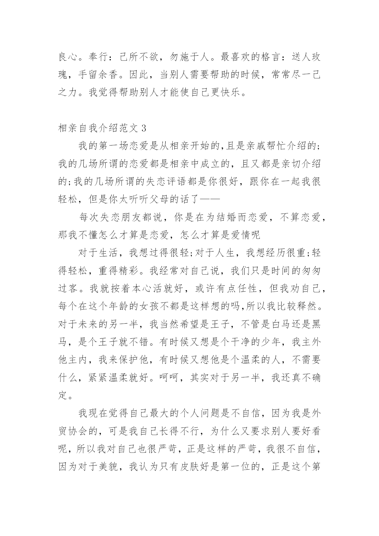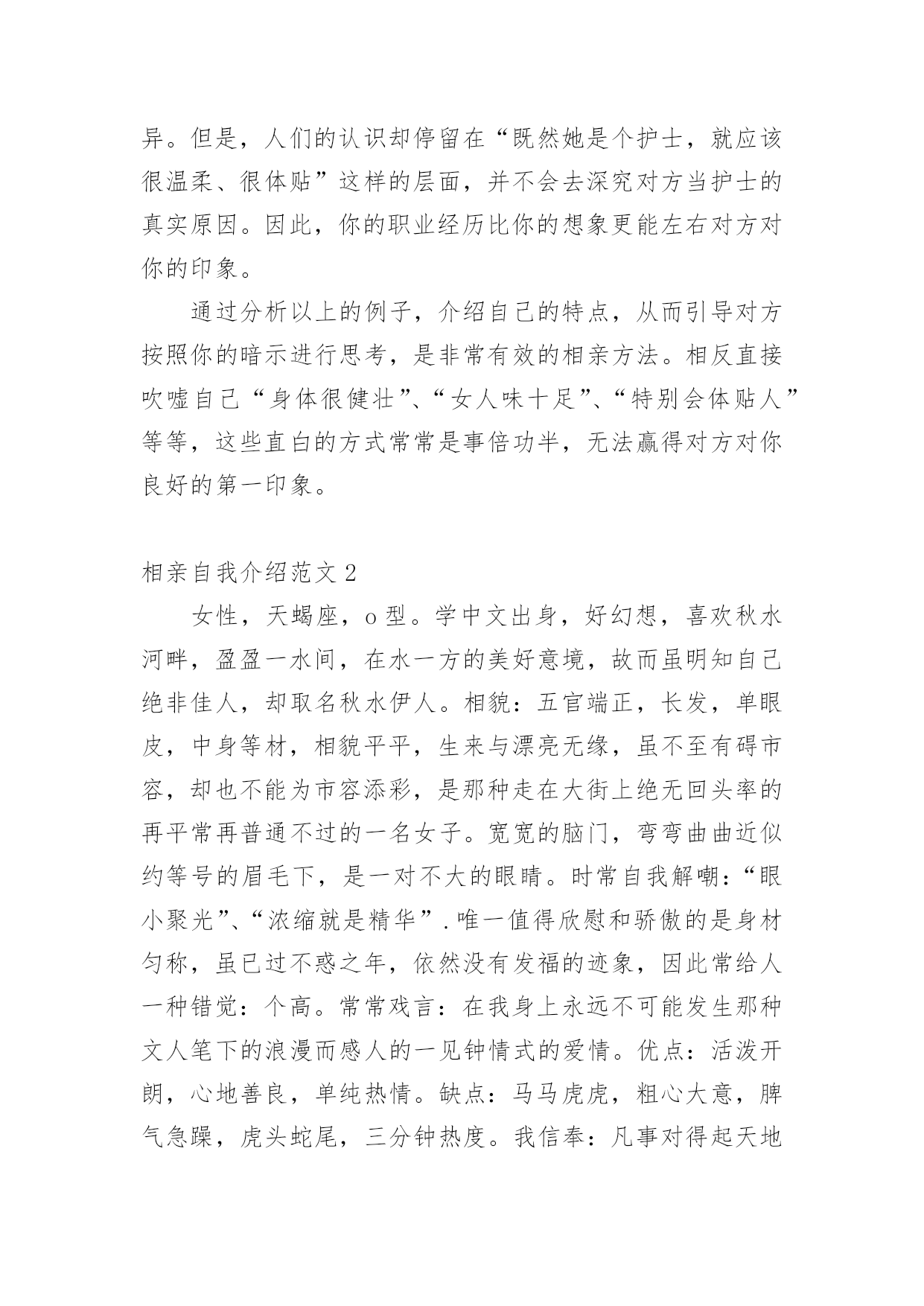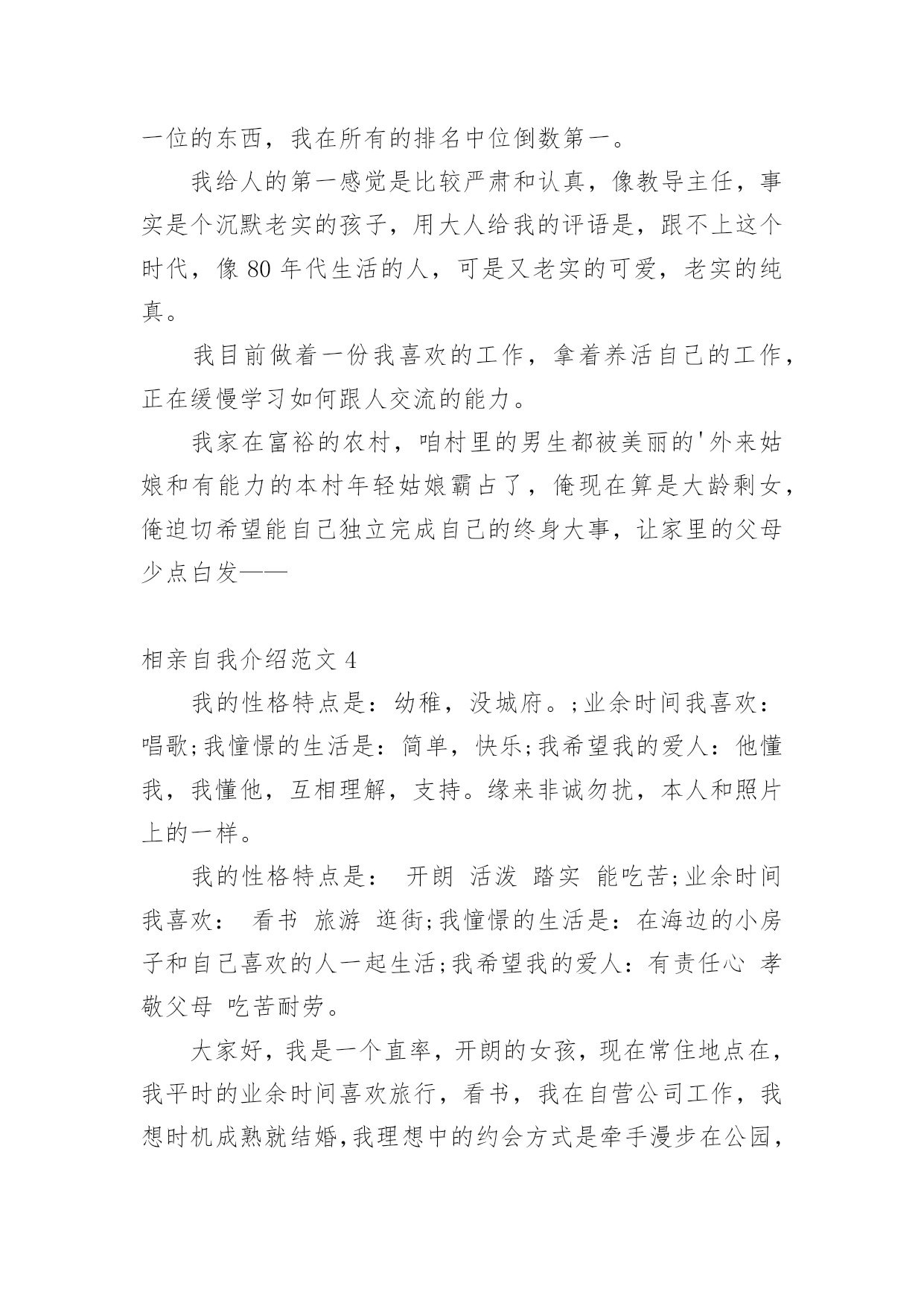 相亲自我介绍相亲自我介绍范文相亲自我介绍范文1随着社会节奏的加快,不少青年男女都在为工作而忙碌着,很少有机会碰见合适的恋爱对像,这时相亲就成了热门话题,担很多人不知道相亲如何介绍自己,不能把自己的内在素质有效地表达出来,两性的接近最首要的是第一印象,第一印象的好与坏直接决定了两个人的亲密关系的建立。那么我们该如何介绍自己呢?“我喜欢插花。”(突出自己女性化的一面)“我练过跆拳道。”(突出自己的健壮和勇猛)“我的拿手好戏是做水煮鱼。”(突出自己的生活能力强)通过介绍自己的特点,宣传自己的优势,引导对方按照你提供的暗示进行思考,就会提高自己的成功率。小张新结识了一个女朋友,是护士,他每次介绍自己的女友之后,同事和朋友们总会很羡慕他。因为一般社会上都认为护士是“照顾病人的温柔女性”、“吃苦耐劳”、“懂得照顾人、体贴人”等等,这些印象都深入人心,因此,人们自然而然地认为“既然她当了护士,就一定会温柔细心”。其实,仔细想想具体说做护士的原因,每个护士都有自己的理由,既有真心愿意照顾他人、具有奉献精神的,也有出于经济考虑,或者通过护士可以找个好伴侣的,许多理由因人而异。但是,人们的认识却停留在“既然她是个护士,就应该很温柔、很体贴”这样的层面,并不会去深究对方当护士的真实原因。因此,你的职业经历比你的想象更能左右对方对你的印象。通过分析以上的例子,介绍自己的特点,从而引导对方按照你的暗示进行思考,是非常有效的相亲方法。相反直接吹嘘自己“身体很健壮”、“女人味十足”、“特别会体贴人”等等,这些直白的方式常常是事倍功半,无法赢得对方对你良好的第一印象。相亲自我介绍范文2女性,天蝎座,o型。学中文出身,好幻想,喜欢秋水河畔,盈盈一水间,在水一方的美好意境,故而虽明知自己绝非佳人,却取名秋水伊人。相貌:五官端正,长发,单眼皮,中身等材,相貌平平,生来与漂亮无缘,虽不至有碍市容,却也不能为市容添彩,是那种走在大街上绝无回头率的再平常再普通不过的一名女子。宽宽的脑门,弯弯曲曲近似约等号的眉毛下,是一对不大的眼睛。时常自我解嘲:“眼小聚光”、“浓缩就是精华”.唯一值得欣慰和骄傲的是身材匀称,虽已过不惑之年,依然没有发福的迹象,因此常给人一种错觉:个高。常常戏言:在我身上永远不可能发生那种文人笔下的浪漫而感人的一见钟情式的爱情。优点:活泼开朗,心地善良,单纯热情。缺点:马马虎虎,粗心大意,脾气急躁,虎头蛇尾,三分钟热度。我信奉:凡事对得起天地良心。奉行:己所不欲,勿施于人。最喜欢的格言:送人玫瑰,手留余香。因此,当别人需要帮助的时候,常常尽一己之力。我觉得帮助别人才能使自己更快乐。相亲自我介绍范文3我的第一场恋爱是从相亲开始的,且是亲戚帮忙介绍的;我的几场所谓的恋爱都是相亲中成立的,且又都是亲切介绍的;我的几场所谓的失恋评语都是你很好,跟你在一起我很轻松,但是你太听听父母的话了——每次失恋朋友都说,你是在为结婚而恋爱,不算恋爱,那我不懂怎么才算是恋爱,怎么才算是爱情呢对于生活,我想过得很轻;对于人生,我想经历很重;轻得轻松,重得精彩。我经常对自己说,我们只是时间的匆匆过客。我就按着本心活就好,或许有点任性,但我劝自己,每个在这个年龄的女孩不都是这样想的吗,所以我比较释然。对于未来的另一半,我当然希望是王子,不管是白马还是黑马,是个王子就不错。有时候又想是个干净的少年,我主外他主内,我来保护他,有时候又想他是个温柔的人,不需要什么,紧紧温柔就好。呵呵,其实对于另一半,我还真不确定。我现在觉得自己最大的个人问题是不自信,因为我是外贸协会的,可是我自己长得不行,为什么又要求别人要好看呢,所以我对自己也很严苛,正是这样的严苛,我很不自信,因为对于美貌,我认为只有皮肤好是第一位的,正是这个第一位的东西,我在所有的排名中位倒数第一。我给人的第一感觉是比较严肃和认真,像教导主任,事实是个沉默老实的孩子,用大人给我的评语是,跟不上这个时代,像80年代生活的人,可是又老实的可爱,老实的纯真。我目前做着一份我喜欢的工作,拿着养活自己的工作,正在缓慢学习如何跟人交流的能力。我家在富裕的农村,咱村里的男生都被美丽的'外来姑娘和有能力的本村年轻姑娘霸占了,俺现在算是大龄剩女,俺迫切希望能自己独立完成自己的终身大事,让家里的父母少点白发——相亲自我介绍范文4我的性格特点是:幼稚,没城府。;业余时间我喜欢:唱歌;我憧憬的生活是:简单,快乐;我希望我的爱人:他懂我,我懂他,互相理解,支持。缘来非诚勿扰,本人和照片上的一样。我的性格特点是:开朗活泼踏实能吃苦;业余时间我喜欢:看书旅游逛街;我憧憬的生活是:在海边的小房子和自己喜欢的人一起生活;我希望我的爱人:有责任心孝敬父母吃苦耐劳。大家好,我是一个直率,开朗的女孩,现在常住地点在,我平时的业余时间喜欢旅行,看书,我在自营公司工作,我