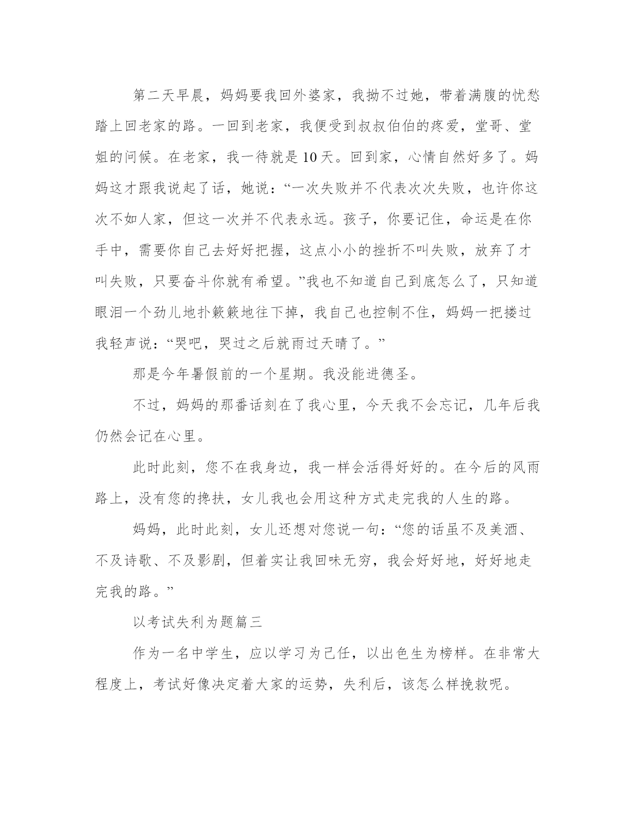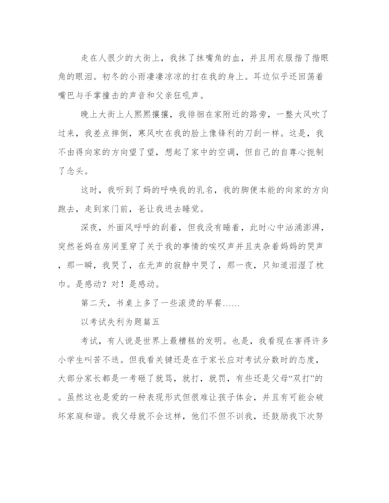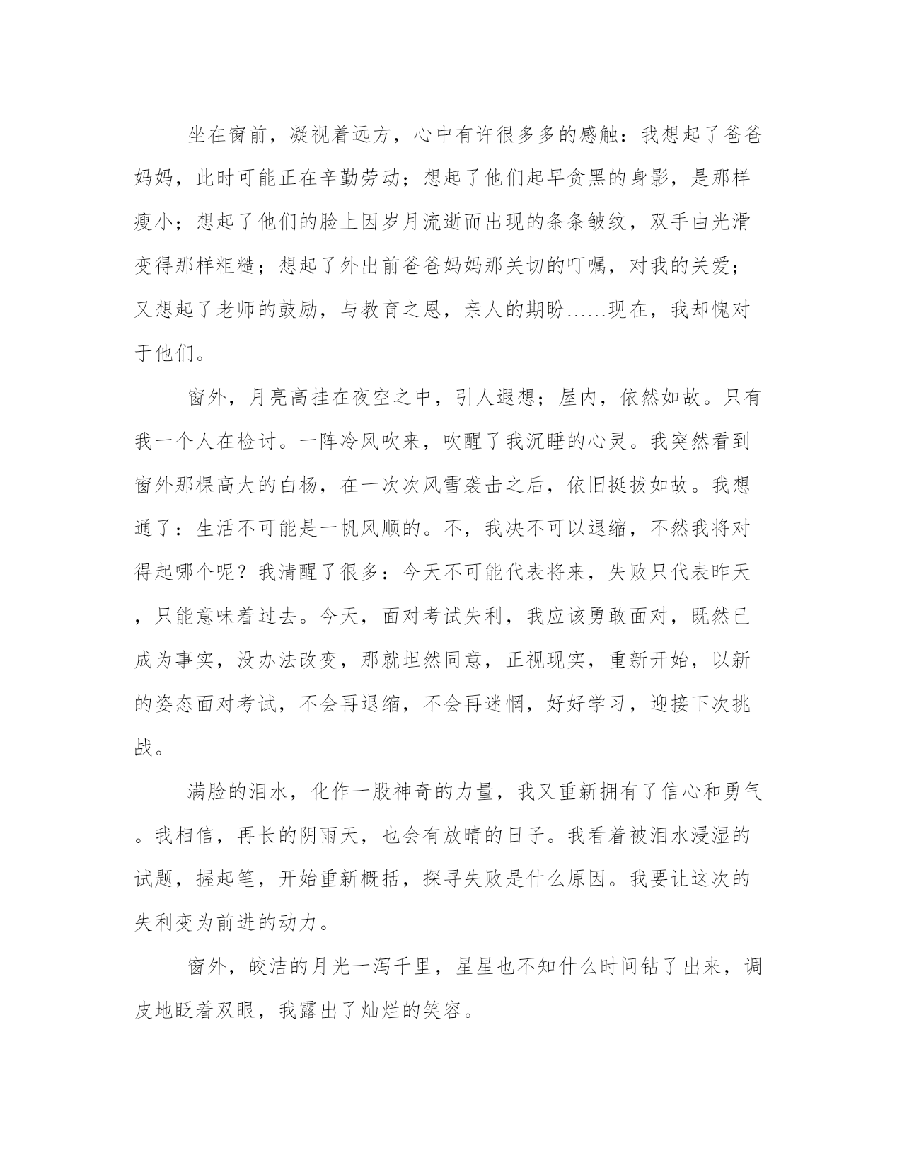 2023年以考试失利为题考试失利心得体会(汇总12篇)人的记忆力会随着岁月的流逝而衰退,写作可以弥补记忆的不足,将曾经的人生经历和感悟记录下来,也便于保存一份美好的回忆。大家想知道怎么样才能写一篇比较优质的范文吗?这里我整理了一些优秀的范文,希望对大家有所帮助,下面我们就来了解一下吧。以考试失利为题篇一近几天,我一直苦于考试失利。虽然我花了很多时间来准备考试,但考出的成绩却显然不能令我满意。在这个过程中,我经历了许多挫折和挑战。但这种经历令我获益良多,我能够学到很多心得和体会。第二段首先,我学会了如何制定有效的学习策略。在考试失利之前,我往往采取随意涂抹的方法来完成测试。但我意识到只有在做好了充分的准备之后,才能够更成功。因此,我现在会更系统地准备每个考试,从学习资料到复习提纲的制定,都会认真考虑。第三段其次,我学会了接受失败并坚持不懈。虽然我对自己的考试成绩感到失望,但我明白,失败并不意味着结束。相反,它是一个机会,让我了解自己的不足之处,并在以后的努力中不断改进。我学会了努力工作,不断尝试,直到获得成功为止。第四段此外,我也学会了如何从经历中吸取教训。经常失败会教会我们很多东西。它教会我们如何避免同样的错误,在下一次考试中更好地表现。而最重要的是,它教会我们反思和自我改进的重要性,这是今后不论在什么领域都需要掌握的技能。第五段总之,在考试失利的经历中,我学会了很多东西。我学会了制定有效的学习策略、接受失败并坚持不懈、从经历中吸取教训等等。通过这些心得和体会,我相信我将能够更好地处理类似的挑战,从而在未来获得更大的成功。以考试失利为题篇二秋风萧瑟,我独自徘徊在回家的路上。秋风扫起一地的落叶与灰尘,劈头盖脸地朝你涌来,路两旁的树枝被抽打得摇摆不定。小草更是惶恐不安,它们褪去一身的绿色,换上枯黄的轻纱。我怀着一颗坪抨直跳的心叩响了家门,迎接我的是一张亲切地不能再亲切的面孔,我不敢抬头去看,因为我觉得自己没有资格去看,我觉得自己愧对这张笑脸。我闷声不响地走进屋子,默默写起了作业,妈妈悄悄走过来,轻声对我说:“吃饭了。”我放下笔,走出房间,妈妈好像看出了什么,轻声问我:“是不是考试考砸了?”我没说什么,愣在那儿,她又说:“快,吃完饭我们去走走。”“我不想去了,您自个儿去吧!”我随便扒了两口饭,又回房间了。第二天早晨,妈妈要我回外婆家,我拗不过她,带着满腹的忧愁踏上回老家的路。一回到老家,我便受到叔叔伯伯的疼爱,堂哥、堂姐的问候。在老家,我一待就是10天。回到家,心情自然好多了。妈妈这才跟我说起了话,她说:“一次失败并不代表次次失败,也许你这次不如人家,但这一次并不代表永远。孩子,你要记住,命运是在你手中,需要你自己去好好把握,这点小小的挫折不叫失败,放弃了才叫失败,只要奋斗你就有希望。”我也不知道自己到底怎么了,只知道眼泪一个劲儿地扑簌簌地往下掉,我自己也控制不住,妈妈一把搂过我轻声说:“哭吧,哭过之后就雨过天晴了。”那是今年暑假前的一个星期。我没能进德圣。不过,妈妈的那番话刻在了我心里,今天我不会忘记,几年后我仍然会记在心里。此时此刻,您不在我身边,我一样会活得好好的。在今后的风雨路上,没有您的搀扶,女儿我也会用这种方式走完我的人生的路。妈妈,此时此刻,女儿还想对您说一句:“您的话虽不及美酒、不及诗歌、不及影剧,但着实让我回味无穷,我会好好地,好好地走完我的路。”以考试失利为题篇三作为一名中学生,应以学习为己任,以出色生为榜样。在非常大程度上,考试好像决定着大家的运势,失利后,该怎么样挽救呢。坐在窗前,凝视着远方,心中有许很多多的感触:我想起了爸爸妈妈,此时可能正在辛勤劳动;想起了他们起早贪黑的身影,是那样瘦小;想起了他们的脸上因岁月流逝而出现的条条皱纹,双手由光滑变得那样粗糙;想起了外出前爸爸妈妈那关切的叮嘱,对我的关爱;又想起了老师的鼓励,与教育之恩,亲人的期盼……现在,我却愧对于他们。窗外,月亮高挂在夜空之中,引人遐想;屋内,依然如故。只有我一个人在检讨。一阵冷风吹来,吹醒了我沉睡的心灵。我突然看到窗外那棵高大的白杨,在一次次风雪袭击之后,依旧挺拔如故。我想通了:生活不可能是一帆风顺的。不,我决不可以退缩,不然我将对得起哪个呢?我清醒了很多:今天不可能代表将来,失败只代表昨天,只能意味着过去。今天,面对考试失利,我应该勇敢面对,既然已成为事实,没办法改变,那就坦然同意,正视现实,重新开始,以新的姿态面对考试,不会再退缩,不会再迷惘,好好学习,迎接下次挑战。满脸的泪水,化作一股神奇的力量,我又重新拥有了信心和勇气。我相信,再长的阴雨天,也会有放晴的日子。我看着被泪水浸湿的试题,握起笔,开始重新概括,探寻失败是什么原因。我要让这次的失利变为前进的动力。窗外,皎洁的月光一泻千里,