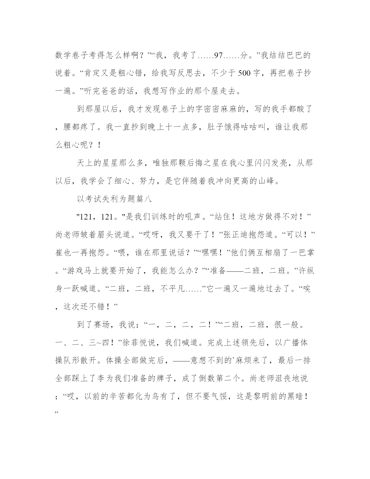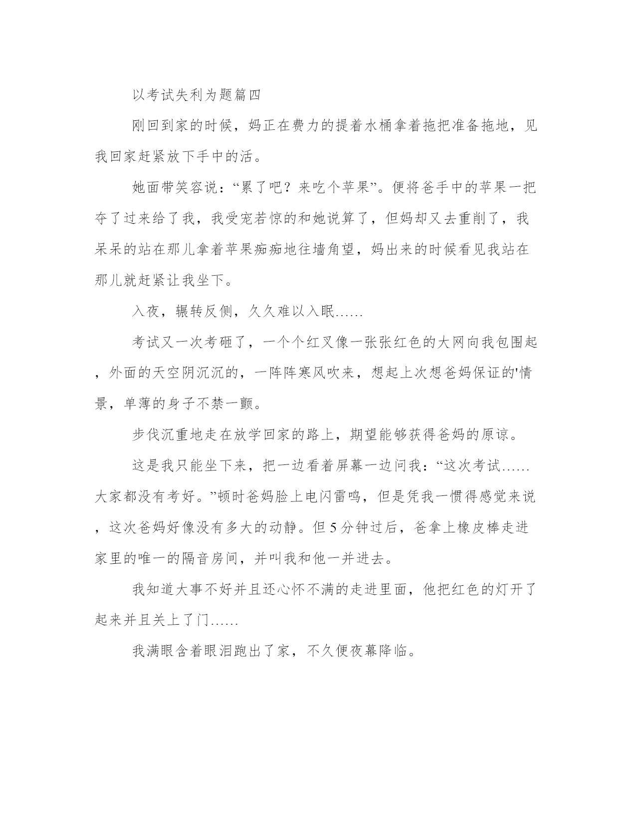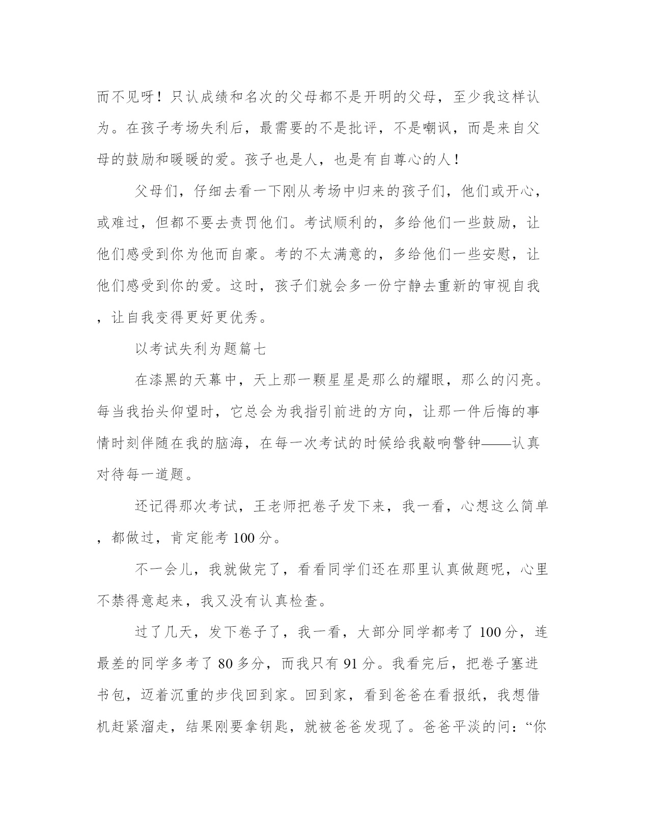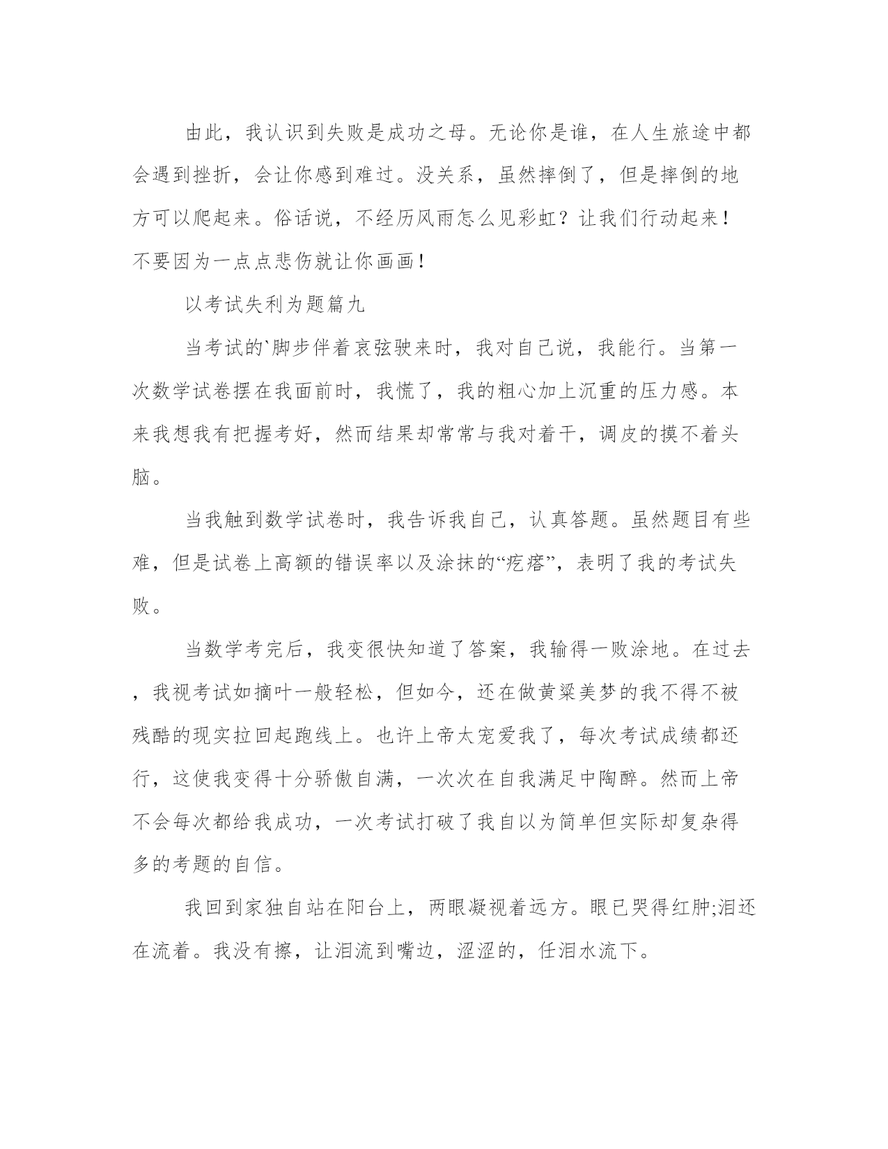 2023年以考试失利为题考试失利心得体会(汇总12篇)人的记忆力会随着岁月的流逝而衰退,写作可以弥补记忆的不足,将曾经的人生经历和感悟记录下来,也便于保存一份美好的回忆。大家想知道怎么样才能写一篇比较优质的范文吗?这里我整理了一些优秀的范文,希望对大家有所帮助,下面我们就来了解一下吧。以考试失利为题篇一近几天,我一直苦于考试失利。虽然我花了很多时间来准备考试,但考出的成绩却显然不能令我满意。在这个过程中,我经历了许多挫折和挑战。但这种经历令我获益良多,我能够学到很多心得和体会。第二段首先,我学会了如何制定有效的学习策略。在考试失利之前,我往往采取随意涂抹的方法来完成测试。但我意识到只有在做好了充分的准备之后,才能够更成功。因此,我现在会更系统地准备每个考试,从学习资料到复习提纲的制定,都会认真考虑。第三段其次,我学会了接受失败并坚持不懈。虽然我对自己的考试成绩感到失望,但我明白,失败并不意味着结束。相反,它是一个机会,让我了解自己的不足之处,并在以后的努力中不断改进。我学会了努力工作,不断尝试,直到获得成功为止。第四段此外,我也学会了如何从经历中吸取教训。经常失败会教会我们很多东西。它教会我们如何避免同样的错误,在下一次考试中更好地表现。而最重要的是,它教会我们反思和自我改进的重要性,这是今后不论在什么领域都需要掌握的技能。第五段总之,在考试失利的经历中,我学会了很多东西。我学会了制定有效的学习策略、接受失败并坚持不懈、从经历中吸取教训等等。通过这些心得和体会,我相信我将能够更好地处理类似的挑战,从而在未来获得更大的成功。以考试失利为题篇二秋风萧瑟,我独自徘徊在回家的路上。秋风扫起一地的落叶与灰尘,劈头盖脸地朝你涌来,路两旁的树枝被抽打得摇摆不定。小草更是惶恐不安,它们褪去一身的绿色,换上枯黄的轻纱。我怀着一颗坪抨直跳的心叩响了家门,迎接我的是一张亲切地不能再亲切的面孔,我不敢抬头去看,因为我觉得自己没有资格去看,我觉得自己愧对这张笑脸。我闷声不响地走进屋子,默默写起了作业,妈妈悄悄走过来,轻声对我说:“吃饭了。”我放下笔,走出房间,妈妈好像看出了什么,轻声问我:“是不是考试考砸了?”我没说什么,愣在那儿,她又说:“快,吃完饭我们去走走。”“我不想去了,您自个儿去吧!”我随便扒了两口饭,又回房间了。第二天早晨,妈妈要我回外婆家,我拗不过她,带着满腹的忧愁踏上回老家的路。一回到老家,我便受到叔叔伯伯的疼爱,堂哥、堂姐的问候。在老家,我一待就是10天。回到家,心情自然好多了。妈妈这才跟我说起了话,她说:“一次失败并不代表次次失败,也许你这次不如人家,但这一次并不代表永远。孩子,你要记住,命运是在你手中,需要你自己去好好把握,这点小小的挫折不叫失败,放弃了才叫失败,只要奋斗你就有希望。”我也不知道自己到底怎么了,只知道眼泪一个劲儿地扑簌簌地往下掉,我自己也控制不住,妈妈一把搂过我轻声说:“哭吧,哭过之后就雨过天晴了。”那是今年暑假前的一个星期。我没能进德圣。不过,妈妈的那番话刻在了我心里,今天我不会忘记,几年后我仍然会记在心里。此时此刻,您不在我身边,我一样会活得好好的。在今后的风雨路上,没有您的搀扶,女儿我也会用这种方式走完我的人生的路。妈妈,此时此刻,女儿还想对您说一句:“您的话虽不及美酒、不及诗歌、不及影剧,但着实让我回味无穷,我会好好地,好好地走完我的路。”以考试失利为题篇三作为一名中学生,应以学习为己任,以出色生为榜样。在非常大程度上,考试好像决定着大家的运势,失利后,该怎么样挽救呢。坐在窗前,凝视着远方,心中有许很多多的感触:我想起了爸爸妈妈,此时可能正在辛勤劳动;想起了他们起早贪黑的身影,是那样瘦小;想起了他们的脸上因岁月流逝而出现的条条皱纹,双手由光滑变得那样粗糙;想起了外出前爸爸妈妈那关切的叮嘱,对我的关爱;又想起了老师的鼓励,与教育之恩,亲人的期盼……现在,我却愧对于他们。窗外,月亮高挂在夜空之中,引人遐想;屋内,依然如故。只有我一个人在检讨。一阵冷风吹来,吹醒了我沉睡的心灵。我突然看到窗外那棵高大的白杨,在一次次风雪袭击之后,依旧挺拔如故。我想通了:生活不可能是一帆风顺的。不,我决不可以退缩,不然我将对得起哪个呢?我清醒了很多:今天不可能代表将来,失败只代表昨天,只能意味着过去。今天,面对考试失利,我应该勇敢面对,既然已成为事实,没办法改变,那就坦然同意,正视现实,重新开始,以新的姿态面对考试,不会再退缩,不会再迷惘,好好学习,迎接下次挑战。满脸的泪水,化作一股神奇的力量,我又重新拥有了信心和勇气。我相信,再长的阴雨天,也会有放晴的日子。我看着被泪水浸湿的试题,握起笔,开始重新概括,探寻失败是什么原因。我要让这次的失利变为前进的动力。窗外,皎洁的月光一泻千里,