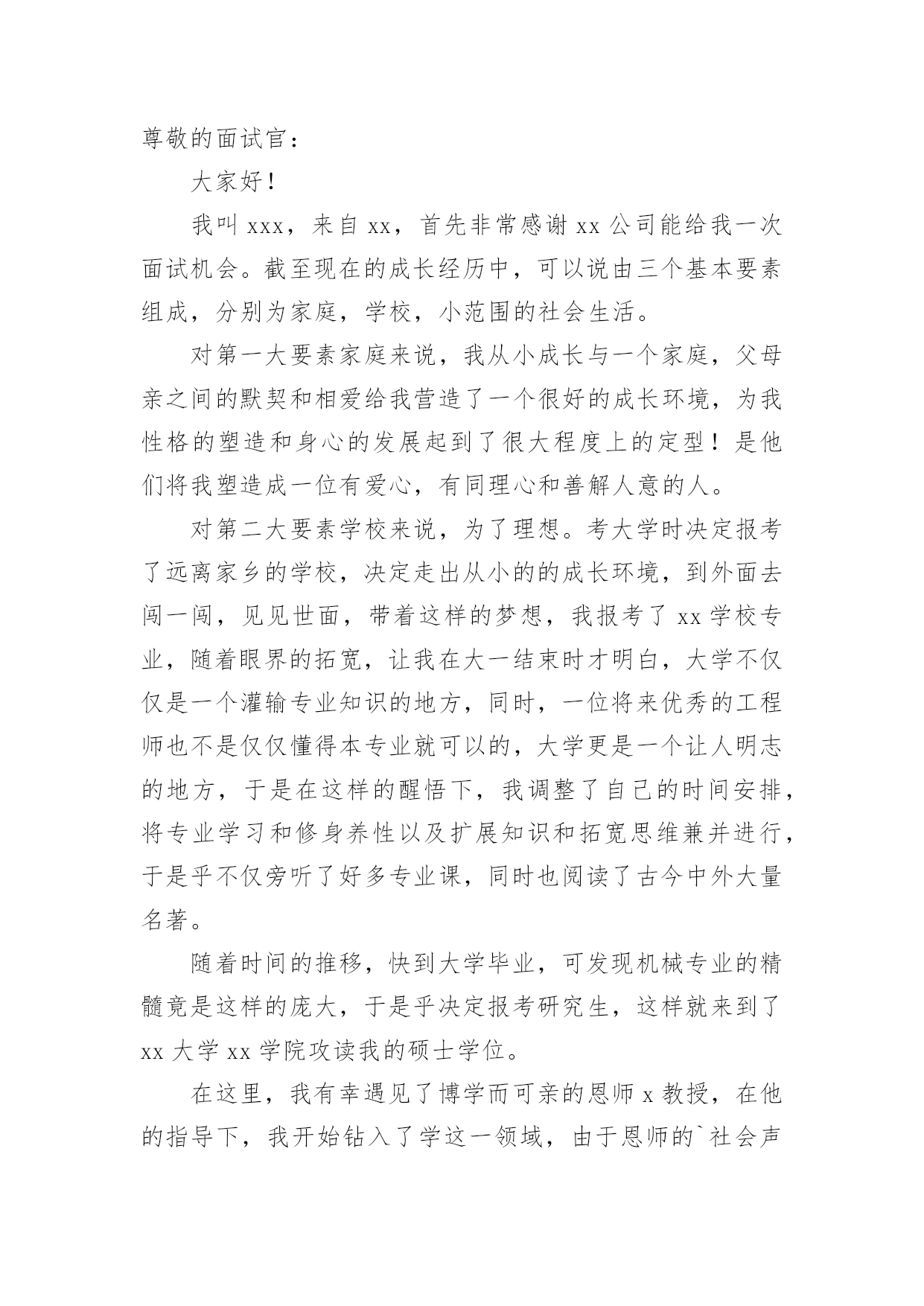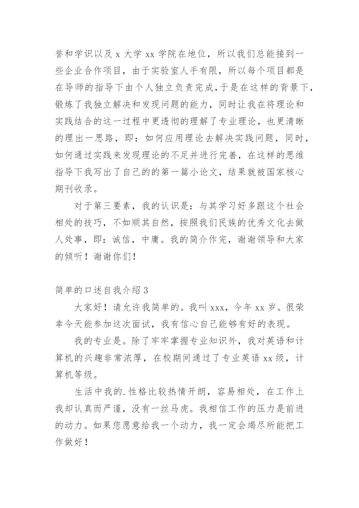 简单的口述自我介绍当换了一个新环境后,我们不得不需要向他人介绍自己,自我介绍是认识自我的手段。那么我们该怎么去写自我介绍呢?以下是小编为大家整理的简单的口述自我介绍,仅供参考,大家一起来看看吧。简单的口述自我介绍1各位同事:大家好!我叫xx,于20xx年6月11日出生,xx岁,来自,齐鲁大地给了我现在这豪爽直爽的性格,但又不失稳重,后来不远千里的来到南京这城市求学。来到大学学习的这个事实与我的理想其实有很大的出入,难免有些郁闷,但在一段时间后,我认清了事实,很看互联网专业。"21世纪是网联网的世纪."这句话一点都不假,随着互联网的展,我开始对互联网产生兴趣,今后的四年,我将在不断的学习进步中度过的`。“十年磨砺锋利出,宝剑只待君来识”再苦再累,都愿意一试,“吃得苦中苦,方为人上人”,在以后的学习生活中,我一定会是一位尽自己的努力、过一个充实而又意义的大专生活。最后希望前辈可以多多指点我的工作!简单的口述自我介绍2尊敬的面试官:大家好!我叫xxx,来自xx,首先非常感谢xx公司能给我一次面试机会。截至现在的成长经历中,可以说由三个基本要素组成,分别为家庭,学校,小范围的社会生活。对第一大要素家庭来说,我从小成长与一个家庭,父母亲之间的默契和相爱给我营造了一个很好的成长环境,为我性格的塑造和身心的发展起到了很大程度上的定型!是他们将我塑造成一位有爱心,有同理心和善解人意的人。对第二大要素学校来说,为了理想。考大学时决定报考了远离家乡的学校,决定走出从小的的成长环境,到外面去闯一闯,见见世面,带着这样的梦想,我报考了xx学校专业,随着眼界的拓宽,让我在大一结束时才明白,大学不仅仅是一个灌输专业知识的地方,同时,一位将来优秀的工程师也不是仅仅懂得本专业就可以的,大学更是一个让人明志的地方,于是在这样的醒悟下,我调整了自己的时间安排,将专业学习和修身养性以及扩展知识和拓宽思维兼并进行,于是乎不仅旁听了好多专业课,同时也阅读了古今中外大量名著。随着时间的推移,快到大学毕业,可发现机械专业的精髓竟是这样的庞大,于是乎决定报考研究生,这样就来到了xx大学xx学院攻读我的硕士学位。在这里,我有幸遇见了博学而可亲的恩师x教授,在他的指导下,我开始钻入了学这一领域,由于恩师的`社会声誉和学识以及x大学xx学院在地位,所以我们总能接到一些企业合作项目,由于实验室人手有限,所以每个项目都是在导师的指导下由个人独立负责完成,于是在这样的背景下,锻炼了我独立解决和发现问题的能力,同时让我在将理论和实践结合的这一过程中更透彻的理解了专业理论,也更清晰的理出一思路,即:如何应用理论去解决实践问题,同时,如何通过实践来发现理论的不足并进行完善,在这样的思维指导下我写出了自己的的第一篇小论文,结果就被国家核心期刊收录。对于第三要素,我的认识是:与其学习好多跟这个社会相处的技巧,不如顺其自然,按照我们民族的优秀文化去做人处事,即:诚信,中庸。我的简介作完,谢谢领导和大家的倾听!谢谢你们!简单的口述自我介绍3大家好!请允许我简单的。我叫xxx,今年xx岁。很荣幸今天能参加这次面试,我有信心自己能够有好的表现。我的专业是。除了牢牢掌握专业知识外,我对英语和计算机的兴趣非常浓厚,在校期间通过了专业英语xx级,计算机等级。生活中我的.性格比较热情开朗,容易相处,在工作上我却认真而严谨,没有一丝马虎。我相信工作的压力是前进的动力。如果您愿意给我一个动力,我一定会竭尽所能把工作做好!谢谢!简单的口述自我介绍4各位同事,大家好,我叫宋××,于xx年6月11日出生,xx岁,来自xx,齐鲁大地给了我现在这豪爽直爽的性格,但又不失稳重,后来不远千里的来到南京这城市求学。来到大学学习的这个事实与我的理想其实有很大的出入,难免有些郁闷,但在一段时间后,我认清了事实,很看互联网专业。"21世纪是网联网的世纪."这句话一点都不假,随着互联网的展,它为21世纪插上了腾飞的翅膀.后来在不断的.培养兴趣过程中,我开始对互联网产生兴趣,今后的四年,我将在不断的学习进步中度过的。“十年磨砺锋利出,宝剑只待君来识”。再苦再累,都愿意一试,“吃得苦中苦,方为人上人”,在以后的学习生活中,我一定会是一位尽自己的努力、过一个充实而又意义的大专生活。最后希望前辈可以多多指点我的工作!