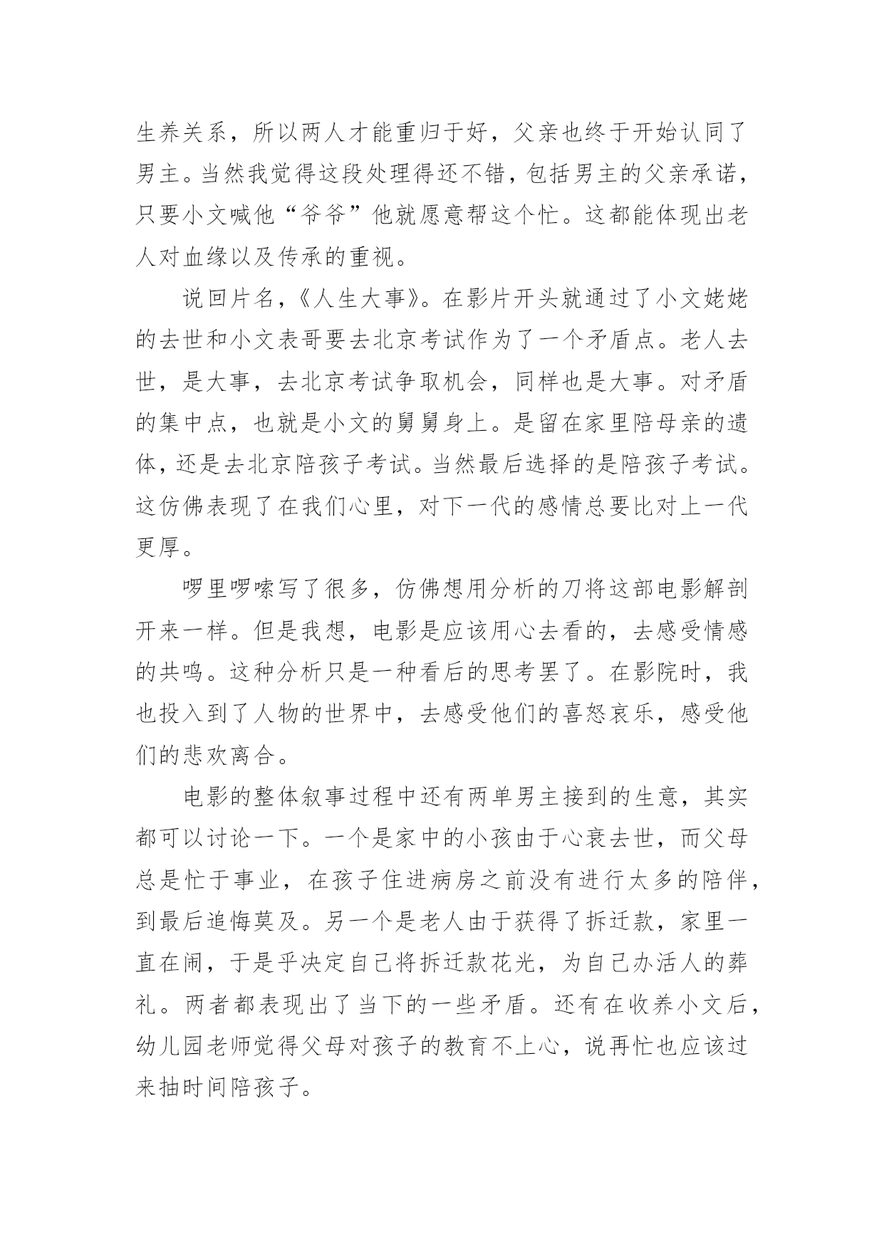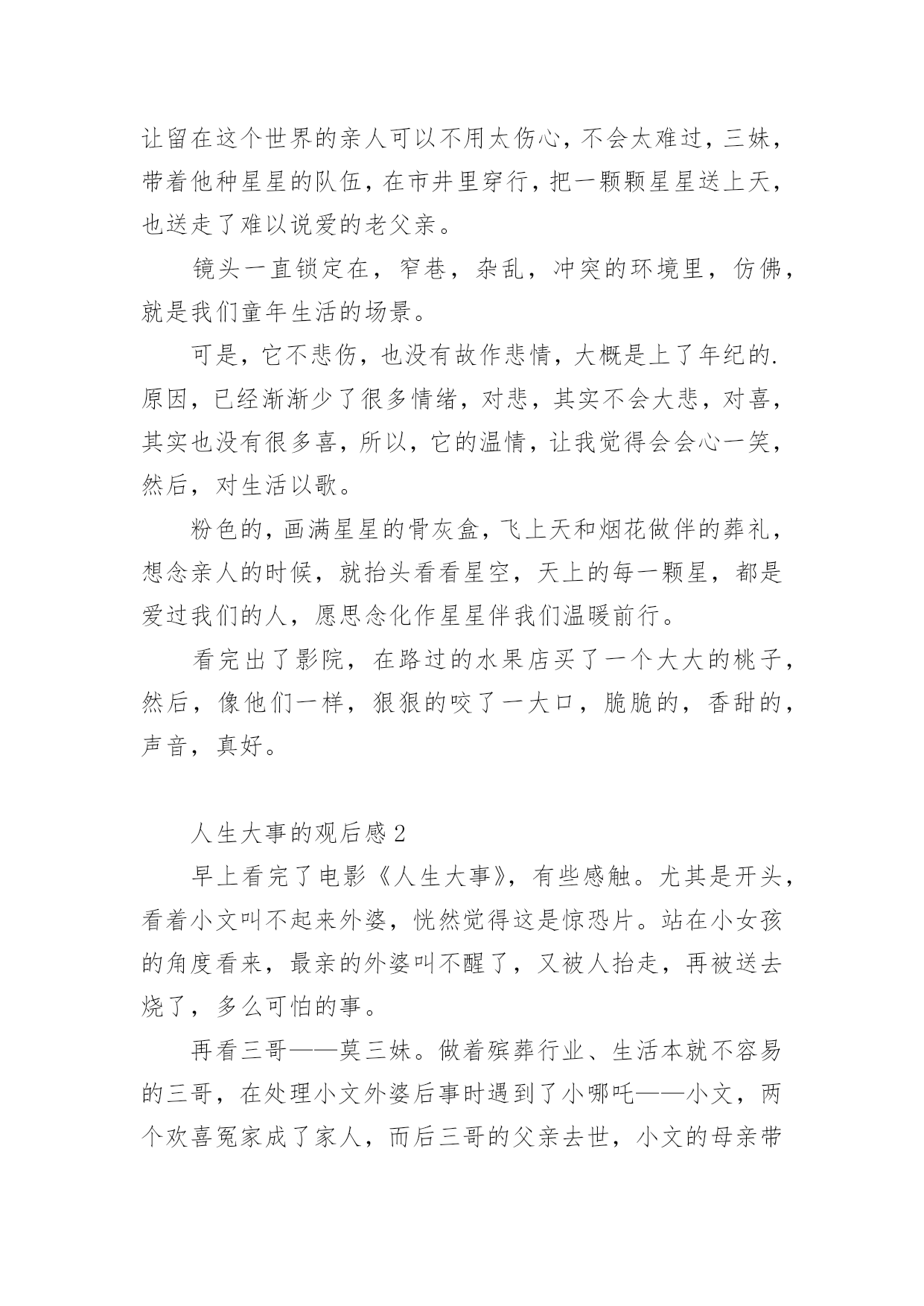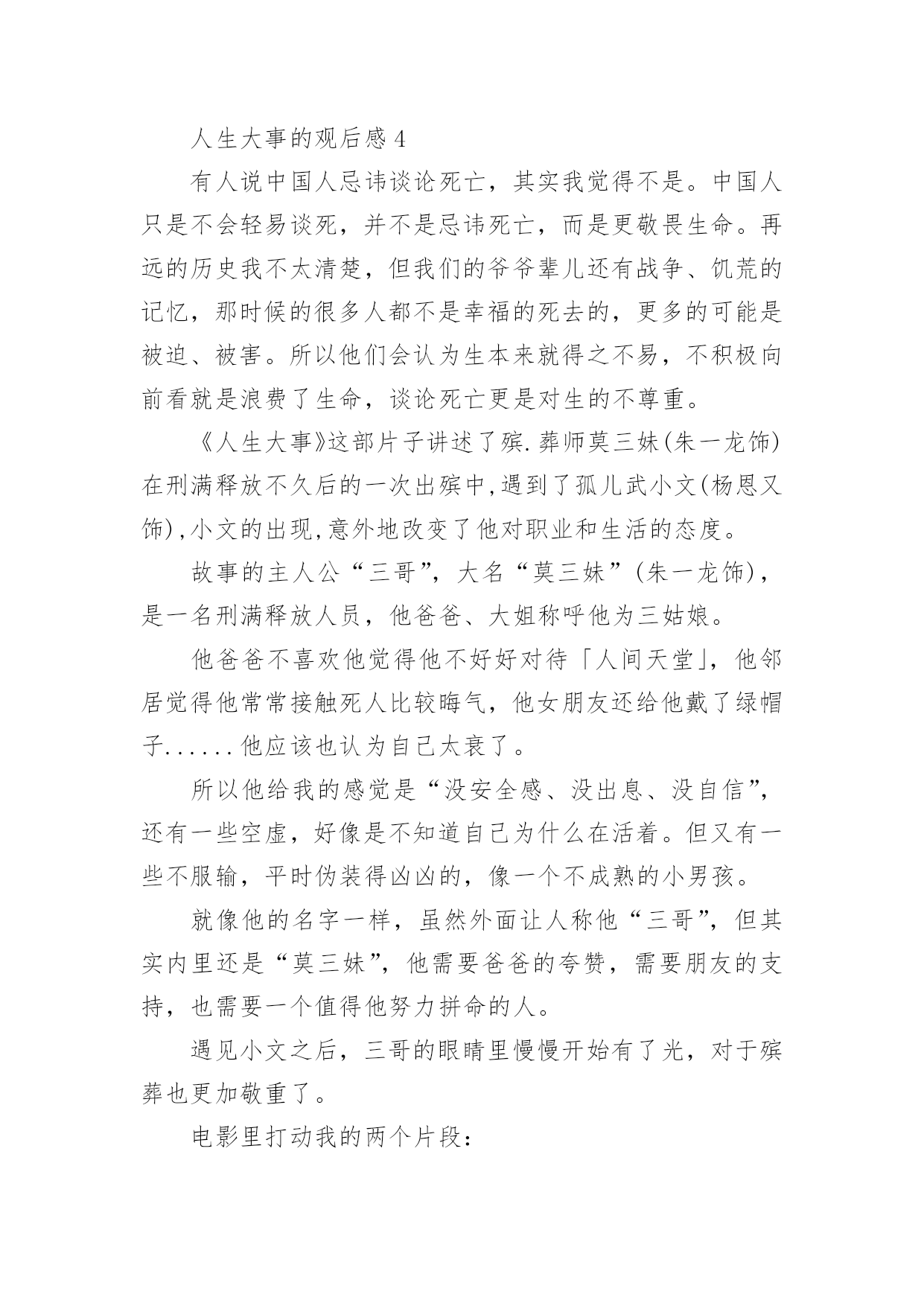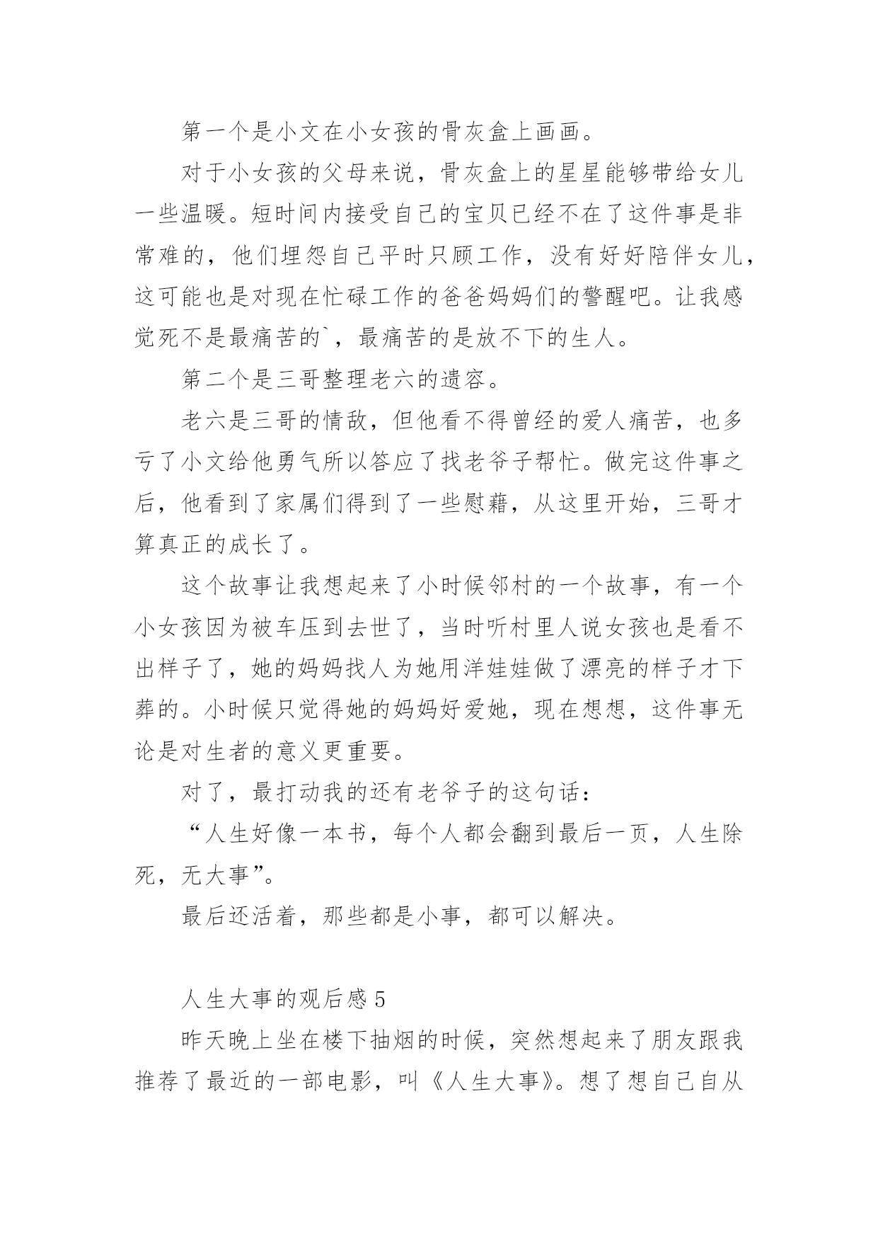 人生大事的观后感人生大事的观后感(精选6篇)当品味完一部作品后,相信大家的视野一定开拓了不少吧,这时候十分有必须要写一篇观后感了!可是观后感怎么写才合适呢?下面是小编为大家整理的人生大事的观后感(精选6篇),仅供参考,欢迎大家阅读。人生大事的观后感1每次,遇到一部好的电影,都觉得很荣幸。电影,其实,是一本形于色,付于声的书,用戏剧在诠释生活并补足生活,《人生大事》是一本,并不会厌的书。我以为它悲情,其实并不,小文的人生浓缩了市井里最悲情的角色,莫三妹浑浑噩噩的人生,因为小文,多了光亮,一个是童年正在悲惨,一个是有过残缺不全的童年,他们,是互相取暖吧。还有,是不是,大人们,毕生追寻的都是在弥补自己残缺的童年呢?三妹对小文的爱,其实就是弥补童年的缺爱吧。上一辈非打即骂,永远不被赞扬的爱,即使成年后,在生活里被理解了,也终究无法释怀,因为童年,无法再来。中国人向来是看重死后哀荣,三妹从对白事的不理解,到渐渐体会他所做的事能带给逝者亲属的安慰,并逐渐成为真正的种星星的人。没有人可以预知自己的身后事,但无一例外的,都是想让留在这个世界的亲人可以不用太伤心,不会太难过,三妹,带着他种星星的队伍,在市井里穿行,把一颗颗星星送上天,也送走了难以说爱的老父亲。镜头一直锁定在,窄巷,杂乱,冲突的环境里,仿佛,就是我们童年生活的场景。可是,它不悲伤,也没有故作悲情,大概是上了年纪的.原因,已经渐渐少了很多情绪,对悲,其实不会大悲,对喜,其实也没有很多喜,所以,它的温情,让我觉得会会心一笑,然后,对生活以歌。粉色的,画满星星的骨灰盒,飞上天和烟花做伴的葬礼,想念亲人的时候,就抬头看看星空,天上的每一颗星,都是爱过我们的人,愿思念化作星星伴我们温暖前行。看完出了影院,在路过的水果店买了一个大大的桃子,然后,像他们一样,狠狠的咬了一大口,脆脆的,香甜的,声音,真好。人生大事的观后感2早上看完了电影《人生大事》,有些感触。尤其是开头,看着小文叫不起来外婆,恍然觉得这是惊恐片。站在小女孩的角度看来,最亲的外婆叫不醒了,又被人抬走,再被送去烧了,多么可怕的事。再看三哥——莫三妹。做着殡葬行业、生活本就不容易的三哥,在处理小文外婆后事时遇到了小哪吒——小文,两个欢喜冤家成了家人,而后三哥的父亲去世,小文的母亲带走了小文,经历了生离死别后的三哥幡然悔悟,开始热爱自己的工作,养着找回来的小文,开始了新的生活。故事并不复杂,只是够动人。像小文与三哥,是不打不相识的关系,磨合后又成了相依为命的关系;像老爷子与三哥,表面上是相互嫌弃的关系,最后还是父慈子孝的'关系。人与人的关系,一开始可好可坏,相处久了却又自有真情在。还有那人生的大事。以前看到的是“人生除了生死,再无大事”,电影里则排除了生,变成“人生啊,除了死,无大事”。什么是人生的大事呢?是电影中婚庆店与殡仪店代表的延续与死亡,还是悲欢离合?只怕都不是。人生的大事还是当下正在发生的事,或大或小,好过不好过都得过。过去的已经过去,将来的还未发生,处理好眼下的事才重要。只是说起来容易,谈死亡还是太难。小时候,那些疼爱我的老人离世都没去过;未来,又希望活着的亲人们长久地活下去。最害怕医院,最不想看到离别的时候。人生大事的观后感3《人生大事》,拍得真不错,我二十岁时特别喜欢看大英雄国仇家恨比较宏观的故事,到了三十岁,有了一些人生经历和体验后,我更加喜欢看小人物小故事,那些细节和平凡角落看似平凡的故事。三哥是种星星的人,这是一部温馨的电影,剧情很紧凑,人物个性也很鲜明。台词也都很精简和戳人心,每一句台词的存在都是为了丰满这部戏的情感。最让我动容的是,奶奶微信里的叮咛声,因为再也听不到了,意味着永远的离去。还有小文喊到“三哥,三哥,爸爸,爸爸”真的是泪崩了,孩子的情绪已经爆发了,她不再是一个没爸没妈的孩子了,世上有个人很关心她。人,生来孤独,来是一个人,走是一个人,出生结婚是喜剧,去世人生落幕是悲剧,所以把上天堂的旁边放一家婚庆公司,包括里面结婚的场景,都是为了戏剧冲突,表现人生的悲欢。其实,喜就是悲,有生就有死,有聚就有散,有感情得到就有失去时的`失落,但是活着本身就是生命的意义,生死之外无大事。这个故事围绕着“父女”情为主要叙述线,一边是无父无母的孤儿,唯一的依靠外婆也去世了,电影开头的两个镜头就刻画了外婆的多病和小文哪吒般的性格,分别是一桌的药物和墙上哪吒的年画。另一边是为了爱情去坐牢,释放后还被绿的废柴中年,父子之间、男女之间、甚至和邻居都有矛盾,似乎人生不能再差了,最后却是一个“表里不一”的善良人,这样的戏剧怎么能让人不动容,为了收养一个不相关的孩子搞砸自己所谓的事业,为了曾经的旧爱出手整理情敌的遗容。表面的刚硬和内心的柔软,触动了每个观众最深处的内心。人都有一个共性,就是善良和同情心,这部电影很治愈,让我想起来类