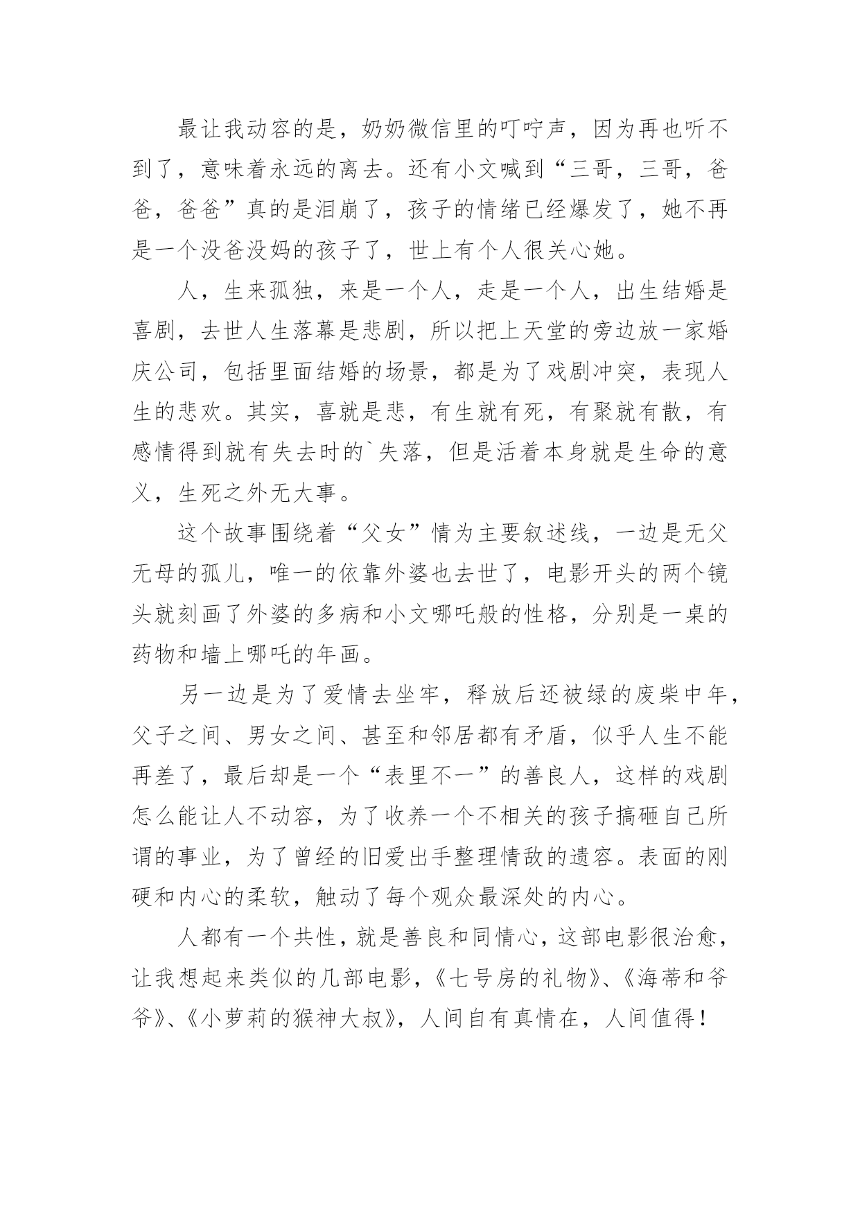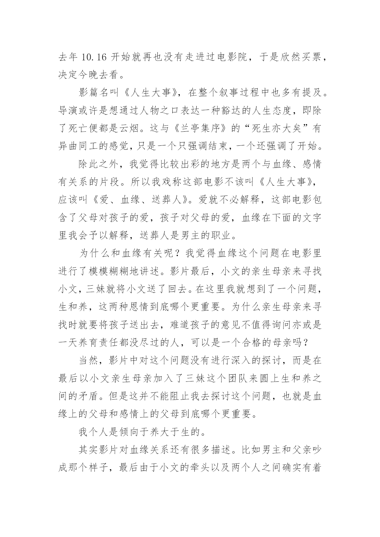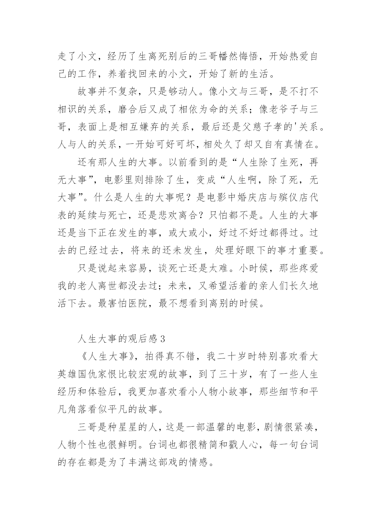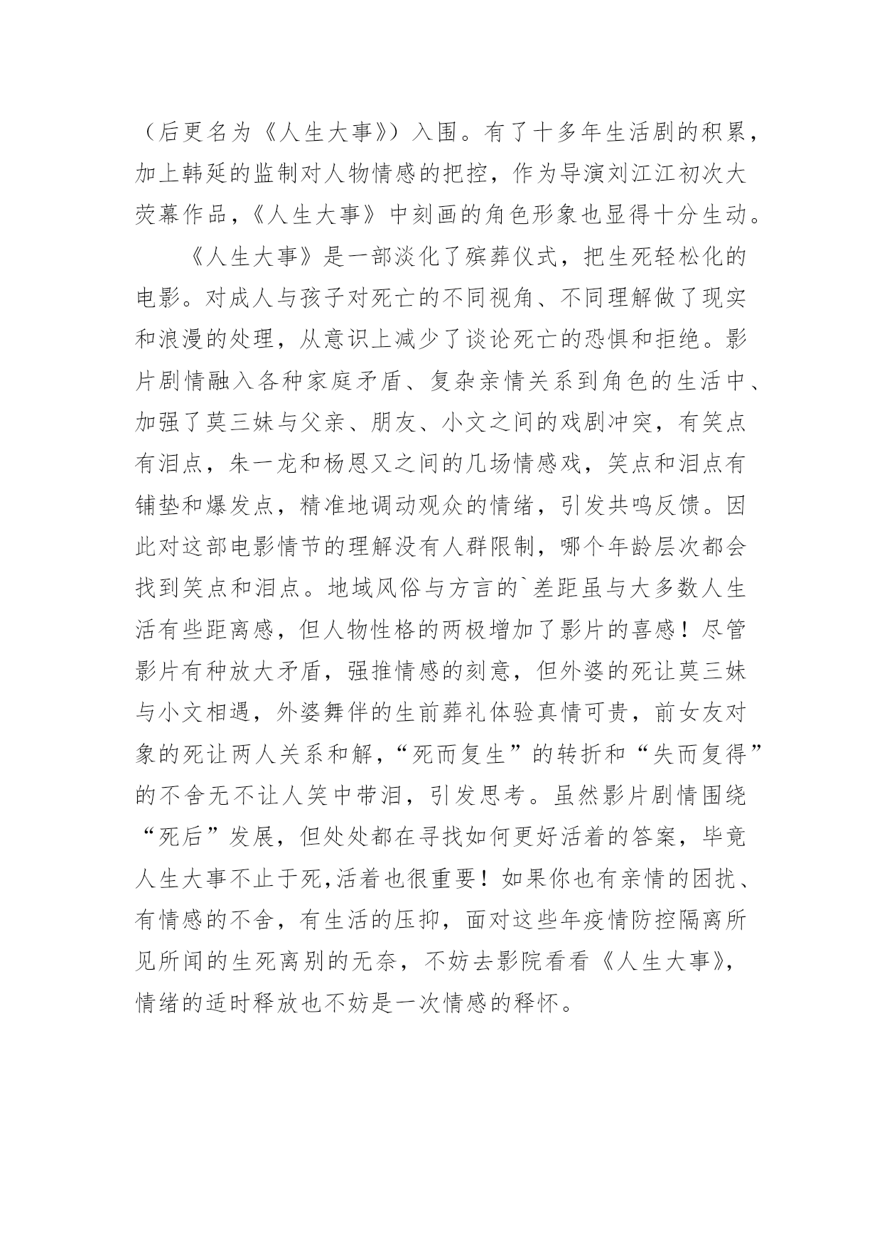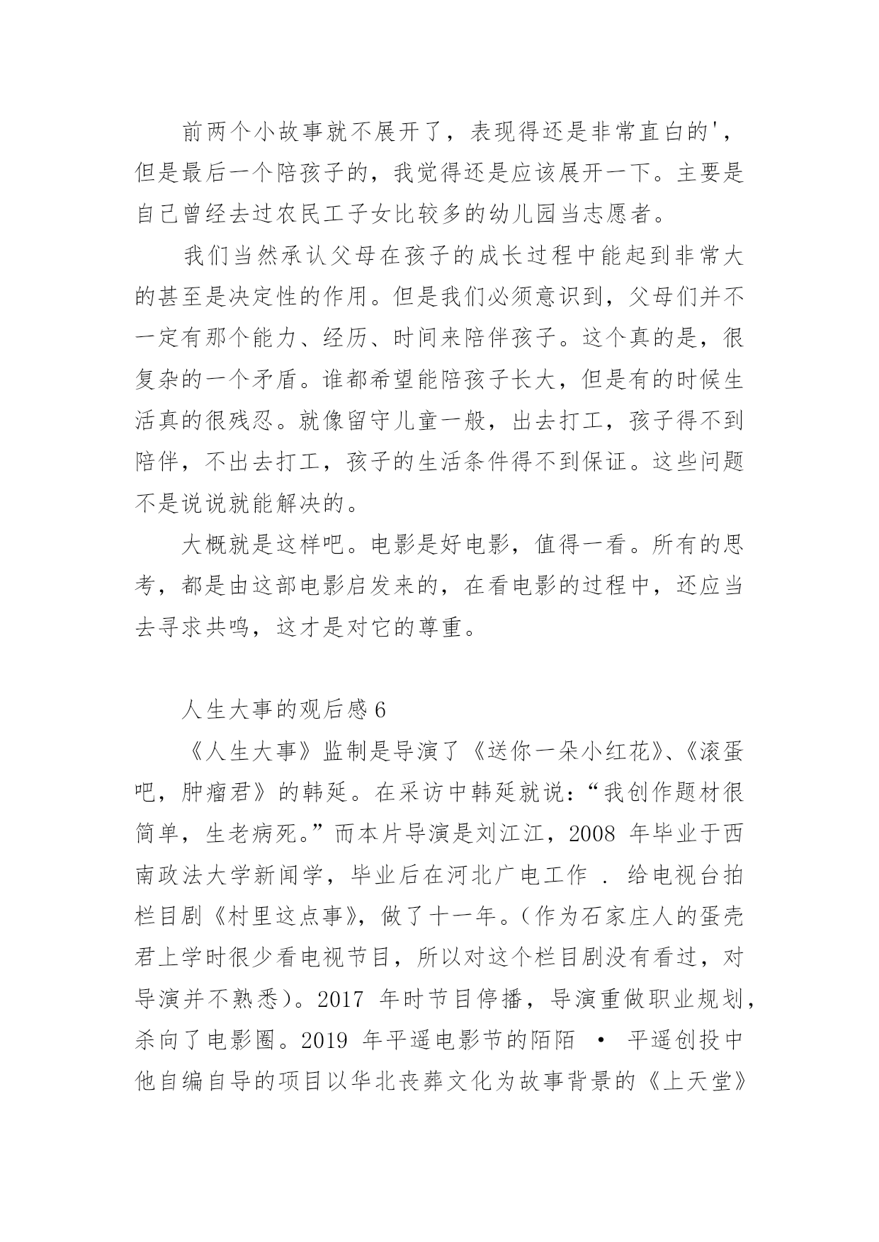人生大事的观后感人生大事的观后感(精选6篇)当品味完一部作品后,相信大家的视野一定开拓了不少吧,这时候十分有必须要写一篇观后感了!可是观后感怎么写才合适呢?下面是小编为大家整理的人生大事的观后感(精选6篇),仅供参考,欢迎大家阅读。人生大事的观后感1每次,遇到一部好的电影,都觉得很荣幸。电影,其实,是一本形于色,付于声的书,用戏剧在诠释生活并补足生活,《人生大事》是一本,并不会厌的书。我以为它悲情,其实并不,小文的人生浓缩了市井里最悲情的角色,莫三妹浑浑噩噩的人生,因为小文,多了光亮,一个是童年正在悲惨,一个是有过残缺不全的童年,他们,是互相取暖吧。还有,是不是,大人们,毕生追寻的都是在弥补自己残缺的童年呢?三妹对小文的爱,其实就是弥补童年的缺爱吧。上一辈非打即骂,永远不被赞扬的爱,即使成年后,在生活里被理解了,也终究无法释怀,因为童年,无法再来。中国人向来是看重死后哀荣,三妹从对白事的不理解,到渐渐体会他所做的事能带给逝者亲属的安慰,并逐渐成为真正的种星星的人。没有人可以预知自己的身后事,但无一例外的,都是想让留在这个世界的亲人可以不用太伤心,不会太难过,三妹,带着他种星星的队伍,在市井里穿行,把一颗颗星星送上天,也送走了难以说爱的老父亲。镜头一直锁定在,窄巷,杂乱,冲突的环境里,仿佛,就是我们童年生活的场景。可是,它不悲伤,也没有故作悲情,大概是上了年纪的.原因,已经渐渐少了很多情绪,对悲,其实不会大悲,对喜,其实也没有很多喜,所以,它的温情,让我觉得会会心一笑,然后,对生活以歌。粉色的,画满星星的骨灰盒,飞上天和烟花做伴的葬礼,想念亲人的时候,就抬头看看星空,天上的每一颗星,都是爱过我们的人,愿思念化作星星伴我们温暖前行。看完出了影院,在路过的水果店买了一个大大的桃子,然后,像他们一样,狠狠的咬了一大口,脆脆的,香甜的,声音,真好。人生大事的观后感2早上看完了电影《人生大事》,有些感触。尤其是开头,看着小文叫不起来外婆,恍然觉得这是惊恐片。站在小女孩的角度看来,最亲的外婆叫不醒了,又被人抬走,再被送去烧了,多么可怕的事。再看三哥——莫三妹。做着殡葬行业、生活本就不容易的三哥,在处理小文外婆后事时遇到了小哪吒——小文,两个欢喜冤家成了家人,而后三哥的父亲去世,小文的母亲带走了小文,经历了生离死别后的三哥幡然悔悟,开始热爱自己的工作,养着找回来的小文,开始了新的生活。故事并不复杂,只是够动人。像小文与三哥,是不打不相识的关系,磨合后又成了相依为命的关系;像老爷子与三哥,表面上是相互嫌弃的关系,最后还是父慈子孝的'关系。人与人的关系,一开始可好可坏,相处久了却又自有真情在。还有那人生的大事。以前看到的是“人生除了生死,再无大事”,电影里则排除了生,变成“人生啊,除了死,无大事”。什么是人生的大事呢?是电影中婚庆店与殡仪店代表的延续与死亡,还是悲欢离合?只怕都不是。人生的大事还是当下正在发生的事,或大或小,好过不好过都得过。过去的已经过去,将来的还未发生,处理好眼下的事才重要。只是说起来容易,谈死亡还是太难。小时候,那些疼爱我的老人离世都没去过;未来,又希望活着的亲人们长久地活下去。最害怕医院,最不想看到离别的时候。人生大事的观后感3《人生大事》,拍得真不错,我二十岁时特别喜欢看大英雄国仇家恨比较宏观的故事,到了三十岁,有了一些人生经历和体验后,我更加喜欢看小人物小故事,那些细节和平凡角落看似平凡的故事。三哥是种星星的人,这是一部温馨的电影,剧情很紧凑,人物个性也很鲜明。台词也都很精简和戳人心,每一句台词的存在都是为了丰满这部戏的情感。最让我动容的是,奶奶微信里的叮咛声,因为再也听不到了,意味着永远的离去。还有小文喊到“三哥,三哥,爸爸,爸爸”真的是泪崩了,孩子的情绪已经爆发了,她不再是一个没爸没妈的孩子了,世上有个人很关心她。人,生来孤独,来是一个人,走是一个人,出生结婚是喜剧,去世人生落幕是悲剧,所以把上天堂的旁边放一家婚庆公司,包括里面结婚的场景,都是为了戏剧冲突,表现人生的悲欢。其实,喜就是悲,有生就有死,有聚就有散,有感情得到就有失去时的`失落,但是活着本身就是生命的意义,生死之外无大事。这个故事围绕着“父女”情为主要叙述线,一边是无父无母的孤儿,唯一的依靠外婆也去世了,电影开头的两个镜头就刻画了外婆的多病和小文哪吒般的性格,分别是一桌的药物和墙上哪吒的年画。另一边是为了爱情去坐牢,释放后还被绿的废柴中年,父子之间、男女之间、甚至和邻居都有矛盾,似乎人生不能再差了,最后却是一个“表里不一”的善良人,这样的戏剧怎么能让人不动容,为了收养一个不相关的孩子搞砸自己所谓的事业,为了曾经的旧爱出手整理情敌的遗容。表面的刚硬和内心的柔软,触动了每个观众最深处的内心。人都有一个共性,就是善良和同情心,这部电影很治愈,让我想起来类