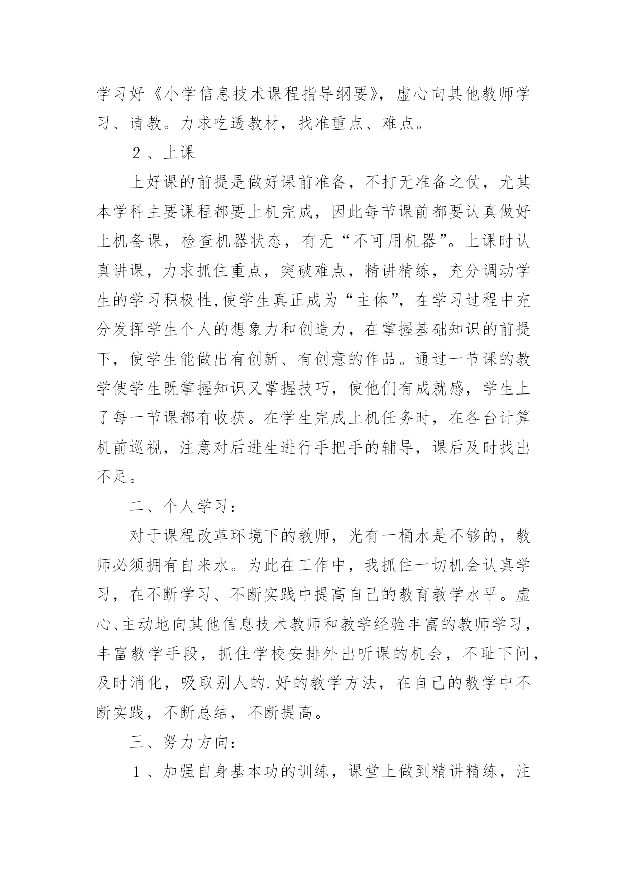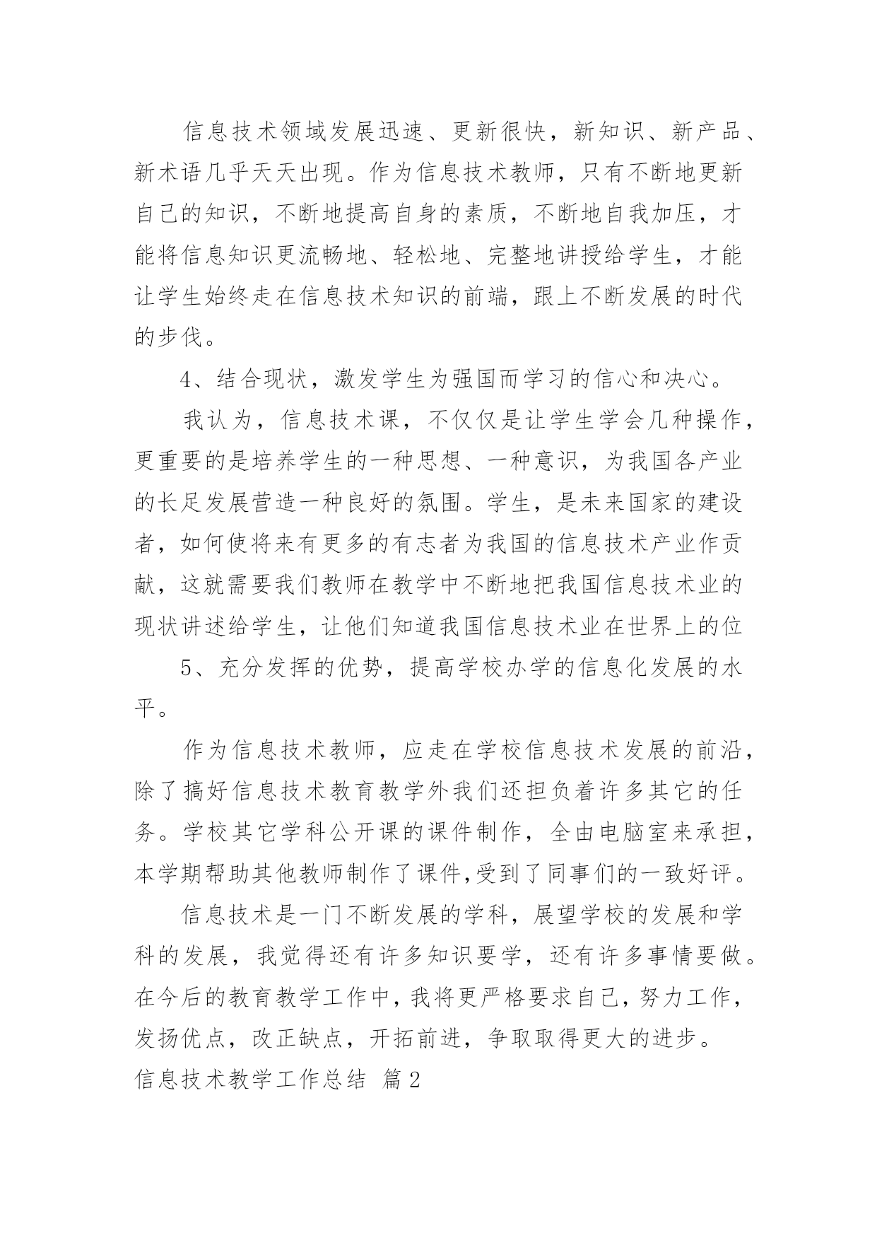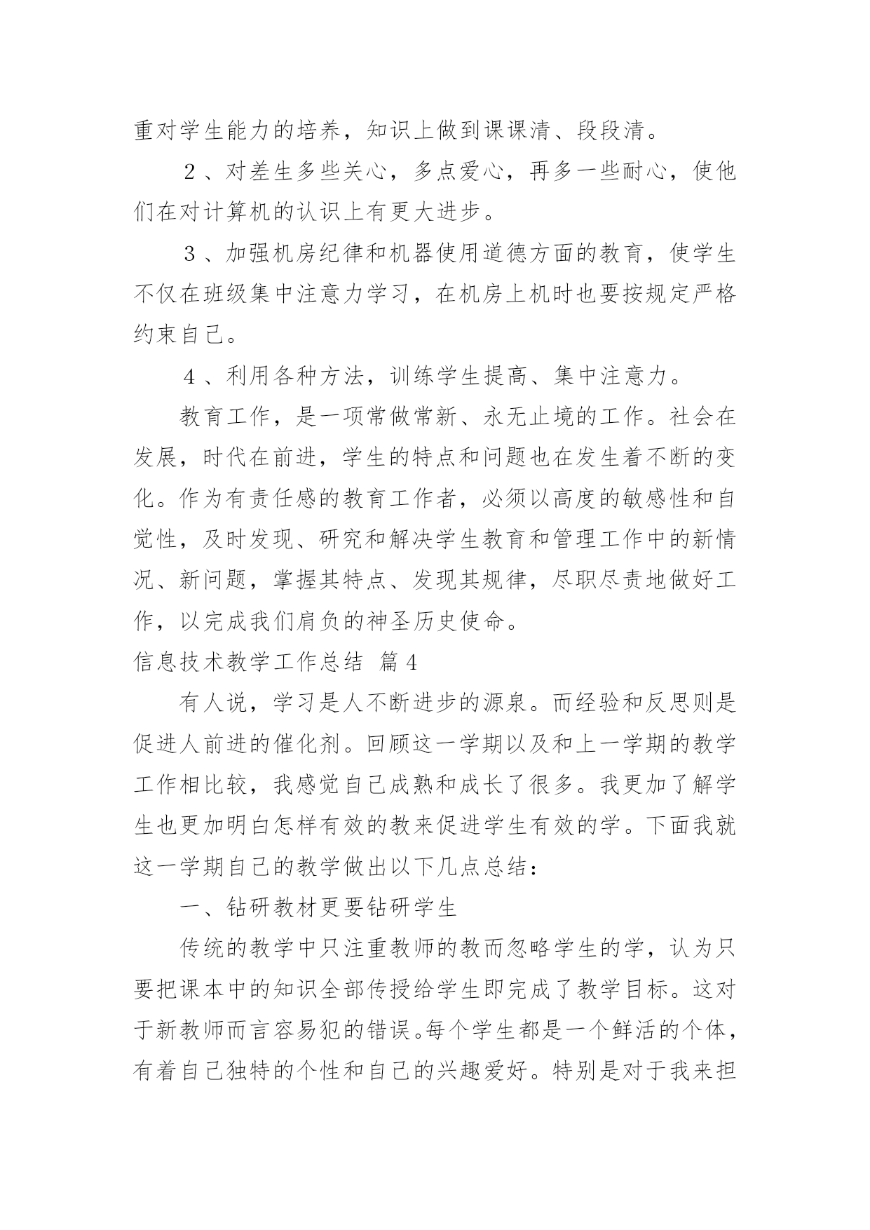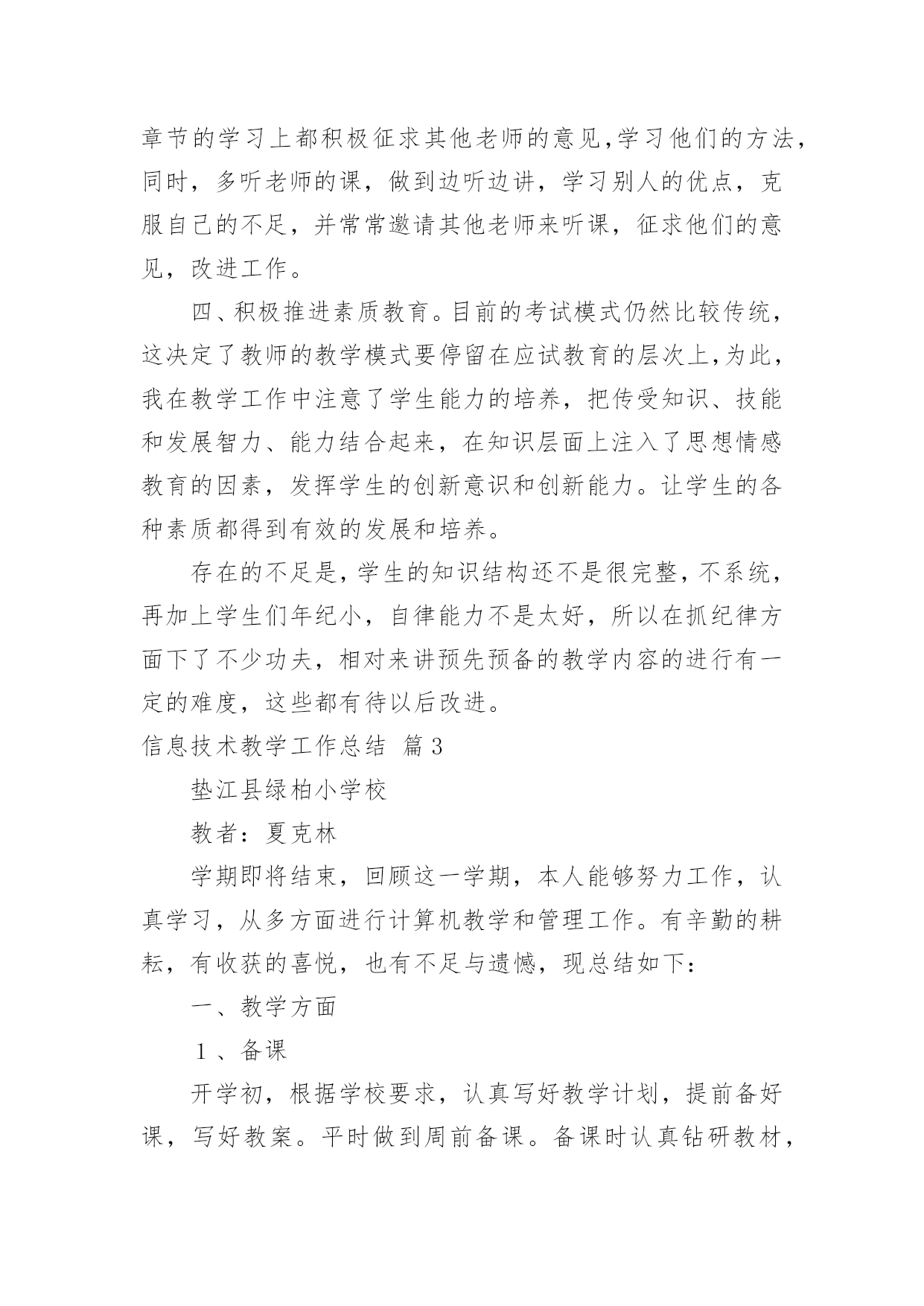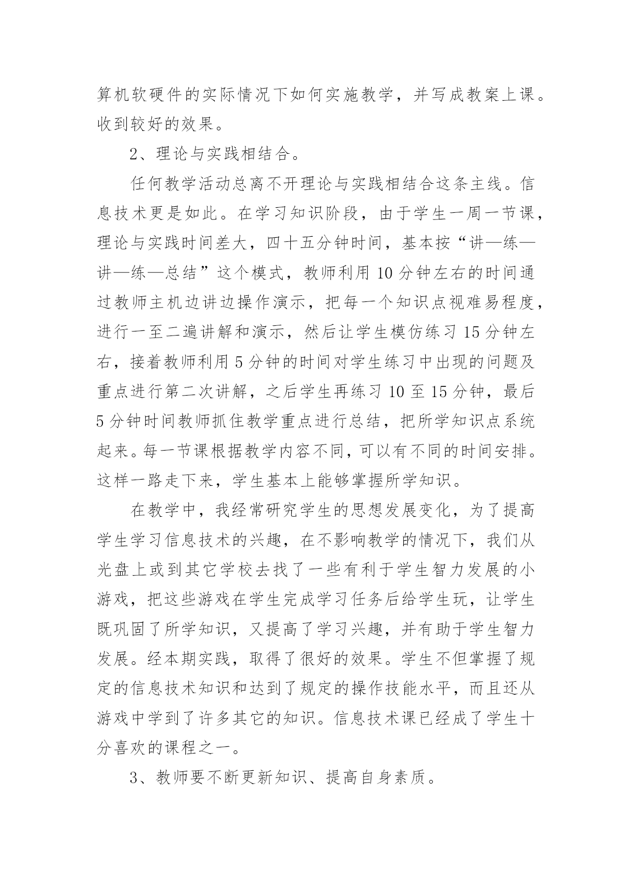 信息技术教学工作总结信息技术教学工作总结集合六篇总结是在一段时间内对学习和工作生活等表现加以总结和概括的一种书面材料,它可使零星的、肤浅的、表面的感性认知上升到全面的、系统的、本质的理性认识上来,让我们一起认真地写一份总结吧。但是总结有什么要求呢?下面是小编帮大家整理的信息技术教学工作总结6篇,仅供参考,希望能够帮助到大家。信息技术教学工作总结篇1信息技术作为一门重要的技术,已经被越来越多的人们所使用。在当今及未来社会,掌握信息技术是对人的一种基本要求,人们都知道不懂得信息技术的人必将被现代社会所淘汰。但是,信息技术课作为一门新课,还很年轻,需要我们教师同行及社会各界人士等不断地关心、支持、探索、交流,使我们的信息技术课教学内容不断更新,教学水平不断提高。本学期在学校的领导下,并结合我校计算机的硬件实际情况开展了信息技术教育、教学工作。学期临近结束,回顾一学期以来的工作,现总结如下1、结合计算机的硬件实际,开展好常规教学。开学初,便结合我校的计算机硬件实际,制定出切实可行的教学计划,并严格按教学计划进行上课。在教学过程中,对具体的教学内容都进行了认真的教学分析,思考在现有计算机软硬件的实际情况下如何实施教学,并写成教案上课。收到较好的效果。2、理论与实践相结合。任何教学活动总离不开理论与实践相结合这条主线。信息技术更是如此。在学习知识阶段,由于学生一周一节课,理论与实践时间差大,四十五分钟时间,基本按“讲—练—讲—练—总结”这个模式,教师利用10分钟左右的时间通过教师主机边讲边操作演示,把每一个知识点视难易程度,进行一至二遍讲解和演示,然后让学生模仿练习15分钟左右,接着教师利用5分钟的时间对学生练习中出现的问题及重点进行第二次讲解,之后学生再练习10至15分钟,最后5分钟时间教师抓住教学重点进行总结,把所学知识点系统起来。每一节课根据教学内容不同,可以有不同的时间安排。这样一路走下来,学生基本上能够掌握所学知识。在教学中,我经常研究学生的思想发展变化,为了提高学生学习信息技术的兴趣,在不影响教学的情况下,我们从光盘上或到其它学校去找了一些有利于学生智力发展的小游戏,把这些游戏在学生完成学习任务后给学生玩,让学生既巩固了所学知识,又提高了学习兴趣,并有助于学生智力发展。经本期实践,取得了很好的效果。学生不但掌握了规定的信息技术知识和达到了规定的操作技能水平,而且还从游戏中学到了许多其它的知识。信息技术课已经成了学生十分喜欢的课程之一。3、教师要不断更新知识、提高自身素质。信息技术领域发展迅速、更新很快,新知识、新产品、新术语几乎天天出现。作为信息技术教师,只有不断地更新自己的知识,不断地提高自身的素质,不断地自我加压,才能将信息知识更流畅地、轻松地、完整地讲授给学生,才能让学生始终走在信息技术知识的前端,跟上不断发展的时代的步伐。4、结合现状,激发学生为强国而学习的信心和决心。我认为,信息技术课,不仅仅是让学生学会几种操作,更重要的是培养学生的一种思想、一种意识,为我国各产业的长足发展营造一种良好的氛围。学生,是未来国家的建设者,如何使将来有更多的有志者为我国的信息技术产业作贡献,这就需要我们教师在教学中不断地把我国信息技术业的现状讲述给学生,让他们知道我国信息技术业在世界上的位5、充分发挥的优势,提高学校办学的信息化发展的水平。作为信息技术教师,应走在学校信息技术发展的前沿,除了搞好信息技术教育教学外我们还担负着许多其它的任务。学校其它学科公开课的课件制作,全由电脑室来承担,本学期帮助其他教师制作了课件,受到了同事们的一致好评。信息技术是一门不断发展的学科,展望学校的发展和学科的发展,我觉得还有许多知识要学,还有许多事情要做。在今后的教育教学工作中,我将更严格要求自己,努力工作,发扬优点,改正缺点,开拓前进,争取取得更大的进步。信息技术教学工作总结篇2本学期我担任八年级810、812、813、802、815、816、817、818,9个班信息技术教学工作,尽管不是主课,但教学工作上不敢怠慢,从各方面严格要求自己,积极向老教师请教,结合本校的实际条件和学生的实际情况,勤勤恳恳,兢兢业业,使教学工作有计划,有组织,有步骤地开展。并且帮助教导处统计早午读各班成绩,以及和我们科组共同完成全校的成绩统计。现对本学期教学工作作出总结,希望能发扬优点,克服不足,总结检验教训,以便促进教学工作更上一层楼。一、认真备课,不但备学生而且备教材备教法,根据教材内容及学生的实际,设计课的类型,拟定采用的教学方法,并对教学过程的程序及时间安排都作了详细的记录,认真写好教案。每一课都做到“有备而来”,每堂课都在课前做好充分的准备,并制作各种利于吸引学生注意力的有趣教具,课后及时对该课作出总结,写好教学后记,并认真按搜集每课书的知识要点,归纳成集。二