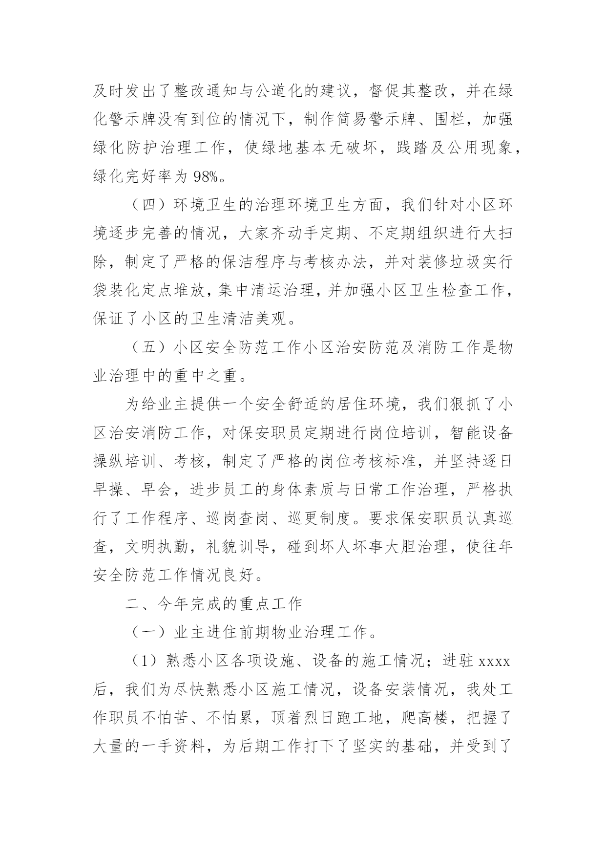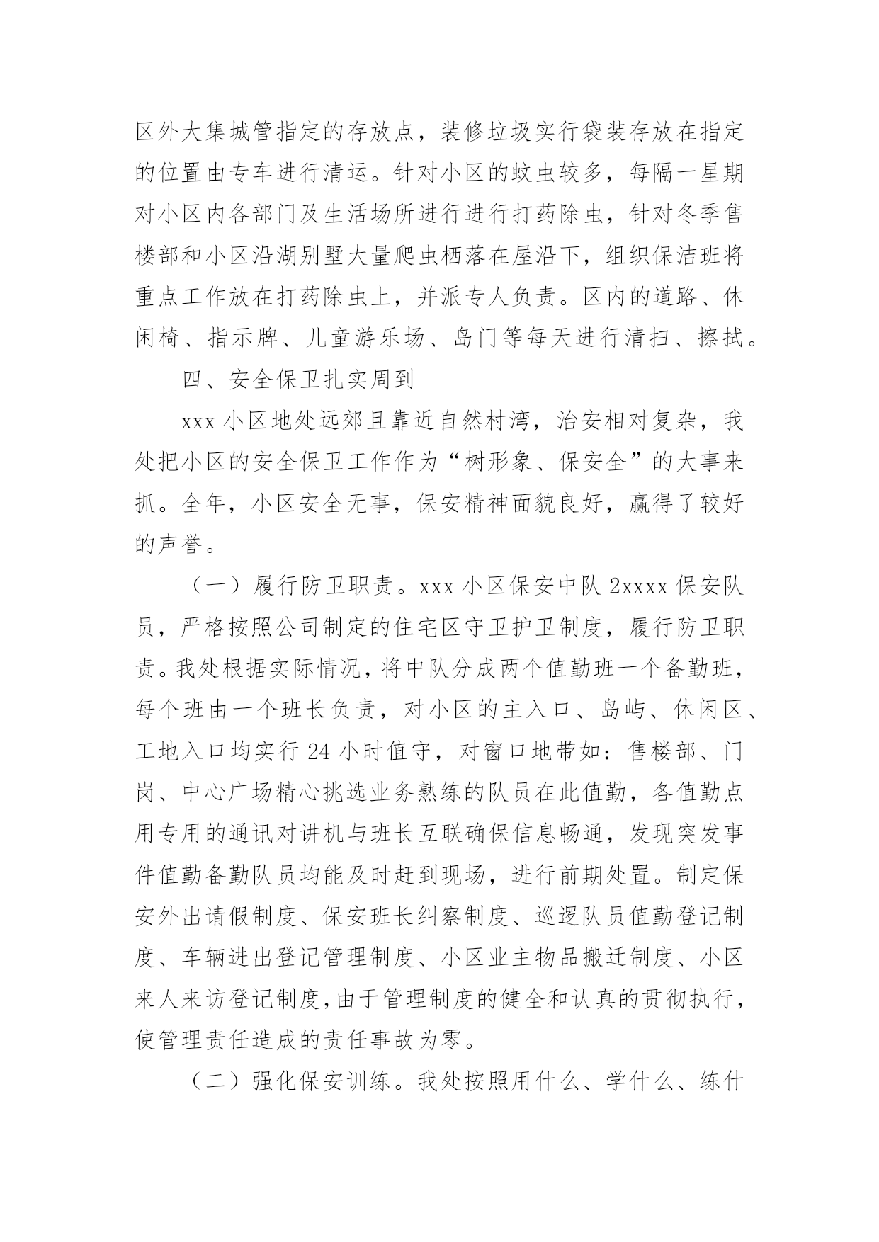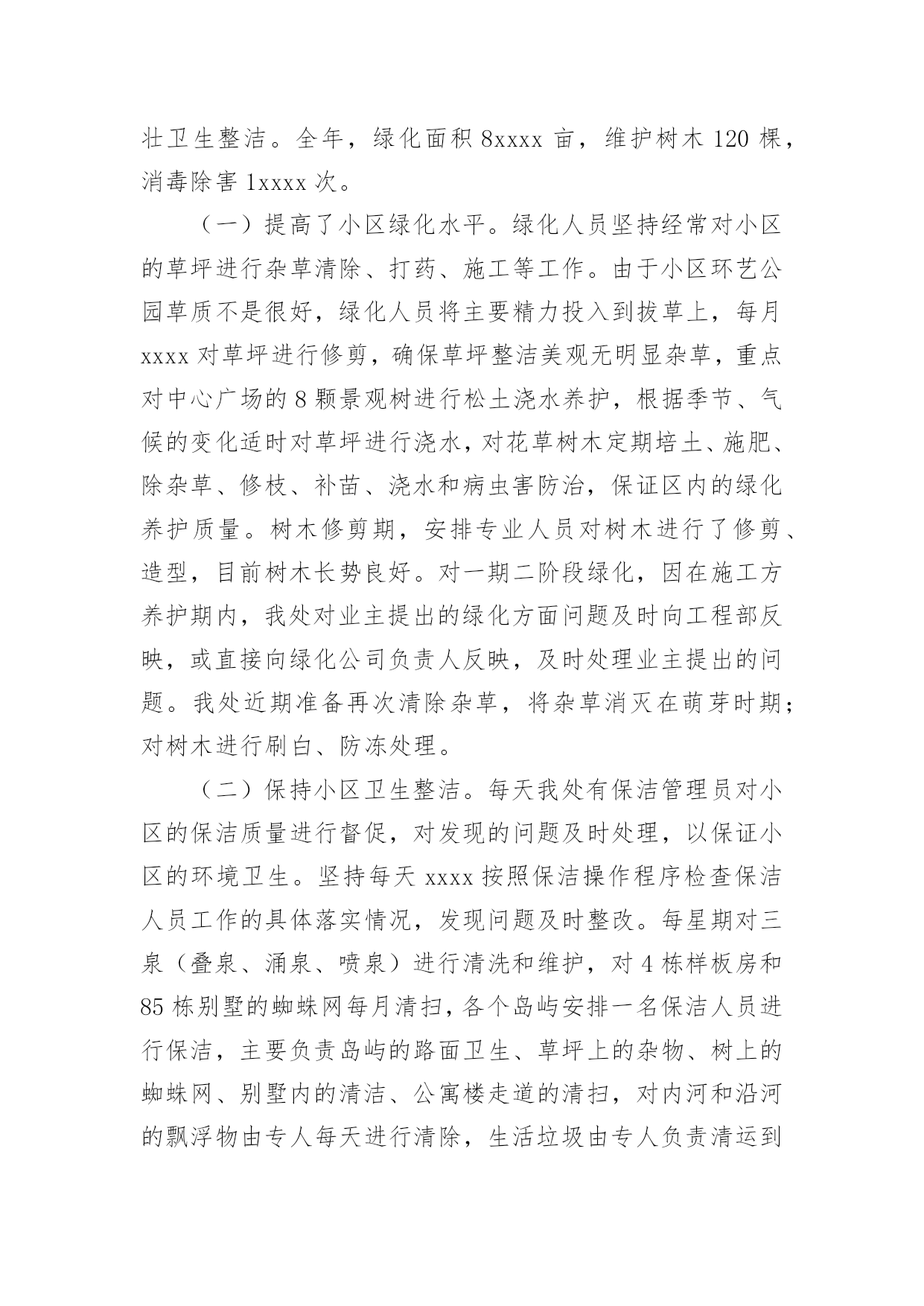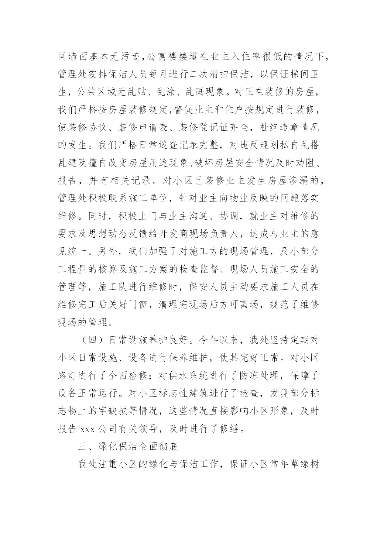 小区物业工作总结小区物业工作总结怎么写小区物业工作总结小区物业工作总结怎么写总结就是对一个时期的学习、工作或其完成情况进行一次全面系统的回顾和分析的书面材料,它可使零星的、肤浅的、表面的感性认知上升到全面的、系统的、本质的理性认识上来,我想我们需要写一份总结了吧。但是总结有什么要求呢?以下是小编为大家收集的小区物业工作总结小区物业工作总结怎么写,欢迎大家分享。小区物业工作总结小区物业工作总结怎么写120xx年,在xxx公司和xxx公司(甲方)的正确领导下,我处认真对照年初签定的目标责任书,结合小区实际,扎实工作,勤奋敬业,协调各方,周到服务,完成了年度各项工作和既定目标,具体情况一、自身建设质量提高一年来,我处强化了内部管理,从基本制度建设、员工队伍建设和服务质量建设入手,从严要求,正规管理,在提高自身建设质量上狠下功夫。(一)规范行为。管理处员工统一着装、挂牌上岗;对业主、客户服务按公司规程操作;员工按时上下班,请销假需经管理处领导批准,出勤率达10xxxx,管理处现形象识别系统符合公司要求。管理处每两周召开一次例会,在员工汇报工作的基础上,小结讲评前一阶段完成任务的情况,同时布置新的工作,提出明确要求。员工分工明确,熟知岗位职责、工作标准、工作规程;由公司管理部和管理处主任对员工每月的考核完成率达10xxxx。(二)规范秩序。管理处的岗位职责上墙,办公区域整洁,各项工作日志、文件记录清楚,内容完整。有完善的会议记录,会议中布置的工作完成率10xxxx。建立了完善的档案管理制度,对收集到的各类资料、图纸等各类文件分类归档完整,有检索目录,文件贯彻率达10xxxx。同时,管理处初步实施了计算机化管理,各种联系函、通知、报告电脑中都有存档,可随时调阅。(三)规范服务。管理处牢固树立服务理念,员工各负其责、各尽其能,按公司规定进行各项管理服务工作,公司对我处考核每月都有评定,考核到个人,并对我处管理质量有较高评价。小区设置了服务中心和24小时服务接待电话。业主(住户)的服务需求、建议、咨询、质疑和投诉等处理及时;业主有效投诉处理率10xxxx,业主(住户)服务需求回访率达9xxxx以上。同时,我处积极协调与工程部、售楼部、业主的关系;并从公司利益出发,处理各项事务。管理处有明确的改善管理服务质量的实施方案和阶段(月、季度、年)工作计划;工作计划完成率9xxxx以上,不合格服务整改合格率10xxxx。中秋节我处和开发商一同成功的举办了业主、客户联谊会,促进了物业与开发商、业主的友谊。在业主入住率较低的情况下,暂未开展其他社区文化活动,以降低成本。二、房屋管理深入细致一年来,管理处严格按照公司的要求,依据三方协议,深入细致地对小区房屋实施经常化、制度化、规范化的管理。(一)交房工作有条不紊。管理处完成了10月底一期5xxxx联排业主的交房工作。我们积极和xxx公司协调,筹备交房事宜,布置交房现场,周到服务,耐心解释业主有关物业方面有问题;积极促成三方签订业主临时公约、前期物业管理服务协议;对业主验房时提出及发现现的房屋质量问题进行妥善整改维修。(二)房屋验收认真细致。管理处从开发商信誉和物业管理程序出发,与开发商共同组建房屋维修整改小组,我们主要负责现场整改工作,对一期房屋的整改维修部位、维修过程、维修质量实施全程管理。为了进一步完善小区一期85栋别墅及3栋公寓楼的维修档案。雨后我们对房屋渗水的部位进行文字记栽及照像处理,并分析渗漏的原因,并将资料上报发商。同时配合开发商、施工队、监理公司等各部门抓好一期房屋的整改的协调工作。至年底,整改维修外墙渗水、屋面渗漏、窗台渗水工作基本完成,完好率达9xxxx以上。管理处本着对业主负责的态度,对照已交房《业主房屋验收表》陆续对已交房屋进行全面检查,统计房屋渗水等需维修整改的问题,及时报给工程部及时解决。(三)管理维护及时到位。管理处安排管理员及保安人员每天对小区进行巡检维护,确保房屋外观整齐,外墙及梯间墙面基本无污迹,公寓楼楼道在业主入住率很低的情况下,管理处安排保洁人员每月进行二次清扫保洁,以保证梯间卫生,公共区域无乱贴、乱涂、乱画现象。对正在装修的房屋,我们严格按房屋装修规定,督促业主和住户按规定进行装修,使装修协议、装修申请表、装修登记证齐全,杜绝违章情况的发生。我们严格日常巡查记录完整,对违反规划私自乱搭乱建及擅自改变房屋用途现象、破坏房屋安全情况及时劝阻、报告,并有相关记录。对小区已装修业主发生房屋渗漏的,管理处积极联系施工单位,针对业主向物业反映的问题落实维修。同时,积极上门与业主沟通、协调,就业主对维修的要求及思想动态反馈给开发商现场负责人,达成与业主的意见统一。另外,我们加强了对施工方的现场管理,及小部分工程量的核算及施工方案的检查监督、现场人员施工安全的管理等,施工队进行