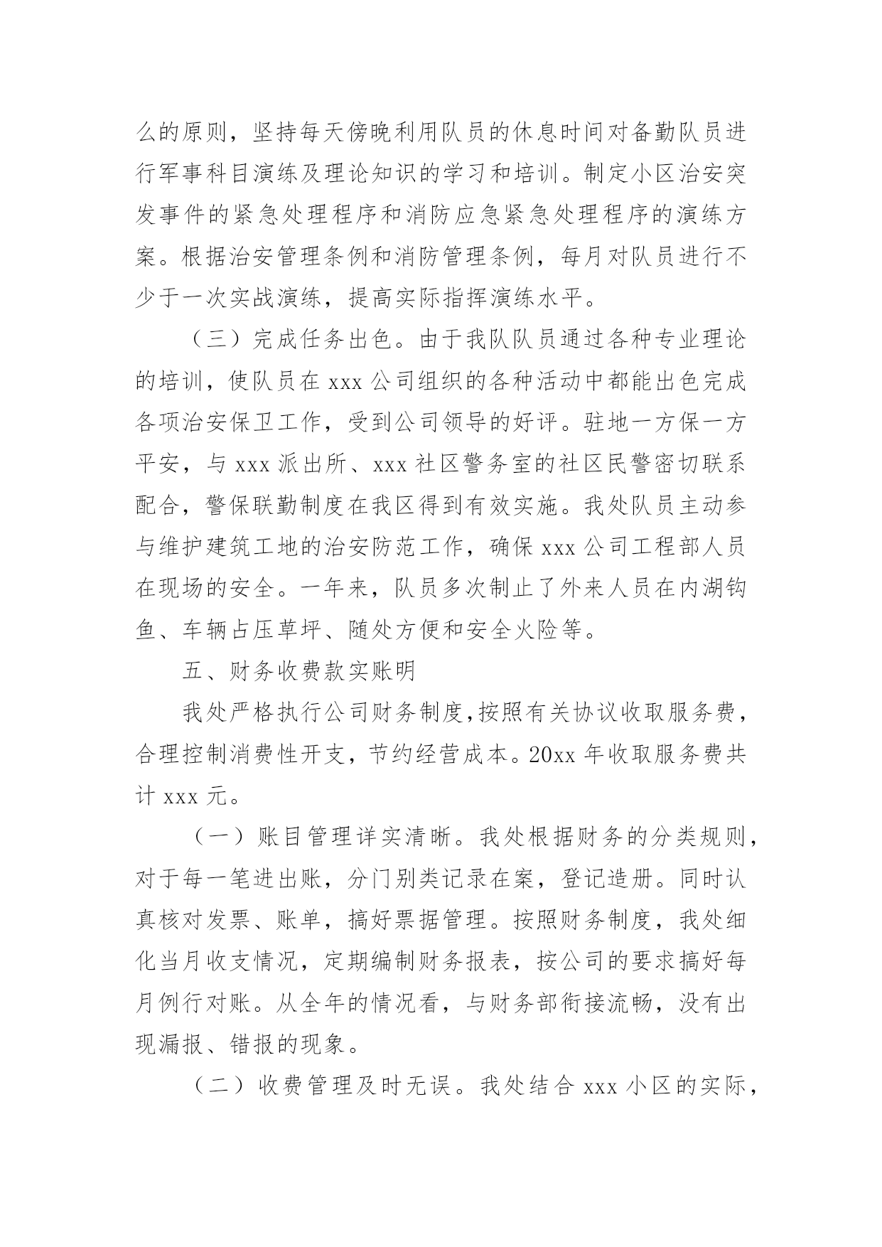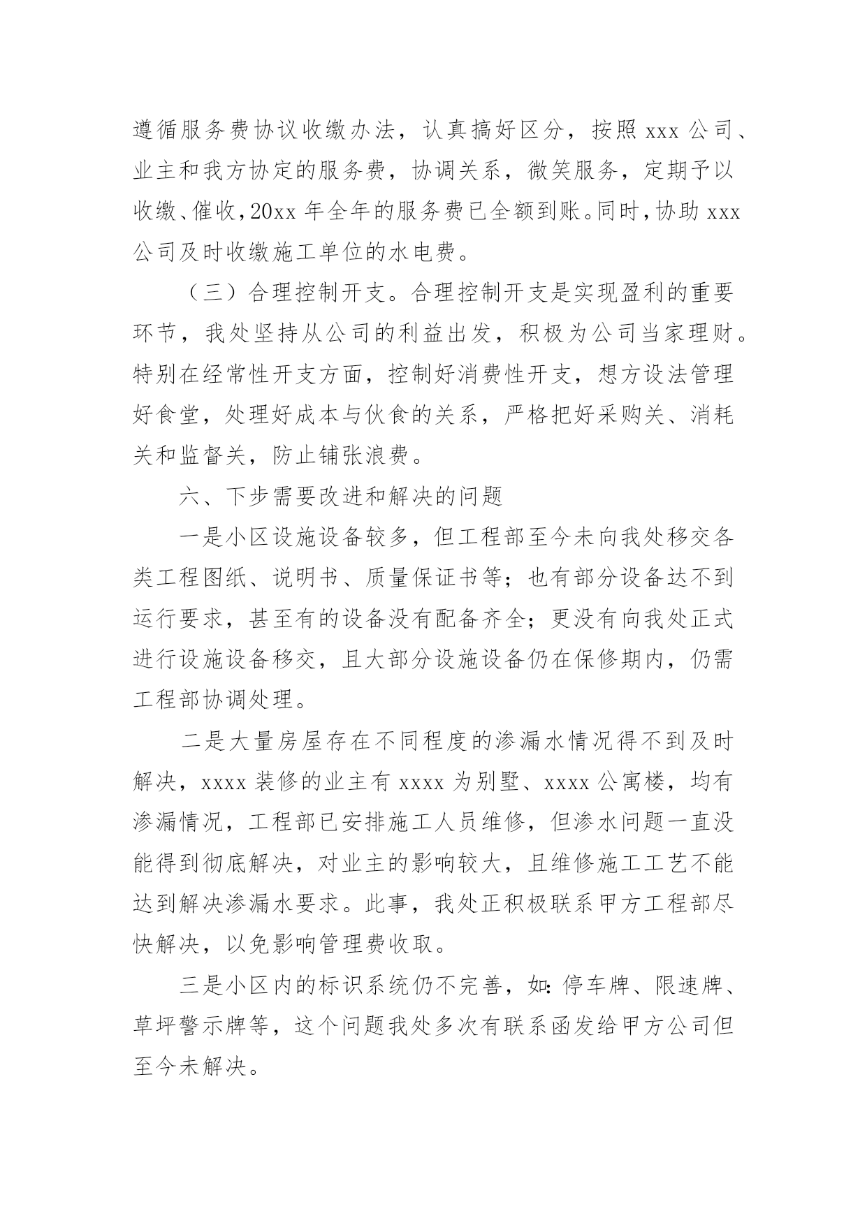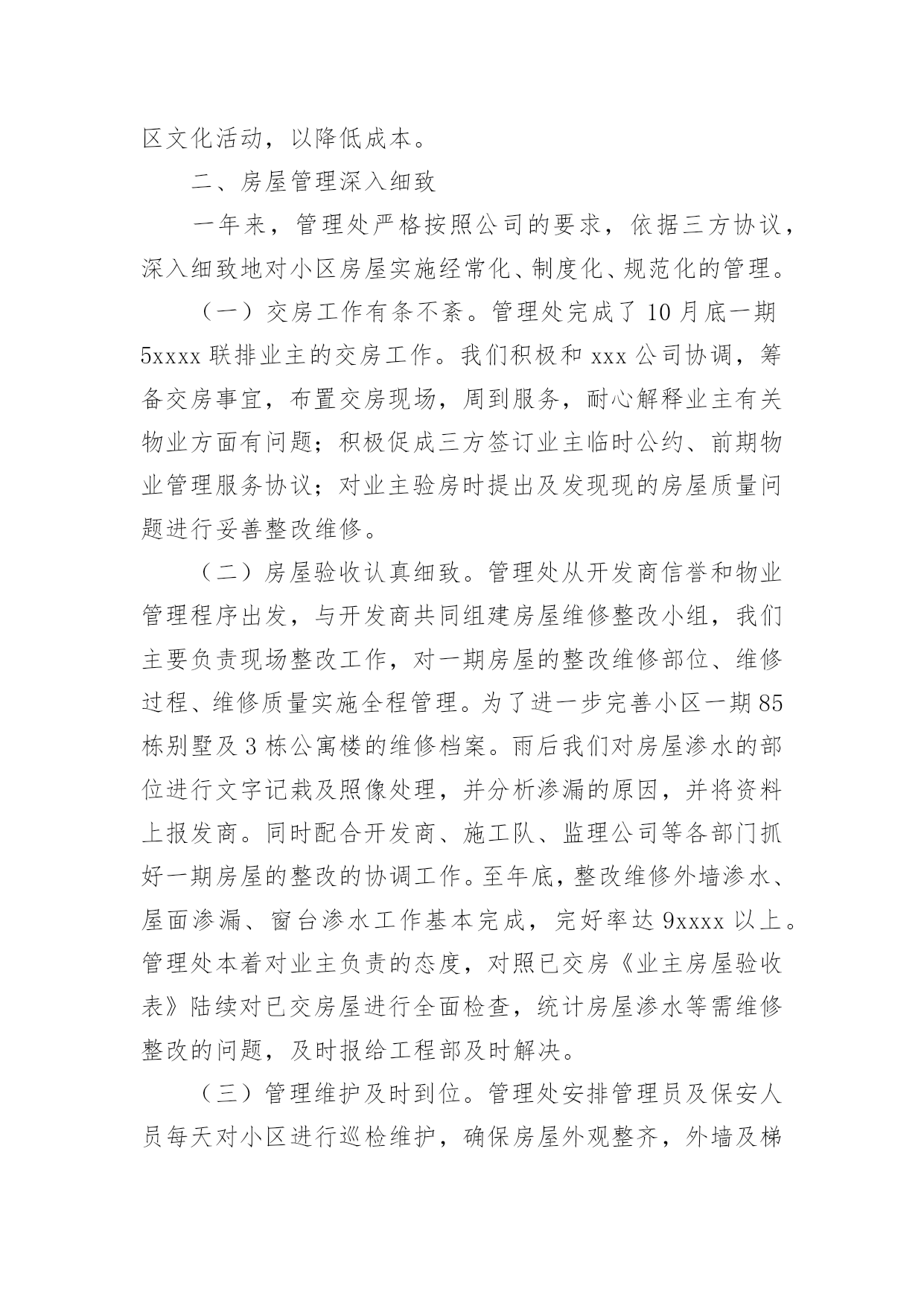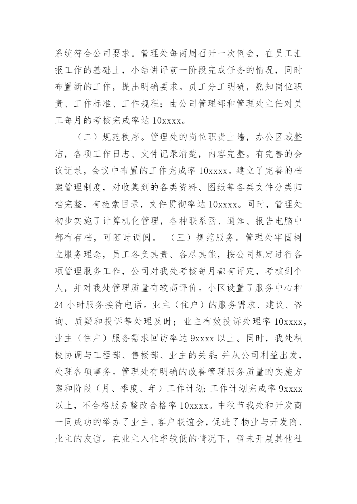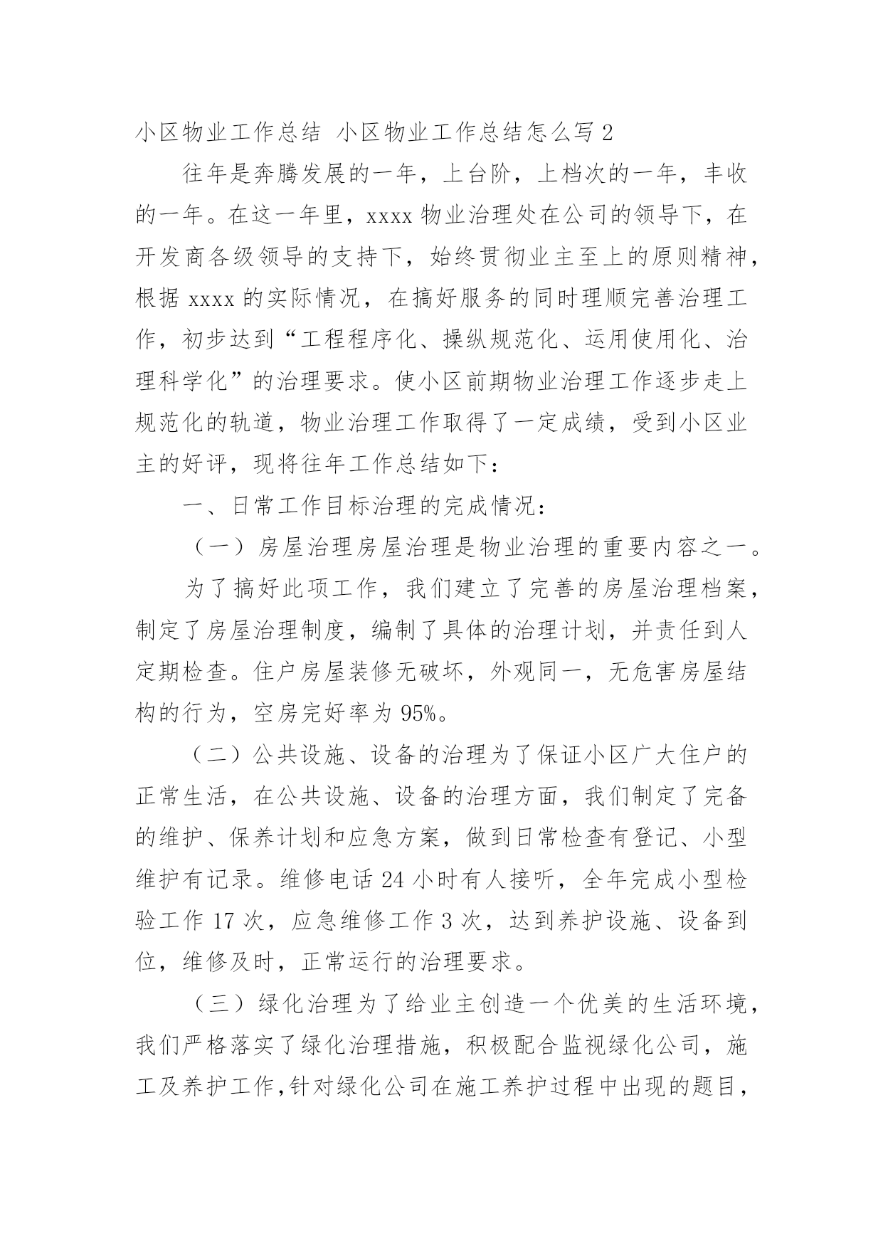 小区物业工作总结小区物业工作总结怎么写小区物业工作总结小区物业工作总结怎么写总结就是对一个时期的学习、工作或其完成情况进行一次全面系统的回顾和分析的书面材料,它可使零星的、肤浅的、表面的感性认知上升到全面的、系统的、本质的理性认识上来,我想我们需要写一份总结了吧。但是总结有什么要求呢?以下是小编为大家收集的小区物业工作总结小区物业工作总结怎么写,欢迎大家分享。小区物业工作总结小区物业工作总结怎么写120xx年,在xxx公司和xxx公司(甲方)的正确领导下,我处认真对照年初签定的目标责任书,结合小区实际,扎实工作,勤奋敬业,协调各方,周到服务,完成了年度各项工作和既定目标,具体情况一、自身建设质量提高一年来,我处强化了内部管理,从基本制度建设、员工队伍建设和服务质量建设入手,从严要求,正规管理,在提高自身建设质量上狠下功夫。(一)规范行为。管理处员工统一着装、挂牌上岗;对业主、客户服务按公司规程操作;员工按时上下班,请销假需经管理处领导批准,出勤率达10xxxx,管理处现形象识别系统符合公司要求。管理处每两周召开一次例会,在员工汇报工作的基础上,小结讲评前一阶段完成任务的情况,同时布置新的工作,提出明确要求。员工分工明确,熟知岗位职责、工作标准、工作规程;由公司管理部和管理处主任对员工每月的考核完成率达10xxxx。(二)规范秩序。管理处的岗位职责上墙,办公区域整洁,各项工作日志、文件记录清楚,内容完整。有完善的会议记录,会议中布置的工作完成率10xxxx。建立了完善的档案管理制度,对收集到的各类资料、图纸等各类文件分类归档完整,有检索目录,文件贯彻率达10xxxx。同时,管理处初步实施了计算机化管理,各种联系函、通知、报告电脑中都有存档,可随时调阅。(三)规范服务。管理处牢固树立服务理念,员工各负其责、各尽其能,按公司规定进行各项管理服务工作,公司对我处考核每月都有评定,考核到个人,并对我处管理质量有较高评价。小区设置了服务中心和24小时服务接待电话。业主(住户)的服务需求、建议、咨询、质疑和投诉等处理及时;业主有效投诉处理率10xxxx,业主(住户)服务需求回访率达9xxxx以上。同时,我处积极协调与工程部、售楼部、业主的关系;并从公司利益出发,处理各项事务。管理处有明确的改善管理服务质量的实施方案和阶段(月、季度、年)工作计划;工作计划完成率9xxxx以上,不合格服务整改合格率10xxxx。中秋节我处和开发商一同成功的举办了业主、客户联谊会,促进了物业与开发商、业主的友谊。在业主入住率较低的情况下,暂未开展其他社区文化活动,以降低成本。二、房屋管理深入细致一年来,管理处严格按照公司的要求,依据三方协议,深入细致地对小区房屋实施经常化、制度化、规范化的管理。(一)交房工作有条不紊。管理处完成了10月底一期5xxxx联排业主的交房工作。我们积极和xxx公司协调,筹备交房事宜,布置交房现场,周到服务,耐心解释业主有关物业方面有问题;积极促成三方签订业主临时公约、前期物业管理服务协议;对业主验房时提出及发现现的房屋质量问题进行妥善整改维修。(二)房屋验收认真细致。管理处从开发商信誉和物业管理程序出发,与开发商共同组建房屋维修整改小组,我们主要负责现场整改工作,对一期房屋的整改维修部位、维修过程、维修质量实施全程管理。为了进一步完善小区一期85栋别墅及3栋公寓楼的维修档案。雨后我们对房屋渗水的部位进行文字记栽及照像处理,并分析渗漏的原因,并将资料上报发商。同时配合开发商、施工队、监理公司等各部门抓好一期房屋的整改的协调工作。至年底,整改维修外墙渗水、屋面渗漏、窗台渗水工作基本完成,完好率达9xxxx以上。管理处本着对业主负责的态度,对照已交房《业主房屋验收表》陆续对已交房屋进行全面检查,统计房屋渗水等需维修整改的问题,及时报给工程部及时解决。(三)管理维护及时到位。管理处安排管理员及保安人员每天对小区进行巡检维护,确保房屋外观整齐,外墙及梯间墙面基本无污迹,公寓楼楼道在业主入住率很低的情况下,管理处安排保洁人员每月进行二次清扫保洁,以保证梯间卫生,公共区域无乱贴、乱涂、乱画现象。对正在装修的房屋,我们严格按房屋装修规定,督促业主和住户按规定进行装修,使装修协议、装修申请表、装修登记证齐全,杜绝违章情况的发生。我们严格日常巡查记录完整,对违反规划私自乱搭乱建及擅自改变房屋用途现象、破坏房屋安全情况及时劝阻、报告,并有相关记录。对小区已装修业主发生房屋渗漏的,管理处积极联系施工单位,针对业主向物业反映的问题落实维修。同时,积极上门与业主沟通、协调,就业主对维修的要求及思想动态反馈给开发商现场负责人,达成与业主的意见统一。另外,我们加强了对施工方的现场管理,及小部分工程量的核算及施工方案的检查监督、现场人员施工安全的管理等,施工队进行