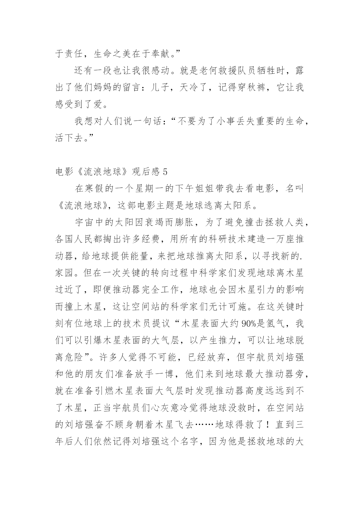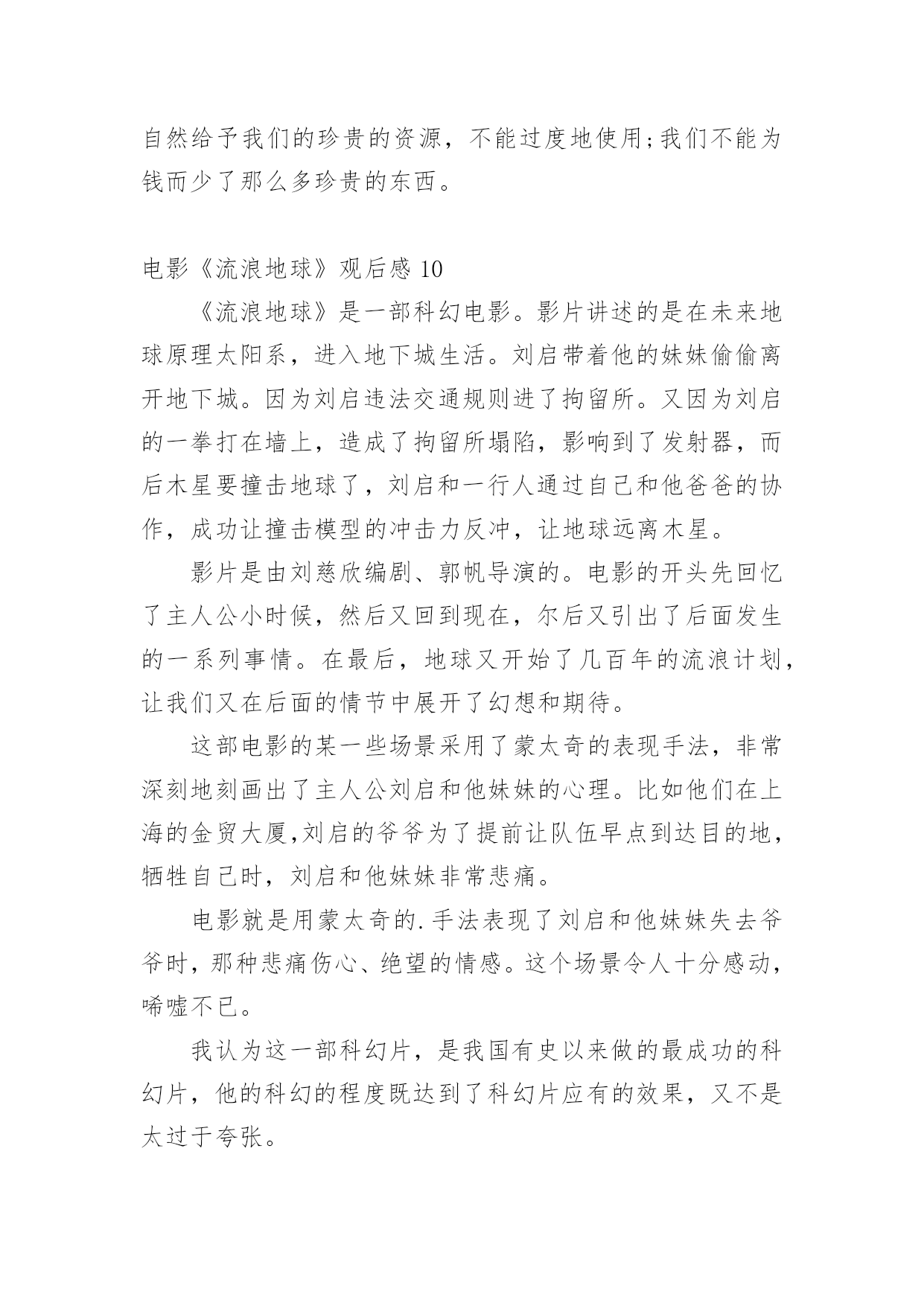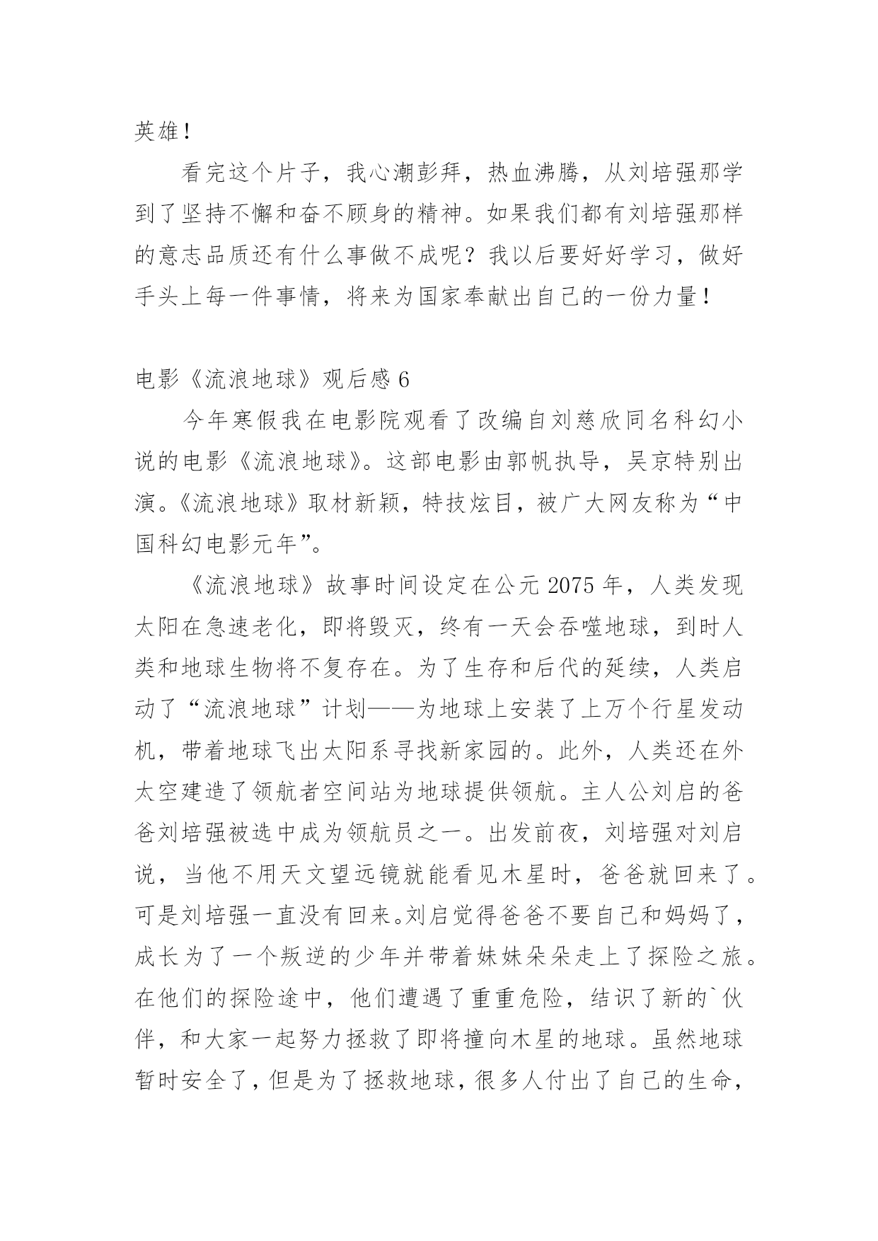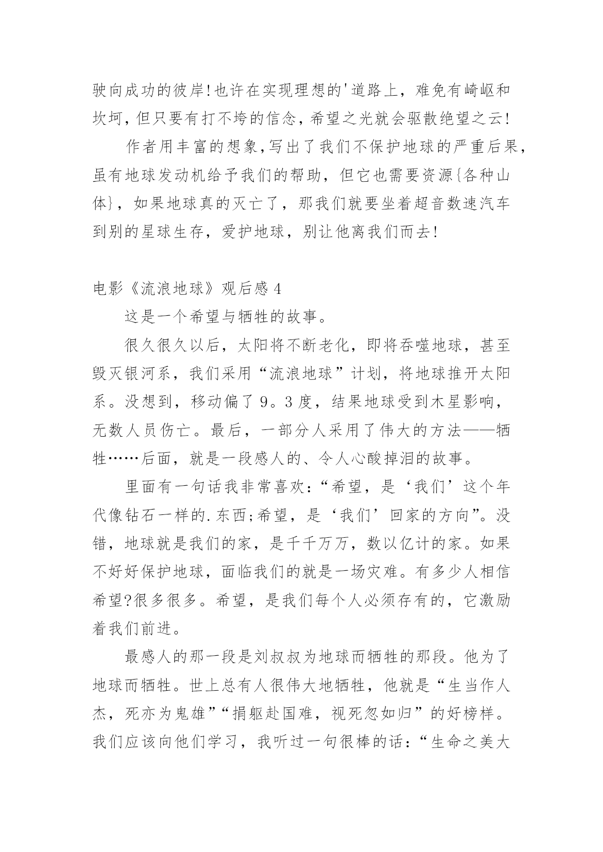 电影《流浪地球》观后感在观看完一部作品以后,你有什么总结呢?透过观影,我们可以发现一些深刻的感悟。可能你现在毫无头绪吧,下面是小编帮大家整理的电影《流浪地球》观后感,欢迎大家分享。电影《流浪地球》观后感1当太阳即将毁灭的时候,处于太阳系中的我们应该怎么办呢?不知道大家有没有想过这个问题呢?电影《流浪地球2》中的人类则开始启用流浪地球2计划,带着地球离开太阳系,寻找新家园。影片画面震撼,一起来看看网友们的感受吧!今天,我看了电影《流浪地球2》,从这部电影里,我懂得了希望是什么。在电影最后一个部分里,刘启想出了点燃木星推动地球的办法,他们的37号车里的成员分了工。韩朵朵和其他的成员一起推动接口的时候,他们的人太少,根本推不动。国际太空战里的.刘培强,联系联合国政府,想让政府把调到地下城里的汽车再派回去,帮助韩朵朵他们一起推动接口。但联合国政府没有答应他的请求,不过答应了他在全球播放韩朵朵的讲话。韩朵朵说了这样一段话:“昨天,我的老师还在讲希望,那个时候,我不认为这个世界上有希望,但是今天,我知道了什么是希望,希望就是像班长说的那样,在生活中像钻石样宝贵的东西,现在我们需要希望,回来吧!和我们一起战斗吧!”通过这段话,我懂得了什么是希望,希望就是在我们生活中像钻石一样宝贵的东西,如果哪一天我们的世界,也变成了流浪地球2那样的地方,摆在我们面前的只有牺牲和希望,我们宁愿选择希望,牺牲的话,我们全都得牺牲;但如果选择了希望,我们就可以牺牲更少的人,有更多的人存活下来,保留人类的文明。我看了这个电影,深有感触;我也通过这个电影,懂得了什么是希望。电影《流浪地球》观后感2今天,我的父母带我去看了一部名为《流浪的地球》的电影。看完之后,我既感动又感动。感动的是,为了让木星爆炸的压力推动地球离开,刘琦的父亲先把驾驶舱和休眠舱分开,然后开着驾驶舱引爆木星;感动的是多多关于希望的话;感动的是,每个人都在为希望而奋斗......地球是多么美丽,但电影中的地球却让人感到不寒而栗。没有花草树木,没有鸟语花香,没有名胜古迹,没有新鲜空气......有些是倒塌的建筑,冻结的人,和极其寒冷的天气,你可以想象地球的环境有多重要,我们必须保护环境,以防止太阳被摧毁。刘培强非常爱儿子,他为儿子和父亲争取免抽签进入地下城的资格。为了人类未来的命运,作为一名宇航员,他义不容辞地去了太空。在太空站,他每天都想念儿子,这种力量也给了他引爆木星的勇气。一开始,太空站里的.每个人都可以搬到其他星球,地球被摧毁了,但他没有放弃希望,最后牺牲自己来保护每个人,这是一种伟大的爱,一种值得我致敬的伟大爱。看完这部电影后,我不仅震惊了这部电影的大片,而且被每个人的质量所深深吸引。我想,无论我将来遇到什么,我都会充满希望,即使只有微不足道的希望,我相信只要我努力工作,我就会成功,就会有奇迹。同时,我们也应该珍惜自然资源,不要过度开采、收集,以免出现电影中的场景。电影《流浪地球》观后感3一、二、三、抬头。《流浪地球》写了地球航出了冥王星轨道,航出了太阳系,在寒冷的外太空继续着它孤独的逃亡生涯……看到这里,让我不禁佩服起作者刘慈欣,佩服起他对宇宙的认知,他真是把科幻描绘的像真的一样;通过他的想象,他发明了地球发动机,它的威力非常大,可以照亮北半球,当在太阳爆炸的时刻地球发动机能够帮助人类逃亡太阳系,逃到其它恒星上寻找可生存的地方。“地球派”和“飞船派”是两队死对头。这些“角色”在情节中不断闪现,而就是这些“角色”为文章增添了许多色彩人就要有丰富的想象,想像是成功的一半,只有美好的遐想是不行的,只有通过我们的努力才能得以实现,才能够驶向成功的彼岸!也许在实现理想的'道路上,难免有崎岖和坎坷,但只要有打不垮的信念,希望之光就会驱散绝望之云!作者用丰富的想象,写出了我们不保护地球的严重后果,虽有地球发动机给予我们的帮助,但它也需要资源{各种山体},如果地球真的灭亡了,那我们就要坐着超音数速汽车到别的星球生存,爱护地球,别让他离我们而去!电影《流浪地球》观后感4这是一个希望与牺牲的故事。很久很久以后,太阳将不断老化,即将吞噬地球,甚至毁灭银河系,我们采用“流浪地球”计划,将地球推开太阳系。没想到,移动偏了9。3度,结果地球受到木星影响,无数人员伤亡。最后,一部分人采用了伟大的方法——牺牲……后面,就是一段感人的、令人心酸掉泪的故事。里面有一句话我非常喜欢:“希望,是‘我们’这个年代像钻石一样的.东西;希望,是‘我们’回家的方向”。没错,地球就是我们的家,是千千万万,数以亿计的家。如果不好好保护地球,面临我们的就是一场灾难。有多少人相信希望?很多很多。希望,是我们每个人必须存有的,它激励着我们前进。最感人的那一段是刘叔叔为地球而牺牲的那段。他为了地球而牺牲。世上总有人很伟大地牺牲,他就是“生当作人杰