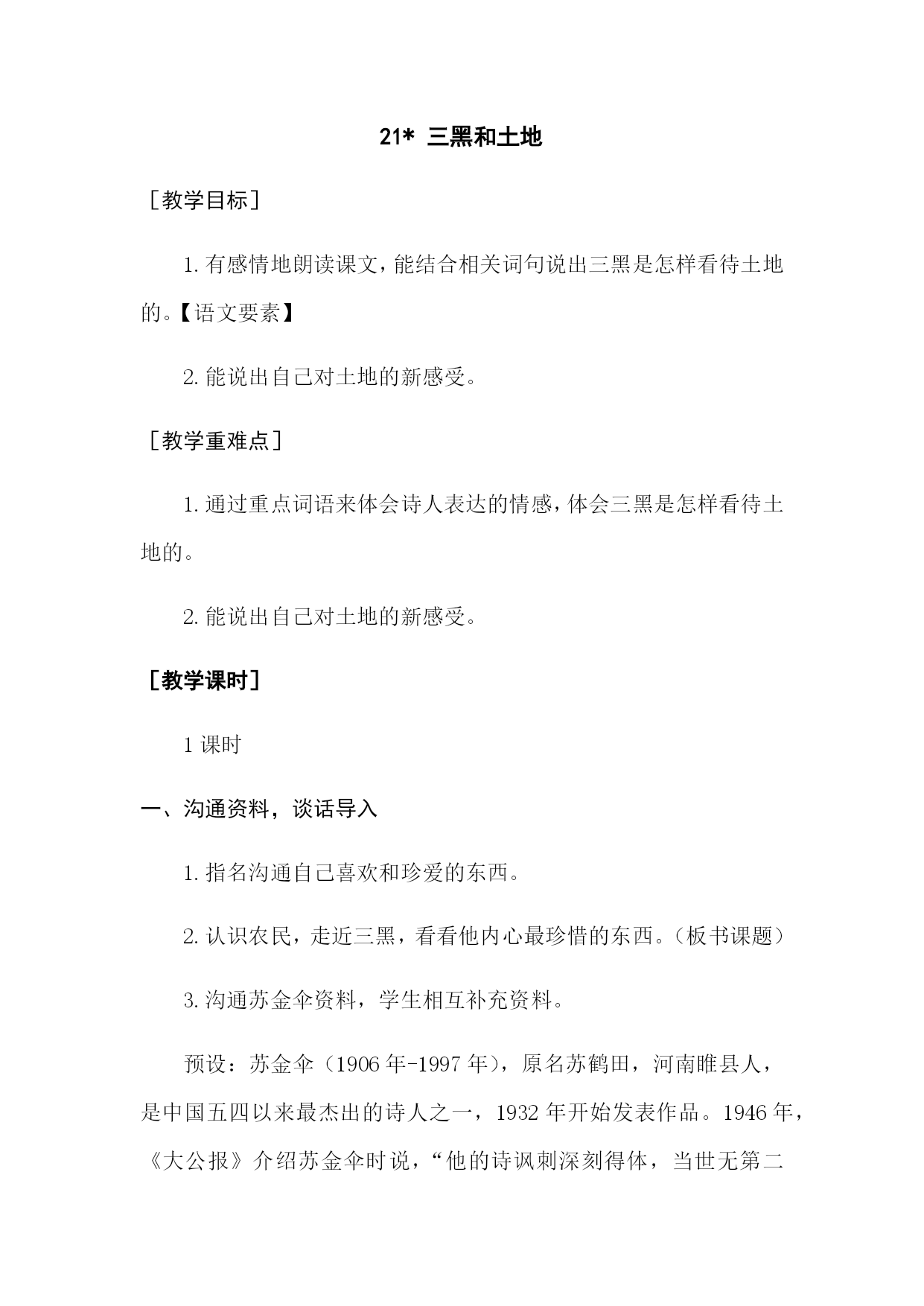 21*三黑和土地[教学目标]1.有感情地朗读课文,能结合相关词句说出三黑是怎样看待土地的。【语文要素】2.能说出自己对土地的新感受。[教学重难点]1.通过重点词语来体会诗人表达的情感,体会三黑是怎样看待土地的。2.能说出自己对土地的新感受。[教学课时]1课时一、沟通资料,谈话导入1.指名沟通自己喜欢和珍爱的东西。2.认识农民,走近三黑,看看他内心最珍惜的东西。(板书课题)3.沟通苏金伞资料,学生相互补充资料。预设:苏金伞(1906年-1997年),原名苏鹤田,河南睢县人,是中国五四以来最杰出的诗人之一,1
