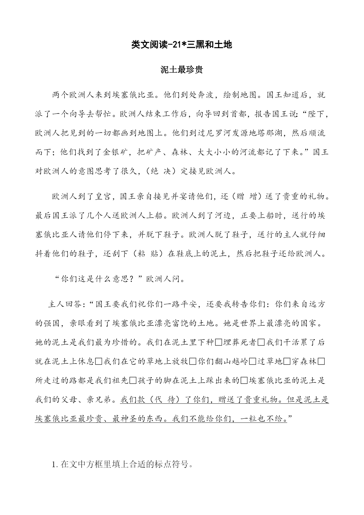 类文阅读-21*三黑和土地泥土最珍贵两个欧洲人来到埃塞俄比亚。他们到处奔波,绘制地图。国王知道后,就派了一个向导去帮忙。欧洲人结束工作后,向导回到首都,报告国王说:“陛下,欧洲人把见到的一切都画到地图上。他们到过尼罗河发源地塔那湖,然后顺流而下;他们找到了金银矿,把矿产、森林、大大小小的河流都记了下来。”国王对欧洲人的意图思考了很久,(绝决)定接见欧洲人。欧洲人到了皇宫,国王亲自接见并宴请他们,还(赠增)送了贵重的礼物。最后国王派了几个人送欧洲人上船。欧洲人到了河边,正要上船时,送行的埃塞俄比亚人请他们停