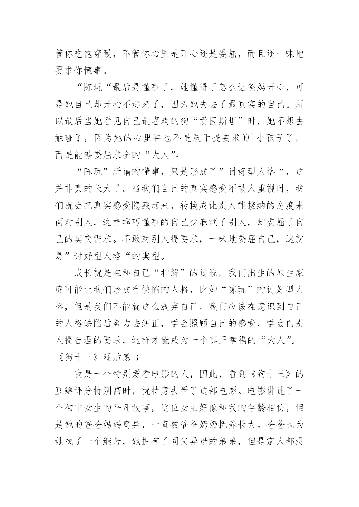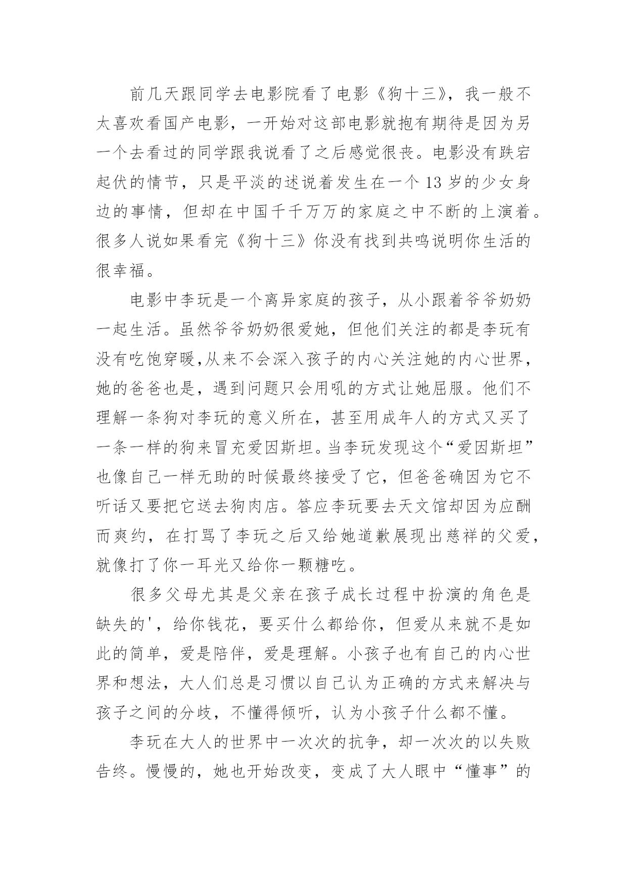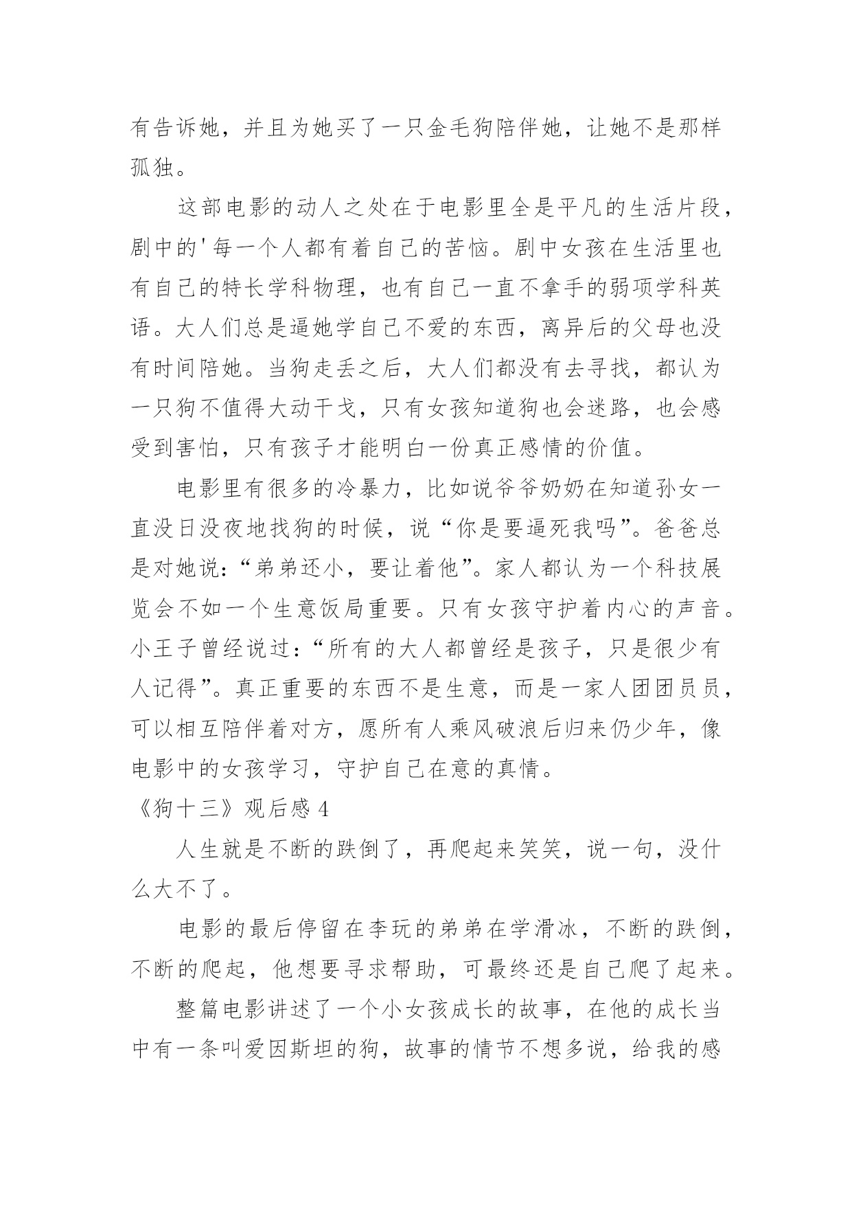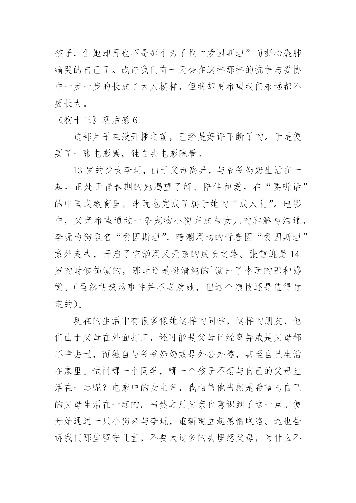 《狗十三》观后感《狗十三》观后感(精选8篇)当品味完一部影视作品后,想必你有不少可以分享的东西,这时候十分有必须要写一篇观后感了!到底应如何写观后感呢?下面是小编为大家整理的《狗十三》观后感,欢迎大家借鉴与参考,希望对大家有所帮助。《狗十三》观后感1看完电影,我有点忘了它讲了啥。因为电影的内容离我有点远。在我的生活中,家长是体贴温暖的,他们眼中的我也没有那么叛逆。很多时候,我并不懂事,而我的家长似乎也从来没有用“懂事”来要求我。我的妈妈,看起来,和我的智商情商都差不多。比如,最近的我迷上了辩论。妈妈就会和我一起看《奇葩说》,看大专辩论会,还会给我讲她经历过的辩论赛。有时候,我的观点过激了,或者我的`胜负欲太强烈了。妈妈也会通过对辩题正反两方面的思考来打动我,会讲很多故事来影响我。这不,刚过去的这个周末,我终于不那么在乎输赢了。很多时候,我都激动的要命了,词不达意的挥舞着拳头要争吵起来,而妈妈总是不温不火,渐渐地,我就会被她“传染”了,也就把那些执念忘记了。和电影里的小女孩不一样,我的家庭是充满温暖的。每一个人的家庭生活都是一部青春成长电影。我从来没有挨过打,也没有被忽略过。在我们家里,大家有话就说,有时候,我的观点也能被采纳。你要是以为妈妈溺爱我,那你们就错了。妈妈是很溺爱我。真好!哈哈!开个玩笑了,妈妈还是比较有数的,谁让她读了那么多书呢。不过,这倒是和电影里那个张哥的人设有点相似。哈哈!哦,对了。看完电影,我要把《时间简史》买回来了。我真的很喜欢物理!我要研究平行空间!我要学物理!好了,我就凑了这么一篇观后感。因为,我和李玩太不一样的。我去网上买书了,再见!《狗十三》观后感2这是一部能引起很多90后女孩共鸣的电影。女主角“陈玩”出生在一个普通家庭,爸爸忙于工作,她从小让爷爷奶奶带大,身边很少有人关心她,唯一能陪伴她的只有小狗和电视。女主角“陈玩”真是现实生活中很多孩子的缩影。父母给了她充足的物质生活,却很少耐心地对待过她的感受。“陈玩”最喜欢的小狗丢了,一家人面面相觑,却连找都没帮她找;“陈玩”父亲为了和领导喝酒,耽误了陪“陈玩”去看天文展的时间,结果她心心念念的天文展没看成;“陈玩”父亲为了在领导面前有面子,让不会喝酒的女儿给领导敬酒······这就是传统的中国式家长的作风,他们只管你吃饱穿暖,不管你心里是开心还是委屈,而且还一味地要求你懂事。“陈玩“最后是懂事了,她懂得了怎么让爸妈开心,可是她自己却开心不起来了,因为她失去了最真实的自己。所以最后当她看见自己最喜欢的狗“爱因斯坦”时,她不想去触碰了,因为她的心里再也不是敢于提要求的`小孩子了,而是能够委屈求全的“大人”。“陈玩”所谓的懂事,只是形成了”讨好型人格“,这并非真的长大了。当我们自己的真实感受不被人重视时,我们就会把真实感受隐藏起来,转换成让别人能接纳的态度来面对别人,这样乖巧懂事的自己少麻烦了别人,却委屈了自己的真实需求。不敢对别人提要求,一味地委屈自己,这就是”讨好型人格“的典型。成长就是在和自己“和解”的过程,我们出生的原生家庭可能让我们形成有缺陷的人格,比如“陈玩”的讨好型人格,但是我们不能就这么放弃自己。我们应该在意识到自己的人格缺陷后努力去纠正,学会照顾自己的感受,学会向别人提合理的要求,这样才能成为一个真正幸福的“大人”。《狗十三》观后感3我是一个特别爱看电影的人,因此,看到《狗十三》的豆瓣评分特别高时,就特意去看了这部电影。电影讲述了一个初中女生的平凡故事,这位女主好像和我的年龄相仿,但是她的爸爸妈妈离异,一直被爷爷奶奶抚养长大。爸爸也为她找了一个继母,她拥有了同父异母的弟弟,但是家人都没有告诉她,并且为她买了一只金毛狗陪伴她,让她不是那样孤独。这部电影的动人之处在于电影里全是平凡的生活片段,剧中的'每一个人都有着自己的苦恼。剧中女孩在生活里也有自己的特长学科物理,也有自己一直不拿手的弱项学科英语。大人们总是逼她学自己不爱的东西,离异后的父母也没有时间陪她。当狗走丢之后,大人们都没有去寻找,都认为一只狗不值得大动干戈,只有女孩知道狗也会迷路,也会感受到害怕,只有孩子才能明白一份真正感情的价值。电影里有很多的冷暴力,比如说爷爷奶奶在知道孙女一直没日没夜地找狗的时候,说“你是要逼死我吗”。爸爸总是对她说:“弟弟还小,要让着他”。家人都认为一个科技展览会不如一个生意饭局重要。只有女孩守护着内心的声音。小王子曾经说过:“所有的大人都曾经是孩子,只是很少有人记得”。真正重要的东西不是生意,而是一家人团团员员,可以相互陪伴着对方,愿所有人乘风破浪后归来仍少年,像电影中的女孩学习,守护自己在意的真情。《狗十三》观后感4人生就是不断的跌倒了,再爬起来笑笑,说一句,没什么大不了。电影的最后停留在李玩的弟弟在学滑冰,不断的跌倒,不断的爬起,他想要寻求帮助,可最