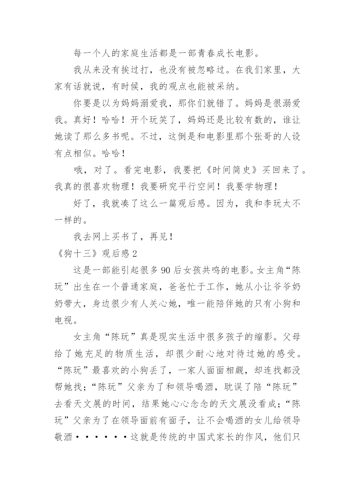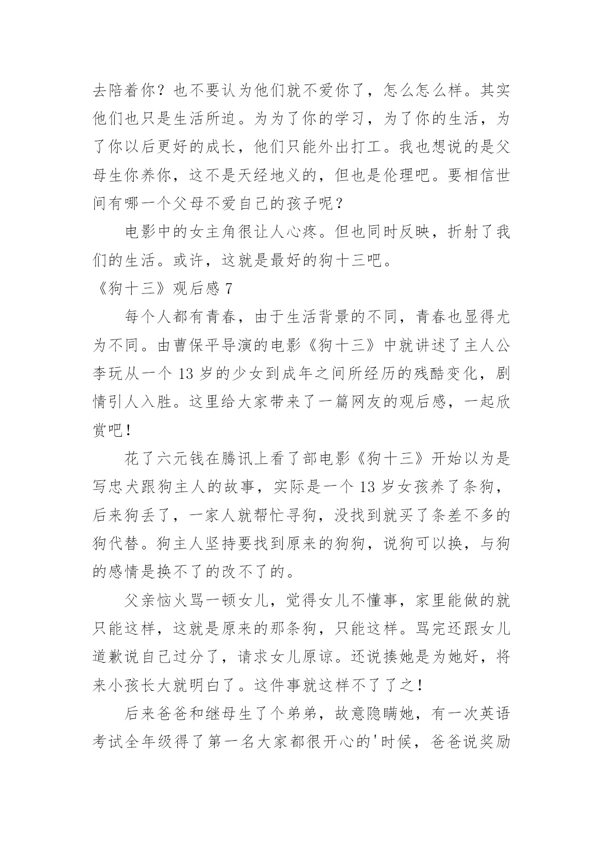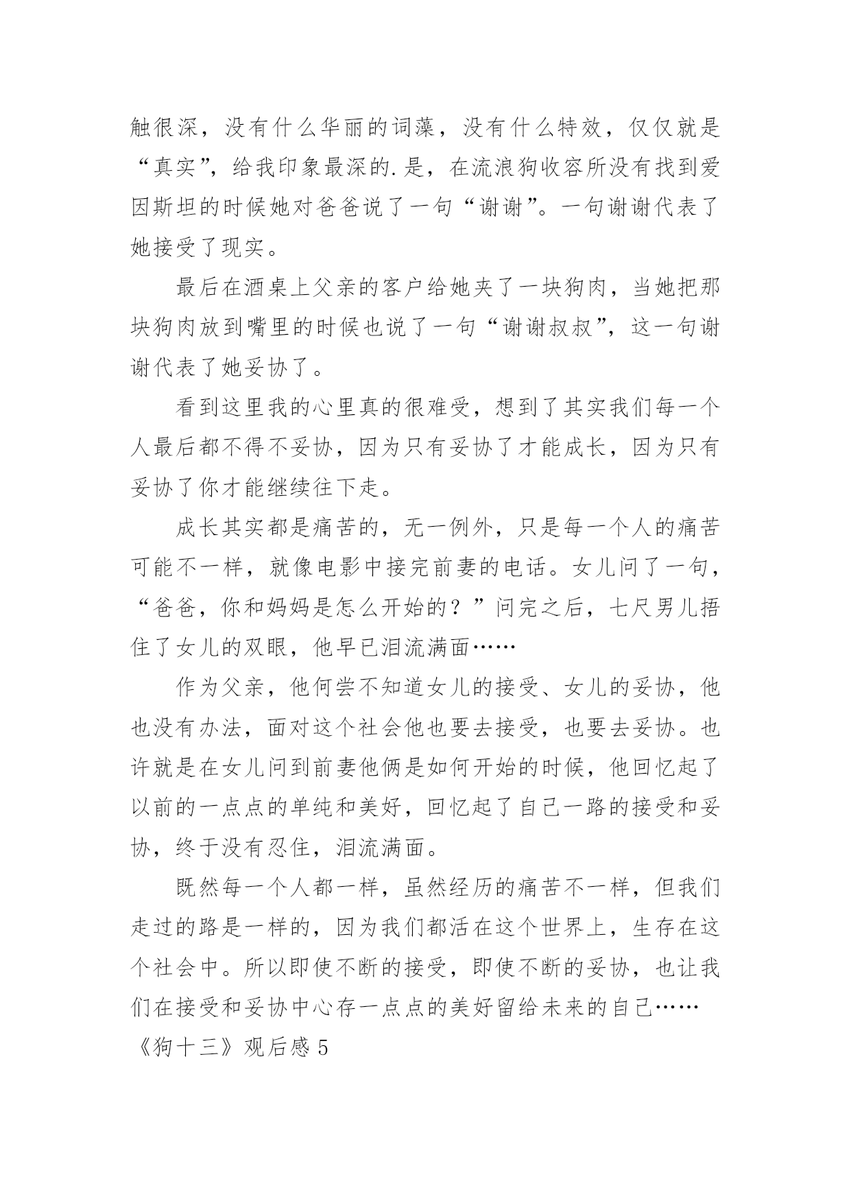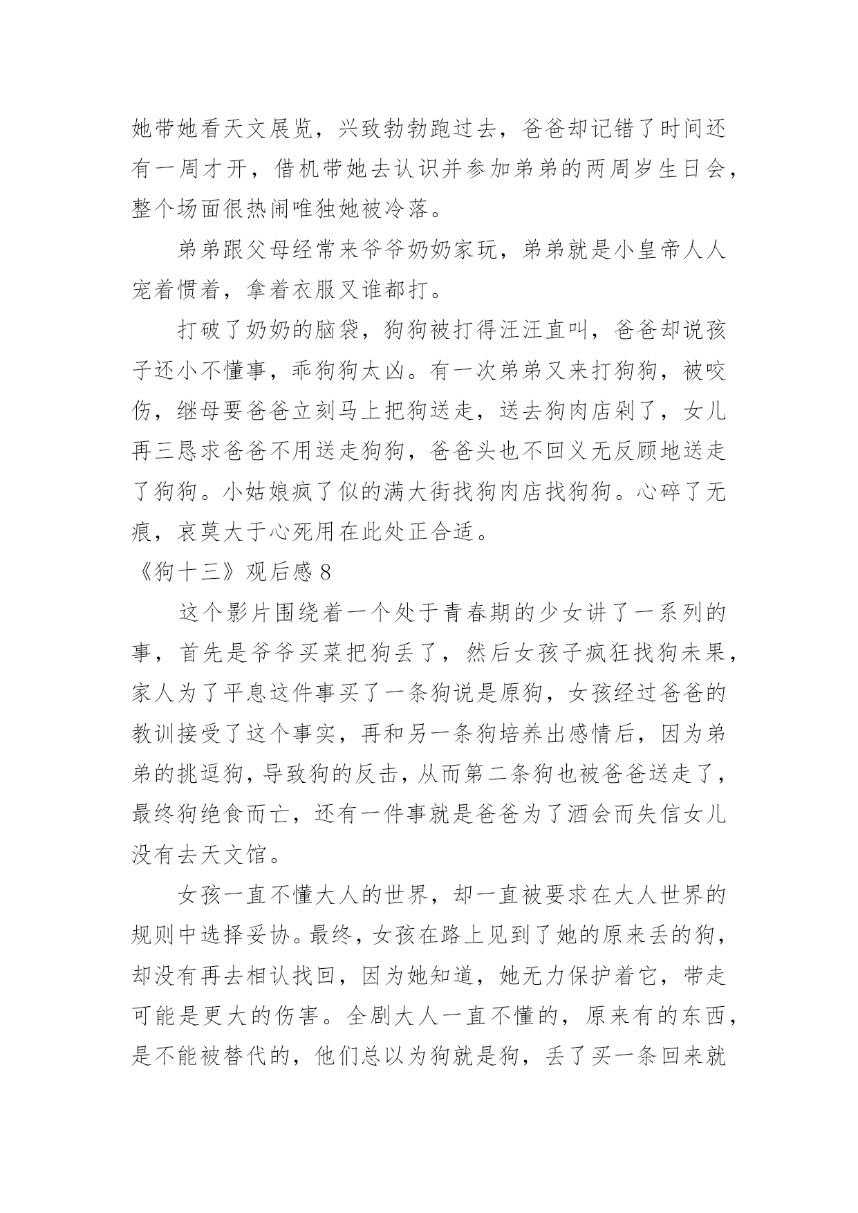 《狗十三》观后感《狗十三》观后感(精选8篇)当品味完一部影视作品后,想必你有不少可以分享的东西,这时候十分有必须要写一篇观后感了!到底应如何写观后感呢?下面是小编为大家整理的《狗十三》观后感,欢迎大家借鉴与参考,希望对大家有所帮助。《狗十三》观后感1看完电影,我有点忘了它讲了啥。因为电影的内容离我有点远。在我的生活中,家长是体贴温暖的,他们眼中的我也没有那么叛逆。很多时候,我并不懂事,而我的家长似乎也从来没有用“懂事”来要求我。我的妈妈,看起来,和我的智商情商都差不多。比如,最近的我迷上了辩论。妈妈就会和我一起看《奇葩说》,看大专辩论会,还会给我讲她经历过的辩论赛。有时候,我的观点过激了,或者我的`胜负欲太强烈了。妈妈也会通过对辩题正反两方面的思考来打动我,会讲很多故事来影响我。这不,刚过去的这个周末,我终于不那么在乎输赢了。很多时候,我都激动的要命了,词不达意的挥舞着拳头要争吵起来,而妈妈总是不温不火,渐渐地,我就会被她“传染”了,也就把那些执念忘记了。和电影里的小女孩不一样,我的家庭是充满温暖的。每一个人的家庭生活都是一部青春成长电影。我从来没有挨过打,也没有被忽略过。在我们家里,大家有话就说,有时候,我的观点也能被采纳。你要是以为妈妈溺爱我,那你们就错了。妈妈是很溺爱我。真好!哈哈!开个玩笑了,妈妈还是比较有数的,谁让她读了那么多书呢。不过,这倒是和电影里那个张哥的人设有点相似。哈哈!哦,对了。看完电影,我要把《时间简史》买回来了。我真的很喜欢物理!我要研究平行空间!我要学物理!好了,我就凑了这么一篇观后感。因为,我和李玩太不一样的。我去网上买书了,再见!《狗十三》观后感2这是一部能引起很多90后女孩共鸣的电影。女主角“陈玩”出生在一个普通家庭,爸爸忙于工作,她从小让爷爷奶奶带大,身边很少有人关心她,唯一能陪伴她的只有小狗和电视。女主角“陈玩”真是现实生活中很多孩子的缩影。父母给了她充足的物质生活,却很少耐心地对待过她的感受。“陈玩”最喜欢的小狗丢了,一家人面面相觑,却连找都没帮她找;“陈玩”父亲为了和领导喝酒,耽误了陪“陈玩”去看天文展的时间,结果她心心念念的天文展没看成;“陈玩”父亲为了在领导面前有面子,让不会喝酒的女儿给领导敬酒······这就是传统的中国式家长的作风,他们只管你吃饱穿暖,不管你心里是开心还是委屈,而且还一味地要求你懂事。“陈玩“最后是懂事了,她懂得了怎么让爸妈开心,可是她自己却开心不起来了,因为她失去了最真实的自己。所以最后当她看见自己最喜欢的狗“爱因斯坦”时,她不想去触碰了,因为她的心里再也不是敢于提要求的`小孩子了,而是能够委屈求全的“大人”。“陈玩”所谓的懂事,只是形成了”讨好型人格“,这并非真的长大了。当我们自己的真实感受不被人重视时,我们就会把真实感受隐藏起来,转换成让别人能接纳的态度来面对别人,这样乖巧懂事的自己少麻烦了别人,却委屈了自己的真实需求。不敢对别人提要求,一味地委屈自己,这就是”讨好型人格“的典型。成长就是在和自己“和解”的过程,我们出生的原生家庭可能让我们形成有缺陷的人格,比如“陈玩”的讨好型人格,但是我们不能就这么放弃自己。我们应该在意识到自己的人格缺陷后努力去纠正,学会照顾自己的感受,学会向别人提合理的要求,这样才能成为一个真正幸福的“大人”。《狗十三》观后感3我是一个特别爱看电影的人,因此,看到《狗十三》的豆瓣评分特别高时,就特意去看了这部电影。电影讲述了一个初中女生的平凡故事,这位女主好像和我的年龄相仿,但是她的爸爸妈妈离异,一直被爷爷奶奶抚养长大。爸爸也为她找了一个继母,她拥有了同父异母的弟弟,但是家人都没有告诉她,并且为她买了一只金毛狗陪伴她,让她不是那样孤独。这部电影的动人之处在于电影里全是平凡的生活片段,剧中的'每一个人都有着自己的苦恼。剧中女孩在生活里也有自己的特长学科物理,也有自己一直不拿手的弱项学科英语。大人们总是逼她学自己不爱的东西,离异后的父母也没有时间陪她。当狗走丢之后,大人们都没有去寻找,都认为一只狗不值得大动干戈,只有女孩知道狗也会迷路,也会感受到害怕,只有孩子才能明白一份真正感情的价值。电影里有很多的冷暴力,比如说爷爷奶奶在知道孙女一直没日没夜地找狗的时候,说“你是要逼死我吗”。爸爸总是对她说:“弟弟还小,要让着他”。家人都认为一个科技展览会不如一个生意饭局重要。只有女孩守护着内心的声音。小王子曾经说过:“所有的大人都曾经是孩子,只是很少有人记得”。真正重要的东西不是生意,而是一家人团团员员,可以相互陪伴着对方,愿所有人乘风破浪后归来仍少年,像电影中的女孩学习,守护自己在意的真情。《狗十三》观后感4人生就是不断的跌倒了,再爬起来笑笑,说一句,没什么大不了。电影的最后停留在李玩的弟弟在学滑冰,不断的跌倒,不断的爬起,他想要寻求帮助,可最