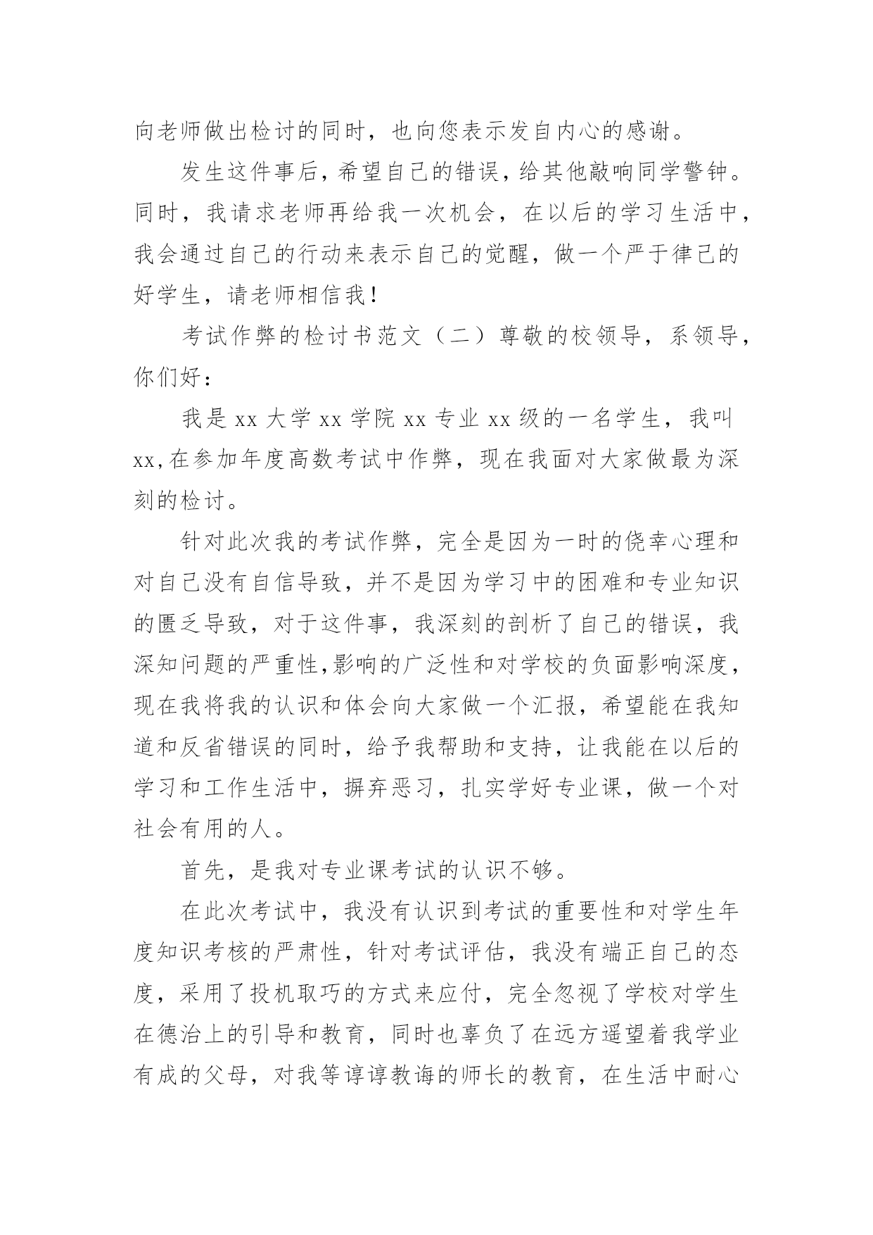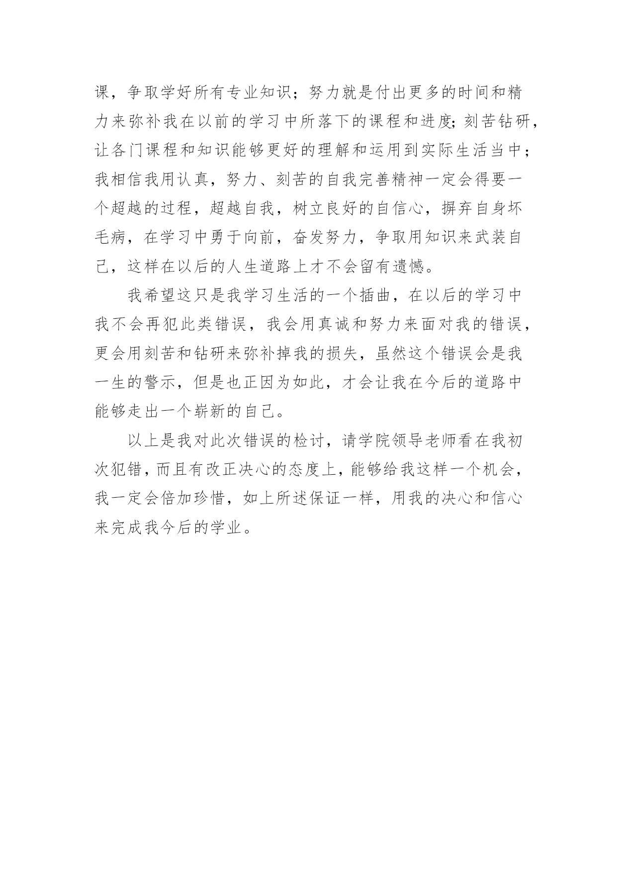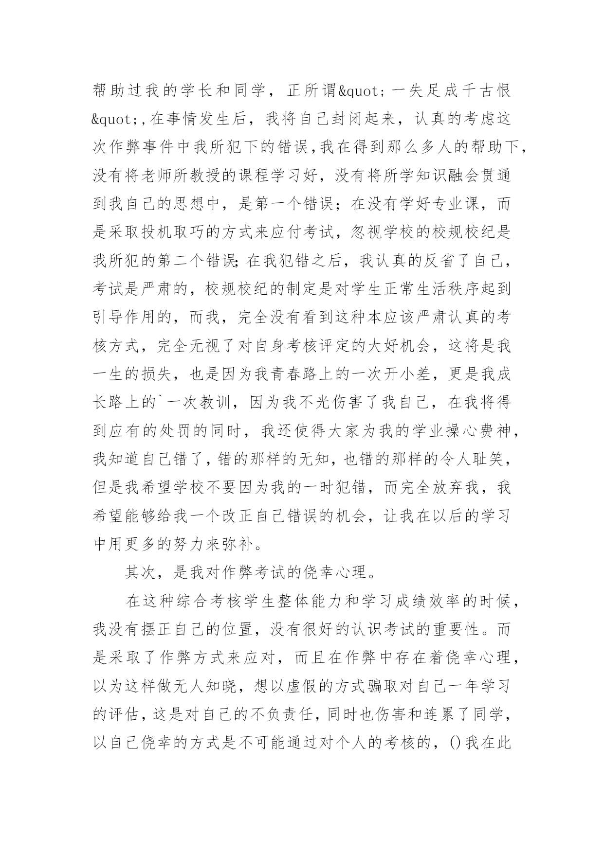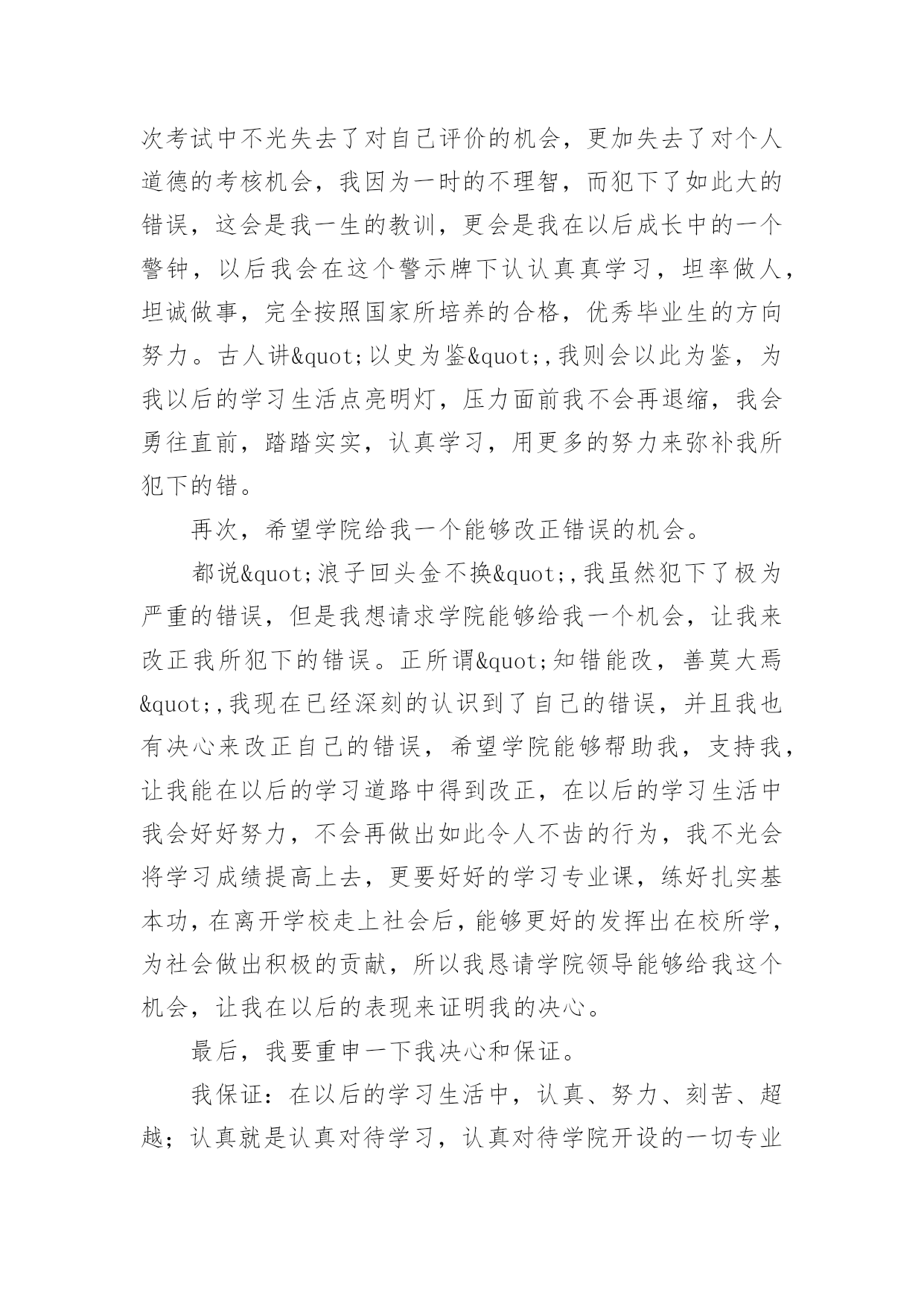 考试的作弊的检讨书考试的作弊的检讨书考试作弊的检讨书范文(一)敬爱的X老师:我怀着十二万分的愧疚以及十二万分的懊悔向你们写下这份检讨书,我为自己的行为感到了深深地愧疚和不安,在此,我向老师做出深刻检讨:通过这件事,我感到这虽然是一件偶然发生的事情,但同时也是长期以来对考试纪律不重视的必然结果。自己身为学生,应该严以律已,对自己严格要求!然而自己却不能正确地帮助同学,给其他同学带来了恶劣的影响;虽然自己并非有意。可是,由于自己的错误,给学校风气带来了严重的不良影响,后果不堪设想~~~这也说明,我对自己的学习生活没有足够的自律心,也没有把学校要求切实做到,没有真正理解学校和老师良苦用心。在自己的思想中,没有对"义气"有真正的理解。现在,我深深感到,这是一个非常危险的倾向,也是一个极其重要的.苗头。因此,这次发生的事使我不仅感到是自己的耻辱,更为重要的是我感到对不起老师对我的信任,愧对老师的关心。同时,要诚心的谢谢老师,如果不是老师及时发现,并要求自己深刻反省,而帮助其他同学继续放纵和发展,那么,后果是极其严重的。因此,通过这件事,在深感痛心的同时,我也感到了幸运,感到了自己觉醒的及时,这在我今后的人生成长道路上,无疑是一次关键的转折。所以,在此,我在向老师做出检讨的同时,也向您表示发自内心的感谢。发生这件事后,希望自己的错误,给其他敲响同学警钟。同时,我请求老师再给我一次机会,在以后的学习生活中,我会通过自己的行动来表示自己的觉醒,做一个严于律己的好学生,请老师相信我!考试作弊的检讨书范文(二)尊敬的校领导,系领导,你们好:我是xx大学xx学院xx专业xx级的一名学生,我叫xx,在参加年度高数考试中作弊,现在我面对大家做最为深刻的检讨。针对此次我的考试作弊,完全是因为一时的侥幸心理和对自己没有自信导致,并不是因为学习中的困难和专业知识的匮乏导致,对于这件事,我深刻的剖析了自己的错误,我深知问题的严重性,影响的广泛性和对学校的负面影响深度,现在我将我的认识和体会向大家做一个汇报,希望能在我知道和反省错误的同时,给予我帮助和支持,让我能在以后的学习和工作生活中,摒弃恶习,扎实学好专业课,做一个对社会有用的人。首先,是我对专业课考试的认识不够。在此次考试中,我没有认识到考试的重要性和对学生年度知识考核的严肃性,针对考试评估,我没有端正自己的态度,采用了投机取巧的方式来应付,完全忽视了学校对学生在德治上的引导和教育,同时也辜负了在远方遥望着我学业有成的父母,对我等谆谆教诲的师长的教育,在生活中耐心帮助过我的学长和同学,正所谓"一失足成千古恨",在事情发生后,我将自己封闭起来,认真的考虑这次作弊事件中我所犯下的错误,我在得到那么多人的帮助下,没有将老师所教授的课程学习好,没有将所学知识融会贯通到我自己的思想中,是第一个错误;在没有学好专业课,而是采取投机取巧的方式来应付考试,忽视学校的校规校纪是我所犯的第二个错误;在我犯错之后,我认真的反省了自己,考试是严肃的,校规校纪的制定是对学生正常生活秩序起到引导作用的,而我,完全没有看到这种本应该严肃认真的考核方式,完全无视了对自身考核评定的大好机会,这将是我一生的损失,也是因为我青春路上的一次开小差,更是我成长路上的`一次教训,因为我不光伤害了我自己,在我将得到应有的处罚的同时,我还使得大家为我的学业操心费神,我知道自己错了,错的那样的无知,也错的那样的令人耻笑,但是我希望学校不要因为我的一时犯错,而完全放弃我,我希望能够给我一个改正自己错误的机会,让我在以后的学习中用更多的努力来弥补。其次,是我对作弊考试的侥幸心理。在这种综合考核学生整体能力和学习成绩效率的时候,我没有摆正自己的位置,没有很好的认识考试的重要性。而是采取了作弊方式来应对,而且在作弊中存在着侥幸心理,以为这样做无人知晓,想以虚假的方式骗取对自己一年学习的评估,这是对自己的不负责任,同时也伤害和连累了同学,以自己侥幸的方式是不可能通过对个人的考核的,()我在此次考试中不光失去了对自己评价的机会,更加失去了对个人道德的考核机会,我因为一时的不理智,而犯下了如此大的错误,这会是我一生的教训,更会是我在以后成长中的一个警钟,以后我会在这个警示牌下认认真真学习,坦率做人,坦诚做事,完全按照国家所培养的合格,优秀毕业生的方向努力。古人讲"以史为鉴",我则会以此为鉴,为我以后的学习生活点亮明灯,压力面前我不会再退缩,我会勇往直前,踏踏实实,认真学习,用更多的努力来弥补我所犯下的错。再次,希望学院给我一个能够改正错误的机会。都说"浪子回头金不换",我虽然犯下了极为严重的错误,但是我想请求学院能够给我一个机会,让我来改正我所犯下的错误。正所谓"知错能改,善