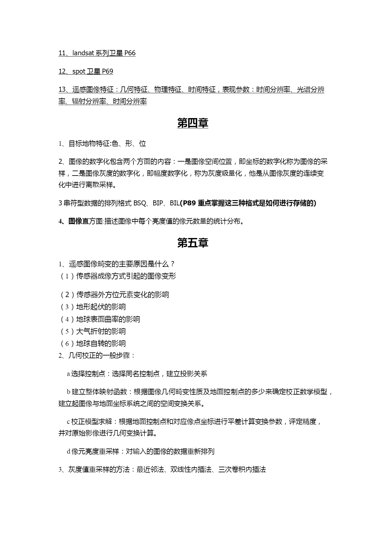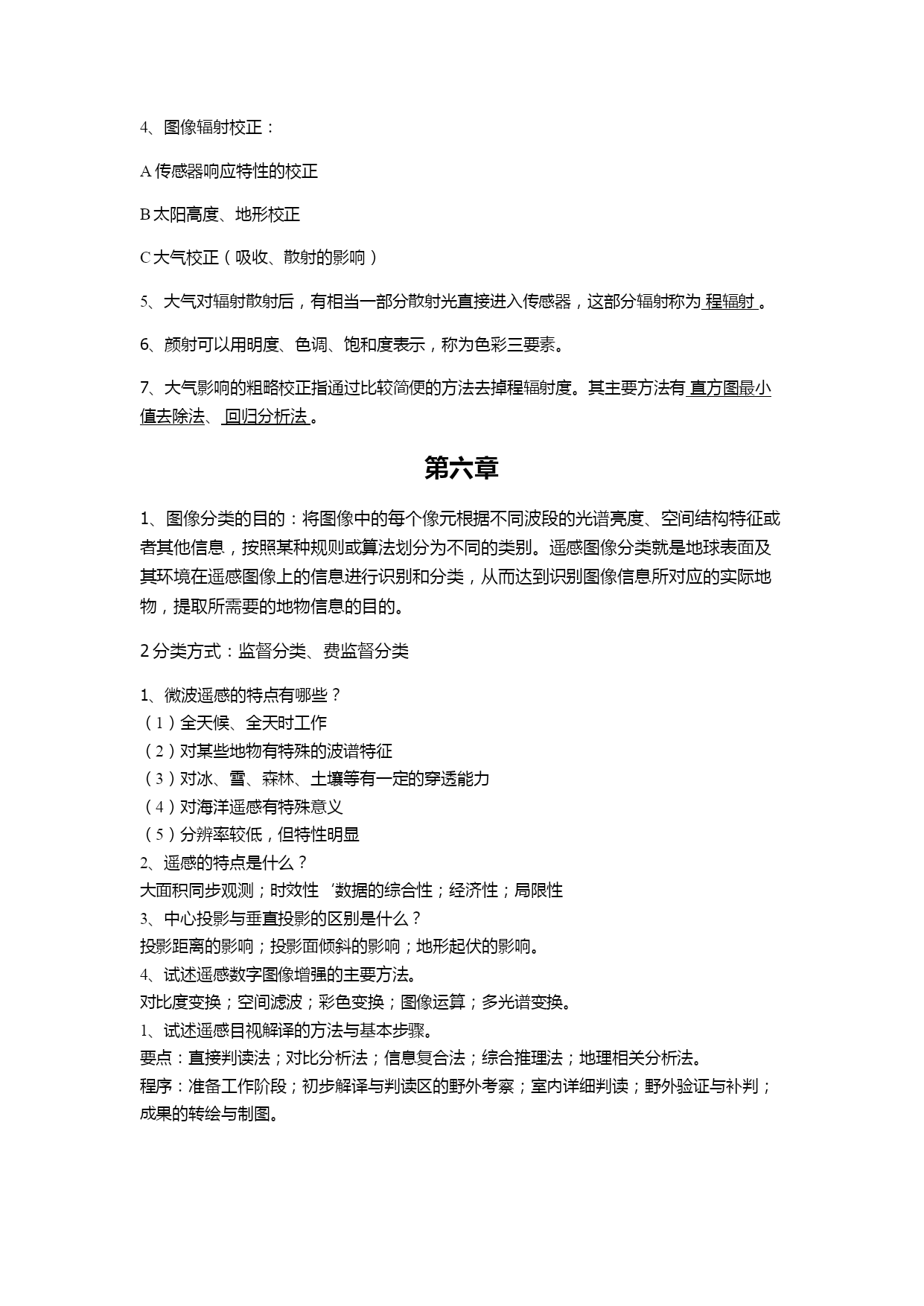 第一章1、按照传感器的工作波段分类,遥感可以分为紫外遥感、可见光遥感、红外遥感、微波遥感、多波段遥感。P22遥感过程:信息源、信息获取、信息记录与传输、信息处理、信息应用P4第二章1、电磁波谱按频率从高到低(波长从短到长)排列,依次为γ射线、X射线、紫外线、可见光、红外线、微波、无线电波。P132、如果一个物体对于任何波长的电磁辐射都全部吸收,则这个物体称为绝对黑体。3、单位面积上地物发射某一波长的辐射通量密度W′λ与同温下黑体在同一波长上的辐射通量密度Wλ之比,称为地物光谱发射率,记为ελ4、绝对黑体:ελ=ε=1;灰体:ελ=ε,但0<ε<1;选择性辐射体ελ=f(λ);(自然界中大部分物体都是)绝对白体ελ=ε=05、植物反射波普特性绿色植物反射峰原因可见光一峰两谷叶绿素近红外强反射峰叶片细胞短波红外3个水吸收带组织结构水吸收6、雪的反射波普与太阳光谱最相似,在波长0.49μm附近有个波峰,随着波长增加反射率逐渐降低。在可见光波段基本上是非选择性吸收体,即高反射体(80%),但在近红外波段吸收强得多,变成选择性吸收体。7、水在蓝光波段反射率稍高,约为10%,到波长0.75μm以后的近红外波段,变成了全吸收体。8、大气对电磁波传输过程的影响:散射、吸收、扰动、折射、偏振P339、在可见光波段,引起电磁波衰弱的主要原因是分子散射;在紫外、红外与微波区,引起电磁衰弱的主要原因是大气吸收P3310、吸收作用:使辐射能量转变为分子内能,从而引起这些波段太阳辐射强度的减弱,甚至某些波段的电磁波完全不能通过大气。11、散射:电磁波在传播过程中遇到小微粒而使传播方向发生改变并向各个方向散开。12、大气散射:瑞利散射、米氏散射、无选择性散射。(看书34-35页,重点理解)13、大气窗口:有些波段的电磁辐射通过大气后衰减较小,透过率较高,对遥感十分有利,这些波段通常称为大气窗口。第三章1、传感器分类情况P402、全景畸变:由于全景相机在成像过程中焦距不变,而物距随扫描角的增大而增大,因此在图像上会出现两边比例尺逐渐缩小的现象。3、TM专题制图仪技术指标P49;ETM+增强型专题制图仪技术指标P504、根据遥感平台高度:地面遥感平台、航空遥感平台、航天遥感平台5、根据航天遥感平台服务内容:气象卫星系列、陆地卫星系列、海洋卫星系列6、气象卫星的轨道分为高轨和低轨。低轨就是近极地太阳同步轨道;高轨是指地球同步轨道。风云一号是太阳同步轨道;风云二号是地球同步轨道7、陆地卫星的轨道是太阳同步轨道-轨道,其图像覆盖范围约为185-185平方公里。SPOT卫星较之陆地卫星,其最大优势是最高空间分辨率达到10米。8、热红外影像上的阴影是目标地物与背景之间辐射差异造成的,可分为暖阴影和冷阴影两种。9、TM影像为专题制图仪获取的图像。其在光谱分辨率、辐射分辨率、空间分辨率方面都比MSS图像有较大改进。10、Landsat的轨道是太阳同步轨道,SPOT卫星较之陆地卫星,其最大优势是最高空间分辨率达到10米11、landsat系列卫星P6612、spot卫星P6913、遥感图像特征:几何特征、物理特征、时间特征,表现参数:时间分辨率、光谱分辨率、辐射分辨率、时间分辨率第四章1、目标地物特征:色、形、位2、图像的数字化包含两个方面的内容:一是图像空间位置,即坐标的数字化称为图像的采样,二是图像灰度的数字化,即幅度数字化,称为灰度级量化,他是从图像灰度的连续变化中进行离散采样。3串符型数据的排列格式BSQ、BIP、BIL(P89重点掌握这三种格式是如何进行存储的)4、图像直方图:描述图像中每个亮度值的像元数量的统计分布。第五章1、遥感图像畸变的主要原因是什么?(1)传感器成像方式引起的图像变形(2)传感器外方位元素变化的影响(3)地形起伏的影响(4)地球表面曲率的影响(5)大气折射的影响(6)地球自转的影响2、几何校正的一般步骤:a选择控制点:选择同名控制点,建立投影关系b建立整体映射函数:根据图像几何畸变性质及地面控制点的多少来确定校正数学模型,建立起图像与地面坐标系统之间的空间变换关系。c校正模型求解:根据地面控制点和对应像点坐标进行平差计算变换参数,评定精度,并对原始影像进行几何变换计算。d像元亮度重采样:对输入的图像的数据重新排列3、灰度值重采样的方法:最近邻法、双线性内插法、三次卷积内插法4、图像辐射校正:A传感器响应特性的校正B太阳高度、地形校正C大气校正(吸收、散射的影响)5、大气对辐射散射后,有相当一部分散射光直接进入传感器,这部分辐射称为程辐射。6、颜射可以用明度、色调、饱和度表示,称为色彩三要素。7、大气影响的粗略校正指通过比较简便的方法去掉程辐射