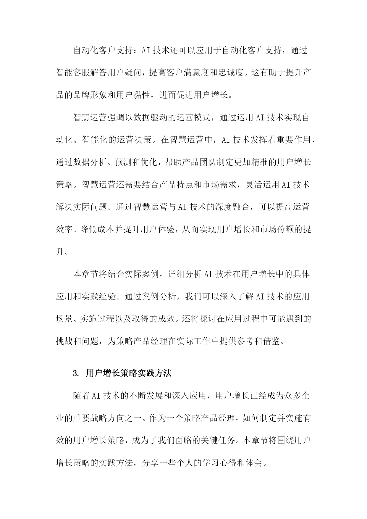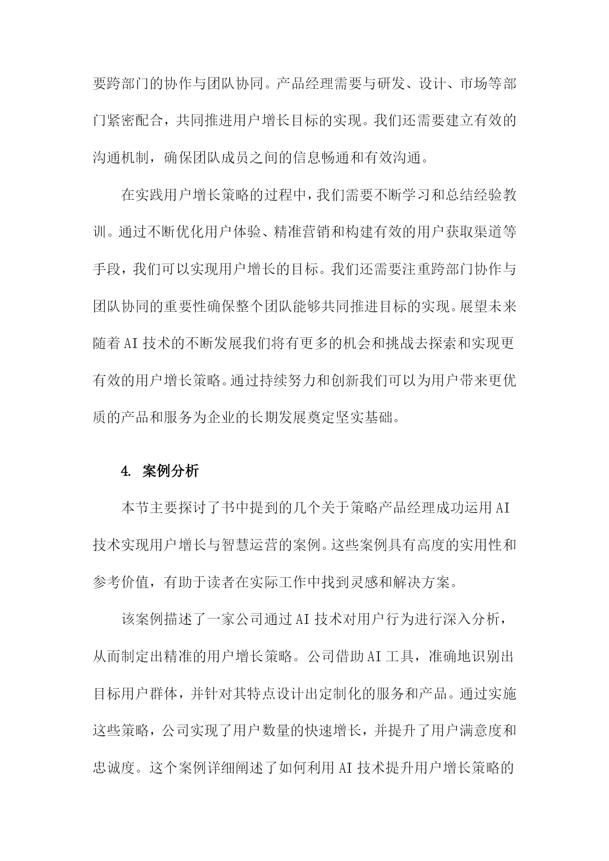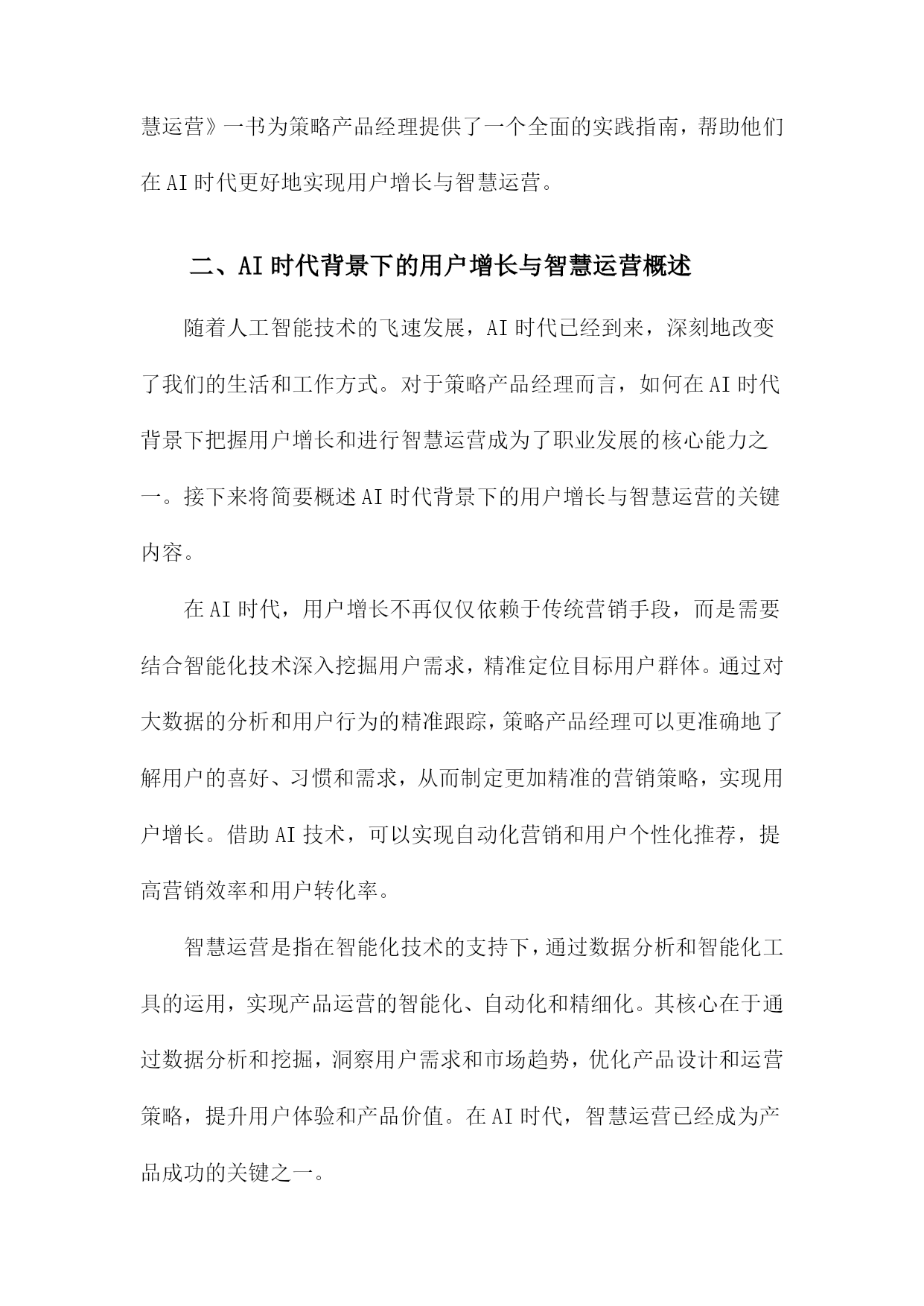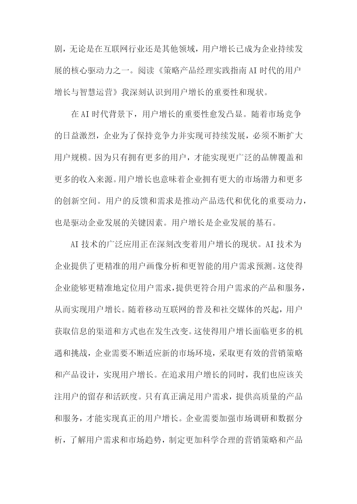 《策略产品经理实践指南AI时代的用户增长与智慧运营》读书记录一、书籍概述在当前的数字化时代,AI已经深入到各个领域,为各行各业带来了前所未有的变革。作为策略产品经理,在这个蓬勃发展的时代背景下,如何把握机遇,实现用户增长与智慧运营,成为了一项重要的课题。《策略产品经理实践指南AI时代的用户增长与智慧运营》一书应运而生,为众多策略产品经理提供了宝贵的经验和指导。本书概述了AI时代背景下的策略产品经理的角色定位与技能要求。书中首先介绍了AI技术的发展趋势及其对策略产品经理的影响,使读者从宏观角度理解当前的市场环境与技术背景。本书详细阐述了策略产品经理在AI时代所面临的主要任务,包括用户增长策略的制定与实施、智慧运营的实践与探索等。书中还强调了策略产品经理需要具备的核心能力,如数据分析、用户洞察、创新思维等。本书的内容结构清晰,逻辑严谨。作者结合多年的实践经验,通过大量的案例分析,深入剖析了AI时代策略产品经理的工作流程及方法。书中还涉及了诸多实用的工具和方法,为策略产品经理提供了具体的操作指导。《策略产品经理实践指南AI时代的用户增长与智慧运营》一书为策略产品经理提供了一个全面的实践指南,帮助他们在AI时代更好地实现用户增长与智慧运营。二、AI时代背景下的用户增长与智慧运营概述随着人工智能技术的飞速发展,AI时代已经到来,深刻地改变了我们的生活和工作方式。对于策略产品经理而言,如何在AI时代背景下把握用户增长和进行智慧运营成为了职业发展的核心能力之一。接下来将简要概述AI时代背景下的用户增长与智慧运营的关键内容。在AI时代,用户增长不再仅仅依赖于传统营销手段,而是需要结合智能化技术深入挖掘用户需求,精准定位目标用户群体。通过对大数据的分析和用户行为的精准跟踪,策略产品经理可以更准确地了解用户的喜好、习惯和需求,从而制定更加精准的营销策略,实现用户增长。借助AI技术,可以实现自动化营销和用户个性化推荐,提高营销效率和用户转化率。智慧运营是指在智能化技术的支持下,通过数据分析和智能化工具的运用,实现产品运营的智能化、自动化和精细化。其核心在于通过数据分析和挖掘,洞察用户需求和市场趋势,优化产品设计和运营策略,提升用户体验和产品价值。在AI时代,智慧运营已经成为产品成功的关键之一。AI技术在用户增长与智慧运营中发挥着重要作用。通过智能推荐系统,可以根据用户行为和偏好,为用户提供个性化的推荐服务;通过智能客服系统,可以自动化回答用户问题,提高用户体验;通过数据挖掘和分析,可以预测市场趋势和用户需求,为产品设计和运营提供有力支持。在AI时代背景下,策略产品经理需要不断学习和掌握新技术,结合产品特点和市场需求,制定有效的策略。也需要关注用户需求和体验,不断优化产品设计和运营策略。还需要加强团队建设,培养具备智能化技术和数据分析能力的人才队伍,为产品的用户增长和智慧运营提供有力支持。在AI时代背景下,用户增长与智慧运营已经成为策略产品经理的核心能力之一。需要不断学习和掌握新技术,关注用户需求和市场趋势,制定有效的策略和产品设计。同时还需要加强团队建设和技术创新力度不断提升产品的竞争力和用户体验价值。三、AI时代的用户增长策略在AI时代,用户增长策略主要围绕数据驱动、个性化推荐和智能化运营展开。数据驱动的用户增长策略是AI时代最显著的特点之一。通过大数据分析和挖掘,企业可以精准地识别目标用户群体,了解他们的需求和偏好,从而制定更加精准的产品策略和市场推广策略。个性化推荐算法在用户增长中扮演着至关重要的角色,借助AI技术,企业可以根据用户的兴趣、行为和偏好,为他们提供个性化的推荐服务。这不仅提高了用户的满意度和忠诚度,还能吸引新用户,促进用户增长。智能化运营也是实现用户增长的关键手段,通过智能化运营,企业可以实时监控用户的行为和反馈,及时调整产品策略,优化用户体验。借助AI技术,企业还可以实现精准营销,提高营销效率和转化率。在实施AI时代的用户增长策略时,需要注意以下几点。企业需要建立完善的数据收集和分析体系,确保能够收集到足够的数据并进行分析。企业需要拥有强大的算法团队或合作伙伴,能够开发出高效的个性化推荐算法。企业需要具备快速响应和迭代的能力,能够根据市场和用户的反馈及时调整产品策略。通过实施AI时代的用户增长策略,企业可以更好地满足用户需求,提高用户满意度和忠诚度,吸引更多新用户,实现用户增长。这也有助于企业实现智慧运营,提高运营效率和市场竞争力。在未来的发展中,AI时代的用户增长策略将成为企业不可或缺的一部分。1.用户增长的重要性及现状分析在当今数字化飞速发展的时代,随着科技的日新月异和竞争的加剧,无论是在互联网行业还是其他领域,用户增长已成为企业持续发展的核心驱动力之一。阅读《策略产品经理实践指南AI