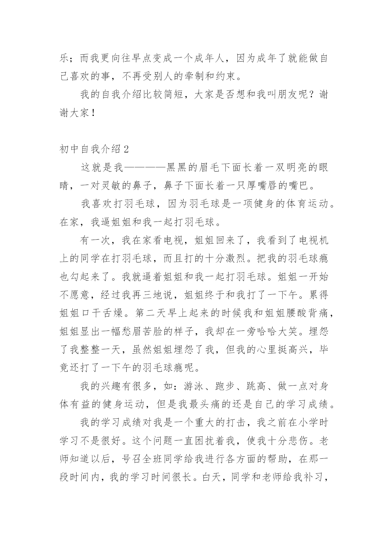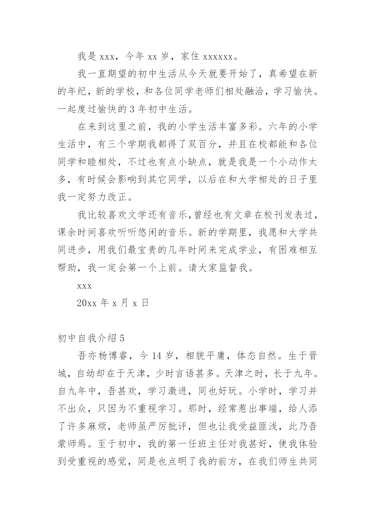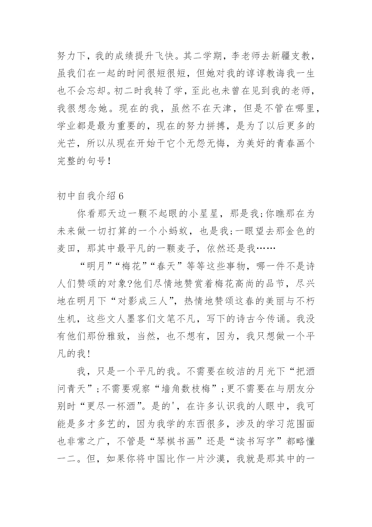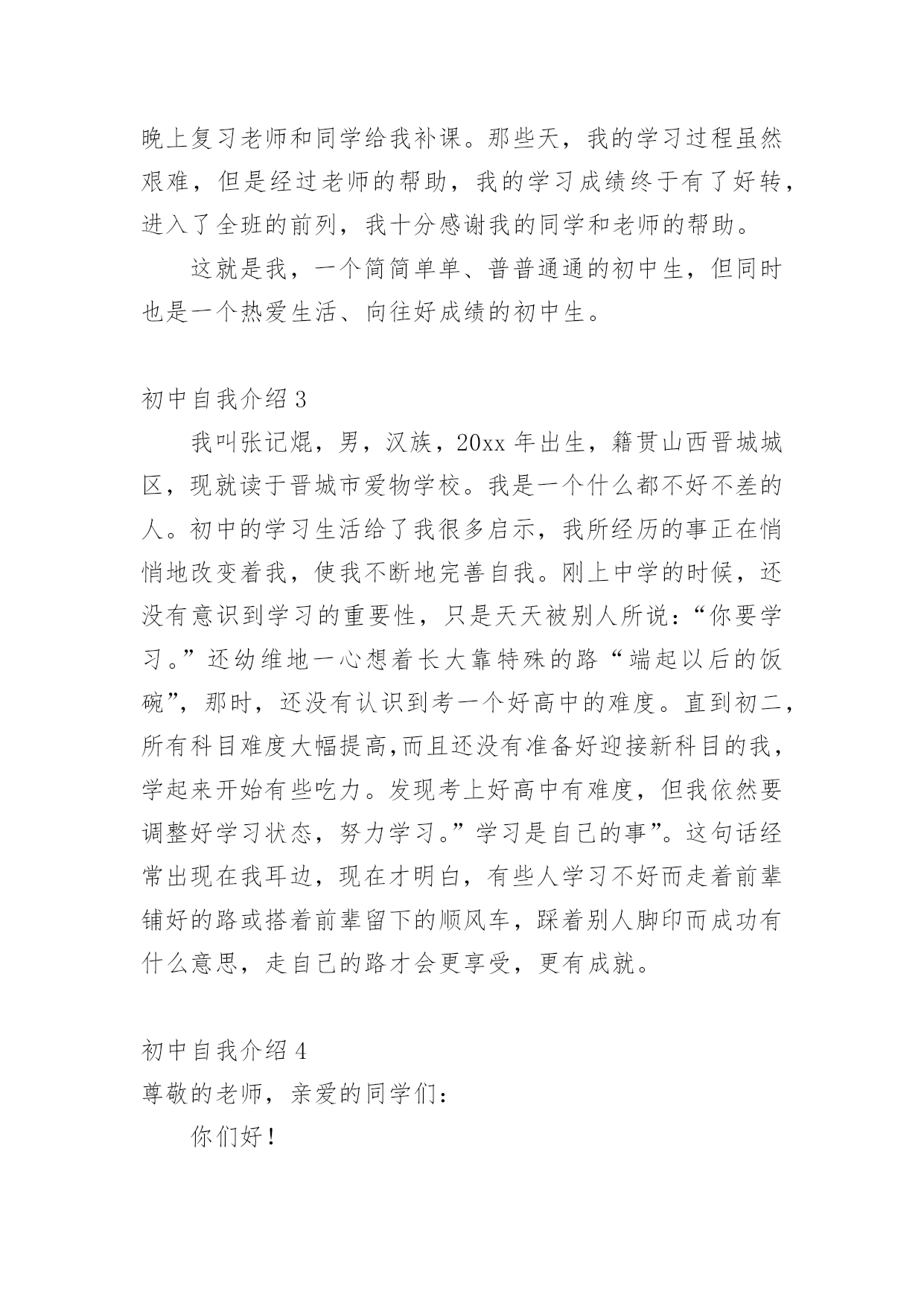 初中自我介绍当碰到不熟悉的人时,我们总少不了要向他人介绍自己,自我介绍是一种认识自我的手段。相信大家又在为写自我介绍犯愁了吧!下面是小编帮大家整理的初中自我介绍,欢迎大家分享。初中自我介绍1亲爱的老师们、同学们:大家好!初中将要和大家一起学习。我很兴奋。我叫xxx,我是个xx岁的男孩。为什么叫男孩呢,因为我的心还是很弱小的,没有经过岁月的磨练。要向大家自我介绍,其实我也很为难。因为我自己都不是很了解自己。在别人严重我可能永远是快乐的,乐观的。可是我的内心深处却经常为一些事伤心,焦虑,烦恼,甚至死心!我认为正式因为有痛苦才会有快乐,人生好比两杯酒,一杯苦酒,一杯甜酒。只是看你先喝哪一杯。人生可以分为七个阶段吧,幼年、童年少年、青年、成年、中年、老年。我们处于青年,是塑造我们人生价值关和目标的时候,我们以后将要成为一个怎样的人,主要的决定因素都会在接下来的三年中发生,所以我很期待以后的初中生活。我喜欢回忆我的童年,回忆我的童年带给我的无数的快乐;而我更向往早点变成一个成年人,因为成年了就能做自己喜欢的事,不再受别人的牵制和约束。我的自我介绍比较简短,大家是否想和我叫朋友呢?谢谢大家!初中自我介绍2这就是我————黑黑的眉毛下面长着一双明亮的眼睛,一对灵敏的鼻子,鼻子下面长着一只厚嘴唇的嘴巴。我喜欢打羽毛球,因为羽毛球是一项健身的体育运动。在家,我逼姐姐和我一起打羽毛球。有一次,我在家看电视,姐姐回来了,我看到了电视机上的同学在打羽毛球,而且打的十分激烈。把我的羽毛球瘾也勾起来了。我就逼着姐姐和我一起打羽毛球。姐姐一开始不愿意,经过我再三地说,姐姐终于和我打了一下午。累得姐姐口干舌燥。第二天早上起来的时候我和姐姐腰酸背痛,姐姐显出一幅愁眉苦脸的样子,我却在一旁哈哈大笑。埋怨了我整整一天,虽然姐姐埋怨了我,但我的心里挺高兴,毕竟还打了一下午的羽毛球瘾呢。我的兴趣有很多,如:游泳、跑步、跳高、做一点对身体有益的健身运动,但是我最头痛的还是自己的学习成绩。我的学习成绩对我是一个重大的打击,我之前在小学时学习不是很好。这个问题一直困扰着我,使我十分悲伤。老师知道以后,号召全班同学给我进行各方面的帮助,在那一段时间内,我的学习时间很长。白天,同学和老师给我补习,晚上复习老师和同学给我补课。那些天,我的学习过程虽然艰难,但是经过老师的帮助,我的学习成绩终于有了好转,进入了全班的前列,我十分感谢我的同学和老师的帮助。这就是我,一个简简单单、普普通通的初中生,但同时也是一个热爱生活、向往好成绩的初中生。初中自我介绍3我叫张记焜,男,汉族,20xx年出生,籍贯山西晋城城区,现就读于晋城市爱物学校。我是一个什么都不好不差的人。初中的学习生活给了我很多启示,我所经历的事正在悄悄地改变着我,使我不断地完善自我。刚上中学的时候,还没有意识到学习的重要性,只是天天被别人所说:“你要学习。”还幼维地一心想着长大靠特殊的路“端起以后的饭碗”,那时,还没有认识到考一个好高中的难度。直到初二,所有科目难度大幅提高,而且还没有准备好迎接新科目的我,学起来开始有些吃力。发现考上好高中有难度,但我依然要调整好学习状态,努力学习。”学习是自己的事”。这句话经常出现在我耳边,现在才明白,有些人学习不好而走着前辈铺好的路或搭着前辈留下的顺风车,踩着别人脚印而成功有什么意思,走自己的路才会更享受,更有成就。初中自我介绍4尊敬的老师,亲爱的同学们:你们好!我是xxx,今年xx岁,家住xxxxxx。我一直期望的初中生活从今天就要开始了,真希望在新的年纪,新的学校,和各位同学老师们相处融洽,学习愉快。一起度过愉快的3年初中生活。在来到这里之前,我的小学生活丰富多彩。六年的小学生活中,有三个学期我都得了双百分,并且在校都能和各位同学和睦相处,不过也有点小缺点,就是我是一个小动作太多,有时候会影响到其它同学,以后在和大学相处的日子里我一定努力改正。我比较喜欢文学还有音乐,曾经也有文章在校刊发表过,课余时间喜欢听听悠闲的音乐。新的学期里,我愿和大学共同进步,用我们最宝贵的几年时间来完成学业,有困难相互帮助,我一定会第一个上前。请大家监督我。xxx20xx年x月x日初中自我介绍5吾亦杨博睿,今14岁,相貌平庸,体态自然。生于晋城,自幼却在于天津,少时言语甚多。天津之时,长于九年。自九年中,吾甚欢,学习激进,同也好玩。小学时,学习并不出众,只因为不重视学习。那时,经常惹出事端,给人添了许多麻烦,老师虽严厉批评,但也让我受益匪浅,此乃吾蒙师焉。至于初中,我的第一任班主任对我甚好,使我体验到受重视的感觉,同是也点明了我的前方,在我们师生共同努力下,我的成绩提升飞快。其二学期,李老师去新疆支教,虽我们在一起的时间很短很短,但她对我的谆谆教诲我一生也不会忘却。初二时我转了学,至此也未曾在见到我的老师,