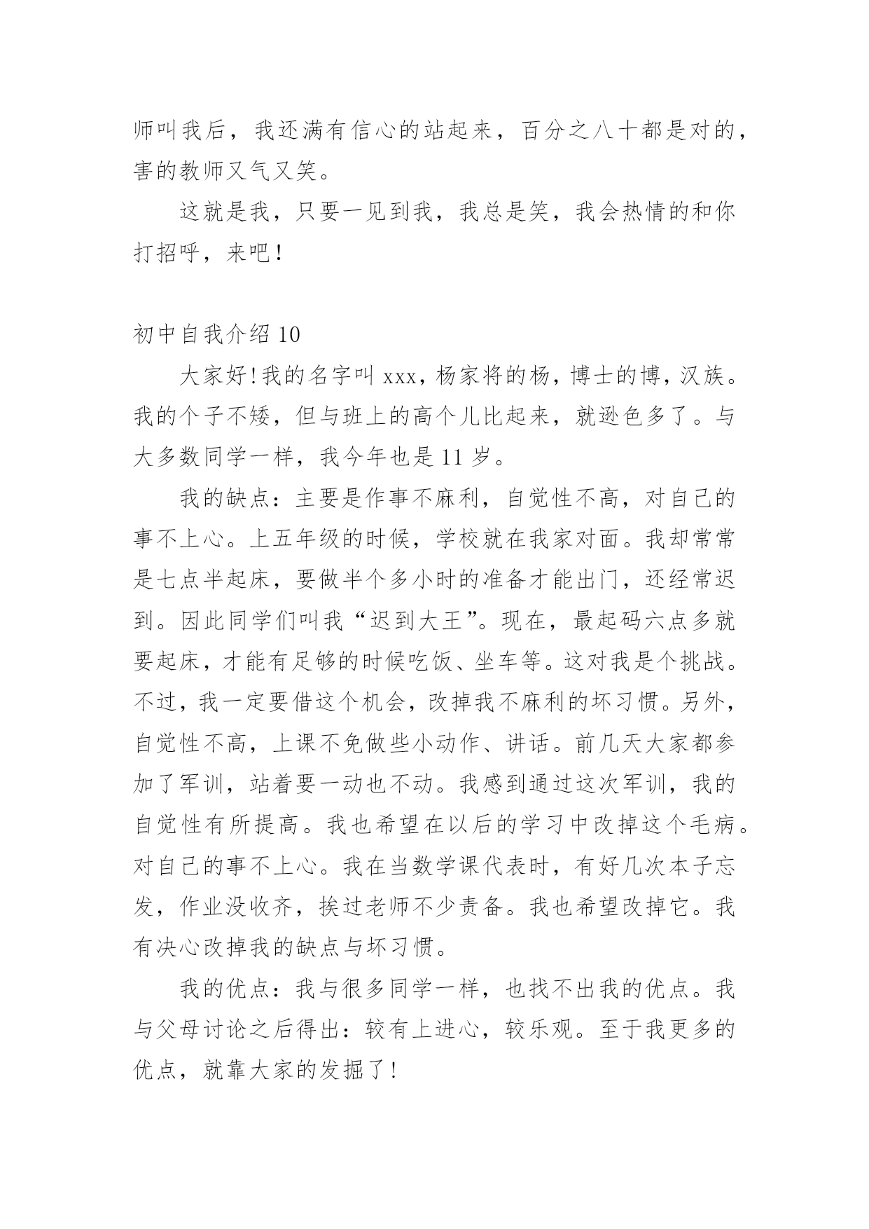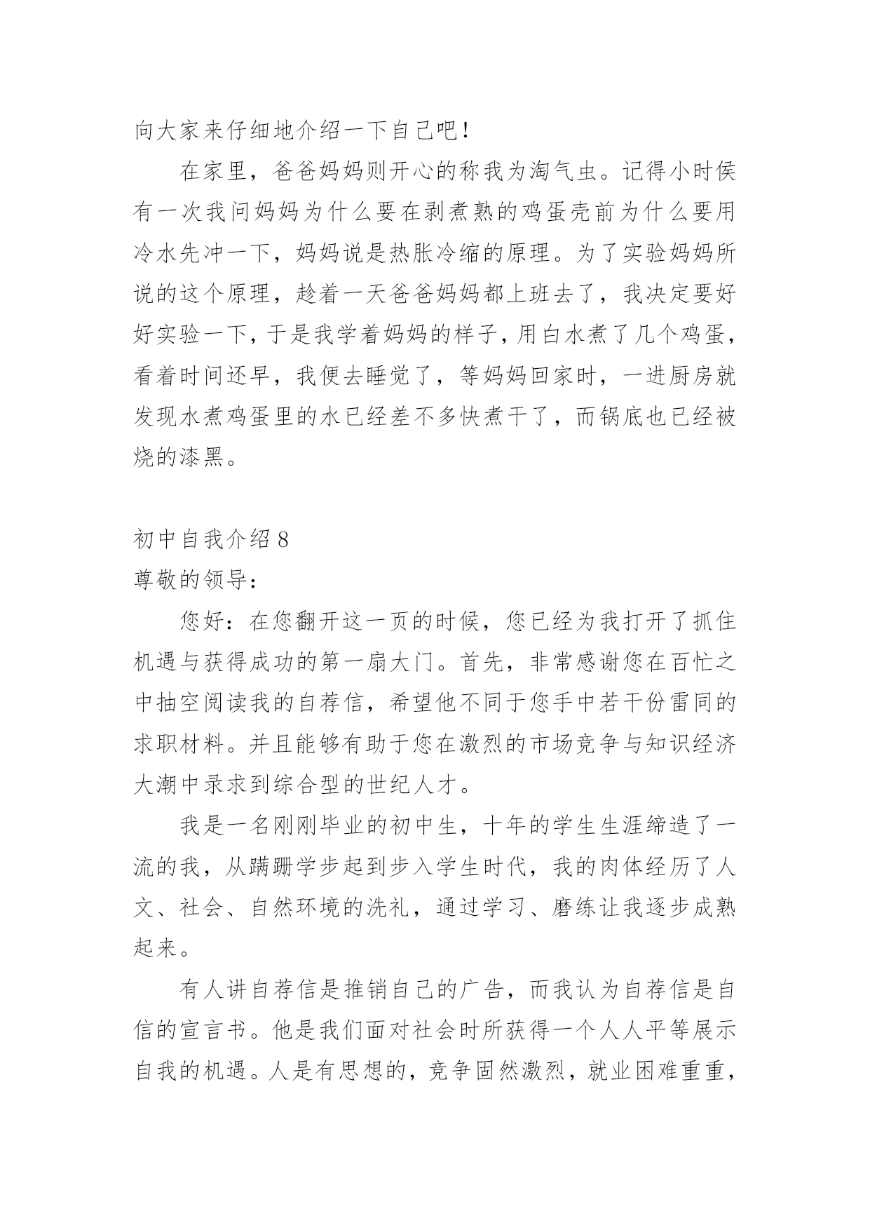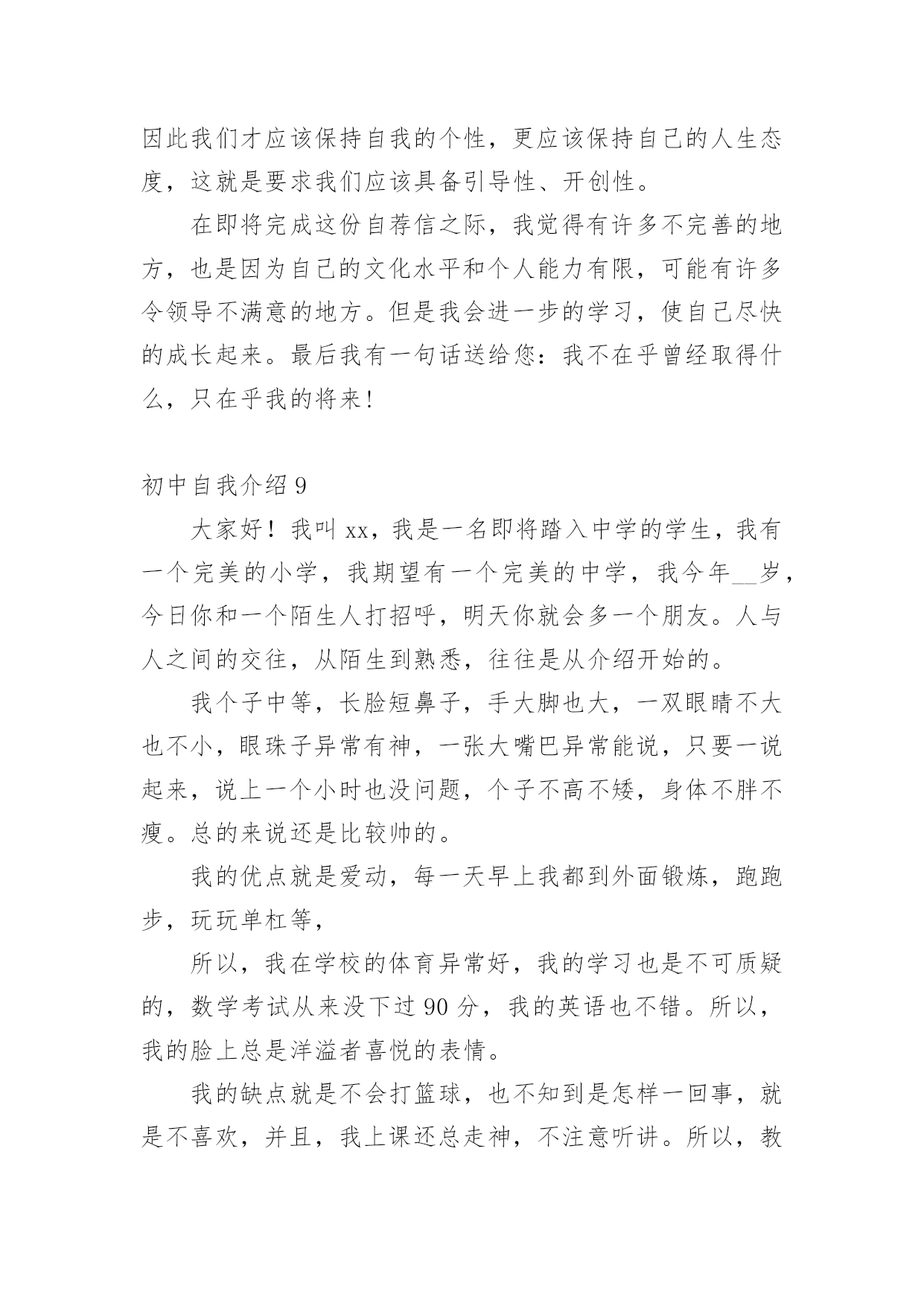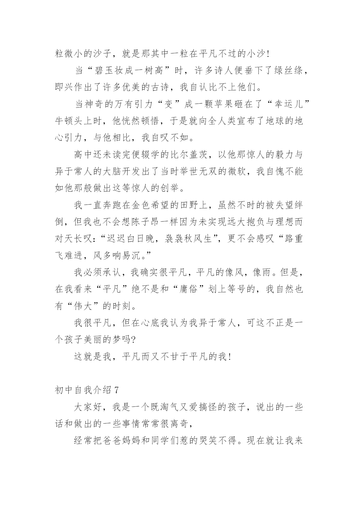 初中自我介绍当碰到不熟悉的人时,我们总少不了要向他人介绍自己,自我介绍是一种认识自我的手段。相信大家又在为写自我介绍犯愁了吧!下面是小编帮大家整理的初中自我介绍,欢迎大家分享。初中自我介绍1亲爱的老师们、同学们:大家好!初中将要和大家一起学习。我很兴奋。我叫xxx,我是个xx岁的男孩。为什么叫男孩呢,因为我的心还是很弱小的,没有经过岁月的磨练。要向大家自我介绍,其实我也很为难。因为我自己都不是很了解自己。在别人严重我可能永远是快乐的,乐观的。可是我的内心深处却经常为一些事伤心,焦虑,烦恼,甚至死心!我认为正式因为有痛苦才会有快乐,人生好比两杯酒,一杯苦酒,一杯甜酒。只是看你先喝哪一杯。人生可以分为七个阶段吧,幼年、童年少年、青年、成年、中年、老年。我们处于青年,是塑造我们人生价值关和目标的时候,我们以后将要成为一个怎样的人,主要的决定因素都会在接下来的三年中发生,所以我很期待以后的初中生活。我喜欢回忆我的童年,回忆我的童年带给我的无数的快乐;而我更向往早点变成一个成年人,因为成年了就能做自己喜欢的事,不再受别人的牵制和约束。我的自我介绍比较简短,大家是否想和我叫朋友呢?谢谢大家!初中自我介绍2这就是我————黑黑的眉毛下面长着一双明亮的眼睛,一对灵敏的鼻子,鼻子下面长着一只厚嘴唇的嘴巴。我喜欢打羽毛球,因为羽毛球是一项健身的体育运动。在家,我逼姐姐和我一起打羽毛球。有一次,我在家看电视,姐姐回来了,我看到了电视机上的同学在打羽毛球,而且打的十分激烈。把我的羽毛球瘾也勾起来了。我就逼着姐姐和我一起打羽毛球。姐姐一开始不愿意,经过我再三地说,姐姐终于和我打了一下午。累得姐姐口干舌燥。第二天早上起来的时候我和姐姐腰酸背痛,姐姐显出一幅愁眉苦脸的样子,我却在一旁哈哈大笑。埋怨了我整整一天,虽然姐姐埋怨了我,但我的心里挺高兴,毕竟还打了一下午的羽毛球瘾呢。我的兴趣有很多,如:游泳、跑步、跳高、做一点对身体有益的健身运动,但是我最头痛的还是自己的学习成绩。我的学习成绩对我是一个重大的打击,我之前在小学时学习不是很好。这个问题一直困扰着我,使我十分悲伤。老师知道以后,号召全班同学给我进行各方面的帮助,在那一段时间内,我的学习时间很长。白天,同学和老师给我补习,晚上复习老师和同学给我补课。那些天,我的学习过程虽然艰难,但是经过老师的帮助,我的学习成绩终于有了好转,进入了全班的前列,我十分感谢我的同学和老师的帮助。这就是我,一个简简单单、普普通通的初中生,但同时也是一个热爱生活、向往好成绩的初中生。初中自我介绍3我叫张记焜,男,汉族,20xx年出生,籍贯山西晋城城区,现就读于晋城市爱物学校。我是一个什么都不好不差的人。初中的学习生活给了我很多启示,我所经历的事正在悄悄地改变着我,使我不断地完善自我。刚上中学的时候,还没有意识到学习的重要性,只是天天被别人所说:“你要学习。”还幼维地一心想着长大靠特殊的路“端起以后的饭碗”,那时,还没有认识到考一个好高中的难度。直到初二,所有科目难度大幅提高,而且还没有准备好迎接新科目的我,学起来开始有些吃力。发现考上好高中有难度,但我依然要调整好学习状态,努力学习。”学习是自己的事”。这句话经常出现在我耳边,现在才明白,有些人学习不好而走着前辈铺好的路或搭着前辈留下的顺风车,踩着别人脚印而成功有什么意思,走自己的路才会更享受,更有成就。初中自我介绍4尊敬的老师,亲爱的同学们:你们好!我是xxx,今年xx岁,家住xxxxxx。我一直期望的初中生活从今天就要开始了,真希望在新的年纪,新的学校,和各位同学老师们相处融洽,学习愉快。一起度过愉快的3年初中生活。在来到这里之前,我的小学生活丰富多彩。六年的小学生活中,有三个学期我都得了双百分,并且在校都能和各位同学和睦相处,不过也有点小缺点,就是我是一个小动作太多,有时候会影响到其它同学,以后在和大学相处的日子里我一定努力改正。我比较喜欢文学还有音乐,曾经也有文章在校刊发表过,课余时间喜欢听听悠闲的音乐。新的学期里,我愿和大学共同进步,用我们最宝贵的几年时间来完成学业,有困难相互帮助,我一定会第一个上前。请大家监督我。xxx20xx年x月x日初中自我介绍5吾亦杨博睿,今14岁,相貌平庸,体态自然。生于晋城,自幼却在于天津,少时言语甚多。天津之时,长于九年。自九年中,吾甚欢,学习激进,同也好玩。小学时,学习并不出众,只因为不重视学习。那时,经常惹出事端,给人添了许多麻烦,老师虽严厉批评,但也让我受益匪浅,此乃吾蒙师焉。至于初中,我的第一任班主任对我甚好,使我体验到受重视的感觉,同是也点明了我的前方,在我们师生共同努力下,我的成绩提升飞快。其二学期,李老师去新疆支教,虽我们在一起的时间很短很短,但她对我的谆谆教诲我一生也不会忘却。初二时我转了学,至此也未曾在见到我的老师,
