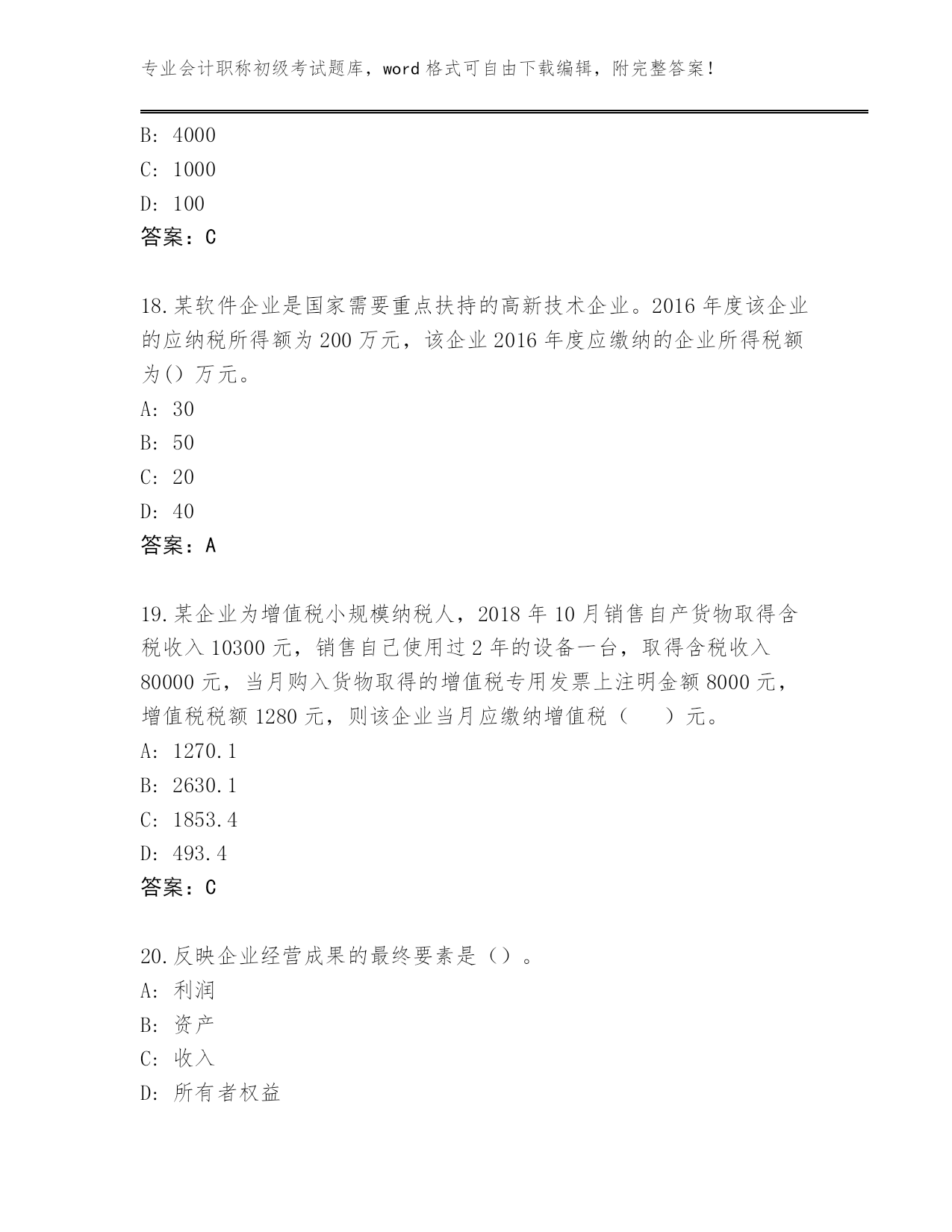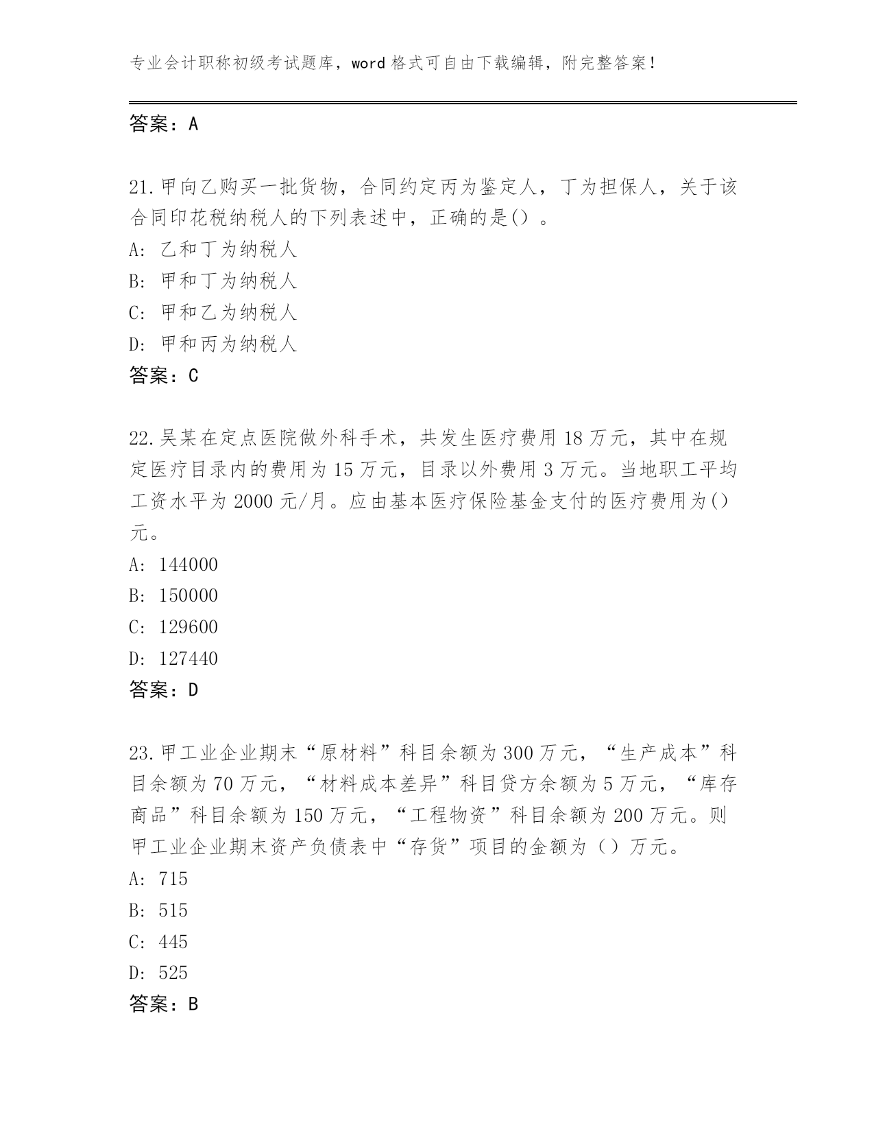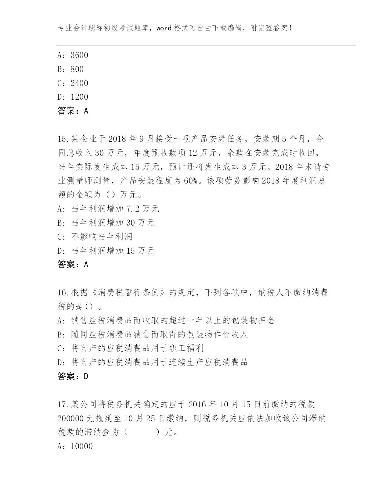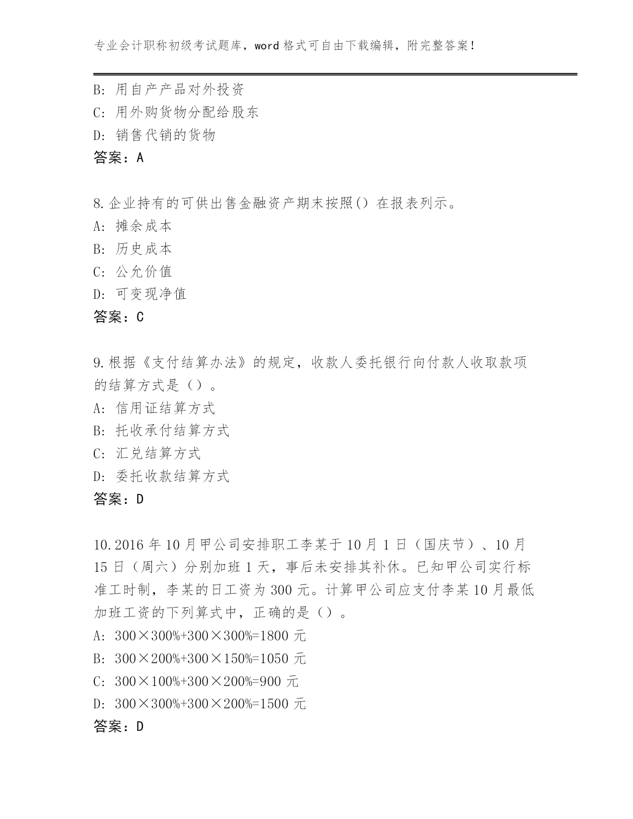 专业会计职称初级考试题库,word格式可自由下载编辑,附完整答案!历年四川省通川区会计职称初级考试真题题库及答案(各地真题)第I部分单选题(100题)1.某企业销售商品一批,增值税专用发票上标明的价款为60万元,适用的增值税税率为16%,为购买方代垫运杂费2万元,款项尚未收回。该企业确认的应收账款为()万元。A:71.6B:62C:60D:69.6答案:A2.未按照规定使用记账本位币的,县级以上人民政府财政部门可以对其直接负责的主管人员和其他直接责任人员处以的罚款金额是()。A:2000元以上2万元以下B:1000元以上1万元以下C:3000元以上3万元以下D:3000元以上5万元以下答案:A3.根据规定,下列各项中,可以受理失票人公示催告申请的人民法院是()。A:票据收款地法院B:票据支付地法院C:失票人所在地法院D:出票人所在地法院答案:B4.界定从事会计工作和提供会计信息的空间范围的会计基本前提是()。A:会计目标B:会计主体C:会计职能D:会计对象答案:B5.根据资源税法律制度的规定,独立矿山收购未税矿产品适用的税率标准是()。A:税务机关核定的税额标准B:矿产品原产地的税额标准C:本单位应税产品的税额标准D:矿产品购买地的税额标准答案:C6.根据土地增值税法律制度的规定,下列各项中,免征土地增值税的是()。A:因城市实施规划.国家建设的需要而搬迁,企业自行转让原房地产B:由一方出地,另一方出资金,企业双方合作建房,建成后转让的房地产C:企业以房地产抵债而发生权属转移的房地产D:企业之间交换房地产答案:A7.下列各项中,不属于应按视同销售货物行为征收增值税的是()。A:将外购的货物用于集体福利B:用自产产品对外投资C:用外购货物分配给股东D:销售代销的货物答案:A8.企业持有的可供出售金融资产期末按照()在报表列示。A:摊余成本B:历史成本C:公允价值D:可变现净值答案:C9.根据《支付结算办法》的规定,收款人委托银行向付款人收取款项的结算方式是()。A:信用证结算方式B:托收承付结算方式C:汇兑结算方式D:委托收款结算方式答案:D10.2016年10月甲公司安排职工李某于10月1日(国庆节)、10月15日(周六)分别加班1天,事后未安排其补休。已知甲公司实行标准工时制,李某的日工资为300元。计算甲公司应支付李某10月最低加班工资的下列算式中,正确的是()。A:300×300%+300×300%=1800元B:300×200%+300×150%=1050元C:300×100%+300×200%=900元D:300×300%+300×200%=1500元答案:D11.根据企业所得税法律制度的规定,关于确认收入实现时间的下列表述中,正确的是()。A:权益性投资收益,按照投资方实际收到利润的日期确认收入的实现B:利息收入,按照合同约定的债务人应付利息的日期确认收入的实现C:租金收入,按照出租人实际收到租金的日期确认收入的实现D:接受捐赠收入,按照合同约定的捐赠日期确认收入的实现答案:B12.根据税收征收管理法律制度的规定,下列说法正确的是()。A:纳税人经税务机关通知申报而拒不申报,不缴或者少缴应纳税款的行为,属于抗税B:纳税人以暴力.威胁办法拒不缴纳税款的行为,属于抗税C:纳税人在账簿上多列支出,不缴或少缴应纳税款的行为,属于骗税D:纳税人以假报出口手段骗取国家出口退税款的行为,属于偷税答案:B13.下列各项中,不属于所有者权益变动表中单独列示的项目是()。A:会计政策变更B:所有者投入资本C:综合收益总额D:会计估计变更答案:D14.孙某与甲公司签订了为期3年的劳动合同,月工资1200元(当地最低月工资标准为800元)。期满终止合同时,甲公司未向孙某提出以不低于原工资标准续订劳动合同意向,甲公司应向孙某支付的经济补偿金额为()元。A:3600B:800C:2400D:1200答案:A15.某企业于2018年9月接受一项产品安装任务,安装期5个月,合同总收入30万元,年度预收款项12万元,余款在安装完成时收回,当年实际发生成本15万元,预计还将发生成本3万元。2018年末请专业测量师测量,产品安装程度为60%。该项劳务影响2018年度利润总额的金额为()万元。A:当年利润增加7.2万元B:当年利润增加30万元C:不影响当年利润D:当年利润增加15万元答案:A16.根据《消费税暂行条例》的规定,下列各项中,纳税人不缴纳消费税的是()。A:销售应税消费品而收取的超过一年以上的包装物押金B:随同应税