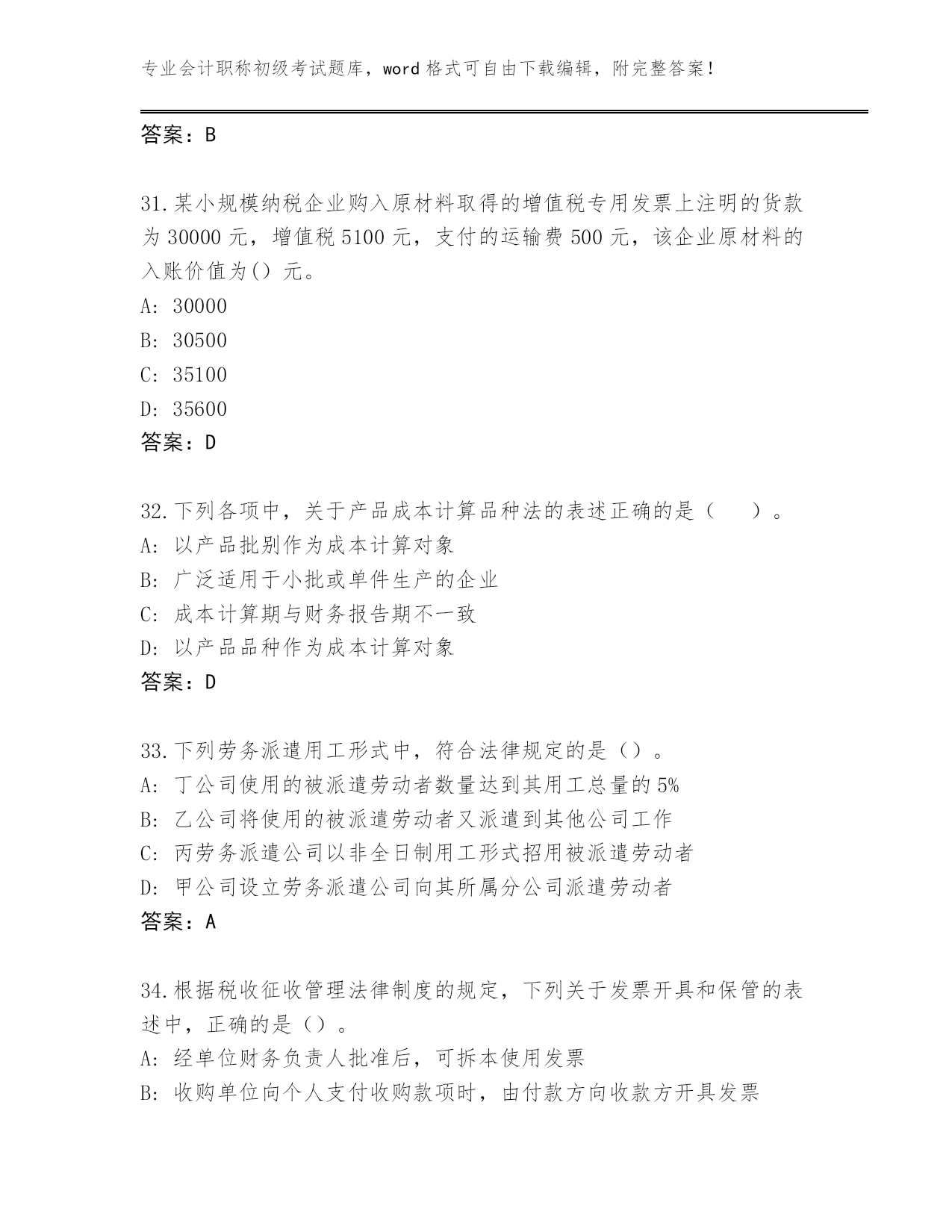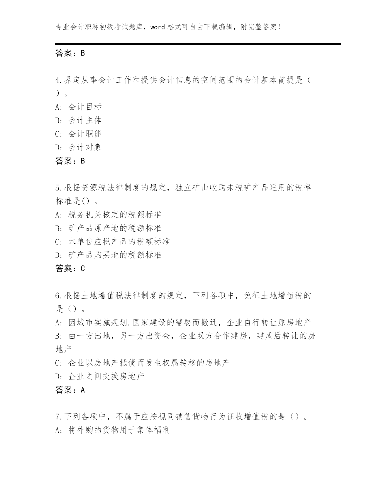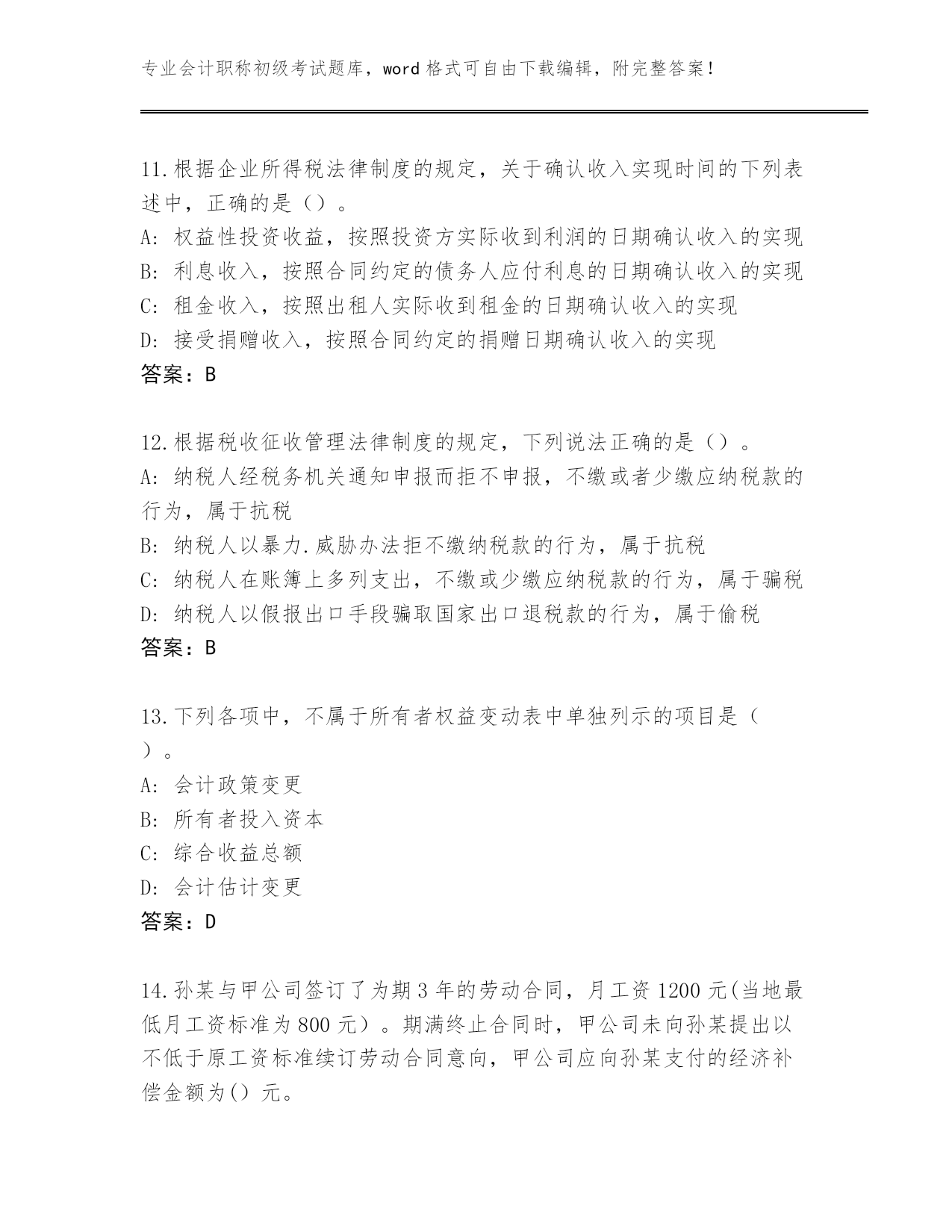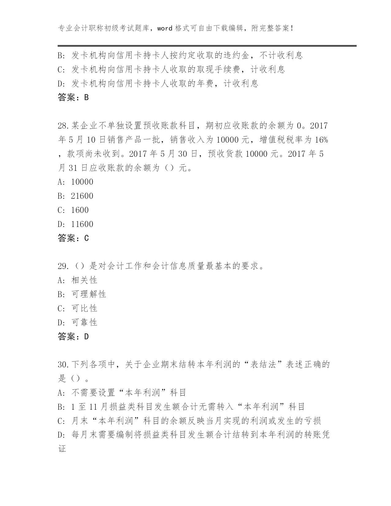 专业会计职称初级考试题库,word格式可自由下载编辑,附完整答案!历年四川省通川区会计职称初级考试真题题库及答案(各地真题)第I部分单选题(100题)1.某企业销售商品一批,增值税专用发票上标明的价款为60万元,适用的增值税税率为16%,为购买方代垫运杂费2万元,款项尚未收回。该企业确认的应收账款为()万元。A:71.6B:62C:60D:69.6答案:A2.未按照规定使用记账本位币的,县级以上人民政府财政部门可以对其直接负责的主管人员和其他直接责任人员处以的罚款金额是()。A:2000元以上2万元以下B:1000元以上1万元以下C:3000元以上3万元以下D:3000元以上5万元以下答案:A3.根据规定,下列各项中,可以受理失票人公示催告申请的人民法院是()。A:票据收款地法院B:票据支付地法院C:失票人所在地法院D:出票人所在地法院答案:B4.界定从事会计工作和提供会计信息的空间范围的会计基本前提是()。A:会计目标B:会计主体C:会计职能D:会计对象答案:B5.根据资源税法律制度的规定,独立矿山收购未税矿产品适用的税率标准是()。A:税务机关核定的税额标准B:矿产品原产地的税额标准C:本单位应税产品的税额标准D:矿产品购买地的税额标准答案:C6.根据土地增值税法律制度的规定,下列各项中,免征土地增值税的是()。A:因城市实施规划.国家建设的需要而搬迁,企业自行转让原房地产B:由一方出地,另一方出资金,企业双方合作建房,建成后转让的房地产C:企业以房地产抵债而发生权属转移的房地产D:企业之间交换房地产答案:A7.下列各项中,不属于应按视同销售货物行为征收增值税的是()。A:将外购的货物用于集体福利B:用自产产品对外投资C:用外购货物分配给股东D:销售代销的货物答案:A8.企业持有的可供出售金融资产期末按照()在报表列示。A:摊余成本B:历史成本C:公允价值D:可变现净值答案:C9.根据《支付结算办法》的规定,收款人委托银行向付款人收取款项的结算方式是()。A:信用证结算方式B:托收承付结算方式C:汇兑结算方式D:委托收款结算方式答案:D10.2016年10月甲公司安排职工李某于10月1日(国庆节)、10月15日(周六)分别加班1天,事后未安排其补休。已知甲公司实行标准工时制,李某的日工资为300元。计算甲公司应支付李某10月最低加班工资的下列算式中,正确的是()。A:300×300%+300×300%=1800元B:300×200%+300×150%=1050元C:300×100%+300×200%=900元D:300×300%+300×200%=1500元答案:D11.根据企业所得税法律制度的规定,关于确认收入实现时间的下列表述中,正确的是()。A:权益性投资收益,按照投资方实际收到利润的日期确认收入的实现B:利息收入,按照合同约定的债务人应付利息的日期确认收入的实现C:租金收入,按照出租人实际收到租金的日期确认收入的实现D:接受捐赠收入,按照合同约定的捐赠日期确认收入的实现答案:B12.根据税收征收管理法律制度的规定,下列说法正确的是()。A:纳税人经税务机关通知申报而拒不申报,不缴或者少缴应纳税款的行为,属于抗税B:纳税人以暴力.威胁办法拒不缴纳税款的行为,属于抗税C:纳税人在账簿上多列支出,不缴或少缴应纳税款的行为,属于骗税D:纳税人以假报出口手段骗取国家出口退税款的行为,属于偷税答案:B13.下列各项中,不属于所有者权益变动表中单独列示的项目是()。A:会计政策变更B:所有者投入资本C:综合收益总额D:会计估计变更答案:D14.孙某与甲公司签订了为期3年的劳动合同,月工资1200元(当地最低月工资标准为800元)。期满终止合同时,甲公司未向孙某提出以不低于原工资标准续订劳动合同意向,甲公司应向孙某支付的经济补偿金额为()元。A:3600B:800C:2400D:1200答案:A15.某企业于2018年9月接受一项产品安装任务,安装期5个月,合同总收入30万元,年度预收款项12万元,余款在安装完成时收回,当年实际发生成本15万元,预计还将发生成本3万元。2018年末请专业测量师测量,产品安装程度为60%。该项劳务影响2018年度利润总额的金额为()万元。A:当年利润增加7.2万元B:当年利润增加30万元C:不影响当年利润D:当年利润增加15万元答案:A16.根据《消费税暂行条例》的规定,下列各项中,纳税人不缴纳消费税的是()。A:销售应税消费品而收取的超过一年以上的包装物押金B:随同应税