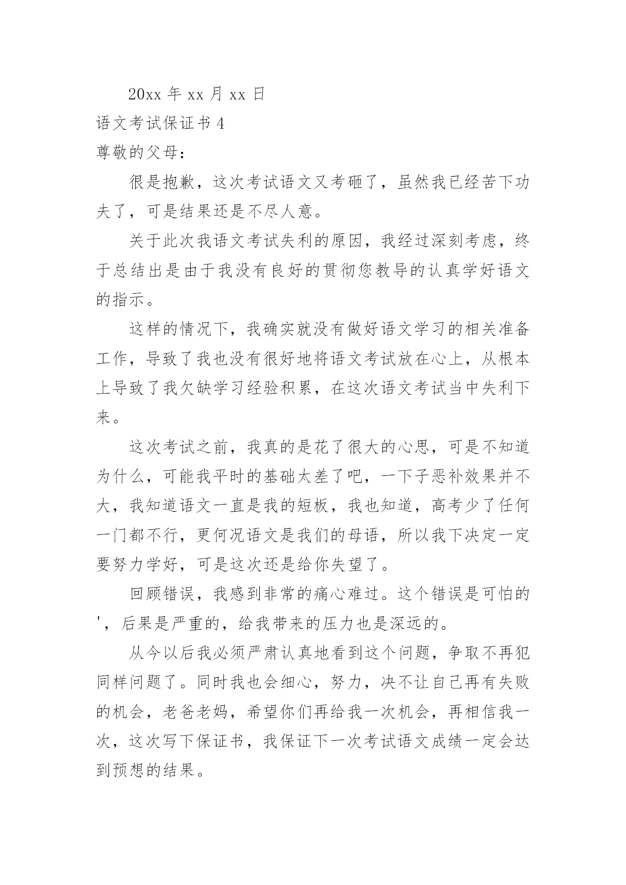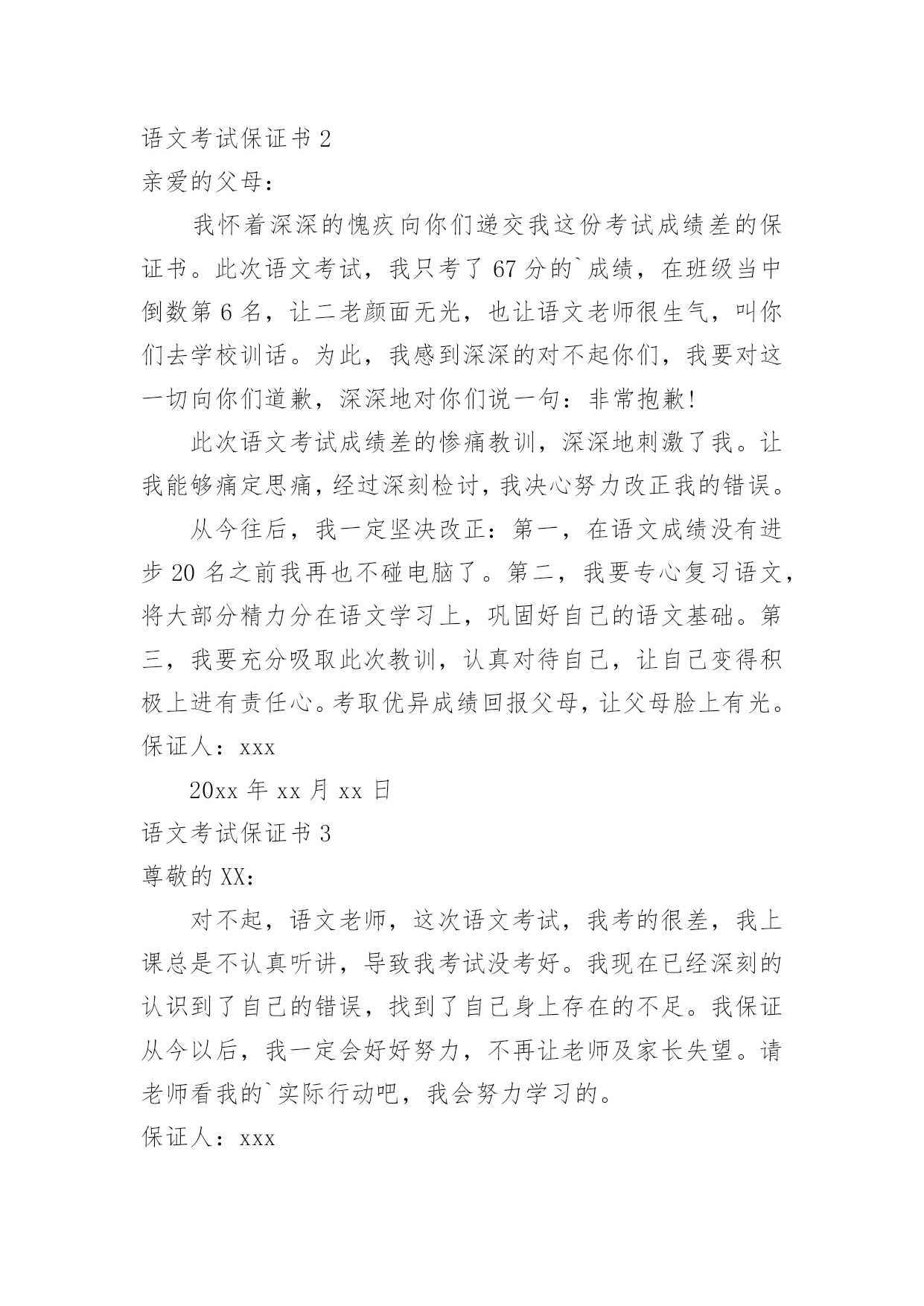 语文考试保证书[通用]语文考试保证书现如今,我们使用保证书的情况越来越多,保证书是个人信用的保证。相信很多朋友都对写保证书感到非常苦恼吧,下面是小编帮大家整理的语文考试保证书,欢迎阅读与收藏。语文考试保证书1尊敬的XX:我保证在本次的期末考试中,以积极的态度,饱满的热情完成本次语文考试。考试前,我会对所学知识进行梳理,梳理的方法是将课本的目录翻开,看课本的目录内容,回忆老师所教的内容,对所学知识感到陌生的.,就着重复习。这样的复习思路让我在屡次的考试中获得成功。本次考试我仍然会沿用此法。再者,我会抓住每次与老师的交流机会,与同班同学的交流机会,我相信三个诸葛亮顶一个臭皮匠。只有不断地交流才能使自己进步更大。山外青山楼外楼,英雄好汉争上游;争得上游莫骄傲,还有英雄在前头。我会不断努力,不断进取,相信成功会属于自己。保证人:xxx20xx年xx月xx日语文考试保证书2亲爱的父母:我怀着深深的愧疚向你们递交我这份考试成绩差的保证书。此次语文考试,我只考了67分的`成绩,在班级当中倒数第6名,让二老颜面无光,也让语文老师很生气,叫你们去学校训话。为此,我感到深深的对不起你们,我要对这一切向你们道歉,深深地对你们说一句:非常抱歉!此次语文考试成绩差的惨痛教训,深深地刺激了我。让我能够痛定思痛,经过深刻检讨,我决心努力改正我的错误。从今往后,我一定坚决改正:第一,在语文成绩没有进步20名之前我再也不碰电脑了。第二,我要专心复习语文,将大部分精力分在语文学习上,巩固好自己的语文基础。第三,我要充分吸取此次教训,认真对待自己,让自己变得积极上进有责任心。考取优异成绩回报父母,让父母脸上有光。保证人:xxx20xx年xx月xx日语文考试保证书3尊敬的XX:对不起,语文老师,这次语文考试,我考的很差,我上课总是不认真听讲,导致我考试没考好。我现在已经深刻的认识到了自己的错误,找到了自己身上存在的不足。我保证从今以后,我一定会好好努力,不再让老师及家长失望。请老师看我的`实际行动吧,我会努力学习的。保证人:xxx20xx年xx月xx日语文考试保证书4尊敬的父母:很是抱歉,这次考试语文又考砸了,虽然我已经苦下功夫了,可是结果还是不尽人意。关于此次我语文考试失利的原因,我经过深刻考虑,终于总结出是由于我没有良好的贯彻您教导的认真学好语文的指示。这样的情况下,我确实就没有做好语文学习的相关准备工作,导致了我也没有很好地将语文考试放在心上,从根本上导致了我欠缺学习经验积累,在这次语文考试当中失利下来。这次考试之前,我真的是花了很大的心思,可是不知道为什么,可能我平时的基础太差了吧,一下子恶补效果并不大,我知道语文一直是我的短板,我也知道,高考少了任何一门都不行,更何况语文是我们的母语,所以我下决定一定要努力学好,可是这次还是给你失望了。回顾错误,我感到非常的痛心难过。这个错误是可怕的',后果是严重的,给我带来的压力也是深远的。从今以后我必须严肃认真地看到这个问题,争取不再犯同样问题了。同时我也会细心,努力,决不让自己再有失败的机会,老爸老妈,希望你们再给我一次机会,再相信我一次,这次写下保证书,我保证下一次考试语文成绩一定会达到预想的结果。保证人:xxx20xx年xx月xx日
