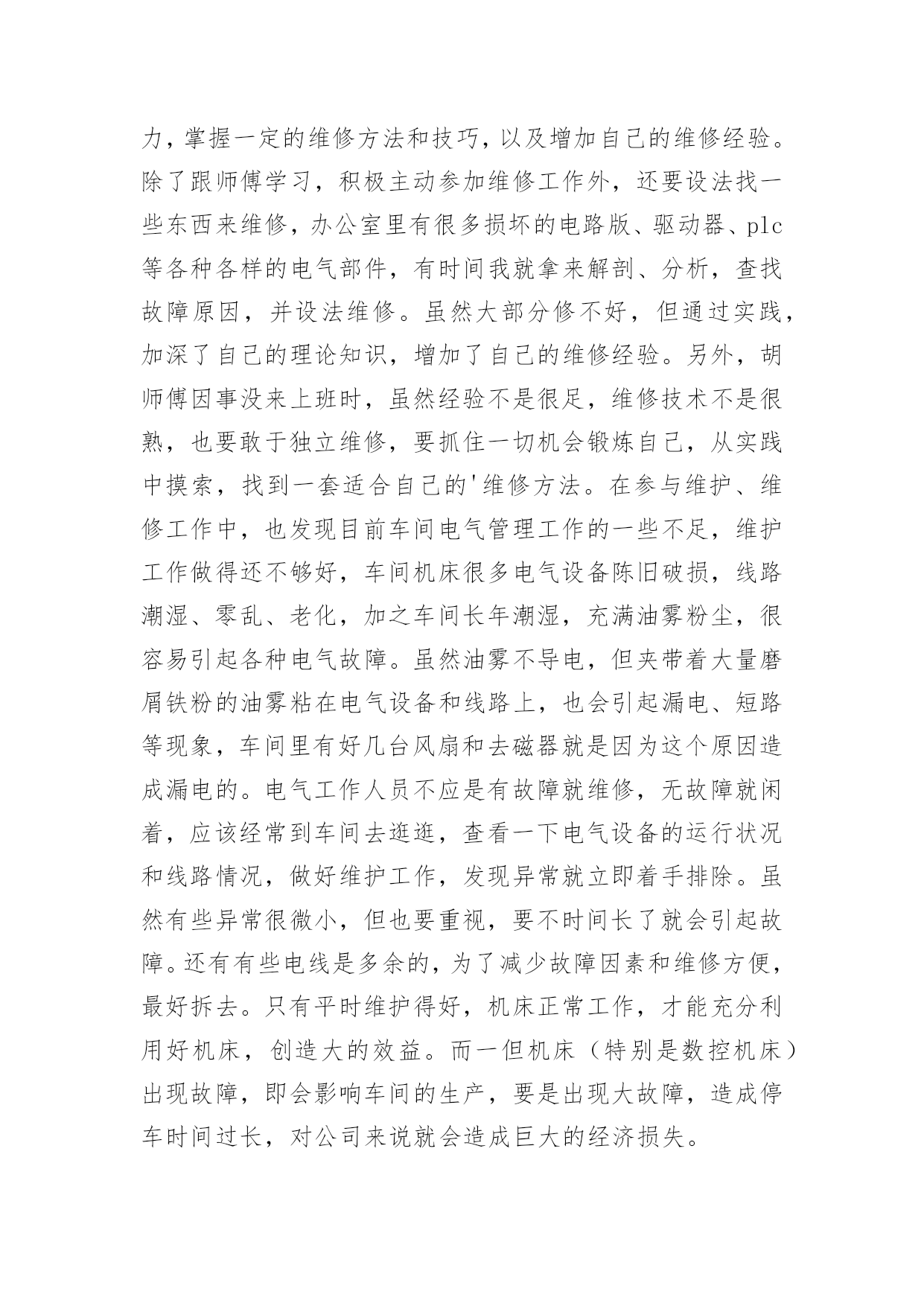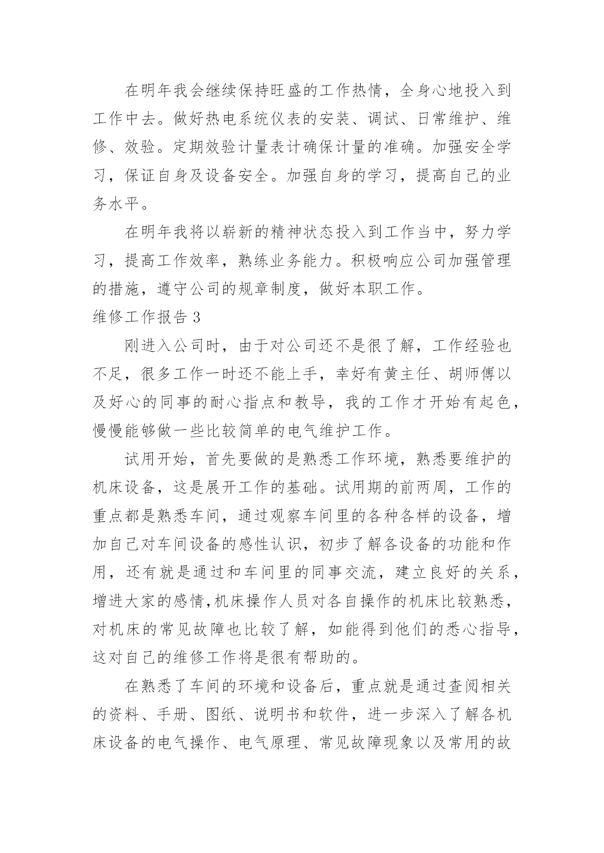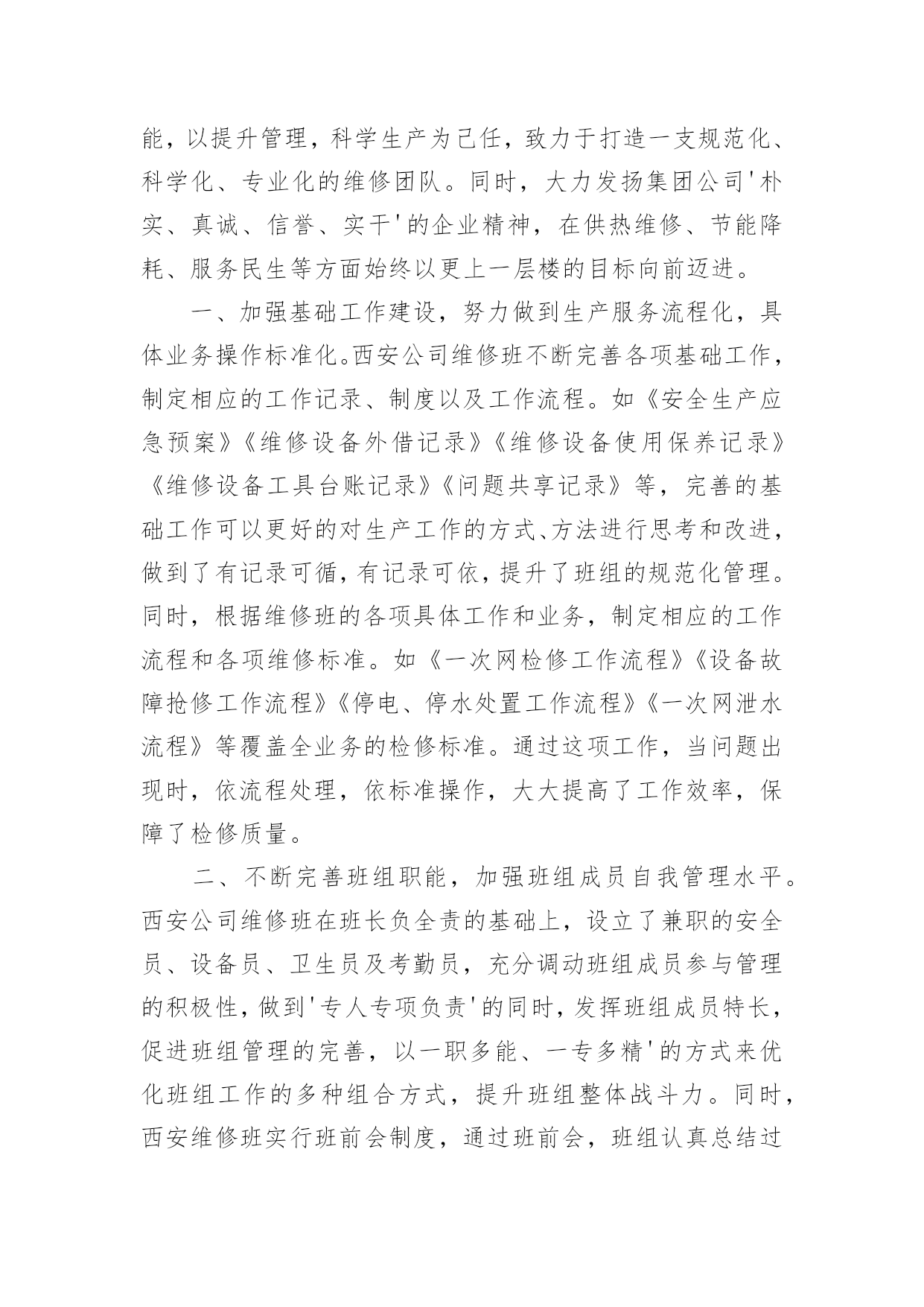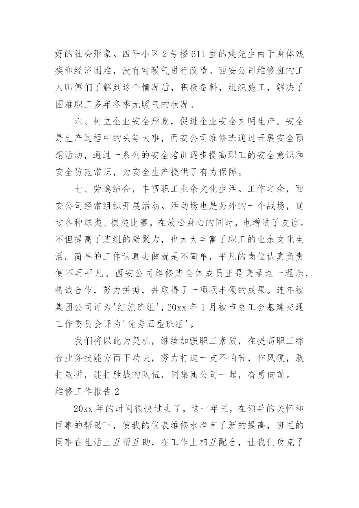 维修工作报告维修工作报告在我们平凡的日常里,报告与我们愈发关系密切,通常情况下,报告的内容含量大、篇幅较长。写起报告来就毫无头绪?下面是小编整理的维修工作报告,欢迎阅读,希望大家能够喜欢。维修工作报告1几年来,供热集团在'大发展,严节约'以及'管理提升'的战略指导下,不断发展壮大,这背后离不开那些忙碌在生产一线的各班组的无名英雄们。一年四季,这些无名英雄起早贪黑,默默无闻,炎热的夏季,顶着酷暑,从安装一个螺丝,一台阀门,补一道焊口开始;寒冷的冬季,报修的电话铃声就是行动指令;采暖季里,这里没有时间的概念,没有室内、室外之分,地沟里、管道口处处留下了他们的身影。无怨无悔换来了集团公司的越来越好,也换来了冬日里的一个个春意!西安公司维修班现有维修人员19名,平均年龄36岁,是一支年轻的维修队伍。虽然年轻,他们并没有忘记老一代供热人精益求精,勤勤恳恳的工作作风。因为年轻,他们更有着朝气蓬勃,创新好学的良好品质。一直以来,西安公司始终贯彻集团公司关于加强'班组建设'的要求,并结合自身实际,不断提高班组成员的自我管理能力,不断完善班组职能,以提升管理,科学生产为己任,致力于打造一支规范化、科学化、专业化的维修团队。同时,大力发扬集团公司'朴实、真诚、信誉、实干'的企业精神,在供热维修、节能降耗、服务民生等方面始终以更上一层楼的目标向前迈进。一、加强基础工作建设,努力做到生产服务流程化,具体业务操作标准化。西安公司维修班不断完善各项基础工作,制定相应的工作记录、制度以及工作流程。如《安全生产应急预案》《维修设备外借记录》《维修设备使用保养记录》《维修设备工具台账记录》《问题共享记录》等,完善的基础工作可以更好的对生产工作的方式、方法进行思考和改进,做到了有记录可循,有记录可依,提升了班组的规范化管理。同时,根据维修班的各项具体工作和业务,制定相应的工作流程和各项维修标准。如《一次网检修工作流程》《设备故障抢修工作流程》《停电、停水处置工作流程》《一次网泄水流程》等覆盖全业务的检修标准。通过这项工作,当问题出现时,依流程处理,依标准操作,大大提高了工作效率,保障了检修质量。二、不断完善班组职能,加强班组成员自我管理水平。西安公司维修班在班长负全责的基础上,设立了兼职的安全员、设备员、卫生员及考勤员,充分调动班组成员参与管理的积极性,做到'专人专项负责'的同时,发挥班组成员特长,促进班组管理的完善,以一职多能、一专多精'的方式来优化班组工作的多种组合方式,提升班组整体战斗力。同时,西安维修班实行班前会制度,通过班前会,班组认真总结过去工作的不足,科学布置下阶段的生产任务,充分发挥'总结'和'计划'的作用,让班组成员对近期问题,近期目标有清晰的了解和掌握,对控制质量,掌握进度发挥了积极作用。三、加强职工培训,进一步提升班组成员的专业技能。西安公司按照集团公司打造'三支队伍'的部署,在积极组织参加集团公司的各项专业培训的基础上,经常性的开展班组内部培训、竞赛、比武,做到干中学,学中干,在班组里形成浓厚的.比、学、赶、帮、超'的工作氛围,通过多种形式的学习、培训,大大提高了班组成员的各项专业技能,并涌现出一批优秀的技术人才。其中焊工胡百达连续两届获得集团公司焊工技能比武大赛第一名;电工郭岩连续两届获得集团公司电工技能比武大赛第一名;电工陈立寰于20xx年获得集团公司电工比武大赛第三名。四、以'节能降耗'为中心,努力保障公司生产稳定运行。西安公司担负着辖区内50余座换热站,280多万平方米的供热生产任务。管网的稳定运行,设备的安全运转,用户的满意都是我们最核心的工作任务。当然,好的生产一定是高效的生产,好的生产一定是节约的生产。我们通过及时、细致的设备检修,15—16采暖期和14—15采暖期同比,在未影响供热质量的前提下,节水42450吨;节电192919度,取得了良好的经济效益。五、解决民生问题,促进社会和谐发展。西安公司一直以来都以'服务民生'为工作理念,不断为热用户排忧解难,增强了热用户与企业之间的和谐与理解,树立了国有企业良好的社会形象。四平小区2号楼611室的姚先生由于身体残疾和经济困难,没有对暖气进行改造。西安公司维修班的工人师傅们了解到这个情况后,积极备料,组织施工,解决了困难职工多年冬季无暖气的状况。六、树立企业安全形象,促进企业安全文明生产。安全是生产过程中的头等大事,西安公司维修班通过开展安全预想活动,通过一系列的安全培训逐步提高职工的安全意识和安全防范常识,为安全生产提供了有力保障。七、劳逸结合,丰富职工业余文化生活。工作之余,西安公司经常组织开展活动。活动场也是另外的一个战场,通过各种球类、棋类比赛,在放松身心的同时,也增进了友谊。不但提高了班组的凝聚力,也大大丰富了职工的业余文化生活。简单的工作认真去做就是不简单,平凡的