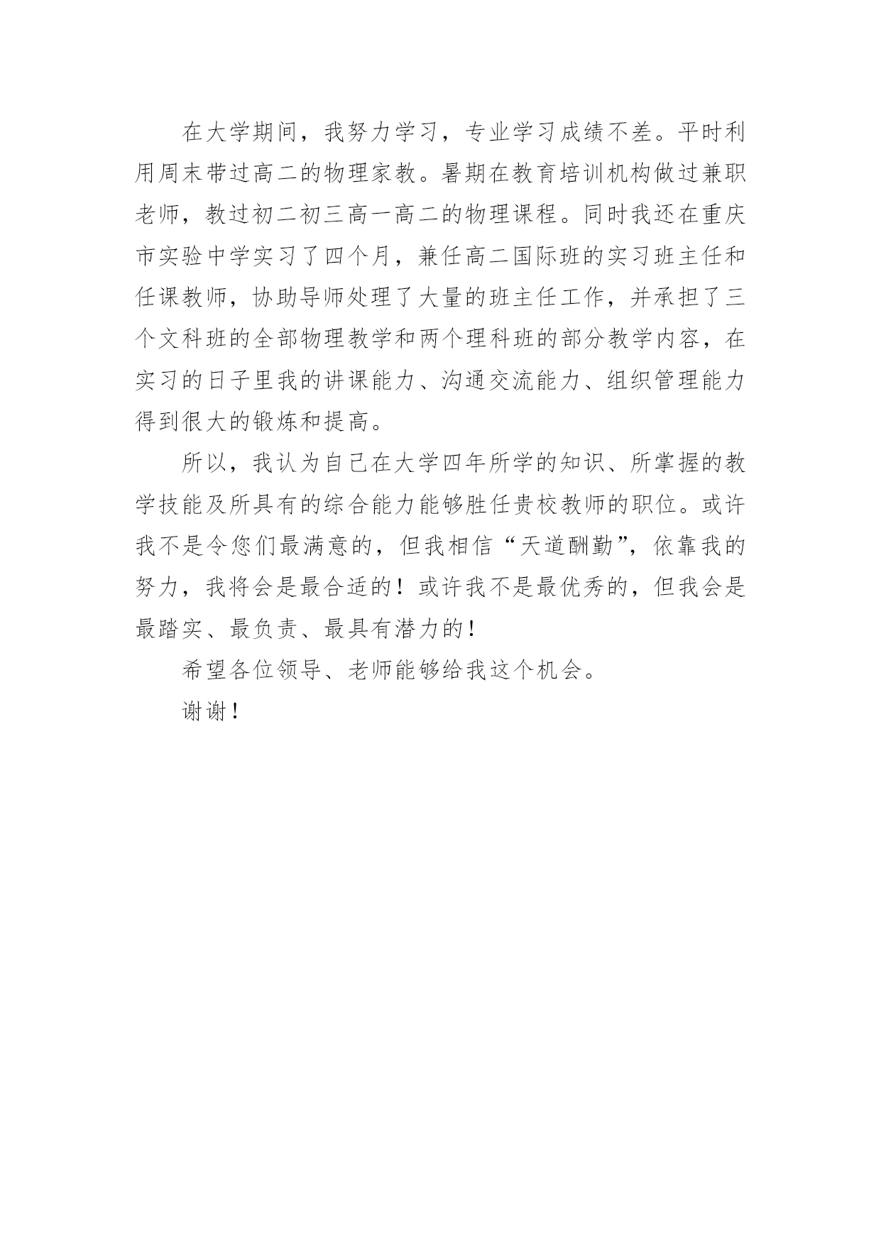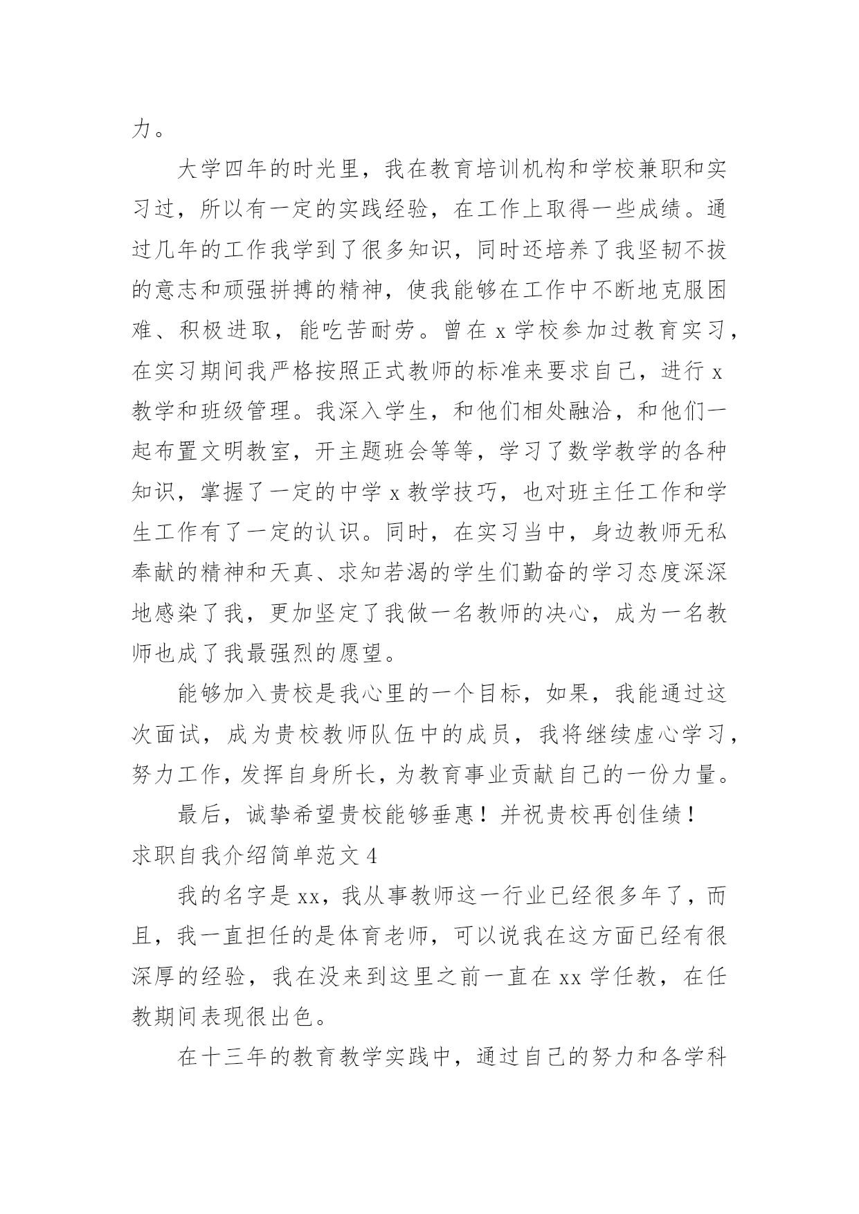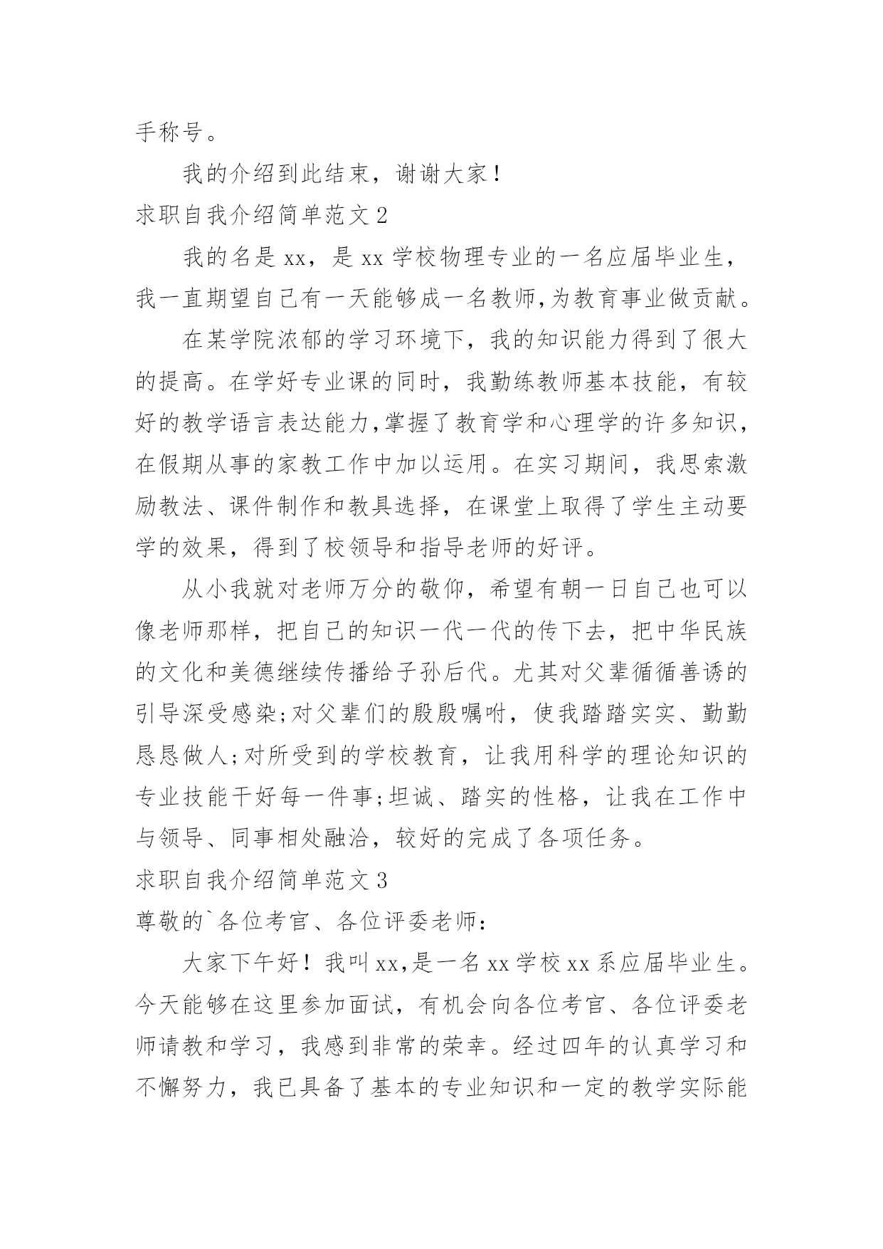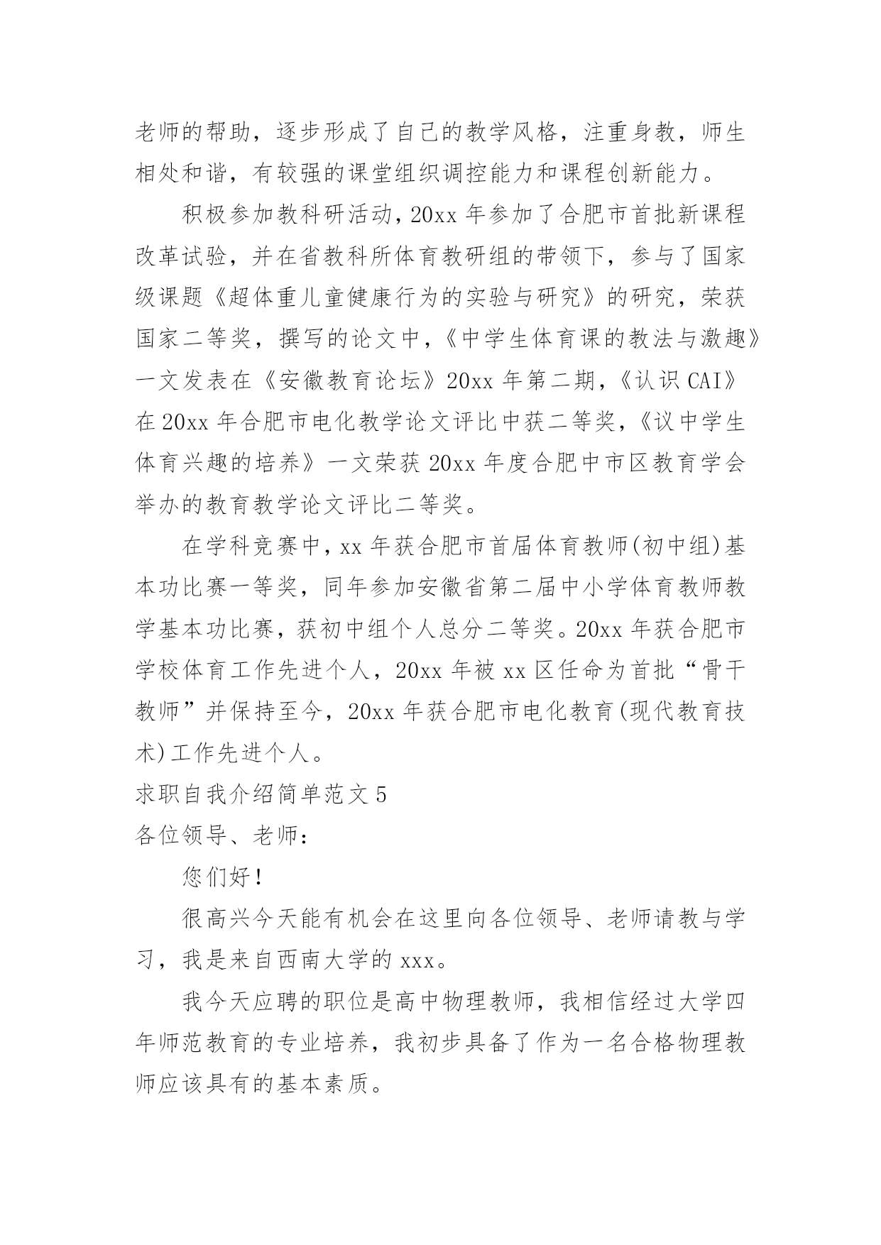 求职自我介绍简单求职自我介绍简单范文来到一个新的地方后,我们总归要向他人介绍自己,用自我介绍往往可以向他人介绍自己。现在你是否对自我介绍一筹莫展呢?以下是小编精心整理的求职自我介绍简单范文,欢迎大家分享。求职自我介绍简单范文1大家好,我叫xxx,是xxxxx师范学院中文系汉语言文学教育xxxx年本科毕业生。在校期间努力提高和完善自我,取得了优异成绩。20xx年8月就职于一所示范高中,从事高中语文教学工作。工作五年来我兢兢业业、勤勤恳恳,得到了领导和同事的一致好评。下面我从教学、教育、教育科研和继续教育四个方面向您介绍一下自己。从教以来本着对学生负责,对学校和国家负责,全身心投入到教学中。教学工作多次受到校、县领导的表彰。20xx年4月,在xx县教育局教研室组织的20xx年“xx县高中语文优质课大赛”中,所讲的课《逍遥游》被评为一等奖。20xx年4月,在xx市教学研究室组织的xx市20xx年高中语文优质课评比中,所讲的课《项链》荣获三等奖。20xx年6月我执教的《陈情表》一课被中国语文报刊协会课堂教学分会评定为语文课堂教学优质课,获得一等奖,本人荣获教学能手称号。我的介绍到此结束,谢谢大家!求职自我介绍简单范文2我的名是xx,是xx学校物理专业的一名应届毕业生,我一直期望自己有一天能够成一名教师,为教育事业做贡献。在某学院浓郁的学习环境下,我的知识能力得到了很大的提高。在学好专业课的同时,我勤练教师基本技能,有较好的教学语言表达能力,掌握了教育学和心理学的许多知识,在假期从事的家教工作中加以运用。在实习期间,我思索激励教法、课件制作和教具选择,在课堂上取得了学生主动要学的效果,得到了校领导和指导老师的好评。从小我就对老师万分的敬仰,希望有朝一日自己也可以像老师那样,把自己的知识一代一代的传下去,把中华民族的文化和美德继续传播给子孙后代。尤其对父辈循循善诱的引导深受感染;对父辈们的殷殷嘱咐,使我踏踏实实、勤勤恳恳做人;对所受到的学校教育,让我用科学的理论知识的专业技能干好每一件事;坦诚、踏实的性格,让我在工作中与领导、同事相处融洽,较好的完成了各项任务。求职自我介绍简单范文3尊敬的`各位考官、各位评委老师:大家下午好!我叫xx,是一名xx学校xx系应届毕业生。今天能够在这里参加面试,有机会向各位考官、各位评委老师请教和学习,我感到非常的荣幸。经过四年的认真学习和不懈努力,我已具备了基本的专业知识和一定的教学实际能力。大学四年的时光里,我在教育培训机构和学校兼职和实习过,所以有一定的实践经验,在工作上取得一些成绩。通过几年的工作我学到了很多知识,同时还培养了我坚韧不拔的意志和顽强拼搏的精神,使我能够在工作中不断地克服困难、积极进取,能吃苦耐劳。曾在x学校参加过教育实习,在实习期间我严格按照正式教师的标准来要求自己,进行x教学和班级管理。我深入学生,和他们相处融洽,和他们一起布置文明教室,开主题班会等等,学习了数学教学的各种知识,掌握了一定的中学x教学技巧,也对班主任工作和学生工作有了一定的认识。同时,在实习当中,身边教师无私奉献的精神和天真、求知若渴的学生们勤奋的学习态度深深地感染了我,更加坚定了我做一名教师的决心,成为一名教师也成了我最强烈的愿望。能够加入贵校是我心里的一个目标,如果,我能通过这次面试,成为贵校教师队伍中的成员,我将继续虚心学习,努力工作,发挥自身所长,为教育事业贡献自己的一份力量。最后,诚挚希望贵校能够垂惠!并祝贵校再创佳绩!求职自我介绍简单范文4我的名字是xx,我从事教师这一行业已经很多年了,而且,我一直担任的是体育老师,可以说我在这方面已经有很深厚的经验,我在没来到这里之前一直在xx学任教,在任教期间表现很出色。在十三年的教育教学实践中,通过自己的努力和各学科老师的帮助,逐步形成了自己的教学风格,注重身教,师生相处和谐,有较强的课堂组织调控能力和课程创新能力。积极参加教科研活动,20xx年参加了合肥市首批新课程改革试验,并在省教科所体育教研组的带领下,参与了国家级课题《超体重儿童健康行为的实验与研究》的研究,荣获国家二等奖,撰写的论文中,《中学生体育课的教法与激趣》一文发表在《安徽教育论坛》20xx年第二期,《认识CAI》在20xx年合肥市电化教学论文评比中获二等奖,《议中学生体育兴趣的培养》一文荣获20xx年度合肥中市区教育学会举办的教育教学论文评比二等奖。在学科竞赛中,xx年获合肥市首届体育教师(初中组)基本功比赛一等奖,同年参加安徽省第二届中小学体育教师教学基本功比赛,获初中组个人总分二等奖。20xx年获合肥市学校体育工作先进个人,20xx年被xx区任命为首批“骨干教师”并保持至今,20xx年获合肥市电化教育(现代教育技术)工作先进个人。求职自我介绍简单范文5各位领导、老师:您们好!很高兴今天能有机
