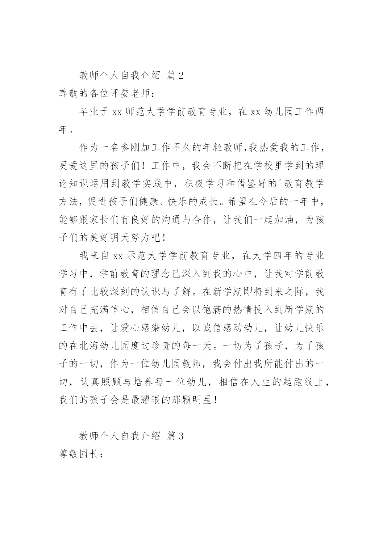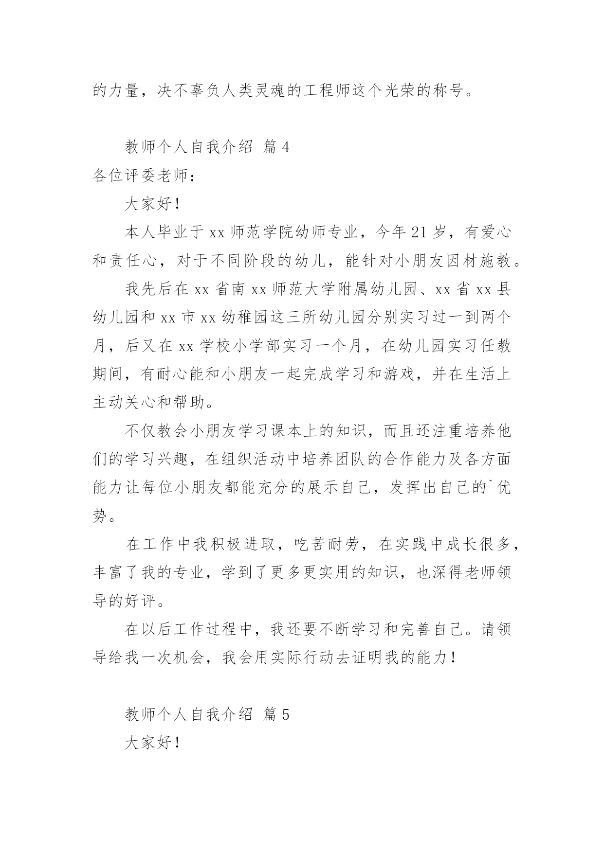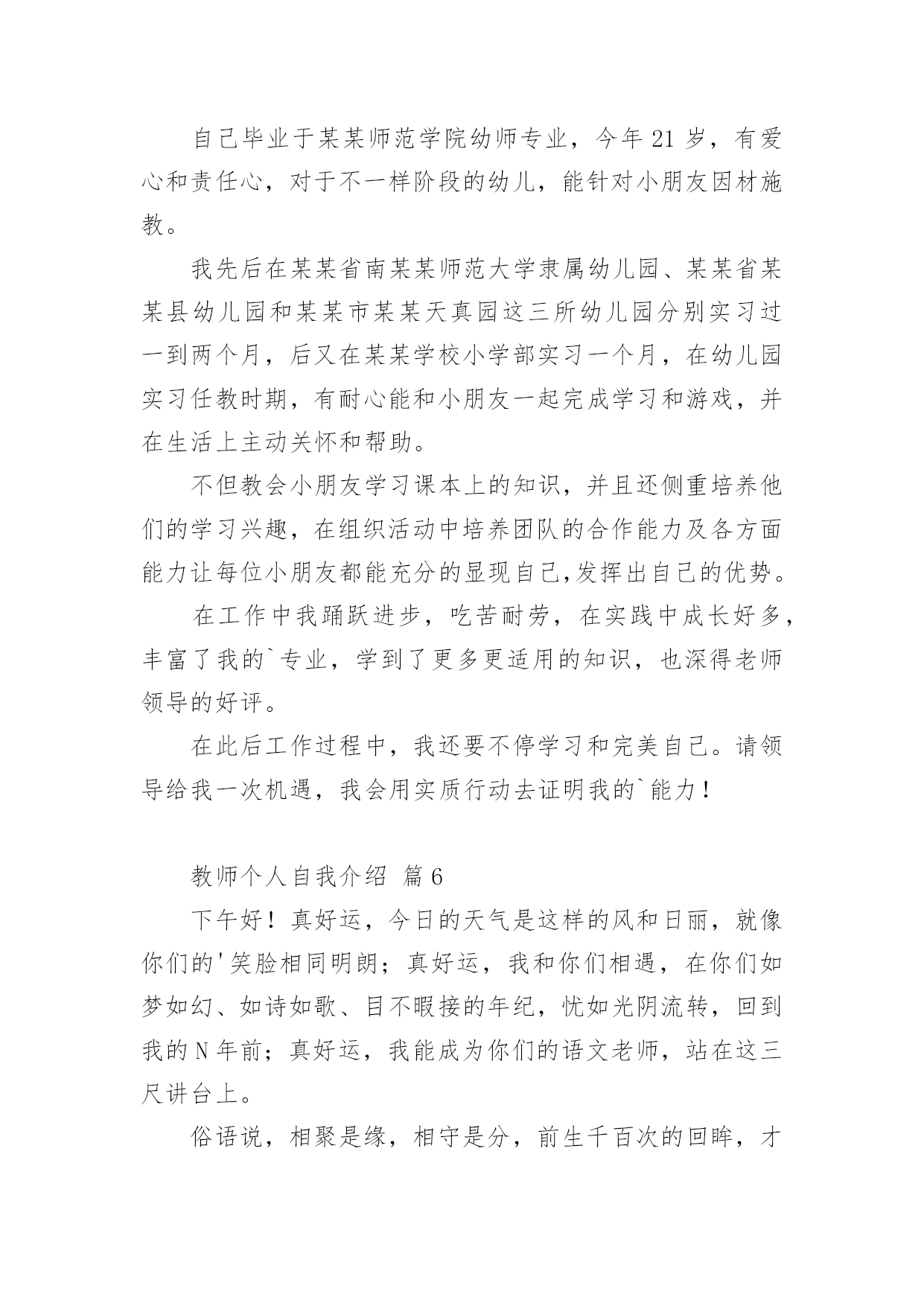 教师个人自我介绍当来到一个陌生环境中,我们总归要向他人介绍自己,自我介绍可以给陌生人留下一个好的印象。写自我介绍可不能随随便便哦,下面是小编为大家整理的教师个人自我介绍,仅供参考,大家一起来看看吧。教师个人自我介绍篇1尊敬的园长:您好!我是幼儿职校的xxx。在幼教实习中我本着一颗童心、爱心、信心,始终如一地对待每一个家长和孩子,受到一致好评。我的性格开朗、热情大方。幼教这个职业是神圣而伟大的,他要求教师不仅要有丰富的知识,还要有高尚的情操。因此,在读师范时,我就十分注重自身的全面发展,广泛地培养自己的兴趣,并学有专长,做到除擅长和外,还会唱、会跳、会讲。当然,“学高仅能为师,身正方能为范”,在注重知识学习的同时我还注意培养自己高尚的'道德情操,自觉遵纪守法,遵守社会公德,没有不良嗜好和行为。最重要的是,我很喜爱小孩,也非常受孩子们喜欢,我有很好的方法与之沟通和交流,我想,这些都是一名幼儿教育工作者应该具备的最起码的素养。教师个人自我介绍篇2尊敬的各位评委老师:毕业于xx师范大学学前教育专业,在xx幼儿园工作两年。作为一名参刚加工作不久的年轻教师,我热爱我的工作,更爱这里的孩子们!工作中,我会不断把在学校里学到的理论知识运用到教学实践中,积极学习和借鉴好的'教育教学方法,促进孩子们健康、快乐的成长。希望在今后的一年中,能够跟家长们有良好的沟通与合作,让我们一起加油,为孩子们的美好明天努力吧!我来自xx示范大学学前教育专业,在大学四年的专业学习中,学前教育的理念已深入到我的心中,让我对学前教育有了比较深刻的认识与了解。在新学期即将到来之际,我对自己充满信心,相信自己会以饱满的热情投入到新学期的工作中去,让爱心感染幼儿,以诚信感动幼儿,让幼儿快乐的在北海幼儿园度过珍贵的每一天。一切为了孩子,为了孩子的一切,作为一位幼儿园教师,我会付出我所能付出的一切,认真照顾与培养每一位幼儿,相信在人生的起跑线上,我们的孩子会是最耀眼的那颗明星!教师个人自我介绍篇3尊敬园长:你好,非常高兴和倍感荣幸能应聘幼儿园老师这个职位!我叫xx,今年xx岁。20xx年我从xx师范大学的幼师专业毕业。由于刚刚毕业没有经验之前机会不多,幸好华南幼儿园正好需要幼师,所以就在xx幼儿园当幼师一年半。回想起那段时光真是既甜蜜又美好,虽然工资很低,但听着同学们围在身旁老师、老师的叫个不停,看着那一双双充满信任的眼睛,那一张张稚气的小脸,生活中的所有不快都顿时烟消云散了。我原想,只要学校需要,就是当一辈子代课教师我也心甘情愿。不料,由于幼儿园资金周转困难面临倒闭,接到了学校的口头通知后,我怀着恋恋不舍的心情,悄悄地离开了学校。如今的我,历经生活的考验,比起我的竞争对手在年龄上我已不再有优势,但是我比他们更多了一份对孩子的爱心、耐心和责任心,更多了一份成熟和自信。幼师这个职业是神圣而伟大的,他要求幼师不仅要有丰富的知识,还要有高尚的情操。因此,在读师范时,我就十分注重自身的全面发展,广泛地培养自己的兴趣爱好,并学有专长,做到除擅长绘画和书法外,还能会唱、会说、会讲。学高仅能为师,身正方能为范,在注重知识学习的'同时我还注意培养自己高尚的道德情操,自觉遵纪守法,遵守社会公德,没有不良嗜好和行为。我想这些都是一名教育工作者应该具备的最起码的素养。假如,我通过了面试,成为众多幼师队伍中的成员,我将不断努力学习,努力工作,为幼儿园的教育事业贡献自己的力量,决不辜负人类灵魂的工程师这个光荣的称号。教师个人自我介绍篇4各位评委老师:大家好!本人毕业于xx师范学院幼师专业,今年21岁,有爱心和责任心,对于不同阶段的幼儿,能针对小朋友因材施教。我先后在xx省南xx师范大学附属幼儿园、xx省xx县幼儿园和xx市xx幼稚园这三所幼儿园分别实习过一到两个月,后又在xx学校小学部实习一个月,在幼儿园实习任教期间,有耐心能和小朋友一起完成学习和游戏,并在生活上主动关心和帮助。不仅教会小朋友学习课本上的知识,而且还注重培养他们的学习兴趣,在组织活动中培养团队的合作能力及各方面能力让每位小朋友都能充分的展示自己,发挥出自己的`优势。在工作中我积极进取,吃苦耐劳,在实践中成长很多,丰富了我的专业,学到了更多更实用的知识,也深得老师领导的好评。在以后工作过程中,我还要不断学习和完善自己。请领导给我一次机会,我会用实际行动去证明我的能力!教师个人自我介绍篇5大家好!自己毕业于某某师范学院幼师专业,今年21岁,有爱心和责任心,对于不一样阶段的幼儿,能针对小朋友因材施教。我先后在某某省南某某师范大学隶属幼儿园、某某省某某县幼儿园和某某市某某天真园这三所幼儿园分别实习过一到两个月,后又在某某学校小学部实习一个月,在幼儿园实习任教时期,有耐心能和小朋友一起完成学习和游戏,并在生活上主动关怀和帮助。不但教会小朋友学习