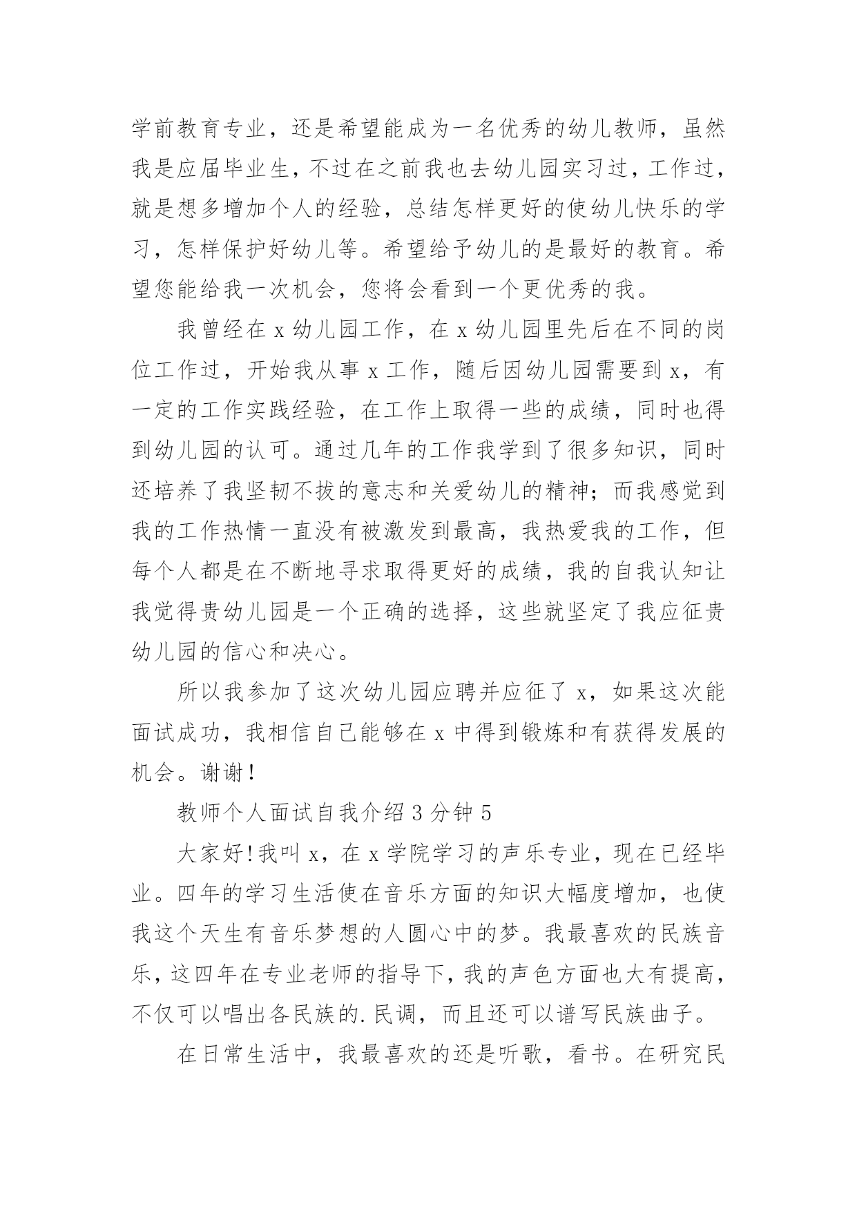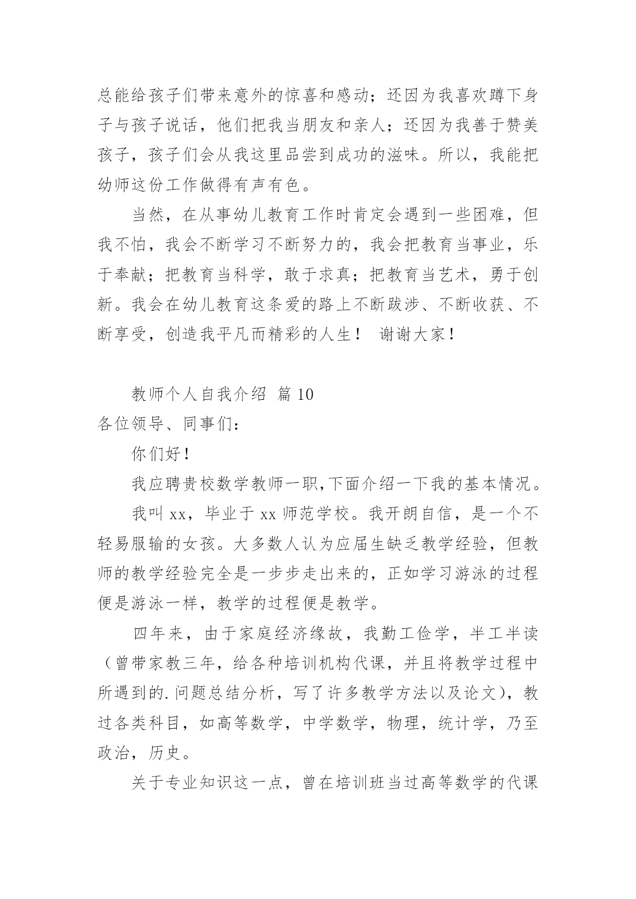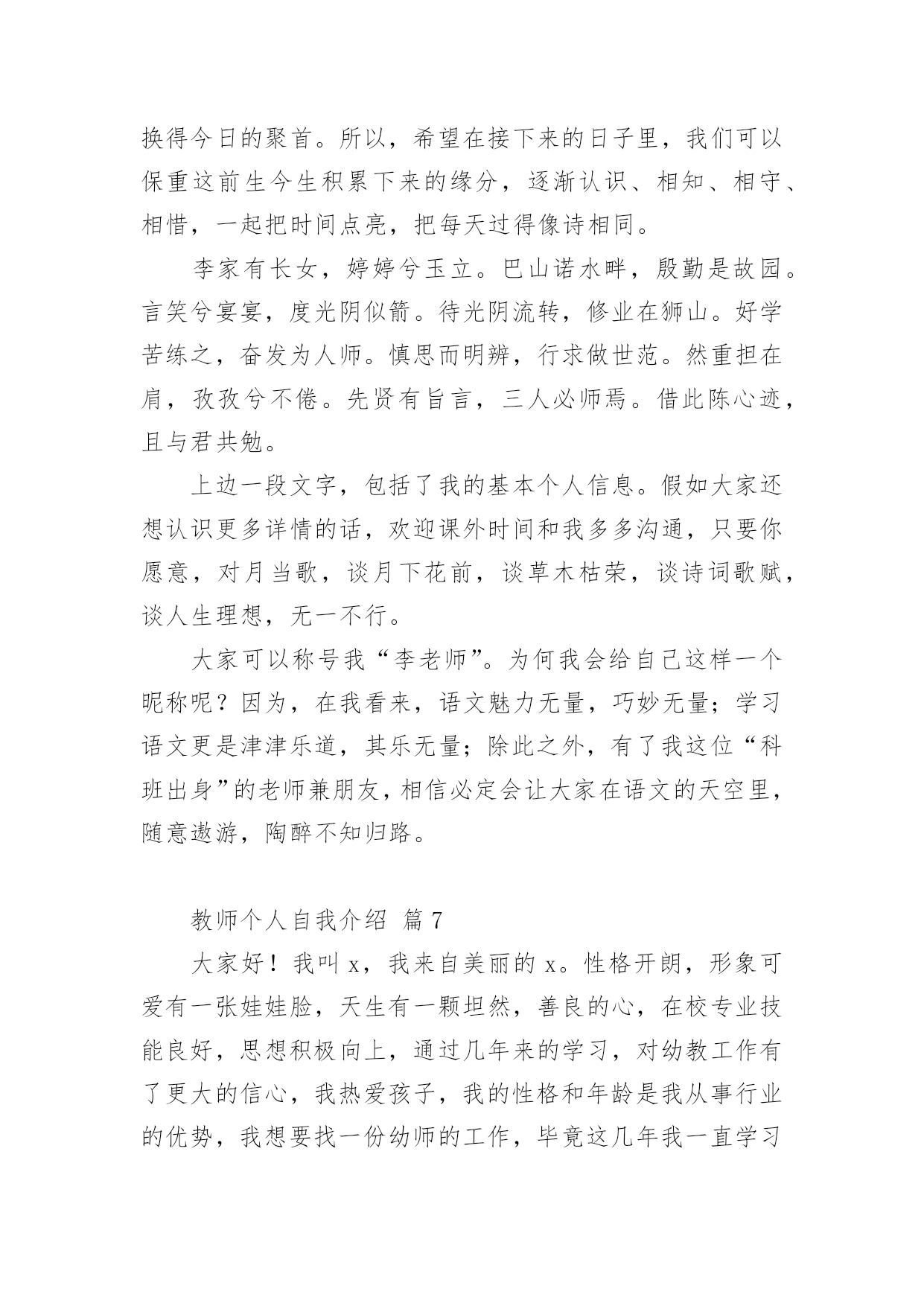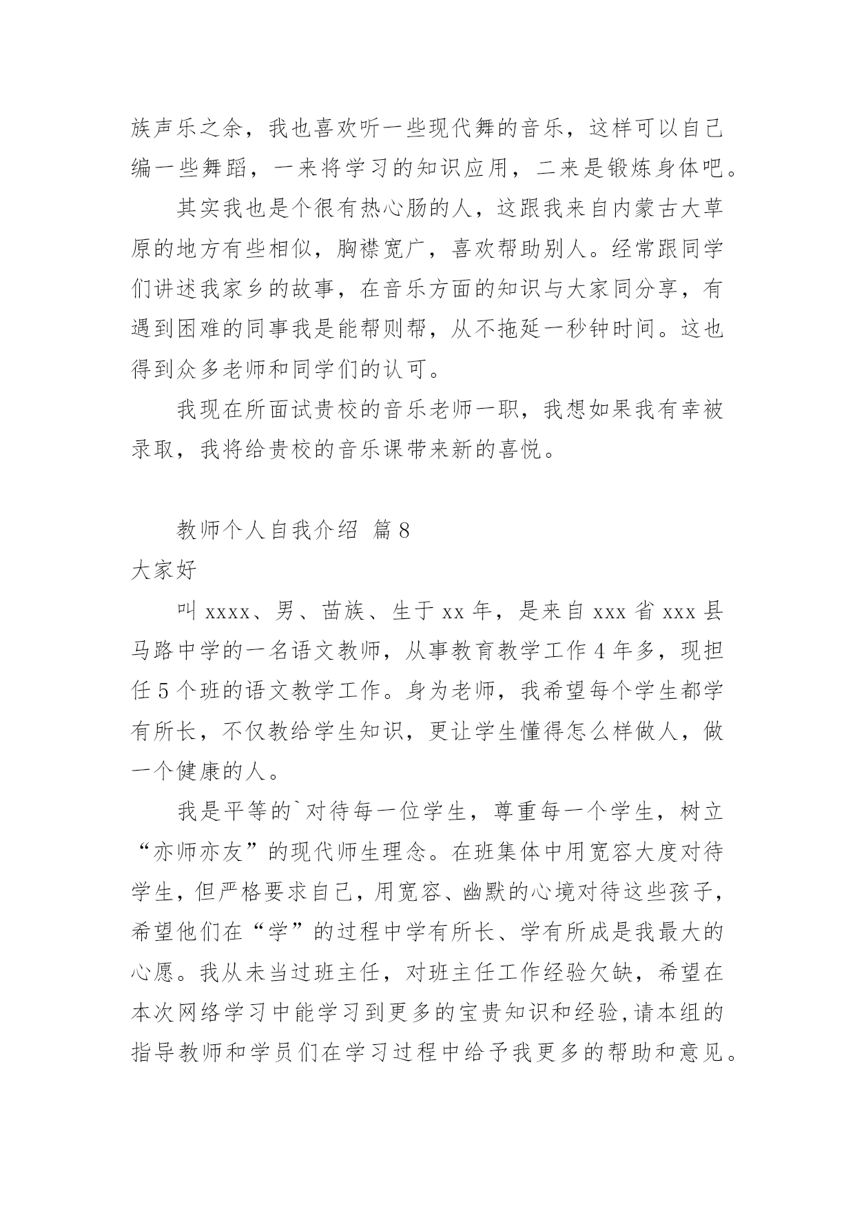 教师个人自我介绍当来到一个陌生环境中,我们总归要向他人介绍自己,自我介绍可以给陌生人留下一个好的印象。写自我介绍可不能随随便便哦,下面是小编为大家整理的教师个人自我介绍,仅供参考,大家一起来看看吧。教师个人自我介绍篇1尊敬的园长:您好!我是幼儿职校的xxx。在幼教实习中我本着一颗童心、爱心、信心,始终如一地对待每一个家长和孩子,受到一致好评。我的性格开朗、热情大方。幼教这个职业是神圣而伟大的,他要求教师不仅要有丰富的知识,还要有高尚的情操。因此,在读师范时,我就十分注重自身的全面发展,广泛地培养自己的兴趣,并学有专长,做到除擅长和外,还会唱、会跳、会讲。当然,“学高仅能为师,身正方能为范”,在注重知识学习的同时我还注意培养自己高尚的'道德情操,自觉遵纪守法,遵守社会公德,没有不良嗜好和行为。最重要的是,我很喜爱小孩,也非常受孩子们喜欢,我有很好的方法与之沟通和交流,我想,这些都是一名幼儿教育工作者应该具备的最起码的素养。教师个人自我介绍篇2尊敬的各位评委老师:毕业于xx师范大学学前教育专业,在xx幼儿园工作两年。作为一名参刚加工作不久的年轻教师,我热爱我的工作,更爱这里的孩子们!工作中,我会不断把在学校里学到的理论知识运用到教学实践中,积极学习和借鉴好的'教育教学方法,促进孩子们健康、快乐的成长。希望在今后的一年中,能够跟家长们有良好的沟通与合作,让我们一起加油,为孩子们的美好明天努力吧!我来自xx示范大学学前教育专业,在大学四年的专业学习中,学前教育的理念已深入到我的心中,让我对学前教育有了比较深刻的认识与了解。在新学期即将到来之际,我对自己充满信心,相信自己会以饱满的热情投入到新学期的工作中去,让爱心感染幼儿,以诚信感动幼儿,让幼儿快乐的在北海幼儿园度过珍贵的每一天。一切为了孩子,为了孩子的一切,作为一位幼儿园教师,我会付出我所能付出的一切,认真照顾与培养每一位幼儿,相信在人生的起跑线上,我们的孩子会是最耀眼的那颗明星!教师个人自我介绍篇3尊敬园长:你好,非常高兴和倍感荣幸能应聘幼儿园老师这个职位!我叫xx,今年xx岁。20xx年我从xx师范大学的幼师专业毕业。由于刚刚毕业没有经验之前机会不多,幸好华南幼儿园正好需要幼师,所以就在xx幼儿园当幼师一年半。回想起那段时光真是既甜蜜又美好,虽然工资很低,但听着同学们围在身旁老师、老师的叫个不停,看着那一双双充满信任的眼睛,那一张张稚气的小脸,生活中的所有不快都顿时烟消云散了。我原想,只要学校需要,就是当一辈子代课教师我也心甘情愿。不料,由于幼儿园资金周转困难面临倒闭,接到了学校的口头通知后,我怀着恋恋不舍的心情,悄悄地离开了学校。如今的我,历经生活的考验,比起我的竞争对手在年龄上我已不再有优势,但是我比他们更多了一份对孩子的爱心、耐心和责任心,更多了一份成熟和自信。幼师这个职业是神圣而伟大的,他要求幼师不仅要有丰富的知识,还要有高尚的情操。因此,在读师范时,我就十分注重自身的全面发展,广泛地培养自己的兴趣爱好,并学有专长,做到除擅长绘画和书法外,还能会唱、会说、会讲。学高仅能为师,身正方能为范,在注重知识学习的'同时我还注意培养自己高尚的道德情操,自觉遵纪守法,遵守社会公德,没有不良嗜好和行为。我想这些都是一名教育工作者应该具备的最起码的素养。假如,我通过了面试,成为众多幼师队伍中的成员,我将不断努力学习,努力工作,为幼儿园的教育事业贡献自己的力量,决不辜负人类灵魂的工程师这个光荣的称号。教师个人自我介绍篇4各位评委老师:大家好!本人毕业于xx师范学院幼师专业,今年21岁,有爱心和责任心,对于不同阶段的幼儿,能针对小朋友因材施教。我先后在xx省南xx师范大学附属幼儿园、xx省xx县幼儿园和xx市xx幼稚园这三所幼儿园分别实习过一到两个月,后又在xx学校小学部实习一个月,在幼儿园实习任教期间,有耐心能和小朋友一起完成学习和游戏,并在生活上主动关心和帮助。不仅教会小朋友学习课本上的知识,而且还注重培养他们的学习兴趣,在组织活动中培养团队的合作能力及各方面能力让每位小朋友都能充分的展示自己,发挥出自己的`优势。在工作中我积极进取,吃苦耐劳,在实践中成长很多,丰富了我的专业,学到了更多更实用的知识,也深得老师领导的好评。在以后工作过程中,我还要不断学习和完善自己。请领导给我一次机会,我会用实际行动去证明我的能力!教师个人自我介绍篇5大家好!自己毕业于某某师范学院幼师专业,今年21岁,有爱心和责任心,对于不一样阶段的幼儿,能针对小朋友因材施教。我先后在某某省南某某师范大学隶属幼儿园、某某省某某县幼儿园和某某市某某天真园这三所幼儿园分别实习过一到两个月,后又在某某学校小学部实习一个月,在幼儿园实习任教时期,有耐心能和小朋友一起完成学习和游戏,并在生活上主动关怀和帮助。不但教会小朋友学习