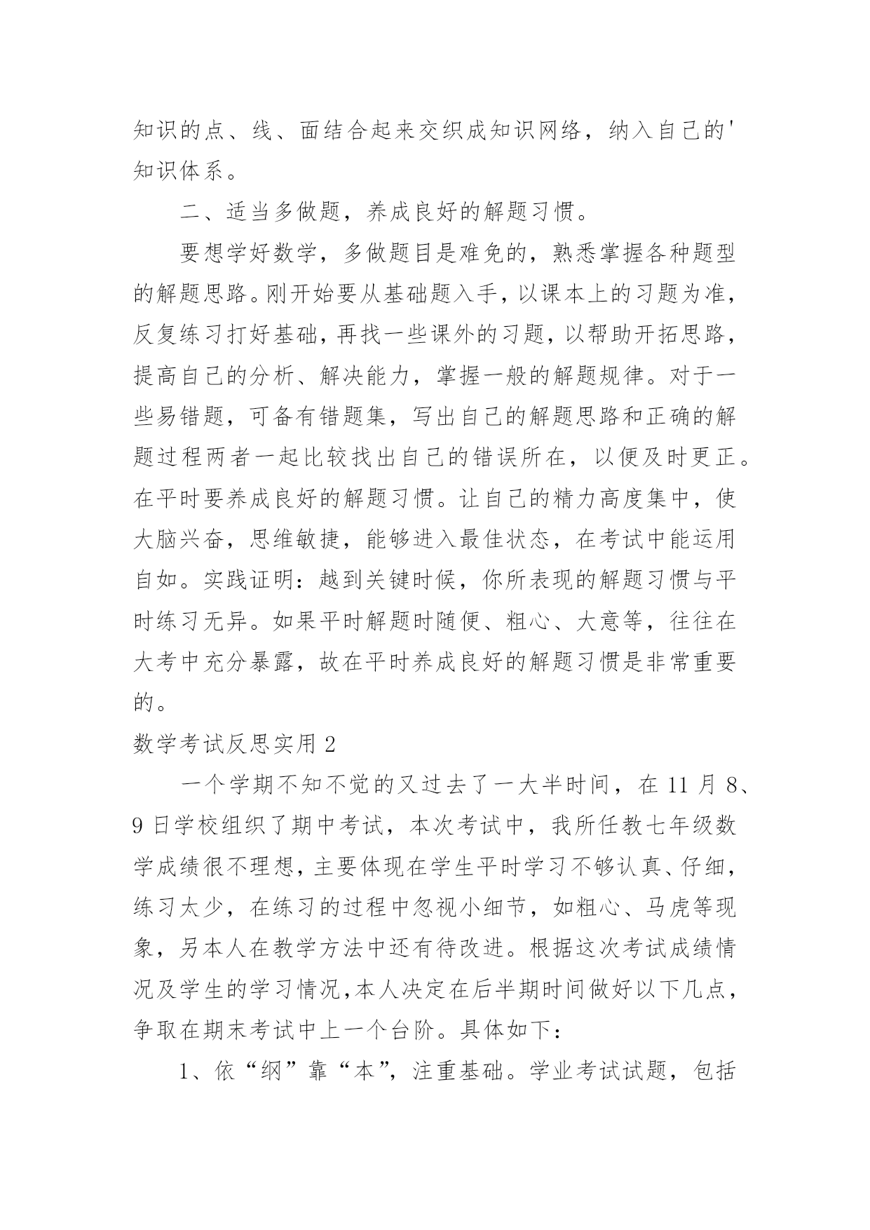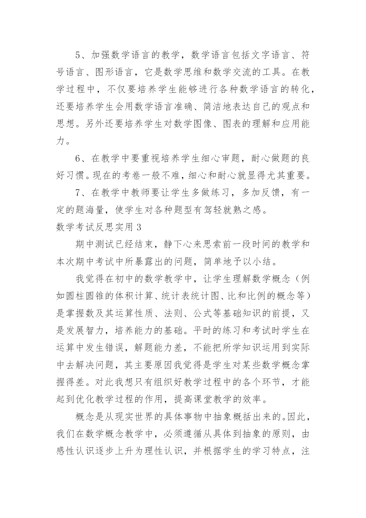 数学考试反思实用数学考试反思实用在日新月异的现代社会中,我们的任务之一就是课堂教学,反思过去,是为了以后。那么大家知道正规的反思怎么写吗?下面是小编为大家收集的数学考试反思实用,供大家参考借鉴,希望可以帮助到有需要的朋友。数学考试反思实用1重新审视这次数学考试,我认为在日常生活中,应做到以下几点:一、课内重视听讲,课后及时复习。新知识的接受,数学能力的培养主要在课堂上进行,所以要特点重视课内的学习效率,寻求正确的学习方法。上课时要紧跟老师的思路,积极展开思维预测下面的步骤,比较自己的解题思路与教师所讲有哪些不同。特别要抓住基础知识和基本技能的学习,课后要及时复习不留疑点。首先要在做各种习题之前将老师所讲的知识点回忆一遍,正确掌握各类公式的推理过程,庆尽量回忆而不采用不清楚立即翻书之举。认真独立完成作业,勤于思考,从某种意义上讲,应不造成不懂即问的学习作风,对于有些题目由于自己的思路不清,一时难以解出,应让自己冷静下来认真分析题目,尽量自己解决。在每个阶段的学习中要进行整理和归纳总结,把知识的点、线、面结合起来交织成知识网络,纳入自己的'知识体系。二、适当多做题,养成良好的解题习惯。要想学好数学,多做题目是难免的,熟悉掌握各种题型的解题思路。刚开始要从基础题入手,以课本上的习题为准,反复练习打好基础,再找一些课外的习题,以帮助开拓思路,提高自己的分析、解决能力,掌握一般的解题规律。对于一些易错题,可备有错题集,写出自己的解题思路和正确的解题过程两者一起比较找出自己的错误所在,以便及时更正。在平时要养成良好的解题习惯。让自己的精力高度集中,使大脑兴奋,思维敏捷,能够进入最佳状态,在考试中能运用自如。实践证明:越到关键时候,你所表现的解题习惯与平时练习无异。如果平时解题时随便、粗心、大意等,往往在大考中充分暴露,故在平时养成良好的解题习惯是非常重要的。数学考试反思实用2一个学期不知不觉的又过去了一大半时间,在11月8、9日学校组织了期中考试,本次考试中,我所任教七年级数学成绩很不理想,主要体现在学生平时学习不够认真、仔细,练习太少,在练习的过程中忽视小细节,如粗心、马虎等现象,另本人在教学方法中还有待改进。根据这次考试成绩情况及学生的学习情况,本人决定在后半期时间做好以下几点,争取在期末考试中上一个台阶。具体如下:1、依“纲”靠“本”,注重基础。学业考试试题,包括最后的综合题,都注重对基础知识、基本技能和基本思想方法的考查。在教学中,必须切实抓好基本概念及其性质、基本技能和基本思想方法的教学,让学生真正理解和掌握,并形成合理的网络结构。2、加强数学思想方法的教学,特别是加强学生分类讨论的数学思想方法的培养。数学基础知识和基本技能所反映出来的数学思想方法是数学知识的精髓,在课堂教学中,数学思想方法的教学应渗透在教学全过程中,使学生不仅学好概念、定理、法则等内容,而且能领悟其中的数学思想方法,并通过不断积累,逐渐内化为自己的经验,形成解决问题的自觉意识。3、转变观念,培养能力。学业考试试题对“双基”的考查,是将数学作为一个整体,进行多方位的全面考查,要求学生能够灵活、准确地运用数学知识和数学思想方法分析问题和解决问题。所以能力培养应落实在平时教学过程中。另外,还要注重培养学生的“实验”和“猜想”“观察”能力,因为数学不仅是思维科学,也是实验科学。数学推理不仅包括演绎推理,还包括合情推理。4、重视教学方法的改进,坚持“启发式”和“讨论式”,以问题作为教学的出发点,多设计、提出适合学生发展水平的具有一定探究性的问题,创设问题情境,使学生面对适度的困难,开展尝试和探究,让学生经历“再发现”和“再创造”的.过程。还要充分发挥例题教学的作用,适当运用变式,逐步设置障碍,以不断增加创造性因素。5、加强数学语言的教学,数学语言包括文字语言、符号语言、图形语言,它是数学思维和数学交流的工具。在教学过程中,不仅要培养学生能够进行各种数学语言的转化,还要培养学生会用数学语言准确、简洁地表达自己的观点和思想。另外还要培养学生对数学图像、图表的理解和应用能力。6、在教学中要重视培养学生细心审题,耐心做题的良好习惯。现在的考卷一般不难,细心和耐心就显得尤其重要。7、在教学中教师要让学生多做练习,多加反馈,有一定的题海量,使学生对各种题型有驾轻就熟之感。数学考试反思实用3期中测试已经结束,静下心来思索前一段时间的教学和本次期中考试中所暴露出的问题,简单地予以小结。我觉得在初中的数学教学中,让学生理解数学概念(例如圆柱圆锥的体积计算、统计表统计图、比和比例的概念等)是掌握数及其运算性质、法则、公式等基础知识的前提,又是发展智力,培养能力的基础。平时的练习和考试时学生在运算中发生错误,解题能力差,不能把所学知识运用到实际中去解决问题,其主要原因我觉得是学生对某些数