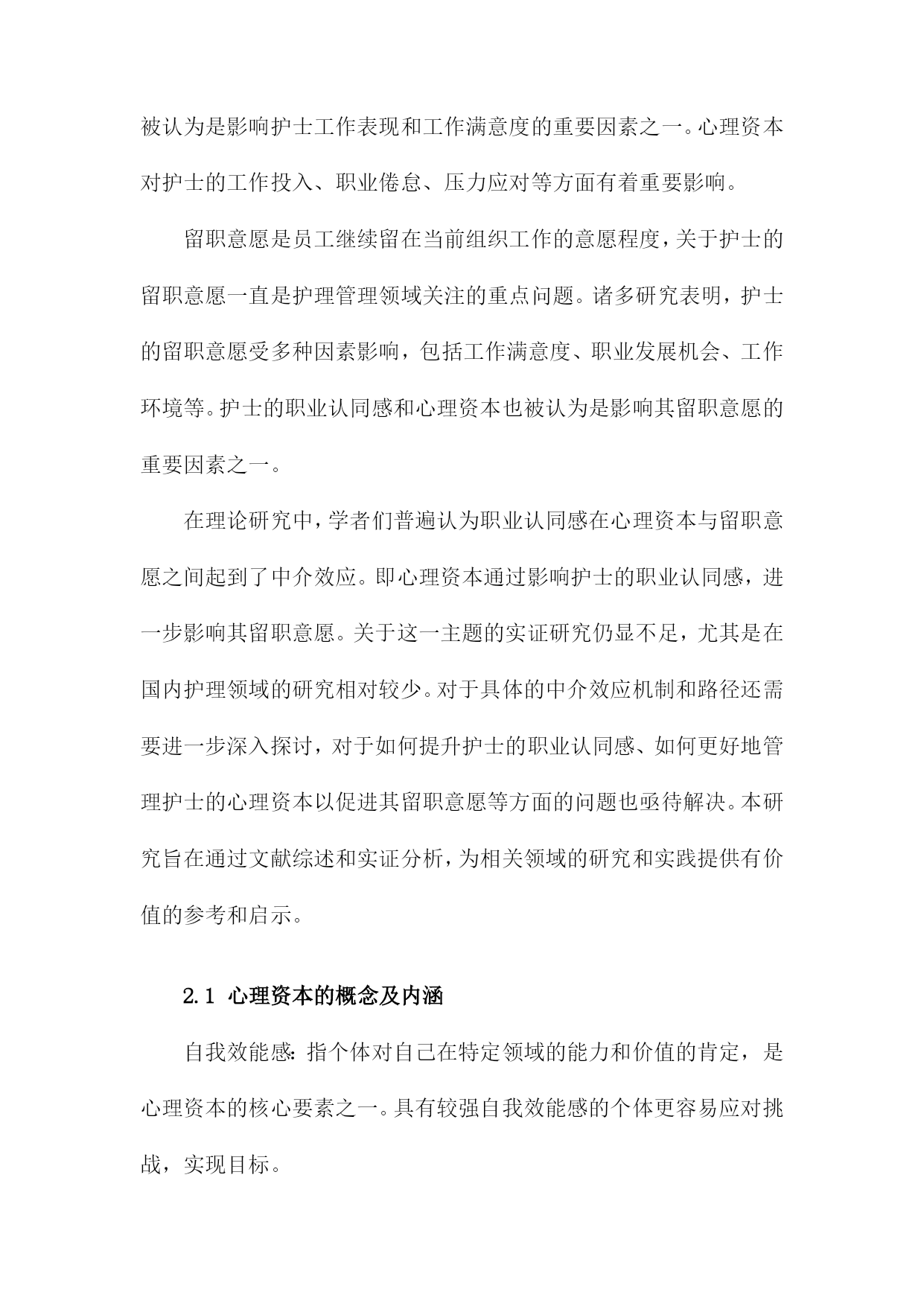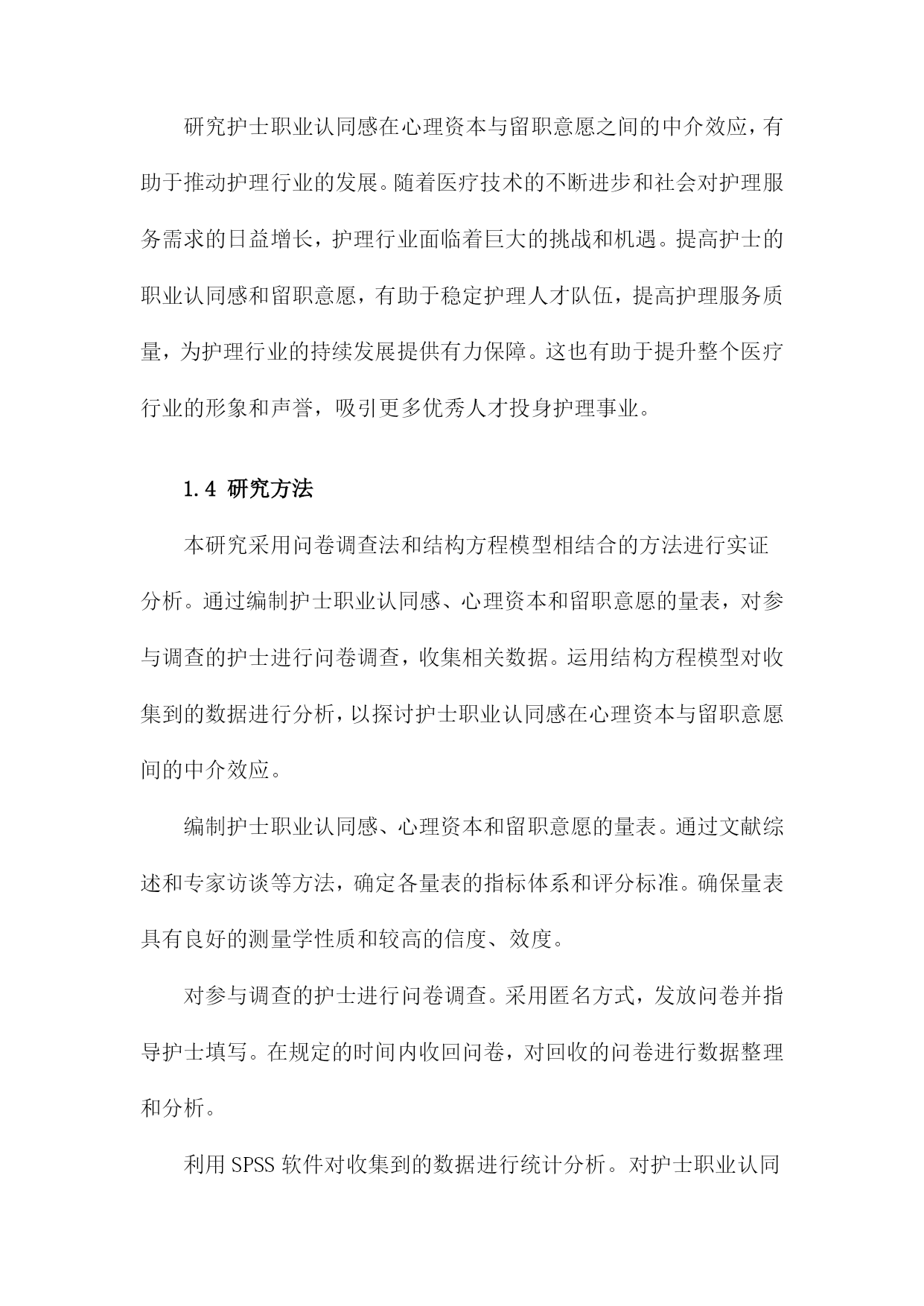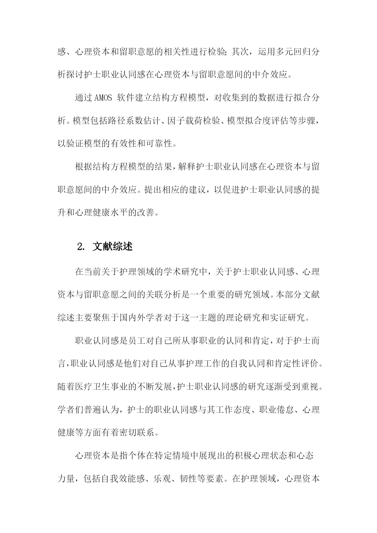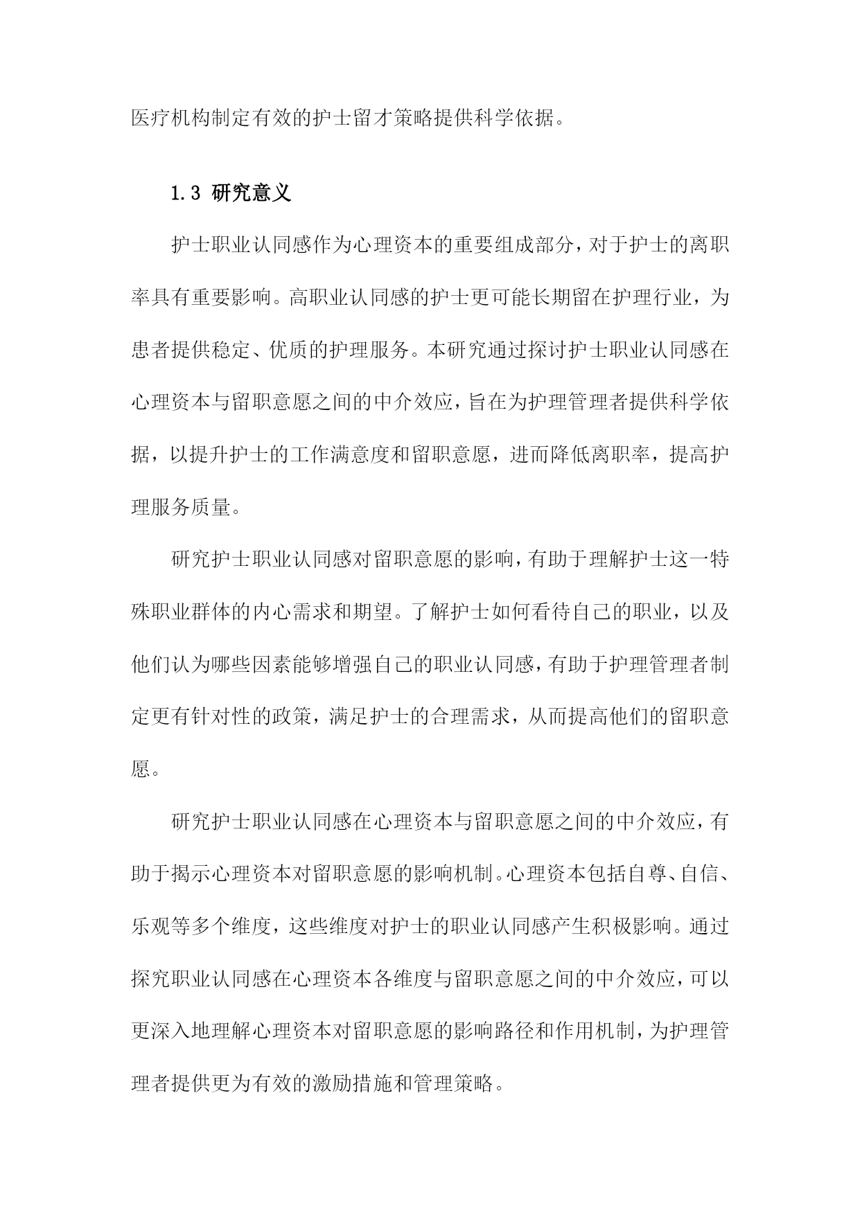 护士职业认同感在心理资本与留职意愿间的中介效应分析1.内容综述护士职业认同感已成为护理领域研究的热点问题,职业认同感是指个体对于所从事职业的肯定性价值判断和情感体验,对个体在职业生涯中的行为具有重要的影响。心理资本是指个体在心理层面上的资源,包括个体的自我效能、乐观主义、心理韧性等。留职意愿是指个体对于继续留在当前职业的意愿程度。护士职业认同感对心理资本和留职意愿具有重要影响,具有较高职业认同感的护士,往往能够更好地应对工作压力,提高工作效率和质量,从而增强心理资本。心理资本较高的护士也能更有效地管理病房,与患者建立良好的关系,提高患者的满意度,进一步降低离职意愿。护士职业认同感在心理资本与留职意愿之间扮演着重要角色,提高护士的职业认同感,有助于提高心理资本水平,从而增强留职意愿。护理管理者应重视护士职业认同感的培养,为护士提供良好的工作环境和职业发展机会,以稳定护理队伍,提高护理质量。1.1研究背景随着社会的发展和医疗水平的提高,护理工作在医疗卫生体系中的地位日益重要。护士作为医疗卫生服务的重要组成部分,承担着为患者提供全面、专业、人性化的护理服务的重要职责。护士职业认同感对个体的工作满意度、留职意愿以及心理资本具有重要的影响。心理资本是指个体在应对工作中的各种压力和挑战时所具备的心理素质,包括自我效能、乐观主义、归因于成功等。探讨护士职业认同感在心理资本与留职意愿间的中介效应对于提高护士的工作满意度、促进护理队伍的稳定和发展具有重要的理论和实践意义。1.2研究目的本研究旨在探讨护士职业认同感在心理资本与留职意愿之间的中介效应。随着医疗行业的迅速发展,护士的留职问题已成为关注的热点。护士的留职意愿直接影响到医院的运营效率和医疗服务质量,心理资本作为员工内心世界的重要组成部分,对于员工的工作态度和职业行为有着显著的影响。而职业认同感作为个人对职业的认同和归属感,对于激发员工的工作积极性和提高工作满意度具有重要作用。本研究旨在通过分析护士心理资本、职业认同感和留职意愿之间的关系,探究职业认同感在心理资本影响留职意愿过程中的中介效应,为提升护士留职率和职业满意度提供理论支持和实践指导。通过本研究,期望能够揭示心理资本、职业认同感和留职意愿之间的内在联系,为医疗机构制定有效的护士留才策略提供科学依据。1.3研究意义护士职业认同感作为心理资本的重要组成部分,对于护士的离职率具有重要影响。高职业认同感的护士更可能长期留在护理行业,为患者提供稳定、优质的护理服务。本研究通过探讨护士职业认同感在心理资本与留职意愿之间的中介效应,旨在为护理管理者提供科学依据,以提升护士的工作满意度和留职意愿,进而降低离职率,提高护理服务质量。研究护士职业认同感对留职意愿的影响,有助于理解护士这一特殊职业群体的内心需求和期望。了解护士如何看待自己的职业,以及他们认为哪些因素能够增强自己的职业认同感,有助于护理管理者制定更有针对性的政策,满足护士的合理需求,从而提高他们的留职意愿。研究护士职业认同感在心理资本与留职意愿之间的中介效应,有助于揭示心理资本对留职意愿的影响机制。心理资本包括自尊、自信、乐观等多个维度,这些维度对护士的职业认同感产生积极影响。通过探究职业认同感在心理资本各维度与留职意愿之间的中介效应,可以更深入地理解心理资本对留职意愿的影响路径和作用机制,为护理管理者提供更为有效的激励措施和管理策略。研究护士职业认同感在心理资本与留职意愿之间的中介效应,有助于推动护理行业的发展。随着医疗技术的不断进步和社会对护理服务需求的日益增长,护理行业面临着巨大的挑战和机遇。提高护士的职业认同感和留职意愿,有助于稳定护理人才队伍,提高护理服务质量,为护理行业的持续发展提供有力保障。这也有助于提升整个医疗行业的形象和声誉,吸引更多优秀人才投身护理事业。1.4研究方法本研究采用问卷调查法和结构方程模型相结合的方法进行实证分析。通过编制护士职业认同感、心理资本和留职意愿的量表,对参与调查的护士进行问卷调查,收集相关数据。运用结构方程模型对收集到的数据进行分析,以探讨护士职业认同感在心理资本与留职意愿间的中介效应。编制护士职业认同感、心理资本和留职意愿的量表。通过文献综述和专家访谈等方法,确定各量表的指标体系和评分标准。确保量表具有良好的测量学性质和较高的信度、效度。对参与调查的护士进行问卷调查。采用匿名方式,发放问卷并指导护士填写。在规定的时间内收回问卷,对回收的问卷进行数据整理和分析。利用SPSS软件对收集到的数据进行统计分析。对护士职业认同感、心理资本和留职意愿的相关性进行检验;其次,运用多元回归分析探讨护士职业认同感在心理资本与留职意愿间的中介效应。通过AMOS软件建立结构方程模型,对收集到的数据进行拟合分析。模型包括路径系数